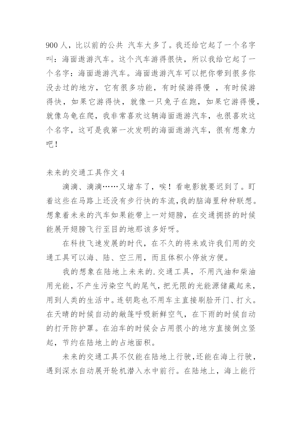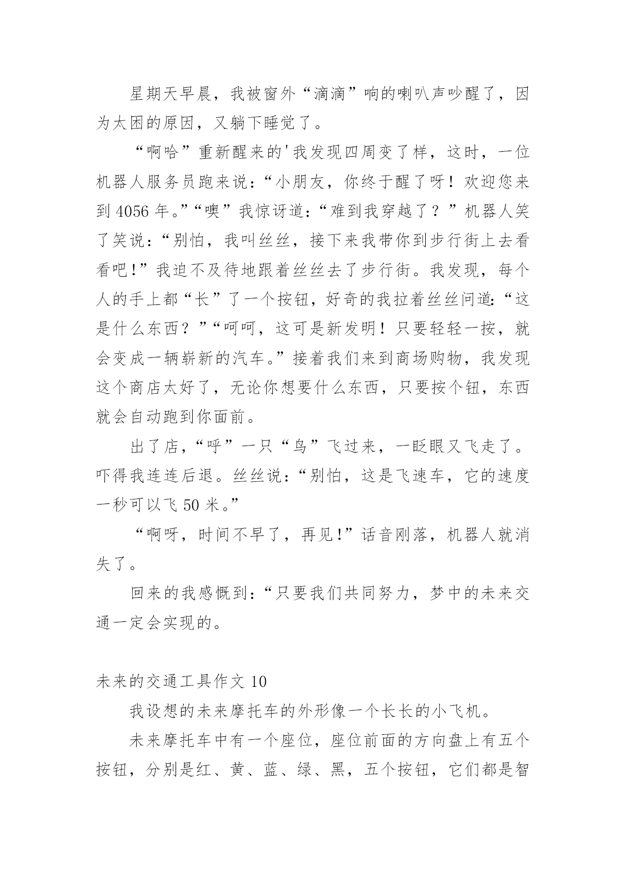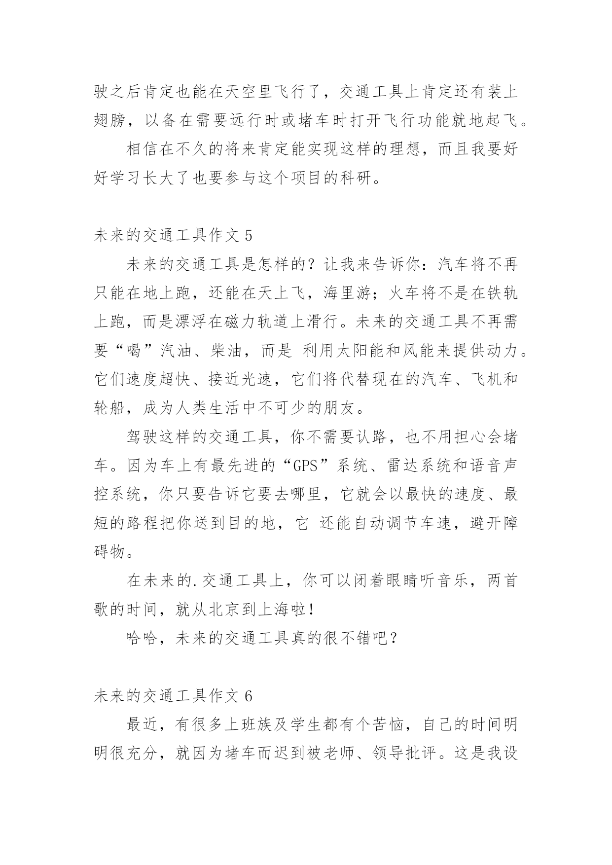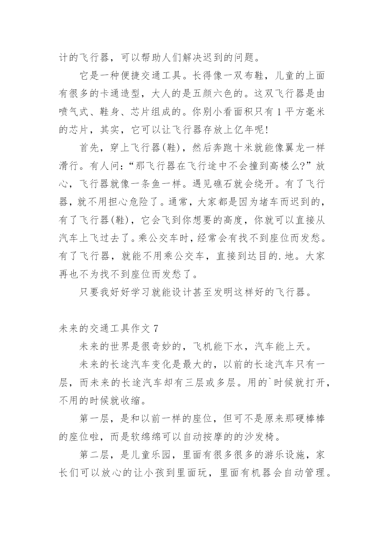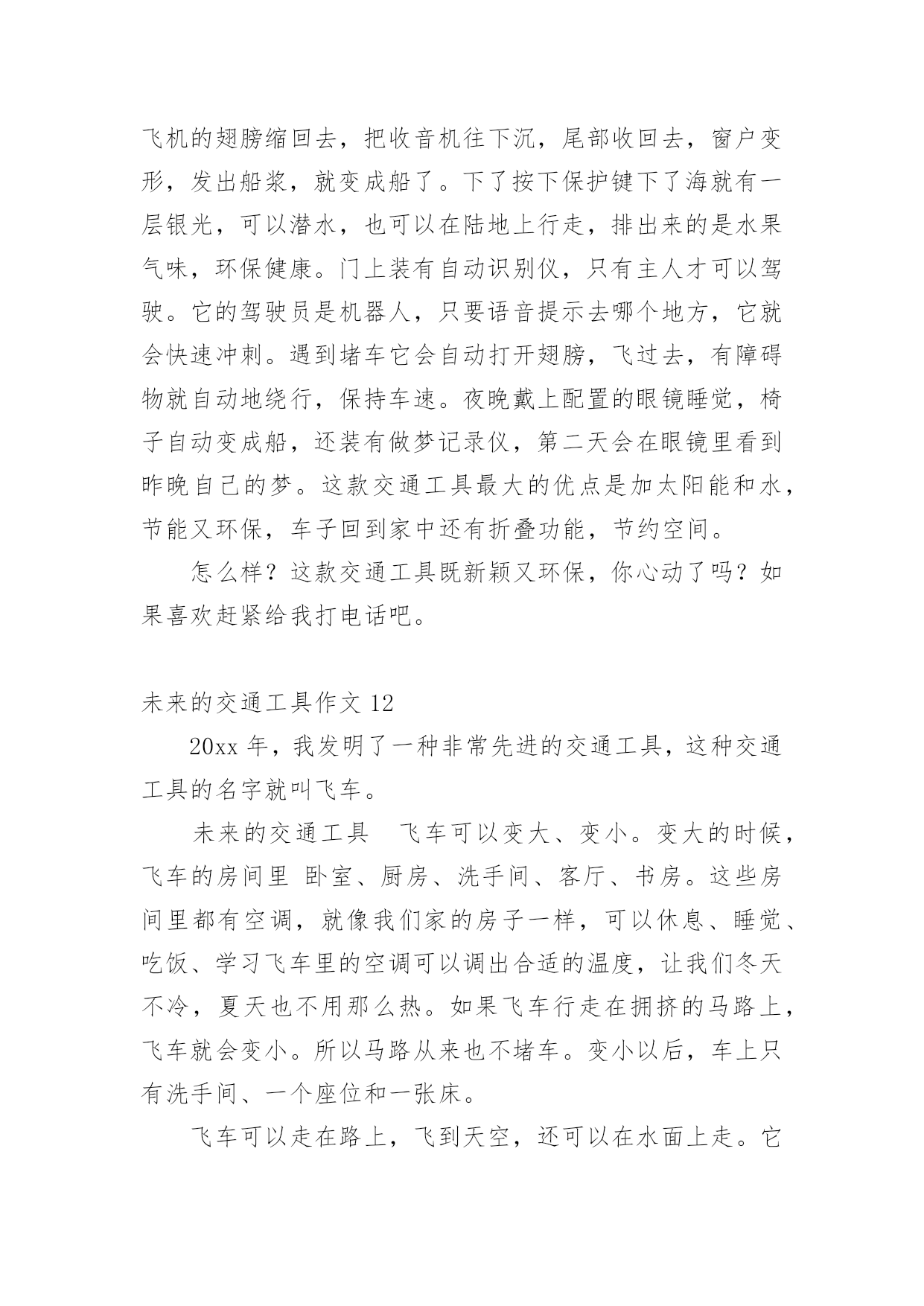 未来的交通工具作文未来的交通工具作文【荐】在生活、工作和学习中,大家都接触过作文吧,作文可分为小学作文、中学作文、大学作文(论文)。你所见过的作文是什么样的呢?以下是小编整理的未来的交通工具作文,仅供参考,欢迎大家阅读。未来的交通工具作文1未来,我希望有一种交通工具,它可以在陆地上跑,还能在天上飞,在河里游,我给这辆交通工具取名为未来号。未来号的形状是长方体,前面有一双大眼睛,它是无人驾驶的,你只要对它说一声去哪里,它就会立刻带你去那边,假如车子里坐不下人了,它会变长,座位也会变多,窗子是电视机,是用太阳光来转电,车子的能量是用风来转化成能量,它的`颜色是五颜六色的,随着声音的大小可以改变自己的颜色。如果想飞上天,它就会自动伸出两个翅膀,假如未来号觉得热,它就会自动伸起隔热防护罩,在大海里,如果太冷,它就会自动伸起隔冷防护罩,假如打雷的话,就会自动伸起避雷防护罩,雷劈在这上面,未来号还是安然无恙。未来号真是全世界独一无二的,真希望它早点诞生。未来的交通工具作文2我想在未来里,要做出一种最方便、又不会堵车、而且又不会被偷的交通工具。它的外形是车的,但有没有轮胎。因为它是漂浮在空中的,而且速度惊人,它有每小时700多码呢。说它方便是因为它可以下水、还可以飞在天上。而且,车内的座位可以自己增加,平时就5个座位,在假日里可以增加座位,我要带上我的.奶奶、爷爷、爸爸、妈妈、妹妹、弟弟出去郊游,而且,这种交通工具可以自动导航,自动开车,只要输入你要到的目的地,它就会自己开,我们可以在车上休息,还可以玩牌,这样开车的人就可以抽出时间来陪陪他的家人了,而且它自动开车很安全,因为它是智能的还有一个星级司机的技术呢!还有,这种交通工具还可以缩小,你可以把它放进口袋,就算掉了它也会跟着你走。所以说它不会被偷。我以后一定要做出这种交通工具的。未来的交通工具作文3你们见过公共汽车吗?我知道你们一定见过,但是,我发明的这个公共汽车你们一定没有见过,它跟现在的公共汽车不一样,你们想知道这是什么样子的吗?那我就给你们说说我发明的公共汽车吧!你们一定要仔细听哦!我发明的未来交通工具是在河面上游的'公共汽车,我知道公共汽车是用轮子走动的,但是这个公共汽车是在海面游的。这个公共汽车比以前的公共汽车坐的人多,大约就是900人,比以前的公共汽车大多了。我还给它起了一个名字叫:海面遨游汽车。这个汽车游得很快,所以我给它起了一个名字:海面遨游汽车。海面遨游汽车可以把你带到很多你没去过的地方,它有很多功能,有时候游得慢,有时候游得快,如果它游得快,就像一只兔子在跑,如果它游得慢,就像乌龟在爬,我非常喜欢这辆海面遨游汽车,也很喜欢这个名字,这可是我第一次发明的海面遨游汽车,很有想象力吧!未来的交通工具作文4滴滴、滴滴……又堵车了,唉!看电影就要迟到了。盯着这些在马路上还没有步行快的车流,我的脑海里种种联想。想象着未来的汽车如果能带上一对翅膀,在交通拥挤的时候能展开翅膀飞行至目的地那该多好呀。在科技飞速发展的时代,在不久的将来或许我们用的交通工具可以海、陆、空三用,而且体积小停放方便。我的想象在陆地上未来的.交通工具,不用汽油和柴油用光能,不产生污染空气的尾气,把无限的光能源储藏起来,用到人类的生活中。连钥匙也不用车主直接刷脸开门、打火。在天晴的时候自动的敞篷呼吸新鲜空气,在下雨的时候自动的打开防护罩。在泊车的时候会占用很小的地方直接倒立竖起,节约在陆地上的占地面积。未来的交通工具不仅能在陆地上行驶,还能在海上行驶,遇到深水自动展开轮机潜入水中前行。在陆地上,海上能行驶之后肯定也能在天空里飞行了,交通工具上肯定还有装上翅膀,以备在需要远行时或堵车时打开飞行功能就地起飞。相信在不久的将来肯定能实现这样的理想,而且我要好好学习长大了也要参与这个项目的科研。未来的交通工具作文5未来的交通工具是怎样的?让我来告诉你:汽车将不再只能在地上跑,还能在天上飞,海里游;火车将不是在铁轨上跑,而是漂浮在磁力轨道上滑行。未来的交通工具不再需要“喝”汽油、柴油,而是利用太阳能和风能来提供动力。它们速度超快、接近光速,它们将代替现在的汽车、飞机和轮船,成为人类生活中不可少的朋友。驾驶这样的交通工具,你不需要认路,也不用担心会堵车。因为车上有最先进的“GPS”系统、雷达系统和语音声控系统,你只要告诉它要去哪里,它就会以最快的速度、最短的路程把你送到目的地,它还能自动调节车速,避开障碍物。在未来的.交通工具上,你可以闭着眼睛听音乐,两首歌的时间,就从北京到上海啦!哈哈,未来的交通工具真的很不错吧?未来的交通工具作文6最近,有很多上班族及学生都有个苦恼,自己的时间明明很充分,就因为堵车而迟到被老师、领导批评。这是我设计的飞行器,可以帮助人们解决迟到的问题。它是一种便捷交通工具。长得像一双布鞋,儿童的上面