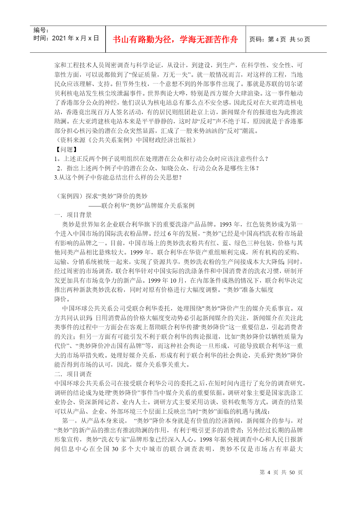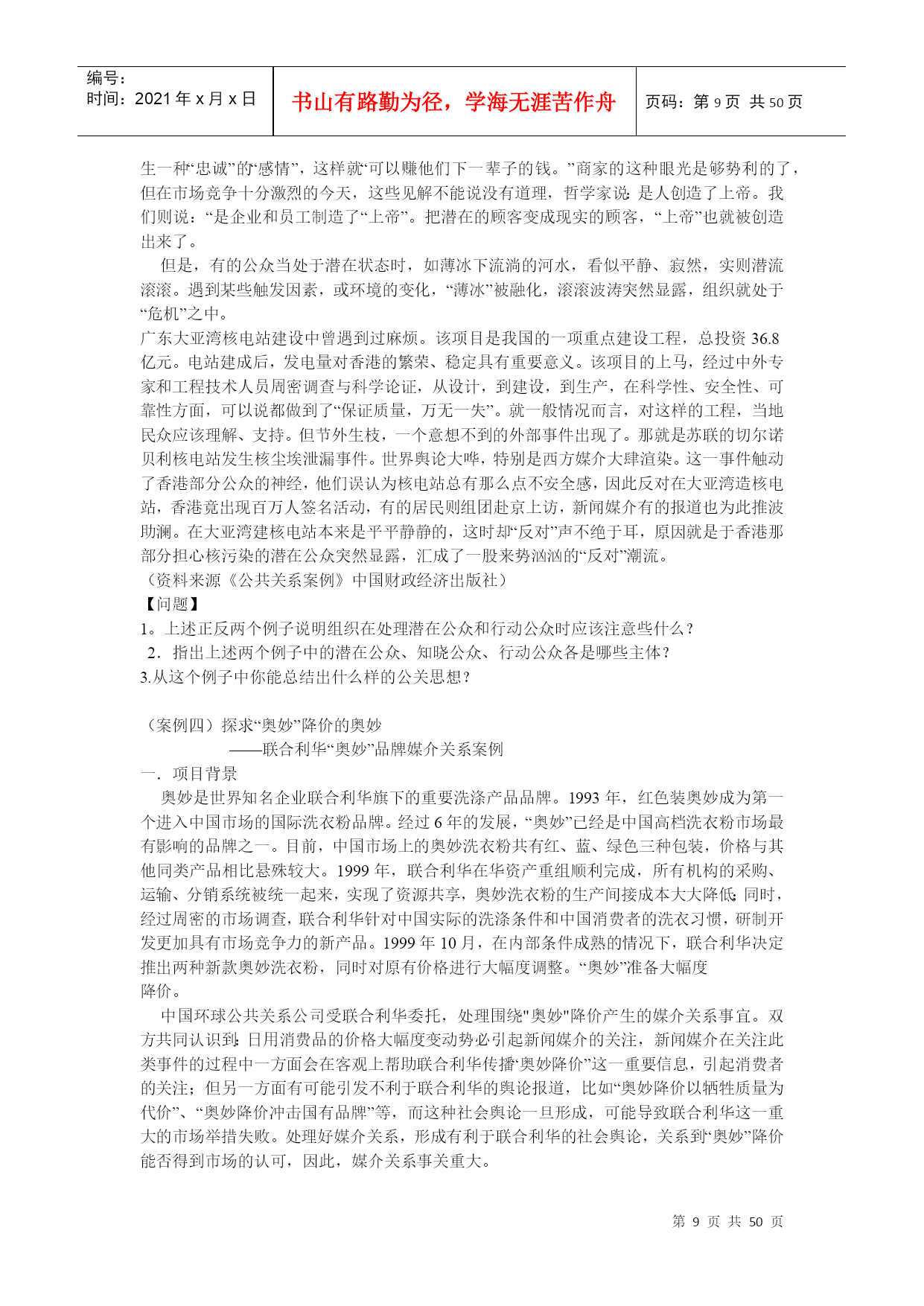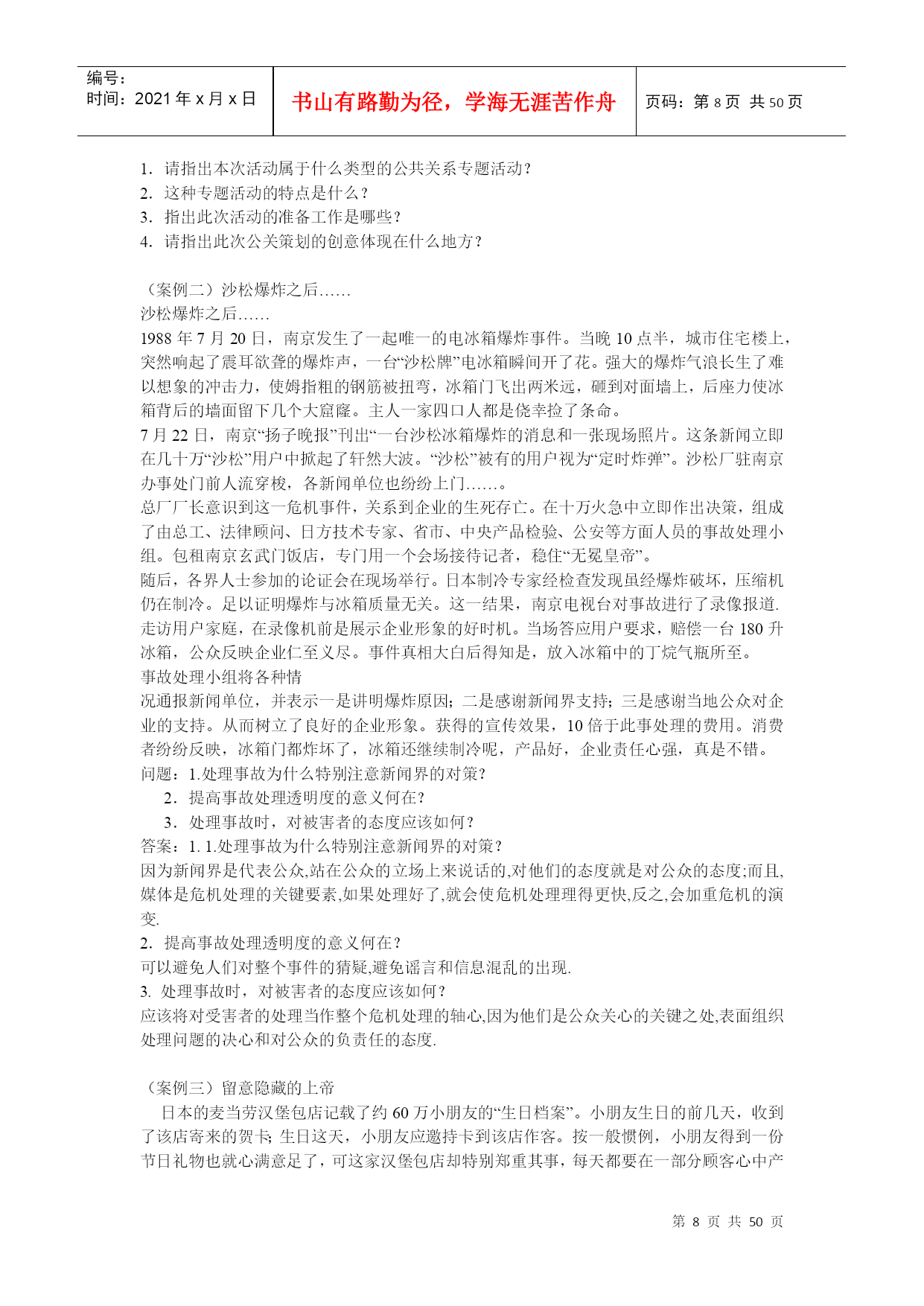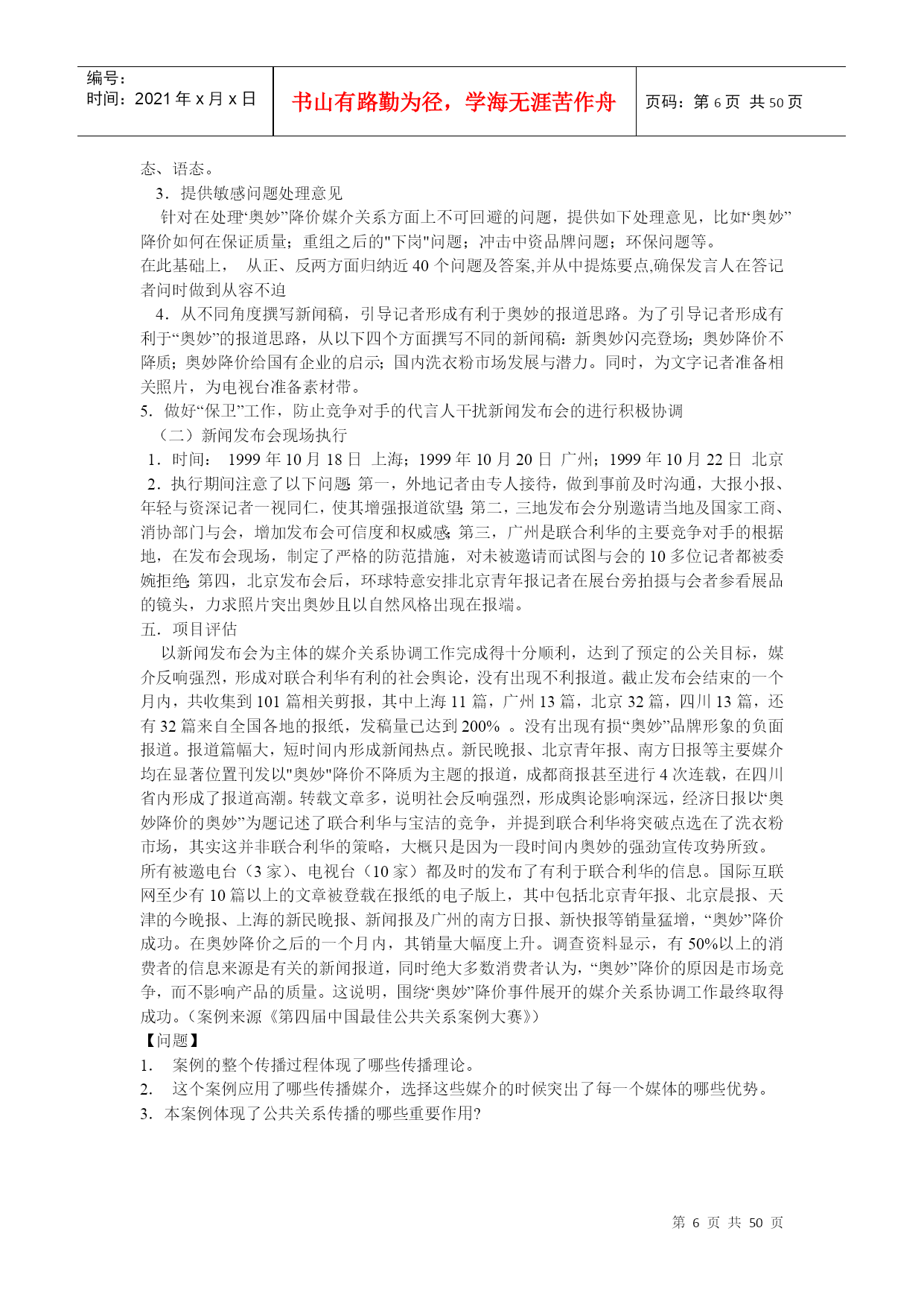 编号:时间:2021年x月x日书山有路勤为径,学海无涯苦作舟页码:第PAGE50页共NUMPAGES50页第PAGE\*MERGEFORMAT50页共NUMPAGES\*MERGEFORMAT50页《公共关系学》案例分析案例分析1:音乐起,摩擦生北京某大学校园旁,有一家服装厂,这家服装厂的生产车间与这所大学教学人员的住宅区隔墙相望。有一段时间,这家工厂借鉴国外的先进经验,为消除工人在重复劳动中产生的疲劳感和单调感,每到上午9~10点之间,就在车间内播放各种流行音乐。可是在这段时间内,正是大学的教学科研人员从事科学研究的“黄金时间”,他们需要一个安静的环境,使自己的大脑进入正常工作状态。然而,从仅隔一墙的服装厂传来的“震耳欲聋”的流行音乐,却破坏了他们的工作环境,使他们无论如何也无法进入正常的思维状态。这引起了大学里的教学和科研人员的不满和愤怒,他们多次找厂方交涉,但始终没有得到结果。无奈,不得不采取行动,投书报纸,呼吁社会舆论的支持及政府的干预。1.假如你是服装厂的公关部主任,请你进行公关策划,解决大学教学科研人员与服装生产厂的矛盾。2.结合实际谈谈发展社区公共关系的意义。案例分析:如果我是这家服装厂的公关部主任,那么我将采取如下措施:第一,立即停播音乐节目,防止事态的进一步扩大或恶化。第二,邀请大学的教师、科研人员代表到工厂来举行座谈会,诚挚地向他们表示歉意,征求他们对工厂的意见,并与他们一起寻找解决问题的办法。如果条件允许,请教师代表参观工厂,也使他们能够理解工厂在劳动时间播放音乐的原因。第三,既然在工人劳动时播放音乐可以减少疲劳,属于提高劳动积极性的必要措施,那么,就在工厂的车间加装双层玻璃,或在工厂与学校之间建隔音墙,使音乐不会对学校的教师造成干扰。第四,在事件解决之后,向有关媒体发布消息,宣布解决方案及问题解决后大学教师的反应,以便在整个社会上挽回因教师投诉造成的不良影响。通过上述事件,我们可以看到社区公共关系的重要意义,主要表现为两点:1.社区关系直接影响着组织的生存环境。社区公众指组织所在地的区域有关的对象,包括当地的管理部门、地方团体组织、左邻右舍的居民。社区是一个组织赖以生存、发展的基本环境,是组织的根基。一个组织如果没有良好的社区关系,就会失去立足之地。例如上述案例中的那个服装厂,他们的子女要在当地学校中上学,工厂要就近招工,地方政府要对其实行管理,当地的群众又是工厂最近的顾客群。组织的发展,离不开这方方面面的支持。因此,组织要将社区作为自己发展的一个部分,将社区公众视为“准自家人”。2.社区关系直接影响到组织的公众形象。社区公众涉及当地政治、经济、文化、教育等各个方面,他们对组织的看法又极易相互传播,形成区域性的影响,从而形成组织的某一种公众形象。服装厂如不能顺利解决与大学教师的矛盾,就会给社区公众留下一个噪音扰民的不良印象。而且,这种形象还会因社区内居民间的传播,不断扩大。如果教师以环境保护法律起诉工厂,必然又会引起政府的干预,受到有关部门的处罚。所以任何组织都必须十分注意自己在社区居民中的形象,通过自己保护环境,关心公众利益的实际行动,树立一个“合格公民”的好形象。自考参考资料:公共关系学案例分析题(案例一)白兰地进军美国市场的公关妙棋1957年10月14日,华盛顿。这天,是美国总统艾森豪威尔的67岁生日。华盛顿街道彩旗飘扬、标语醒目,白宫周围人山人海,华盛顿市万人空巷,等候着一个时刻的到来,这一刻,人们已经等了很久。按照美国人的脾气,爱好自由、民主的公民们是不屑于为总统的一个区区生日而特意来凑热闹捧场的。总统也好,国务卿也好,你过你的生日,与我山姆大叔何干?可是这一天,美国人却显得异乎寻常地热情、激动,到底发生了什么事?一个月前,法国人就在各种媒介上广为宣传,为了感谢在二战中美军对法国人民的恩情,为了表示法美人民永远的友谊,法国人决定,在艾森豪威尔总统67岁寿诞之时,向美国总统敬赠两桶酿造已达67年的法国白兰地。这两桶极品白兰地将由专机运送,并在总统生日这天,举行盛大的赠酒仪式,向全世界表明法国人民对美国人民的友好之情。法国白兰地?!美国人似乎一下子想了起来,那不是扬名全世界的美酒佳酿吗?我们以前怎么就没有想起来尝一尝呢?一时之间,白兰地的历史、趣闻、逸事,陆续地出现在各种媒体上。久盼的时刻终于到了。上午十时,四名英俊的法国青年,穿着雪白的王宫卫士礼服,驾着法国中世纪时期的典雅马车进入白宫广场,由法国艺术家精心设计的酒桶古色古香,似已发出阵阵的美酒醇香。全场沸腾了,当四个侍者举着酒桶步向白宫时,美国人唱起了《马赛曲》,欢声雷动,掌声轰鸣,人们沉浸在欢乐的气氛中。各大新闻机构毫无例外地派出了记者。关于赠酒仪式的报道文字、图片、影像