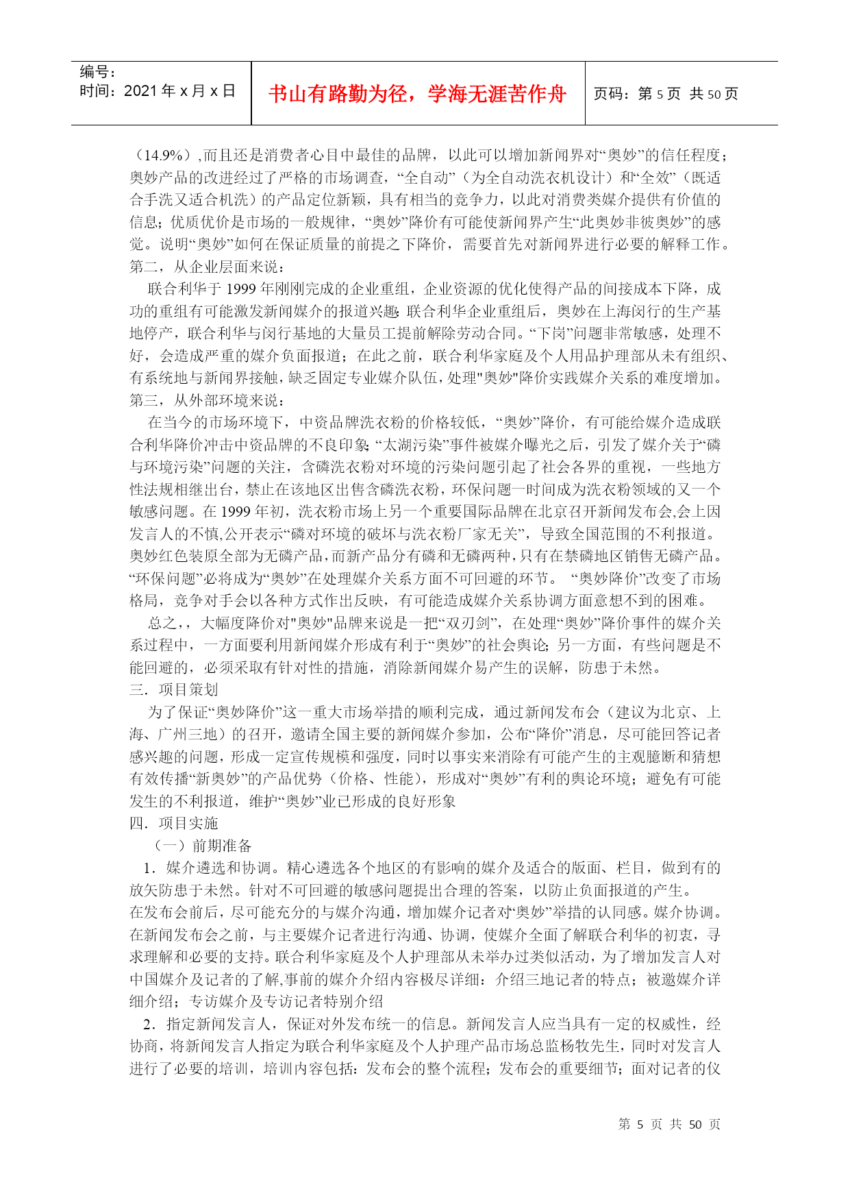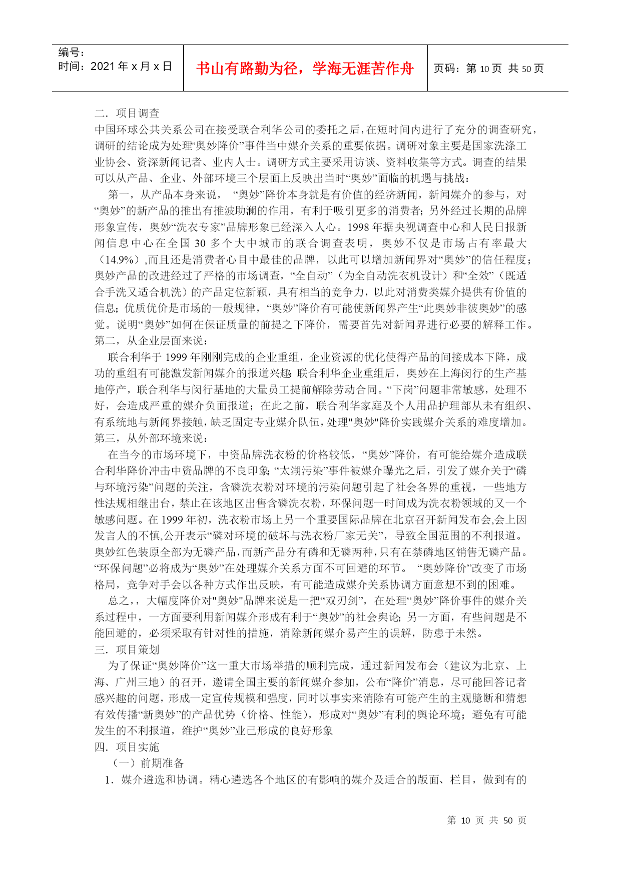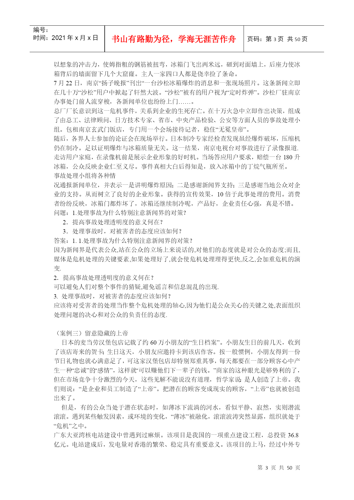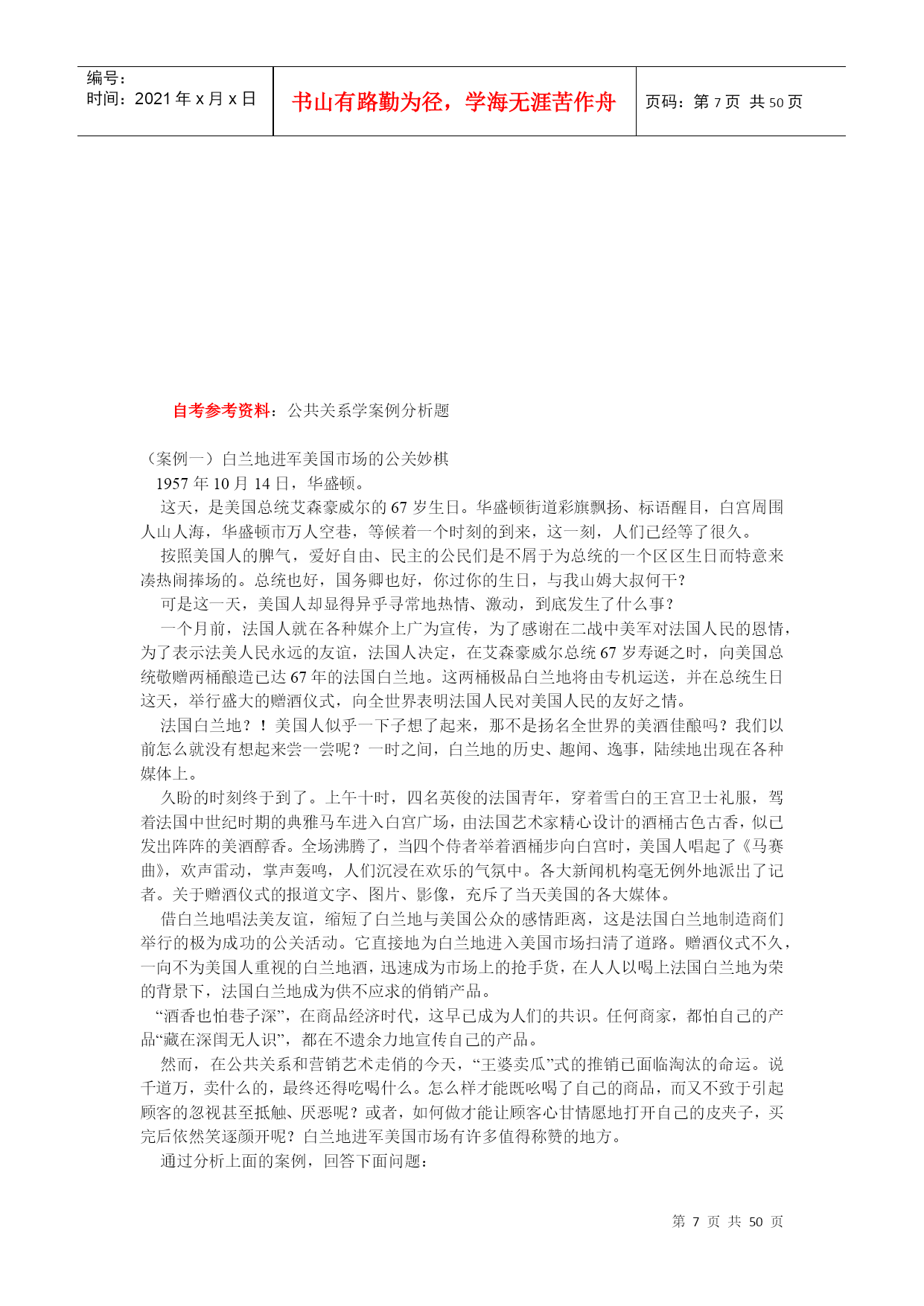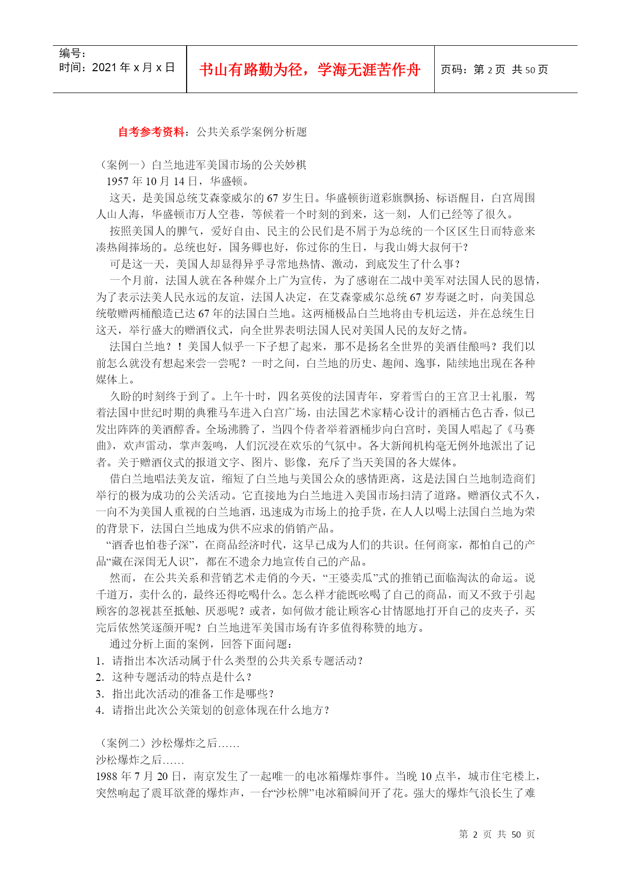 编号:时间:2021年x月x日书山有路勤为径,学海无涯苦作舟页码:第PAGE50页共NUMPAGES50页第PAGE\*MERGEFORMAT50页共NUMPAGES\*MERGEFORMAT50页《公共关系学》案例分析案例分析1:音乐起,摩擦生北京某大学校园旁,有一家服装厂,这家服装厂的生产车间与这所大学教学人员的住宅区隔墙相望。有一段时间,这家工厂借鉴国外的先进经验,为消除工人在重复劳动中产生的疲劳感和单调感,每到上午9~10点之间,就在车间内播放各种流行音乐。可是在这段时间内,正是大学的教学科研人员从事科学研究的“黄金时间”,他们需要一个安静的环境,使自己的大脑进入正常工作状态。然而,从仅隔一墙的服装厂传来的“震耳欲聋”的流行音乐,却破坏了他们的工作环境,使他们无论如何也无法进入正常的思维状态。这引起了大学里的教学和科研人员的不满和愤怒,他们多次找厂方交涉,但始终没有得到结果。无奈,不得不采取行动,投书报纸,呼吁社会舆论的支持及政府的干预。1.假如你是服装厂的公关部主任,请你进行公关策划,解决大学教学科研人员与服装生产厂的矛盾。2.结合实际谈谈发展社区公共关系的意义。案例分析:如果我是这家服装厂的公关部主任,那么我将采取如下措施:第一,立即停播音乐节目,防止事态的进一步扩大或恶化。第二,邀请大学的教师、科研人员代表到工厂来举行座谈会,诚挚地向他们表示歉意,征求他们对工厂的意见,并与他们一起寻找解决问题的办法。如果条件允许,请教师代表参观工厂,也使他们能够理解工厂在劳动时间播放音乐的原因。第三,既然在工人劳动时播放音乐可以减少疲劳,属于提高劳动积极性的必要措施,那么,就在工厂的车间加装双层玻璃,或在工厂与学校之间建隔音墙,使音乐不会对学校的教师造成干扰。第四,在事件解决之后,向有关媒体发布消息,宣布解决方案及问题解决后大学教师的反应,以便在整个社会上挽回因教师投诉造成的不良影响。通过上述事件,我们可以看到社区公共关系的重要意义,主要表现为两点:1.社区关系直接影响着组织的生存环境。社区公众指组织所在地的区域有关的对象,包括当地的管理部门、地方团体组织、左邻右舍的居民。社区是一个组织赖以生存、发展的基本环境,是组织的根基。一个组织如果没有良好的社区关系,就会失去立足之地。例如上述案例中的那个服装厂,他们的子女要在当地学校中上学,工厂要就近招工,地方政府要对其实行管理,当地的群众又是工厂最近的顾客群。组织的发展,离不开这方方面面的支持。因此,组织要将社区作为自己发展的一个部分,将社区公众视为“准自家人”。2.社区关系直接影响到组织的公众形象。社区公众涉及当地政治、经济、文化、教育等各个方面,他们对组织的看法又极易相互传播,形成区域性的影响,从而形成组织的某一种公众形象。服装厂如不能顺利解决与大学教师的矛盾,就会给社区公众留下一个噪音扰民的不良印象。而且,这种形象还会因社区内居民间的传播,不断扩大。如果教师以环境保护法律起诉工厂,必然又会引起政府的干预,受到有关部门的处罚。所以任何组织都必须十分注意自己在社区居民中的形象,通过自己保护环境,关心公众利益的实际行动,树立一个“合格公民”的好形象。自考参考资料:公共关系学案例分析题(案例一)白兰地进军美国市场的公关妙棋1957年10月14日,华盛顿。这天,是美国总统艾森豪威尔的67岁生日。华盛顿街道彩旗飘扬、标语醒目,白宫周围人山人海,华盛顿市万人空巷,等候着一个时刻的到来,这一刻,人们已经等了很久。按照美国人的脾气,爱好自由、民主的公民们是不屑于为总统的一个区区生日而特意来凑热闹捧场的。总统也好,国务卿也好,你过你的生日,与我山姆大叔何干?可是这一天,美国人却显得异乎寻常地热情、激动,到底发生了什么事?一个月前,法国人就在各种媒介上广为宣传,为了感谢在二战中美军对法国人民的恩情,为了表示法美人民永远的友谊,法国人决定,在艾森豪威尔总统67岁寿诞之时,向美国总统敬赠两桶酿造已达67年的法国白兰地。这两桶极品白兰地将由专机运送,并在总统生日这天,举行盛大的赠酒仪式,向全世界表明法国人民对美国人民的友好之情。法国白兰地?!美国人似乎一下子想了起来,那不是扬名全世界的美酒佳酿吗?我们以前怎么就没有想起来尝一尝呢?一时之间,白兰地的历史、趣闻、逸事,陆续地出现在各种媒体上。久盼的时刻终于到了。上午十时,四名英俊的法国青年,穿着雪白的王宫卫士礼服,驾着法国中世纪时期的典雅马车进入白宫广场,由法国艺术家精心设计的酒桶古色古香,似已发出阵阵的美酒醇香。全场沸腾了,当四个侍者举着酒桶步向白宫时,美国人唱起了《马赛曲》,欢声雷动,掌声轰鸣,人们沉浸在欢乐的气氛中。各大新闻机构毫无例外地派出了记者。关于赠酒仪式的报道文字、图片、影像