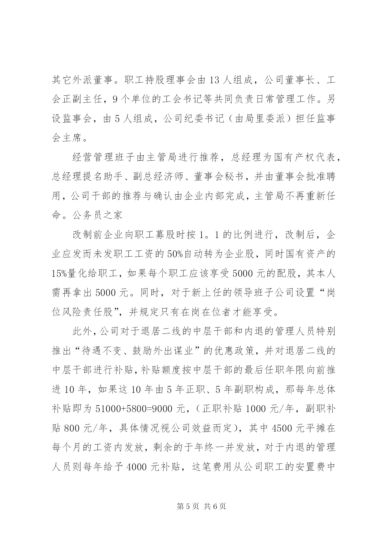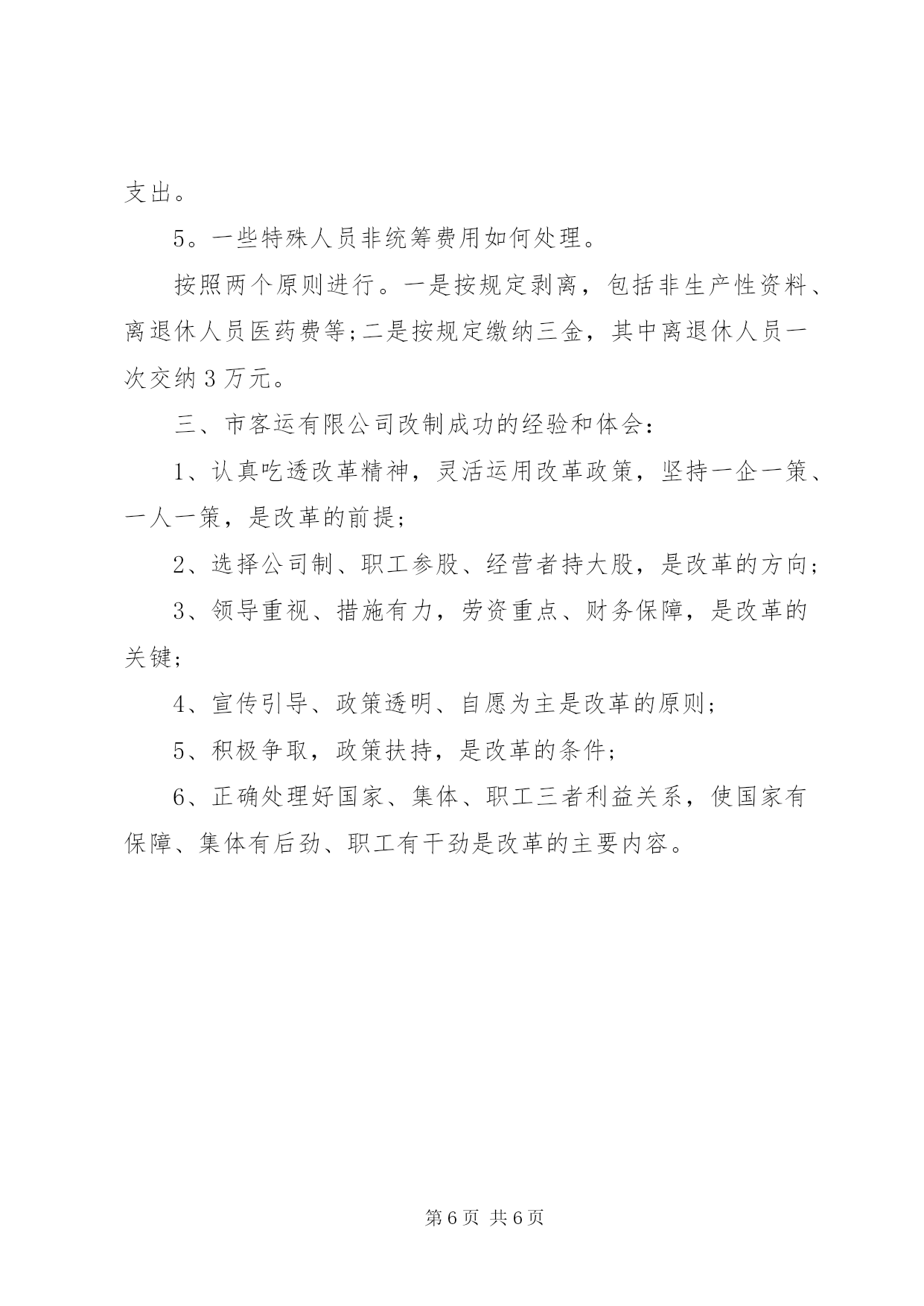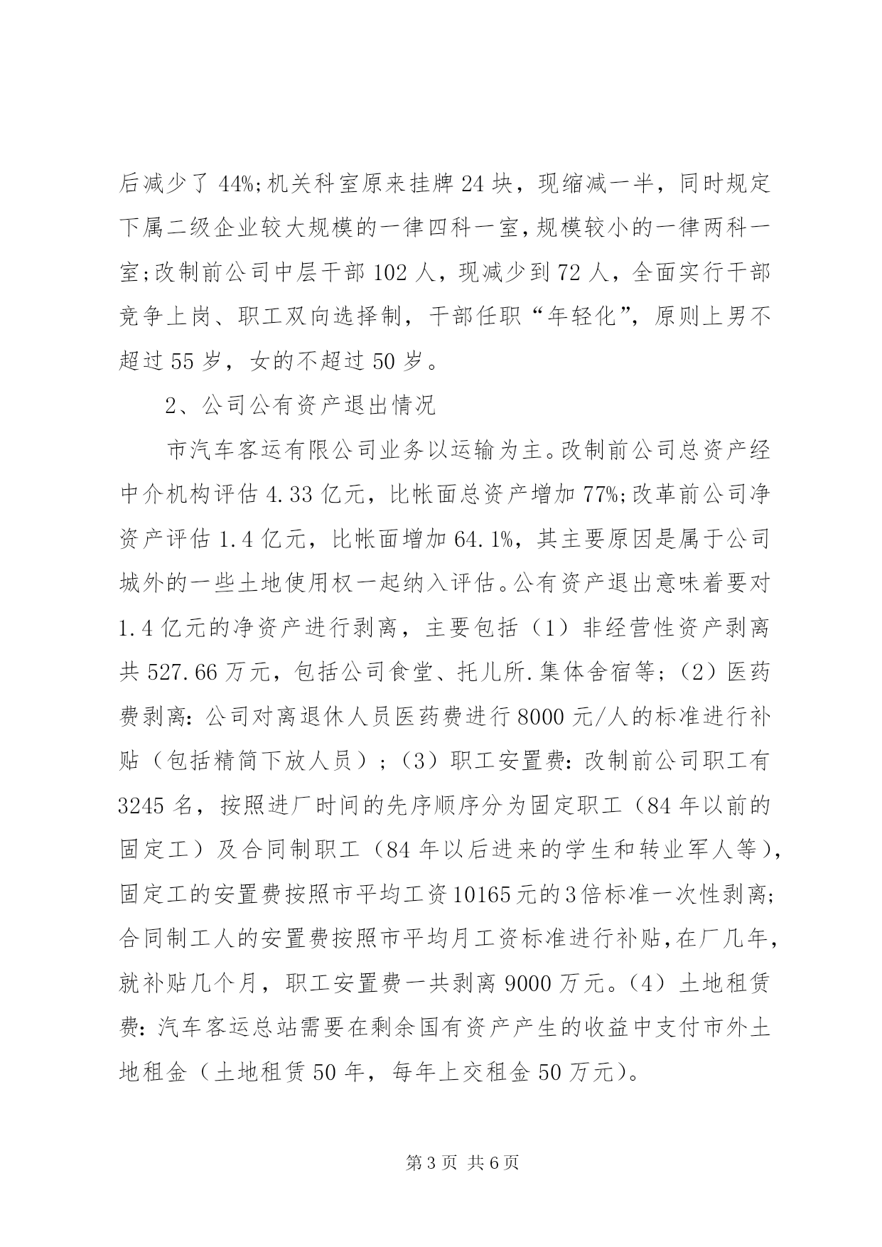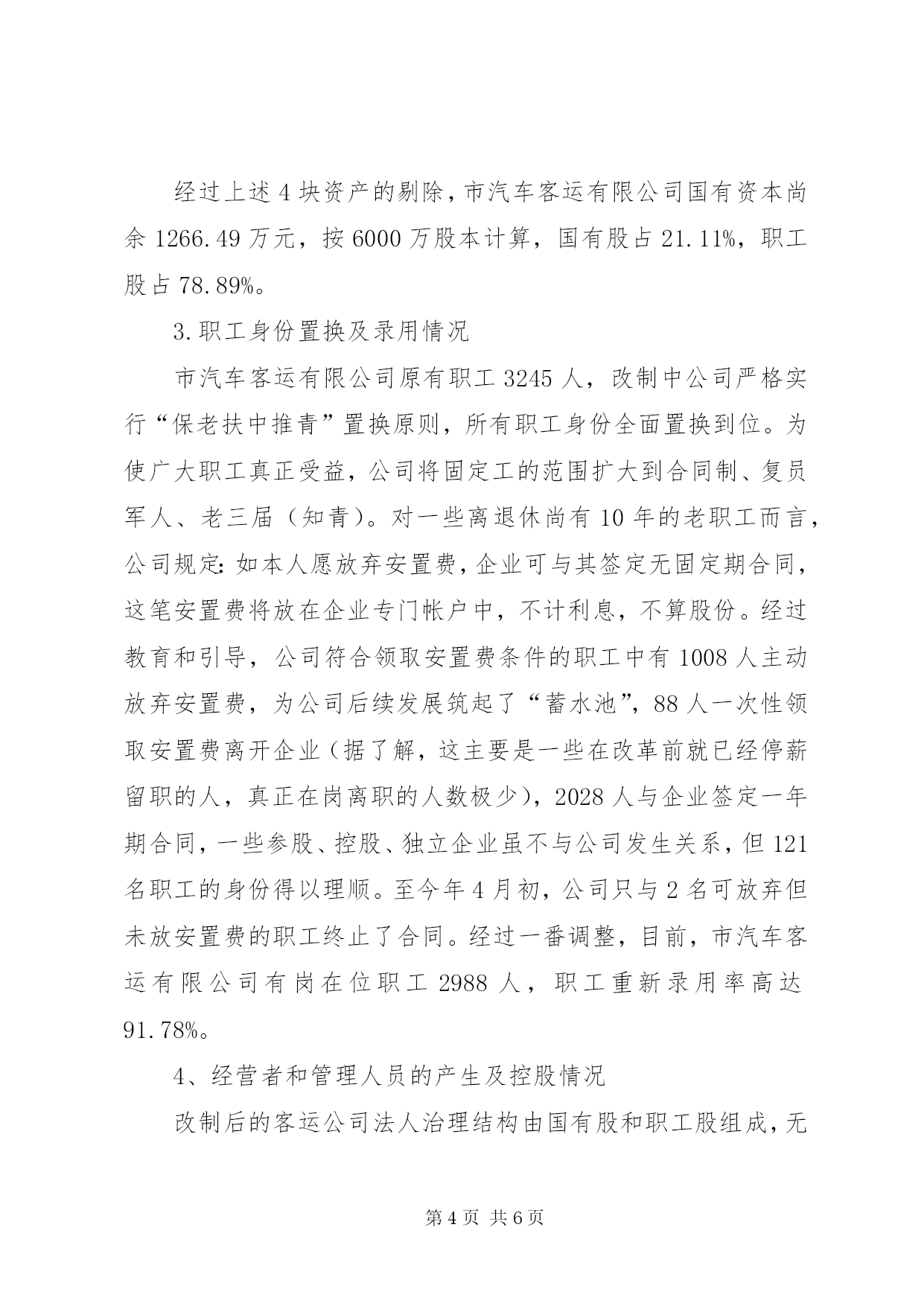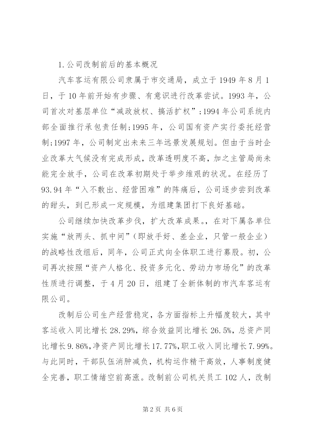 第PAGE\*Arabic\*MERGEFORMAT6页共NUMPAGES\*MERGEFORMAT6页交通企业改组改制工作调研报告4月4日,市交通局副局长、局改革办公室主任陈登峰带领市经济办主任王彬和市长运公司总经理李亚峰等8人赴市客运有限公司学习改制成功经验。市交通局、市汽车客运有限公司的有关领导介绍了企业改制基本概况,使学习小组一行倍受启发。市长运公司总经理李亚峰参观学习后表示:要借鉴的经验和做法,结合本单位实际,力争月内拿出公司改制方案,确保今年改革工作全面完成。现将学习调研情况报告如下:一、市交通系统企业改制工作概况市交通系统企业改革工作于3年前拉开序幕,准备充分.改革彻底.效果明显。按照“实事求是反映交通企业改制特色”的总体要求,到目前为止,该市交通系统下属的客运、货运、轮船、航务、联运、通港等6家企业中,4家已改制完毕,剩余的轮船、航运2家也将于今年完成。在已改制完的4家企业中,除客运企业目前暂留21.11%的国有股外,其余均成为真正意义上的“非公有制经济”。企改后,市交通局对企业各项经营生产“完全放手、不再介入”,只于发展方向上给予适当扶持与指导,主管局工作自身将更加着重于交通基础设施建设与行业管理。未来几年内,市交通局将逐步引导市汽车客运有限公司走“品牌”之路,打“品牌”效应,接受市场公平、公正的挑战。二、市汽车客运有限公司改制工作概况:1.公司改制前后的基本概况汽车客运有限公司隶属于市交通局,成立于1949年8月1日,于10年前开始有步骤、有意识进行改革尝试。1993年,公司首次对基层单位“减政放权、搞活扩权”;1994年公司系统内部全面推行承包责任制;1995年,公司国有资产实行委托经营制;1997年,公司制定出未来三年远景发展规划。但由于当时企业改革大气候没有完成形成,改革透明度不高,加之主管局尚未能完全放手,公司在改革初期处于举步维艰的状况。在经历了93.94年“入不敷出、经营困难”的阵痛后,公司逐步尝到改革的甜头,到已形成一定规模,为组建集团打下良好基础。公司继续加快改革步伐,扩大改革成果。,在对下属各单位实施“放两头、抓中间”(即放手好、差企业,只管一般企业)的战略性改组后,同年,公司正式向全体职工进行募股。初,公司再次按照“资产人格化、投资多元化、劳动力市场化”的改革性质进行调整,于4月20日,组建了全新体制的市汽车客运有限公司。改制后公司生产经营稳定,各方面指标上升幅度较大,其中客运收入同比增长28.29%,综合效益同比增长26.5%,总资产同比增长9.86%,净资产同比增长17.77%,职工收入同比增长7.99%。与此同时,干部队伍消肿减负,机构运作精干高效,人事制度健全完善,职工情绪空前高涨。改制前公司机关员工102人,改制后减少了44%;机关科室原来挂牌24块,现缩减一半,同时规定下属二级企业较大规模的一律四科一室,规模较小的一律两科一室;改制前公司中层干部102人,现减少到72人,全面实行干部竞争上岗、职工双向选择制,干部任职“年轻化”,原则上男不超过55岁,女的不超过50岁。2、公司公有资产退出情况市汽车客运有限公司业务以运输为主。改制前公司总资产经中介机构评估4.33亿元,比帐面总资产增加77%;改革前公司净资产评估1.4亿元,比帐面增加64.1%,其主要原因是属于公司城外的一些土地使用权一起纳入评估。公有资产退出意味着要对1.4亿元的净资产进行剥离,主要包括(1)非经营性资产剥离共527.66万元,包括公司食堂、托儿所.集体舍宿等;(2)医药费剥离:公司对离退休人员医药费进行8000元/人的标准进行补贴(包括精简下放人员);(3)职工安置费:改制前公司职工有3245名,按照进厂时间的先序顺序分为固定职工(84年以前的固定工)及合同制职工(84年以后进来的学生和转业军人等),固定工的安置费按照市平均工资10165元的3倍标准一次性剥离;合同制工人的安置费按照市平均月工资标准进行补贴,在厂几年,就补贴几个月,职工安置费一共剥离9000万元。(4)土地租赁费:汽车客运总站需要在剩余国有资产产生的收益中支付市外土地租金(土地租赁50年,每年上交租金50万元)。经过上述4块资产的剔除,市汽车客运有限公司国有资本尚余1266.49万元,按6000万股本计算,国有股占21.11%,职工股占78.89%。3.职工身份置换及录用情况市汽车客运有限公司原有职工3245人,改制中公司严格实行“保老扶中推青”置换原则,所有职工身份全面置换到位。为使广大职工真正受益,公司将固定工的范围扩大到合同制、复员军人、老三届(知青)。对一些离退休尚有10年的老职工而言,公司规定:如本人愿放弃安置费,企业可与其签定无固定期合同,这笔安置费将放在企业专门帐户中,不计利息,不算股份。经过教育和引