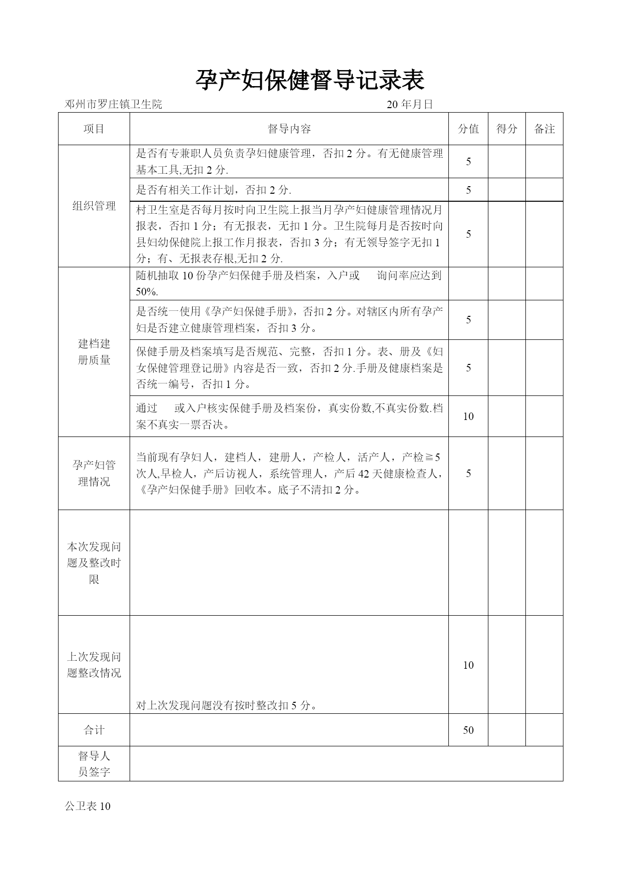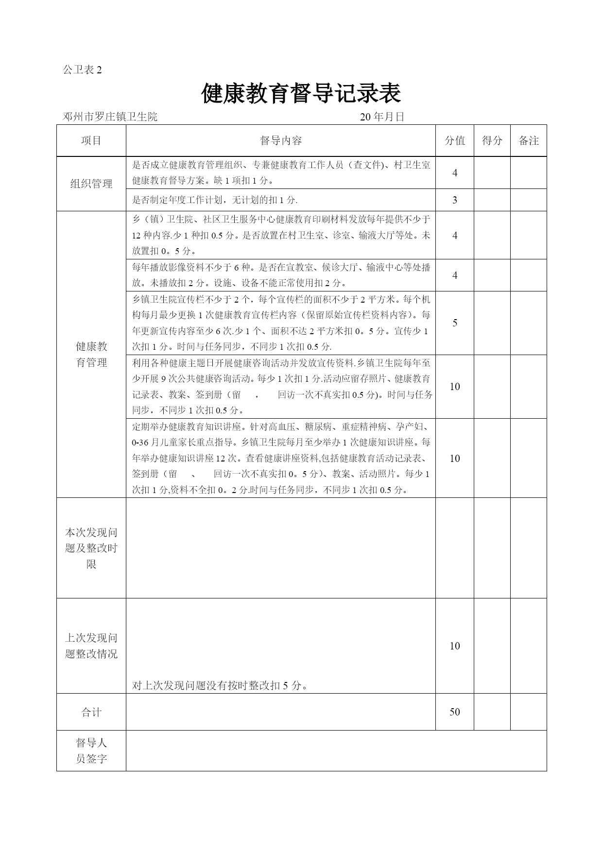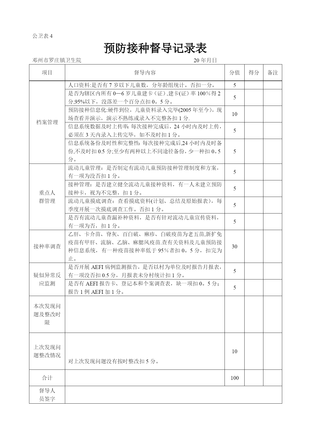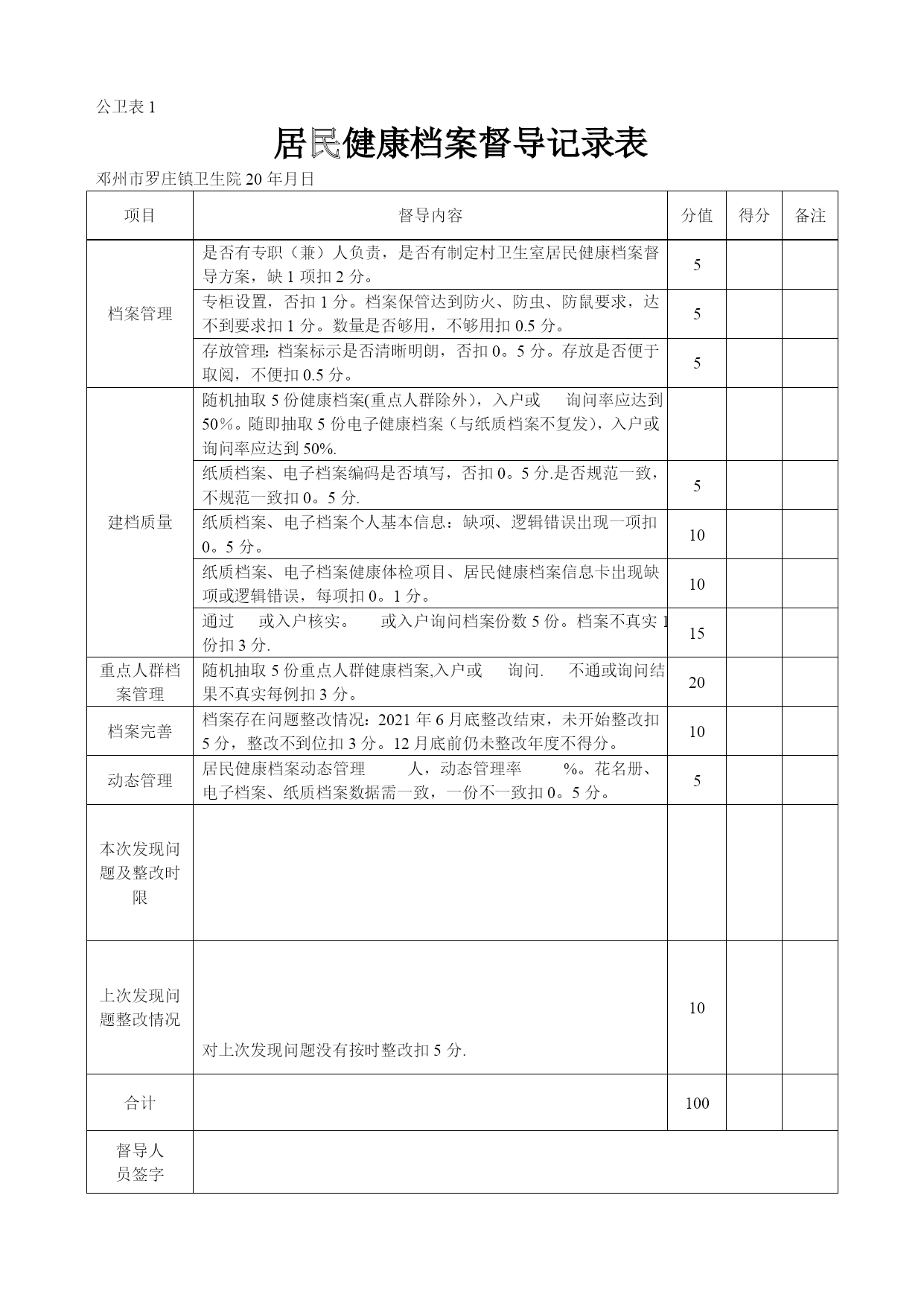 罗庄镇公共卫生考核督导记录表(可以直接使用,可编辑优秀版资料,欢迎下载)公卫表1居民健康档案督导记录表邓州市罗庄镇卫生院20年月日项目督导内容分值得分备注档案管理是否有专职(兼)人负责,是否有制定村卫生室居民健康档案督导方案,缺1项扣2分。5专柜设置,否扣1分。档案保管达到防火、防虫、防鼠要求,达不到要求扣1分。数量是否够用,不够用扣0.5分。5存放管理:档案标示是否清晰明朗,否扣0。5分。存放是否便于取阅,不便扣0.5分。5建档质量随机抽取5份健康档案(重点人群除外),入户或询问率应达到50%。随即抽取5份电子健康档案(与纸质档案不复发),入户或询问率应达到50%.纸质档案、电子档案编码是否填写,否扣0。5分.是否规范一致,不规范一致扣0。5分.5纸质档案、电子档案个人基本信息:缺项、逻辑错误出现一项扣0。5分。10纸质档案、电子档案健康体检项目、居民健康档案信息卡出现缺项或逻辑错误,每项扣0。1分。10通过或入户核实。或入户询问档案份数5份。档案不真实1份扣3分.15重点人群档案管理随机抽取5份重点人群健康档案,入户或询问.不通或询问结果不真实每例扣3分。20档案完善档案存在问题整改情况:2021年6月底整改结束,未开始整改扣5分,整改不到位扣3分。12月底前仍未整改年度不得分。10动态管理居民健康档案动态管理人,动态管理率%。花名册、电子档案、纸质档案数据需一致,一份不一致扣0。5分。5本次发现问题及整改时限上次发现问题整改情况对上次发现问题没有按时整改扣5分.10合计100督导人员签字公卫表2健康教育督导记录表邓州市罗庄镇卫生院20年月日项目督导内容分值得分备注组织管理是否成立健康教育管理组织、专兼健康教育工作人员(查文件)、村卫生室健康教育督导方案。缺1项扣1分。4是否制定年度工作计划,无计划的扣1分.3健康教育管理乡(镇)卫生院、社区卫生服务中心健康教育印刷材料发放每年提供不少于12种内容.少1种扣0.5分。是否放置在村卫生室、诊室、输液大厅等处。未放置扣0。5分。4每年播放影像资料不少于6种。是否在宣教室、候诊大厅、输液中心等处播放。未播放扣2分。设施、设备不能正常使用扣2分。4乡镇卫生院宣传栏不少于2个,每个宣传栏的面积不少于2平方米。每个机构每月最少更换1次健康教育宣传栏内容(保留原始宣传栏资料内容)。每年更新宣传内容至少6次.少1个、面积不达2平方米扣0。5分。宣传少1次扣1分。时间与任务同步,不同步1次扣0.5分.5利用各种健康主题日开展健康咨询活动并发放宣传资料.乡镇卫生院每年至少开展9次公共健康咨询活动。每少1次扣1分.活动应留存照片、健康教育记录表、教案、签到册(留,回访一次不真实扣0.5分)。时间与任务同步,不同步1次扣0.5分。10定期举办健康教育知识讲座。针对高血压、糖尿病、重症精神病、孕产妇、0-36月儿童家长重点指导。乡镇卫生院每月至少举办1次健康知识讲座。每年举办健康知识讲座12次。查看健康讲座资料,包括健康教育活动记录表、签到册(留、回访一次不真实扣0。5分)、教案、活动照片。每少1次扣1分,资料不全扣0。2分.时间与任务同步,不同步1次扣0.5分。10本次发现问题及整改时限上次发现问题整改情况对上次发现问题没有按时整改扣5分。10合计50督导人员签字公卫表3传染病报告与处理邓州市罗庄镇卫生院20年月日项目督导内容分值得分备注组织管理是否建立传染病和突发公共卫生事件报告制度,未建立扣2分。5有无年度工作计划或总结,无扣1分。5是否按时参加传染病和突发公共卫生事件知识的培训和指导,查看相关记录,缺一次扣2分.5传染病报告与处理传染病报告是否及时,及时报告率100%得满分,每下降10%扣1分,扣完为止。5是否开展结核病、艾滋病宣传指导服务,否扣1分。随机抽查1—2名在治结核病人,查看服药卡内服药记录及督导记录填写情况。(每一例不符合要求扣1分)10是否能协助上级专业机构开展疫情疫点处理,排查密切接触者,留观随访,指导落实消毒预防等措施。否扣5分.同时纳入不良执业记分2分。10对突发公卫事件,未按有关法律法规及时采取有效措施,隐瞒、缓报、谎报造成不良后果的,一票否决。20发生重大自然灾害、突发重大伤亡事故、传染病流行或其他严重威胁人民生命健康的紧急情况时,拒不服从上级管理部门的统一调遣、统一管理或不按要求组织实施的,年度内所有工作一票否决,停止公卫经费、零差率专项补助和一般诊疗费的拨付。30本次发现问题及整改时限上次发现问题整改情况对上次发现问题没有按时整改扣5分。10合计100督导人员签字公卫表4预防接种督导记录表邓州市罗庄镇卫生院20年月日项目督导内容分值得分备注档案管理人口资料:是否有7岁以下儿童数,分年龄组统计。否扣