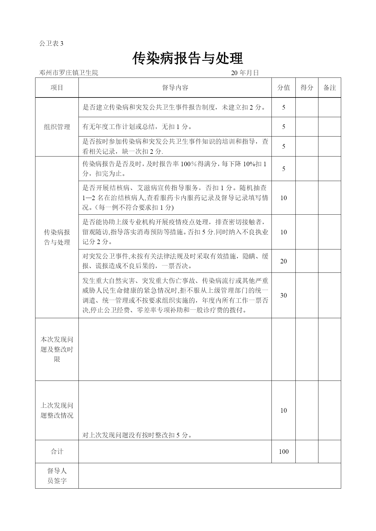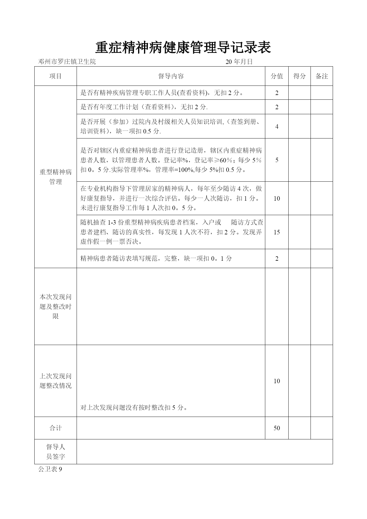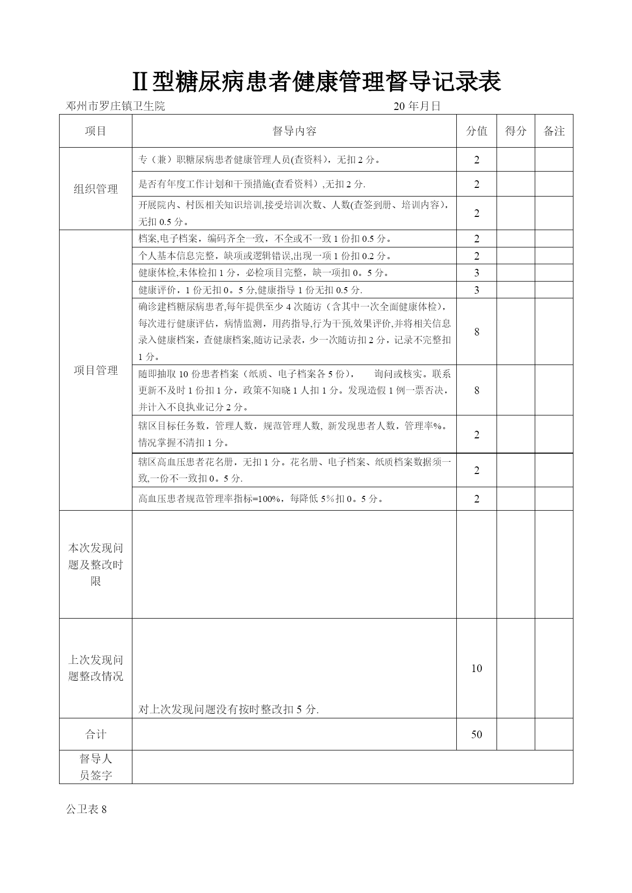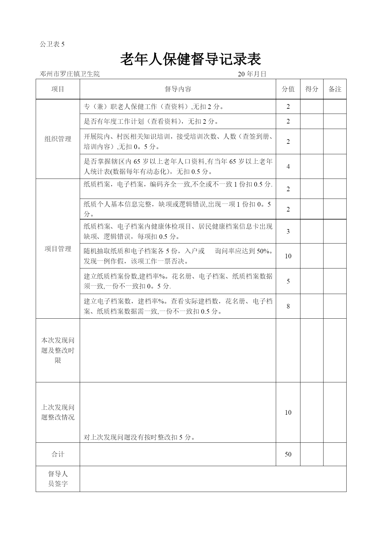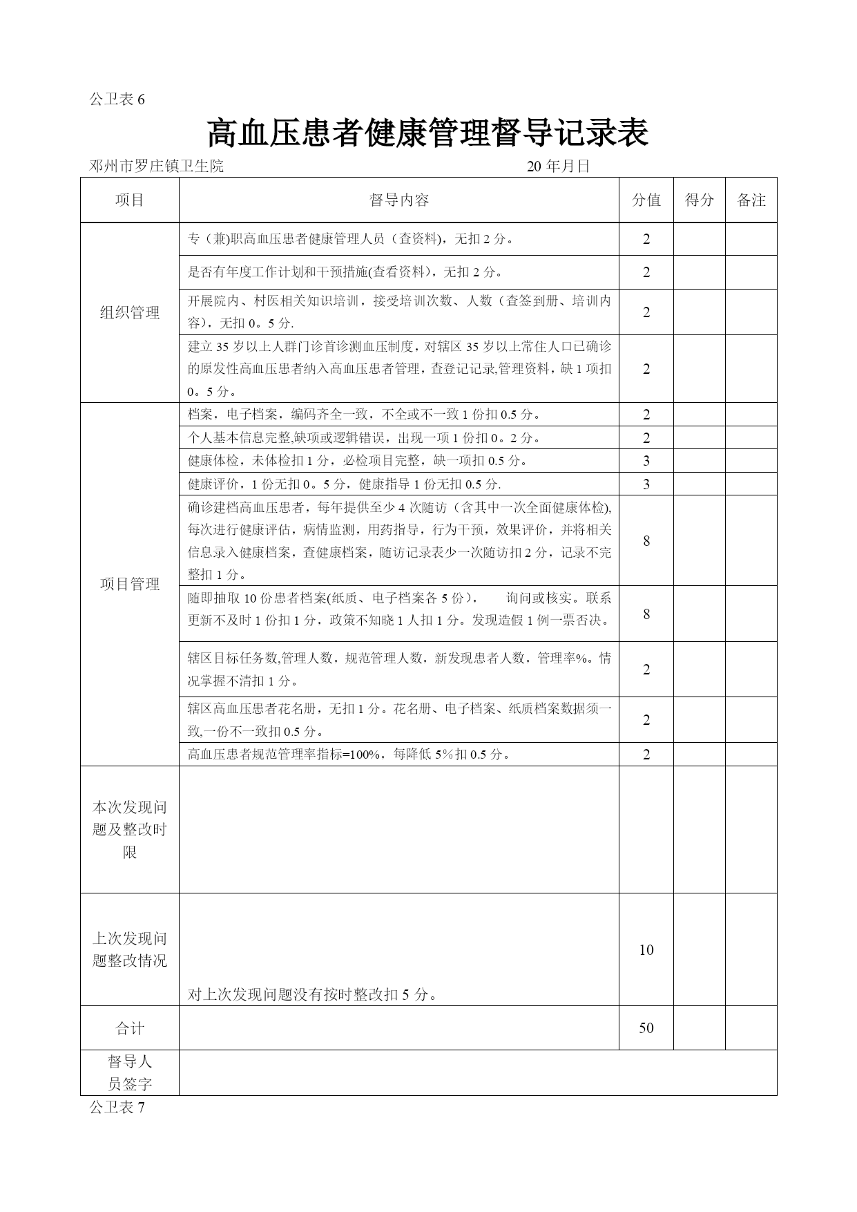 罗庄镇公共卫生考核督导记录表(可以直接使用,可编辑优秀版资料,欢迎下载)公卫表1居民健康档案督导记录表邓州市罗庄镇卫生院20年月日项目督导内容分值得分备注档案管理是否有专职(兼)人负责,是否有制定村卫生室居民健康档案督导方案,缺1项扣2分。5专柜设置,否扣1分。档案保管达到防火、防虫、防鼠要求,达不到要求扣1分。数量是否够用,不够用扣0.5分。5存放管理:档案标示是否清晰明朗,否扣0。5分。存放是否便于取阅,不便扣0.5分。5建档质量随机抽取5份健康档案(重点人群除外),入户或询问率应达到50%。随即抽取5份电子健康档案(与纸质档案不复发),入户或询问率应达到50%.纸质档案、电子档案编码是否填写,否扣0。5分.是否规范一致,不规范一致扣0。5分.5纸质档案、电子档案个人基本信息:缺项、逻辑错误出现一项扣0。5分。10纸质档案、电子档案健康体检项目、居民健康档案信息卡出现缺项或逻辑错误,每项扣0。1分。10通过或入户核实。或入户询问档案份数5份。档案不真实1份扣3分.15重点人群档案管理随机抽取5份重点人群健康档案,入户或询问.不通或询问结果不真实每例扣3分。20档案完善档案存在问题整改情况:2021年6月底整改结束,未开始整改扣5分,整改不到位扣3分。12月底前仍未整改年度不得分。10动态管理居民健康档案动态管理人,动态管理率%。花名册、电子档案、纸质档案数据需一致,一份不一致扣0。5分。5本次发现问题及整改时限上次发现问题整改情况对上次发现问题没有按时整改扣5分.10合计100督导人员签字公卫表2健康教育督导记录表邓州市罗庄镇卫生院20年月日项目督导内容分值得分备注组织管理是否成立健康教育管理组织、专兼健康教育工作人员(查文件)、村卫生室健康教育督导方案。缺1项扣1分。4是否制定年度工作计划,无计划的扣1分.3健康教育管理乡(镇)卫生院、社区卫生服务中心健康教育印刷材料发放每年提供不少于12种内容.少1种扣0.5分。是否放置在村卫生室、诊室、输液大厅等处。未放置扣0。5分。4每年播放影像资料不少于6种。是否在宣教室、候诊大厅、输液中心等处播放。未播放扣2分。设施、设备不能正常使用扣2分。4乡镇卫生院宣传栏不少于2个,每个宣传栏的面积不少于2平方米。每个机构每月最少更换1次健康教育宣传栏内容(保留原始宣传栏资料内容)。每年更新宣传内容至少6次.少1个、面积不达2平方米扣0。5分。宣传少1次扣1分。时间与任务同步,不同步1次扣0.5分.5利用各种健康主题日开展健康咨询活动并发放宣传资料.乡镇卫生院每年至少开展9次公共健康咨询活动。每少1次扣1分.活动应留存照片、健康教育记录表、教案、签到册(留,回访一次不真实扣0.5分)。时间与任务同步,不同步1次扣0.5分。10定期举办健康教育知识讲座。针对高血压、糖尿病、重症精神病、孕产妇、0-36月儿童家长重点指导。乡镇卫生院每月至少举办1次健康知识讲座。每年举办健康知识讲座12次。查看健康讲座资料,包括健康教育活动记录表、签到册(留、回访一次不真实扣0。5分)、教案、活动照片。每少1次扣1分,资料不全扣0。2分.时间与任务同步,不同步1次扣0.5分。10本次发现问题及整改时限上次发现问题整改情况对上次发现问题没有按时整改扣5分。10合计50督导人员签字公卫表3传染病报告与处理邓州市罗庄镇卫生院20年月日项目督导内容分值得分备注组织管理是否建立传染病和突发公共卫生事件报告制度,未建立扣2分。5有无年度工作计划或总结,无扣1分。5是否按时参加传染病和突发公共卫生事件知识的培训和指导,查看相关记录,缺一次扣2分.5传染病报告与处理传染病报告是否及时,及时报告率100%得满分,每下降10%扣1分,扣完为止。5是否开展结核病、艾滋病宣传指导服务,否扣1分。随机抽查1—2名在治结核病人,查看服药卡内服药记录及督导记录填写情况。(每一例不符合要求扣1分)10是否能协助上级专业机构开展疫情疫点处理,排查密切接触者,留观随访,指导落实消毒预防等措施。否扣5分.同时纳入不良执业记分2分。10对突发公卫事件,未按有关法律法规及时采取有效措施,隐瞒、缓报、谎报造成不良后果的,一票否决。20发生重大自然灾害、突发重大伤亡事故、传染病流行或其他严重威胁人民生命健康的紧急情况时,拒不服从上级管理部门的统一调遣、统一管理或不按要求组织实施的,年度内所有工作一票否决,停止公卫经费、零差率专项补助和一般诊疗费的拨付。30本次发现问题及整改时限上次发现问题整改情况对上次发现问题没有按时整改扣5分。10合计100督导人员签字公卫表4预防接种督导记录表邓州市罗庄镇卫生院20年月日项目督导内容分值得分备注档案管理人口资料:是否有7岁以下儿童数,分年龄组统计。否扣