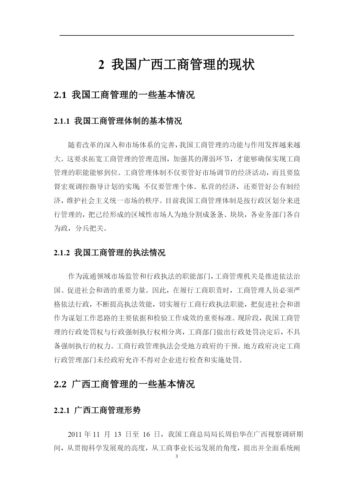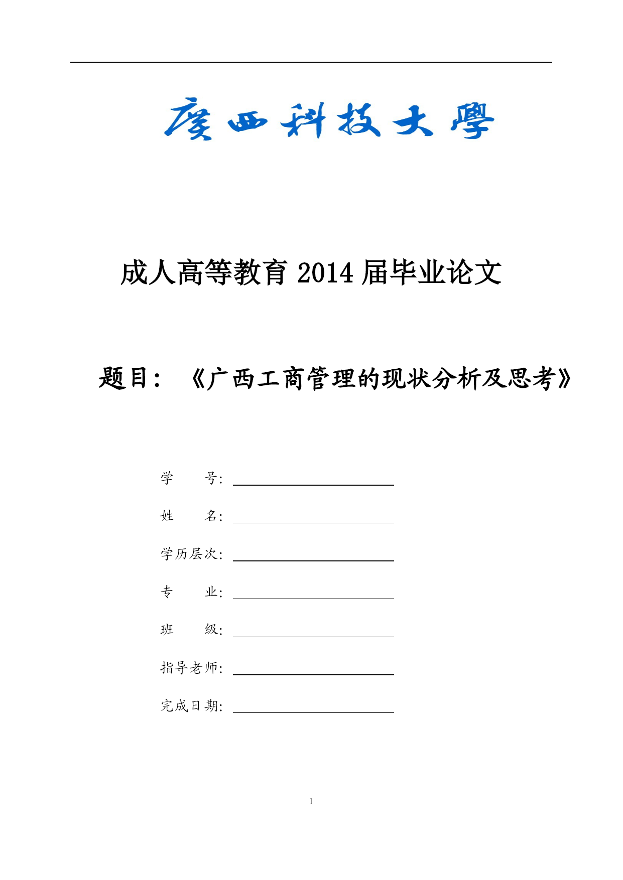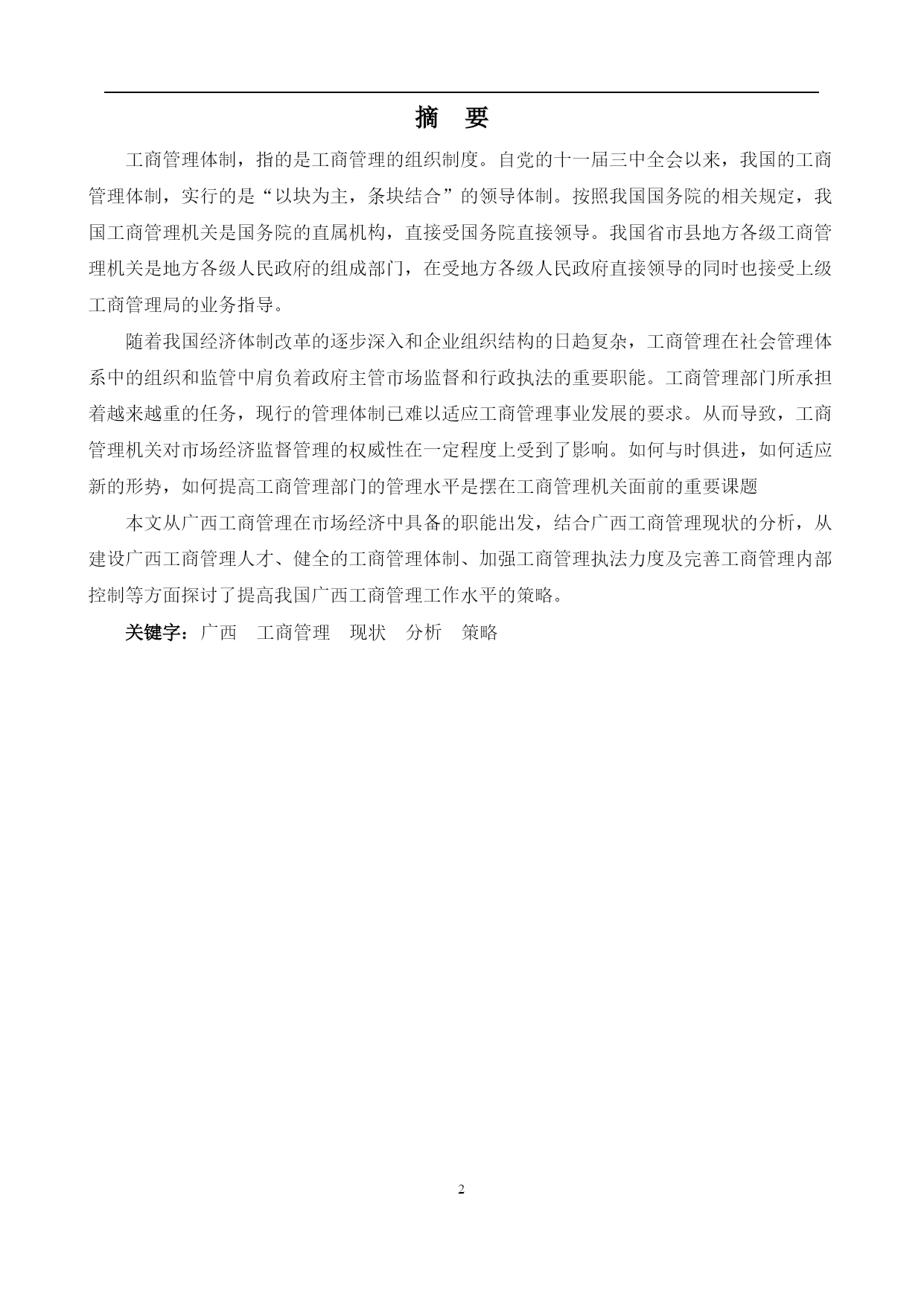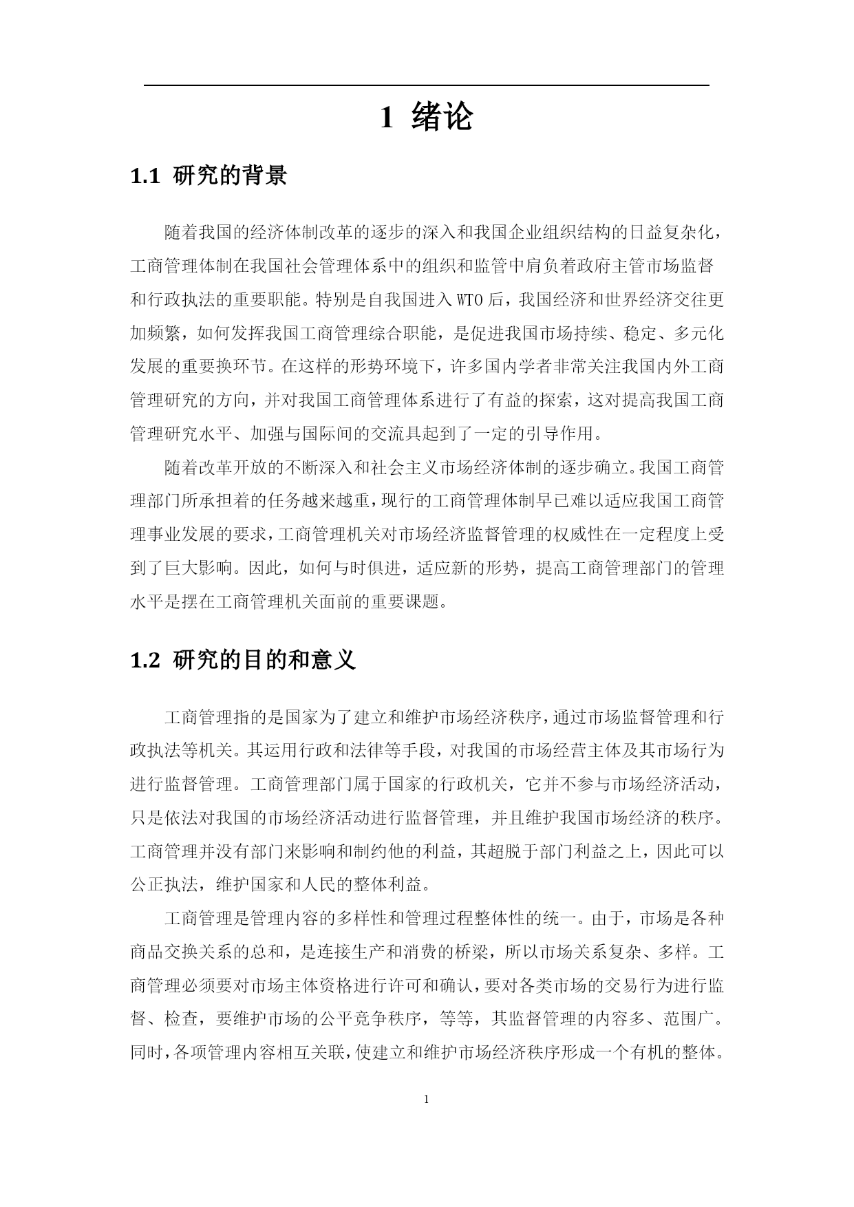 PAGE\*MERGEFORMAT7成人高等教育2014届毕业论文题目:《广西工商管理的现状分析及思考》学号:姓名:学历层次:专业:班级:指导老师:完成日期:摘要工商管理体制,指的是工商管理的组织制度。自党的十一届三中全会以来,我国的工商管理体制,实行的是“以块为主,条块结合”的领导体制。按照我国国务院的相关规定,我国工商管理机关是国务院的直属机构,直接受国务院直接领导。我国省市县地方各级工商管理机关是地方各级人民政府的组成部门,在受地方各级人民政府直接领导的同时也接受上级工商管理局的业务指导。随着我国经济体制改革的逐步深入和企业组织结构的日趋复杂,工商管理在社会管理体系中的组织和监管中肩负着政府主管市场监督和行政执法的重要职能。工商管理部门所承担着越来越重的任务,现行的管理体制已难以适应工商管理事业发展的要求。从而导致,工商管理机关对市场经济监督管理的权威性在一定程度上受到了影响。如何与时俱进,如何适应新的形势,如何提高工商管理部门的管理水平是摆在工商管理机关面前的重要课题本文从广西工商管理在市场经济中具备的职能出发,结合广西工商管理现状的分析,从建设广西工商管理人才、健全的工商管理体制、加强工商管理执法力度及完善工商管理内部控制等方面探讨了提高我国广西工商管理工作水平的策略。关键字:广西工商管理现状分析策略AbstractAbstractbusinessmanagementsystem,referstothesystemoforganizationandmanagement.Sincetheparty'selevenplenarysession,China'sbusinessmanagementsystem,istheimplementationofthe"integrationofdepartmentswithpiecegivepriorityto,"leadershipsystem.InaccordancewiththerelevantprovisionsoftheStateCouncilofChina,theadministrativedepartmentforIndustryandcommerceundertheinstitutionoftheStateCouncil,directlyunderthedirectleadershipofthestatecouncil.OurcountrycityandCountyLocalAdministrationforIndustryandcommerceispartoflocalpeople'sgovernmentsatvariouslevels,underthedirectleadershipofthepeople'sgovernmentsatalllevelsalsoreceiveprofessionalguidancefromtheindustrialandcommercialadministrativebureau.WiththegradualdeepeningofChina'sreformofeconomicsystemandorganizationstructureismorecomplex,businessmanagementinthesocialmanagementsystemintheorganizationandsupervisionisshoulderingtheimportantfunctionofthegovernmentinchargeofmarketsupervisionandadministrativelawenforcement.Theadministrativedepartmentofindustryandcommerceareundertakingmoreandheaviertask,thepresentmanagementsystemhasbeendifficulttoadapttothedevelopmentoftheindustryandCommerceAdministrationrequirements.Thus,theauthorityoftheadministrativeorgansofindustryandCommerceonmarketsupervisionandmanagementofaffectedtoacertainextent.Howtokeeppacewiththetimes,howtoadapttothenewsituation,Howtoimprovethebusinessmanagementisanimporta