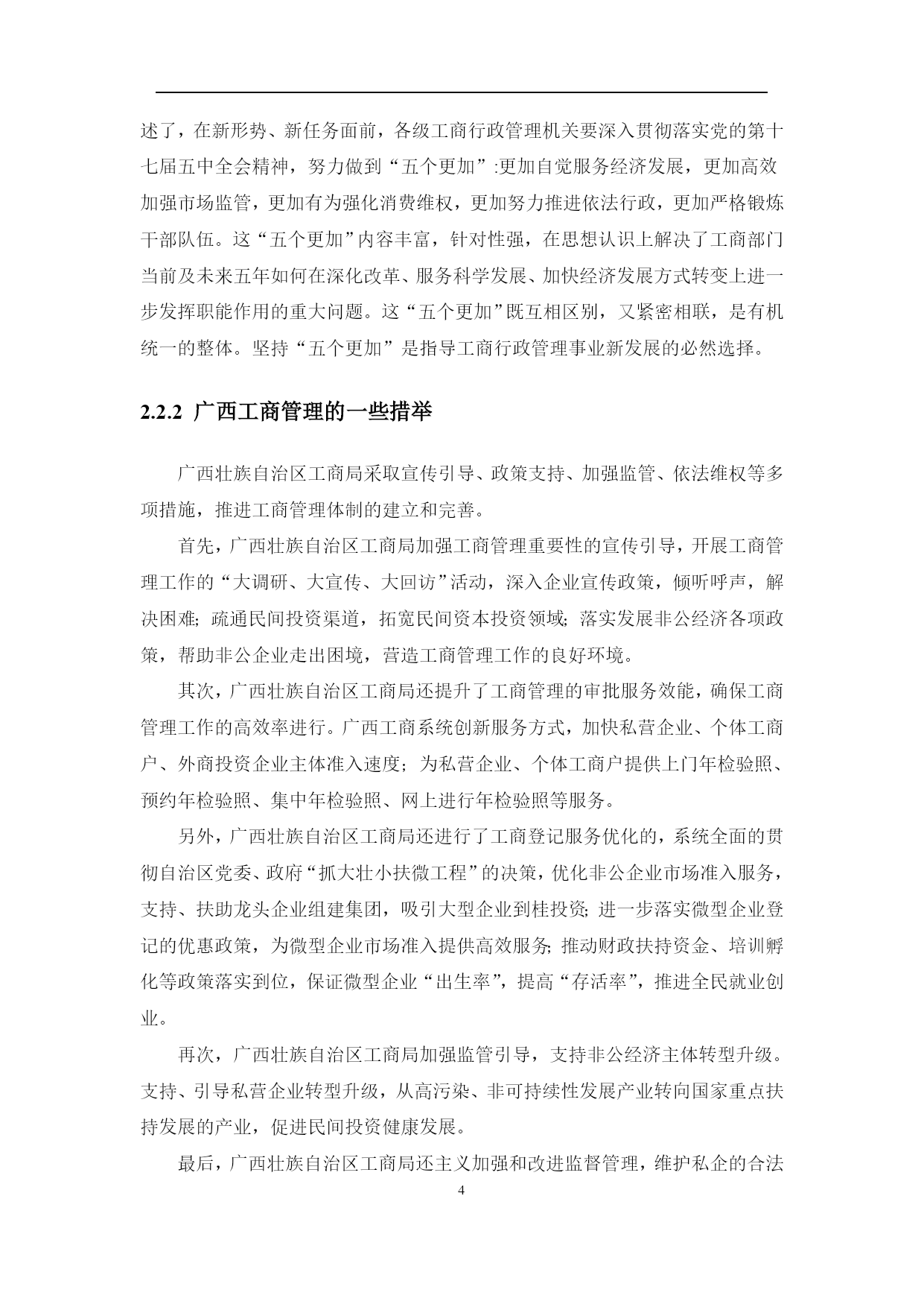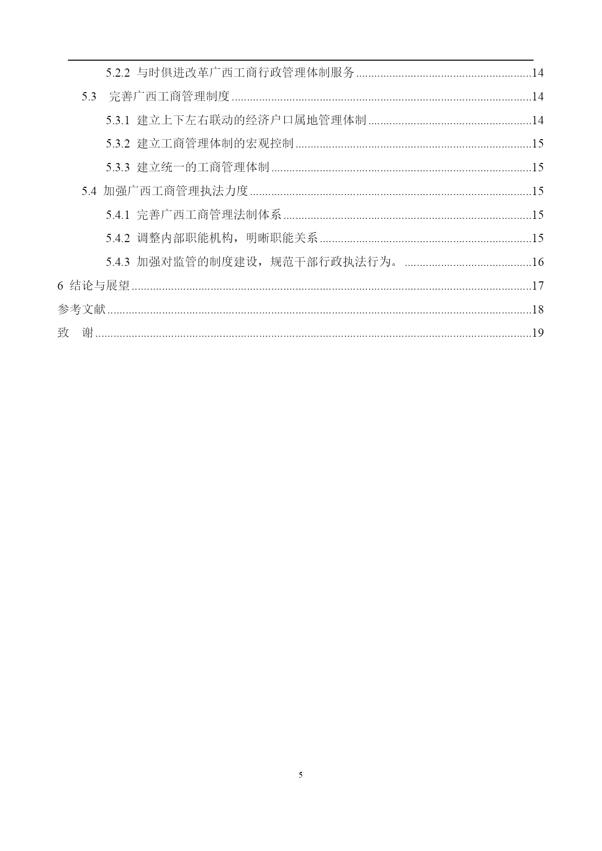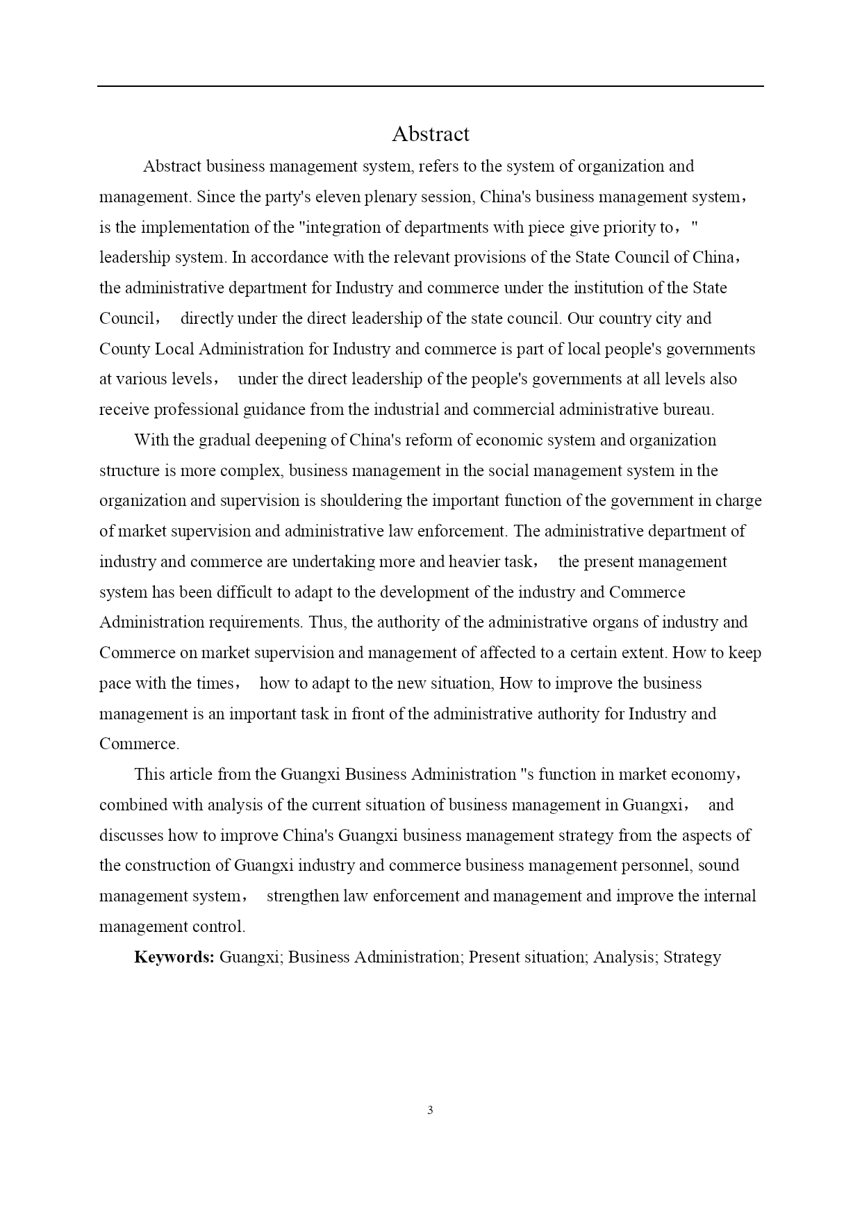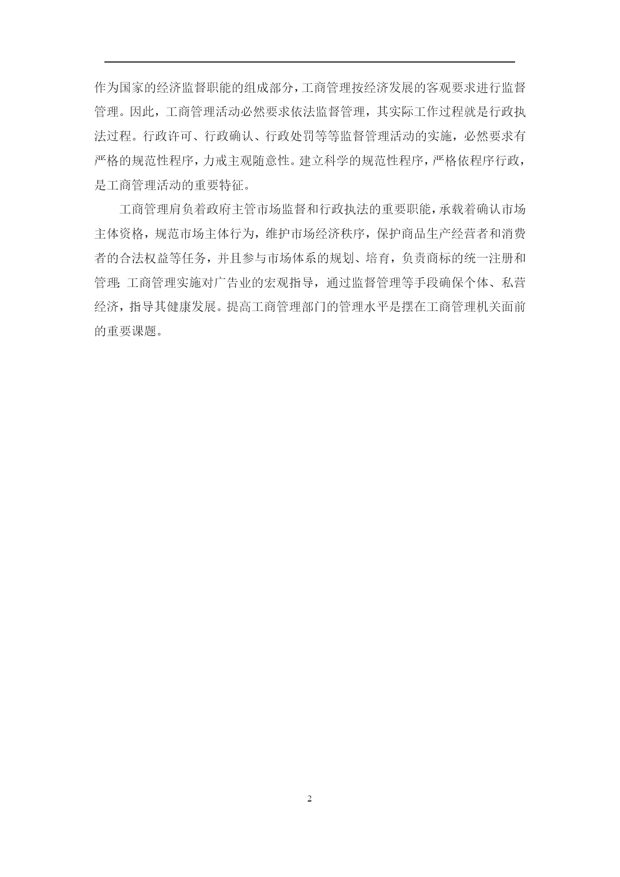 PAGE\*MERGEFORMAT7成人高等教育2014届毕业论文题目:《广西工商管理的现状分析及思考》学号:姓名:学历层次:专业:班级:指导老师:完成日期:摘要工商管理体制,指的是工商管理的组织制度。自党的十一届三中全会以来,我国的工商管理体制,实行的是“以块为主,条块结合”的领导体制。按照我国国务院的相关规定,我国工商管理机关是国务院的直属机构,直接受国务院直接领导。我国省市县地方各级工商管理机关是地方各级人民政府的组成部门,在受地方各级人民政府直接领导的同时也接受上级工商管理局的业务指导。随着我国经济体制改革的逐步深入和企业组织结构的日趋复杂,工商管理在社会管理体系中的组织和监管中肩负着政府主管市场监督和行政执法的重要职能。工商管理部门所承担着越来越重的任务,现行的管理体制已难以适应工商管理事业发展的要求。从而导致,工商管理机关对市场经济监督管理的权威性在一定程度上受到了影响。如何与时俱进,如何适应新的形势,如何提高工商管理部门的管理水平是摆在工商管理机关面前的重要课题本文从广西工商管理在市场经济中具备的职能出发,结合广西工商管理现状的分析,从建设广西工商管理人才、健全的工商管理体制、加强工商管理执法力度及完善工商管理内部控制等方面探讨了提高我国广西工商管理工作水平的策略。关键字:广西工商管理现状分析策略AbstractAbstractbusinessmanagementsystem,referstothesystemoforganizationandmanagement.Sincetheparty'selevenplenarysession,China'sbusinessmanagementsystem,istheimplementationofthe"integrationofdepartmentswithpiecegivepriorityto,"leadershipsystem.InaccordancewiththerelevantprovisionsoftheStateCouncilofChina,theadministrativedepartmentforIndustryandcommerceundertheinstitutionoftheStateCouncil,directlyunderthedirectleadershipofthestatecouncil.OurcountrycityandCountyLocalAdministrationforIndustryandcommerceispartoflocalpeople'sgovernmentsatvariouslevels,underthedirectleadershipofthepeople'sgovernmentsatalllevelsalsoreceiveprofessionalguidancefromtheindustrialandcommercialadministrativebureau.WiththegradualdeepeningofChina'sreformofeconomicsystemandorganizationstructureismorecomplex,businessmanagementinthesocialmanagementsystemintheorganizationandsupervisionisshoulderingtheimportantfunctionofthegovernmentinchargeofmarketsupervisionandadministrativelawenforcement.Theadministrativedepartmentofindustryandcommerceareundertakingmoreandheaviertask,thepresentmanagementsystemhasbeendifficulttoadapttothedevelopmentoftheindustryandCommerceAdministrationrequirements.Thus,theauthorityoftheadministrativeorgansofindustryandCommerceonmarketsupervisionandmanagementofaffectedtoacertainextent.Howtokeeppacewiththetimes,howtoadapttothenewsituation,Howtoimprovethebusinessmanagementisanimporta