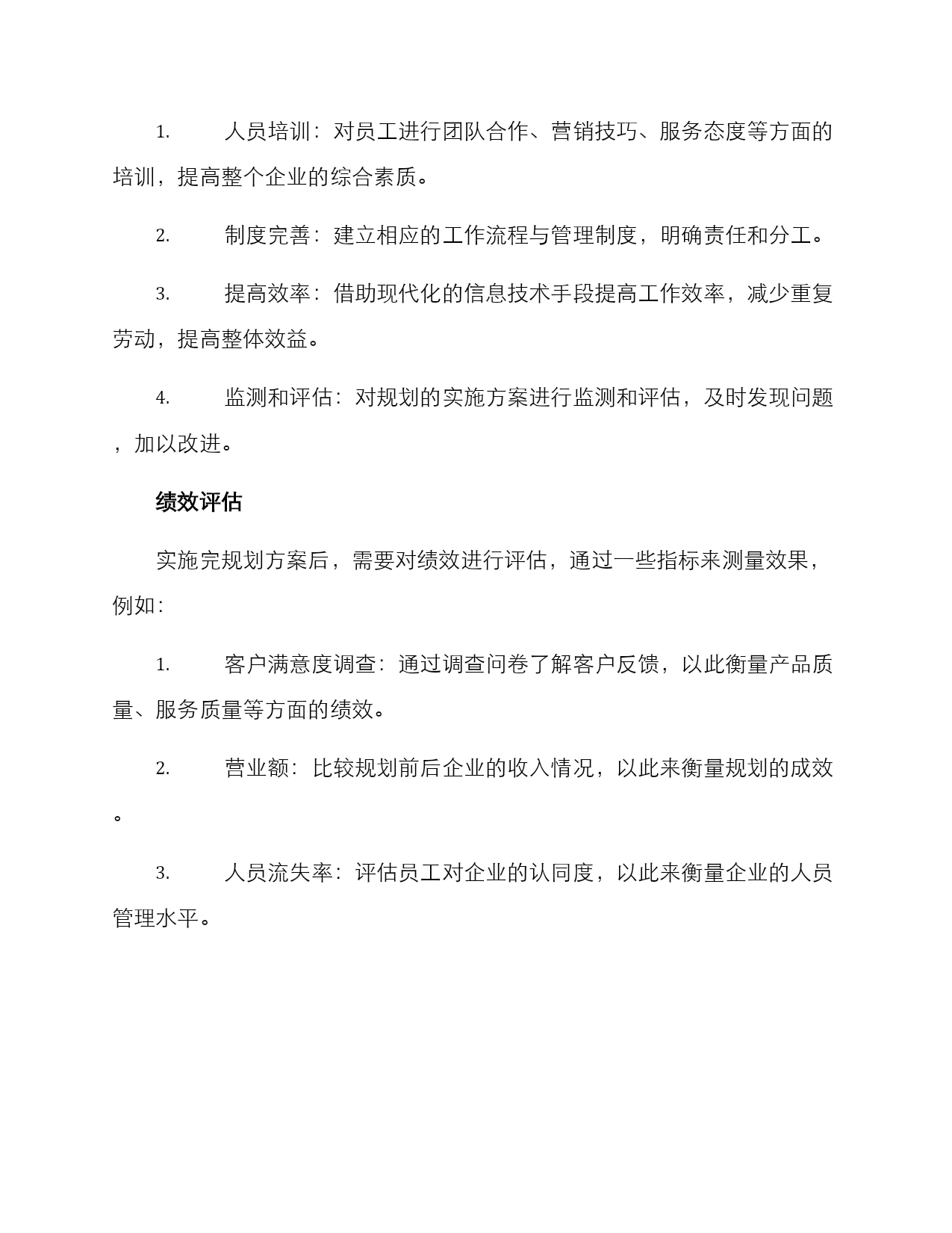 旅游企业规划方案背景旅游行业的快速发展引领了旅游企业的兴起,竞争也越来越激烈。为了在市场上立足,旅游企业需要制定科学合理的规划方案,以实现长期发展的目标。目标与策略旅游企业的规划方案应该以客户为中心,以提高用户满意度为目标,制定以下策略:客户分层:根据旅游市场的分析,将客户分为不同的目标群体,分别进行精细化市场营销。产品优化:不断挖掘旅游资源,提升旅游产品的品质,以吸引更多的客户群体。提高服务质量:提供优质的旅游服务,实现客户的个性化需求,营造出品牌忠诚度,吸引更多的回头客。强化品牌建设:根据买家决策过程的理论,通过广告、推广等宣传方式提高品牌知名度,增强品牌感知和品牌信赖度。实施策略在制定了规划方案后,实施过程至关重要,需要注重以下几个方面:人员培训:对员工进行团队合作、营销技巧、服务态度等方面的培训,提高整个企业的综合素质。制度完善:建立相应的工作流程与管理制度,明确责任和分工。提高效率:借助现代化的信息技术手段提高工作效率,减少重复劳动,提高整体效益。监测和评估:对规划的实施方案进行监测和评估,及时发现问题,加以改进。绩效评估实施完规划方案后,需要对绩效进行评估,通过一些指标来测量效果,例如:客户满意度调查:通过调查问卷了解客户反馈,以此衡量产品质量、服务质量等方面的绩效。营业额:比较规划前后企业的收入情况,以此来衡量规划的成效。人员流失率:评估员工对企业的认同度,以此来衡量企业的人员管理水平。总结建立科学合理的旅游企业规划方案,对企业长期的发展至关重要,通过细致周密的方案制定、全程实施、严格评估,能够确保企业长期的健康发展。
