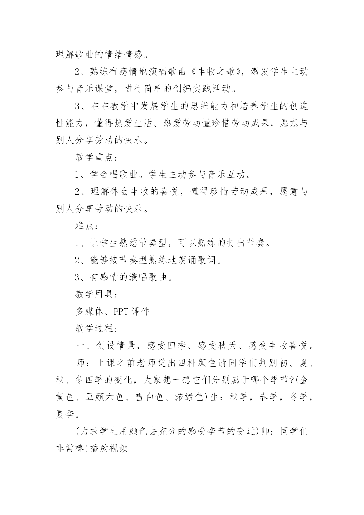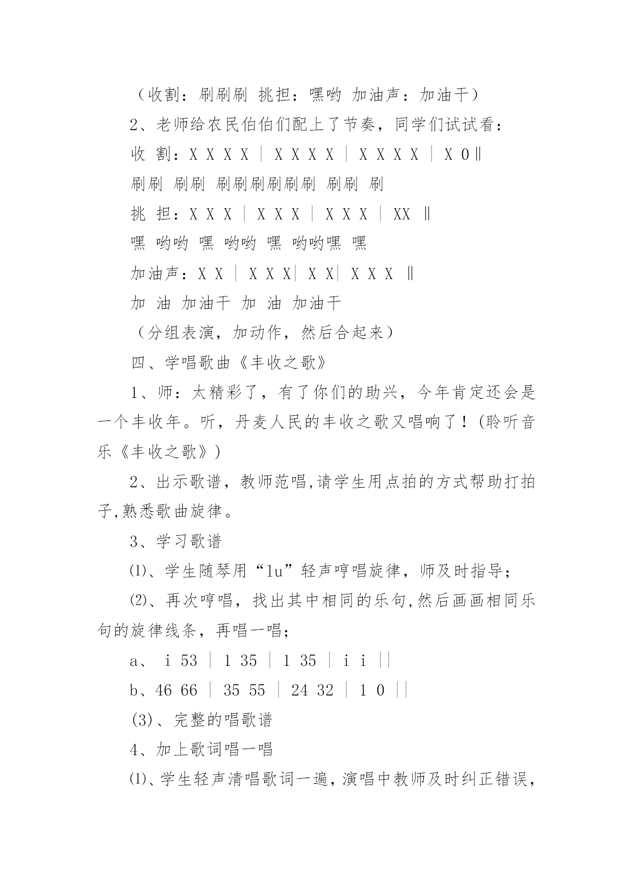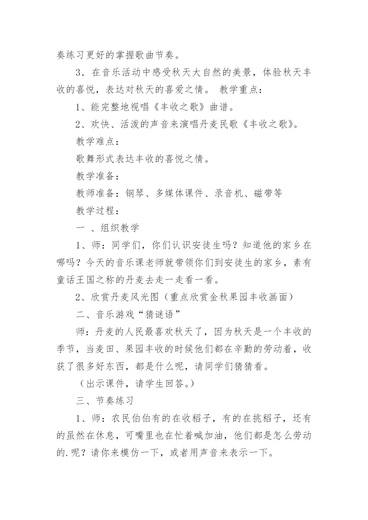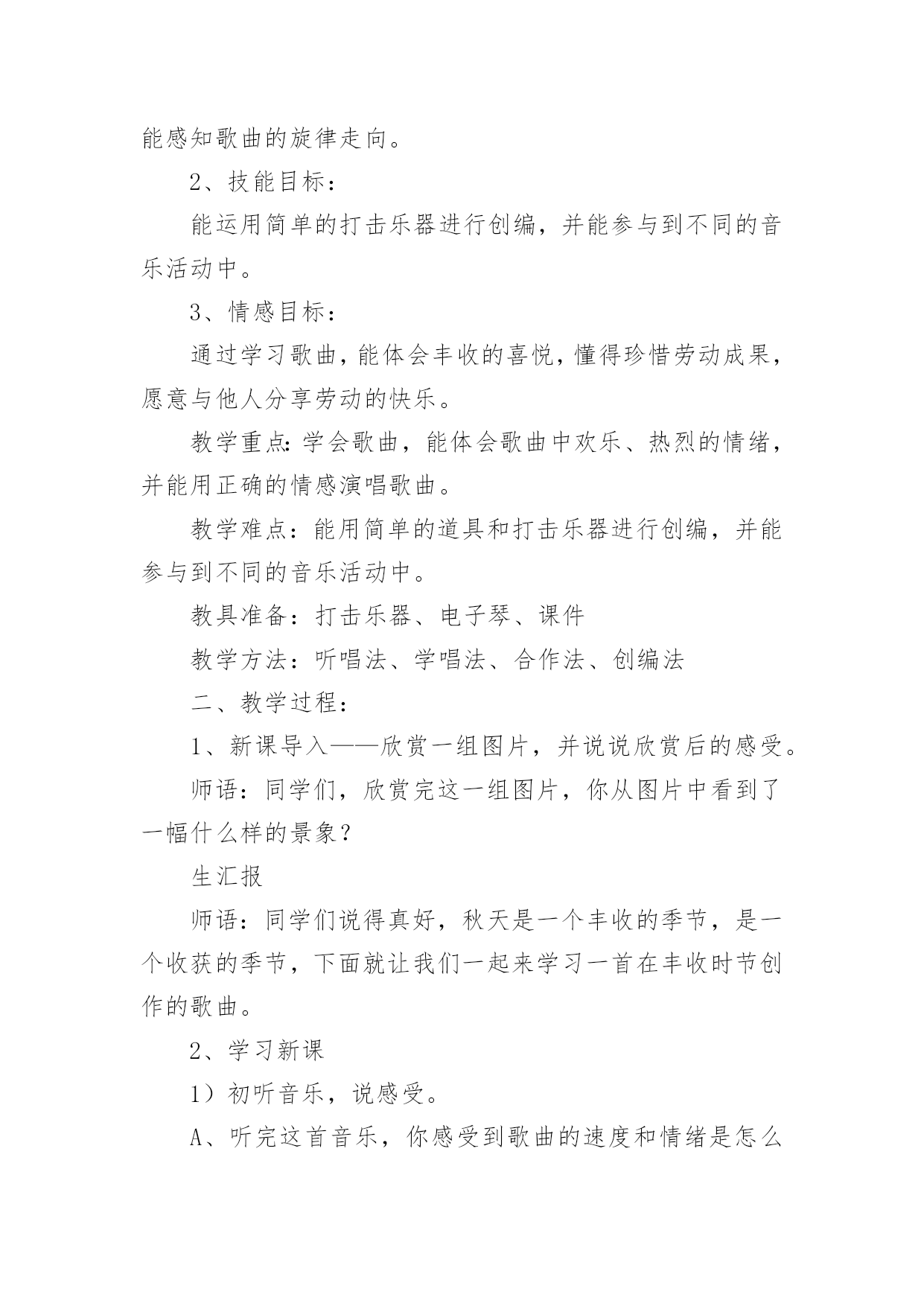 《丰收之歌》教学设计作为一名专为他人授业解惑的人民教师,常常要根据教学需要编写教学设计,借助教学设计可以更好地组织教学活动。那么教学设计应该怎么写才合适呢?以下是小编为大家收集的《丰收之歌》教学设计,仅供参考,大家一起来看看吧。《丰收之歌》教学设计1教学目标:1、用平稳、悠长的气息和柔和、连惯的声音富有表情地歌唱《丰收之歌》,表达丹麦百姓对美好生活的.憧憬。2、学跳集体舞《丰收之歌》教学重点、难点:用柔和、连惯的声音歌唱《丰收之歌》,唱好一音多字处。教学过程:一、组织教学。听曲入室,师生问好!精彩三分钟。二、读谱知识。1、出示课件:视唱歌谱2、观察、思考、探讨:这几个小节同我们以前认识的有什么不同?三、教学新歌《丰收之歌》1、情境导入。(课件出示)猜猜这是来到了哪儿?(丹麦)是什么美景?请听《丰收之歌》2、聆听范唱,了解节拍及乐曲的基本情绪。3、我们用拍手的方式为他们伴奏。4、随乐用la哼唱两遍。5、随乐学曲谱。6、朗读歌词。(要饱含对家乡的热爱之情)7、随乐唱词。四、音乐游戏:1、全班同学分成两大组,先后离开坐位围成两大圈,边唱边跟着领头的小朋友做动作,歌声形成卡农式,最后各大圈又回到自己的坐位结束2、布置家庭作业:在美丽的秋天里,你喜欢什么?是果园的水果?动物园的动物?公园里的花朵?——请同学们根据自己喜爱,把它画在书上,课后给大家说一说,另外,希望同学们利用休息时间到公园、郊外寻找一些树叶,经过自己剪贴,制作一幅精美的艺术作品,为它选上一段音乐,或配上几句歌词。《丰收之歌》教学设计2教学目标:1、引导学生感受秋天的收获与喜悦之情,能够正确的理解歌曲的情绪情感。2、熟练有感情地演唱歌曲《丰收之歌》,激发学生主动参与音乐课堂,进行简单的创编实践活动。3、在在教学中发展学生的思维能力和培养学生的创造性能力,懂得热爱生活、热爱劳动懂珍惜劳动成果,愿意与别人分享劳动的快乐。教学重点:1、学会唱歌曲。学生主动参与音乐互动。2、理解体会丰收的喜悦,懂得珍惜劳动成果,愿意与别人分享劳动的快乐。难点:1、让学生熟悉节奏型,可以熟练的打出节奏。2、能够按节奏型熟练地朗诵歌词。3、有感情的演唱歌曲。教学用具:多媒体、PPT课件教学过程:一、创设情景,感受四季、感受秋天、感受丰收喜悦。师:上课之前老师说出四种颜色请同学们判别初、夏、秋、冬四季的变化,大家想一想它们分别属于哪个季节?(金黄色、五颜六色、雪白色、浓绿色)生:秋季,春季,冬季,夏季。(力求学生用颜色去充分的感受季节的变迁)师:同学们非常棒!播放视频1、视频播放结束了,在视频中你们看到了哪些画面?感受到了怎样的场景?2、学生回答,教师综述:我们在视频中看到了在丰收的季节里收获了很多水果,有香蕉、草莓、橙子,苹果、葡萄、桃子,几个小朋友还共同制作了一颗水果树,同时大家也感受到了丰收的快乐。在丰收的季节里除了会收获很多水果外还会收获一些什么东西呢?接着老师在播放几张图片,我们看到了沉甸甸的谷穗、枝头累累的果实、感受到了生机勃勃的丰收景象……师:大家回答的非常好!今天老师就带领大家一起去感受田野到村庄丰收的景象,去看那丰收的秋天。4、接下来我们一起来学习一首丹麦民歌《丰收之歌》二、新课学习。导语:秋天的田野、果园是那么迷人,我们的农民伯伯唱着丰收之歌从远处走来了。1、播放《丰收之歌》音乐。2、师:同学们初步聆听了《丰收之歌》大家能告诉老师,歌曲的情绪吗?生:欢快、热情。2、按节奏诵读歌词。三、学唱歌曲《丰收之歌》。1、师:你觉得怎样唱才能表现人们喜获丰收的情绪?2、再次播放视频:学生再次听赏歌曲《丰收之歌》,进一步掌握歌曲的.演唱风格。升华:知道果实是农民经过辛劳和汗水换来的,教育学生要珍惜劳动成果,对需要帮助的人要伸出援助之手。3、教师教唱,一句一句教授学生方法:多次演唱,拍打节奏演唱,以小组为单位演唱。(师生互动,面向全体,引导每位学生积极参与,团结合作,在实践中感受丰收的喜悦,发挥学生的表演才能)3、游戏:1、画画2、猜谜语大家来猜猜吧。(出示谜语)一个老汉尺把长,胡子长在头顶上,身穿几层单衣裳,巧把珍珠衣内藏。(打一农作物)生:是玉米。4、法律知识点播四、课堂小结。师:秋天是一个丰收的季节,是一个与人分享快乐、分享劳动成果的季节。农民伯伯经过自己的双手辛勤的劳动获得了物质上的大丰收,老师希望同学们通过自己的努力获得知识上的大丰收。那就让我们大家一起演唱着《丰收之歌》结束今天的课堂吧。《丰收之歌》教学设计3一、教学目标1、认知目标:学习歌曲《丰收之歌》,体会歌曲中欢乐、热烈的情绪,能感知歌曲的旋律走向。2、技能目标:能运用简单的打击乐器进行创编,并能参与到不同的音乐活动中。3、情感目标:通过学习歌曲,能体会丰收的喜悦,懂得珍惜劳动成果,愿意与他人分享劳动的快乐。教学重点:学会歌曲,