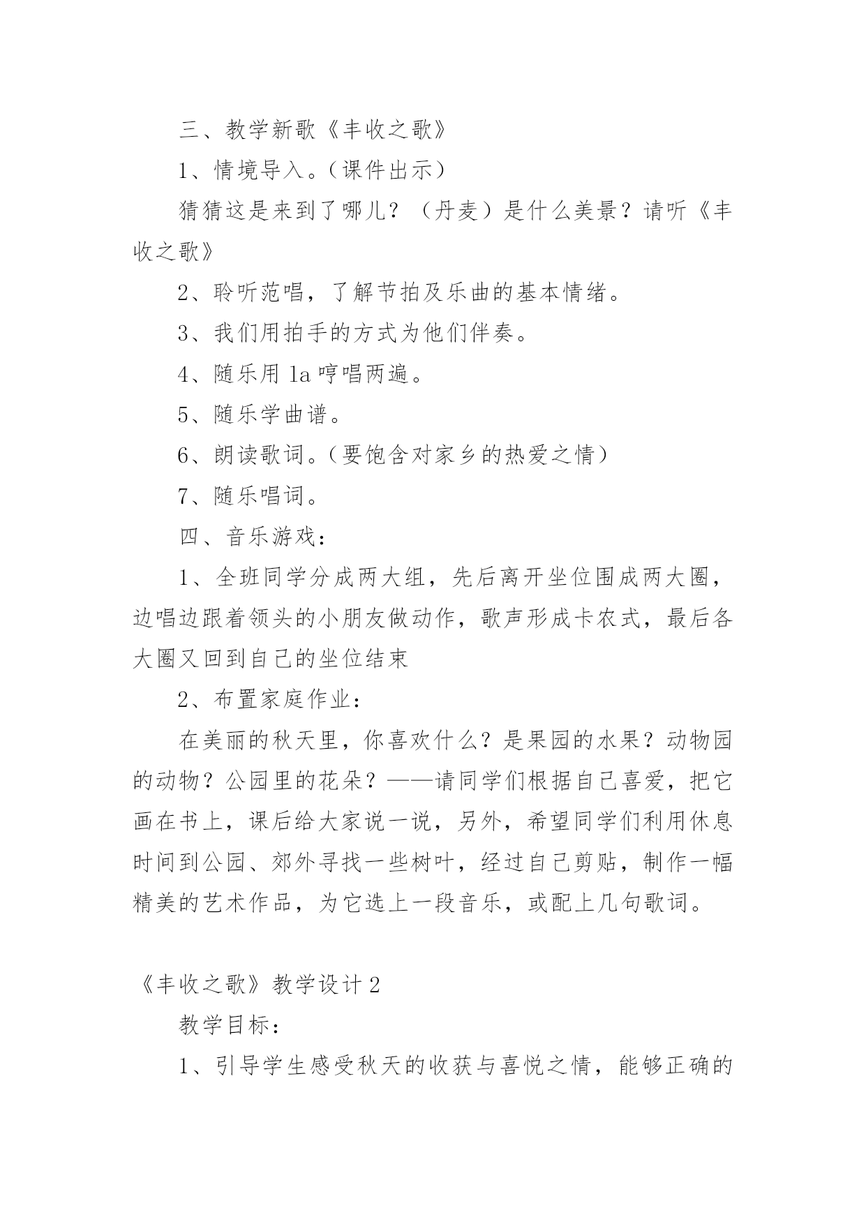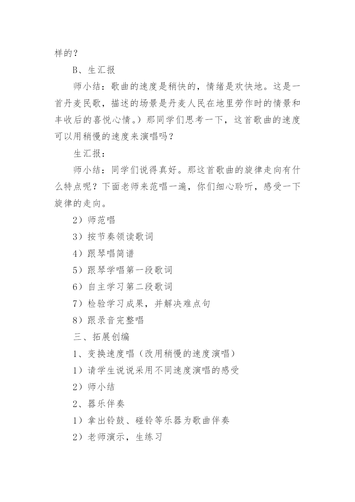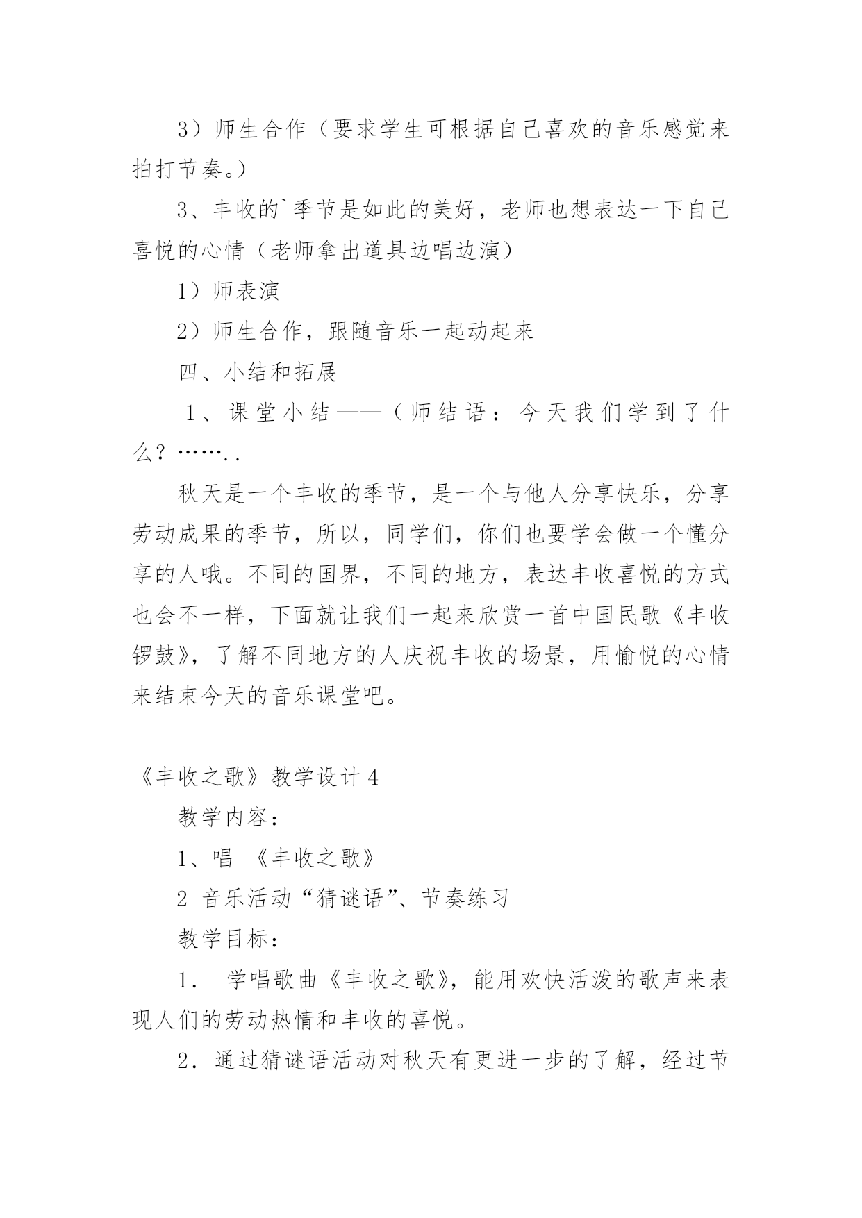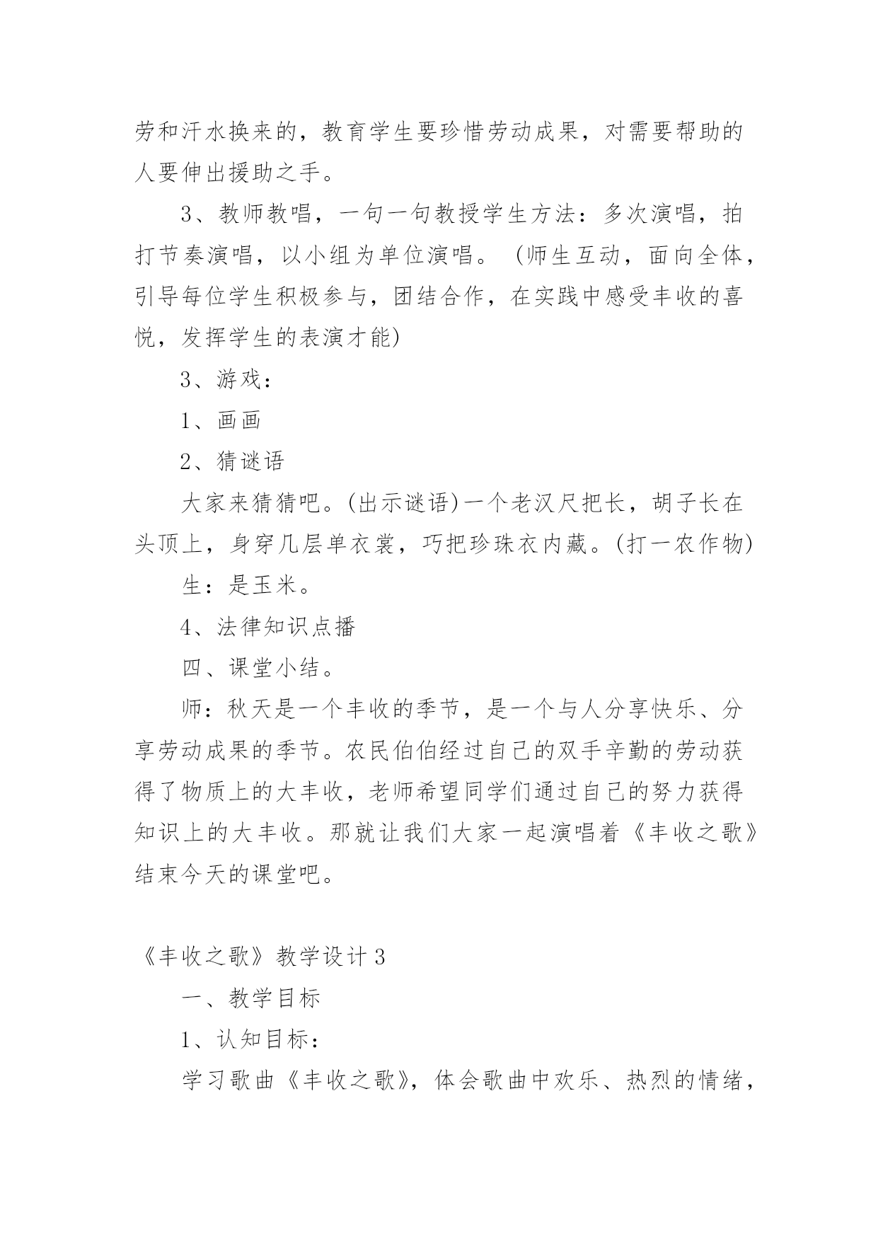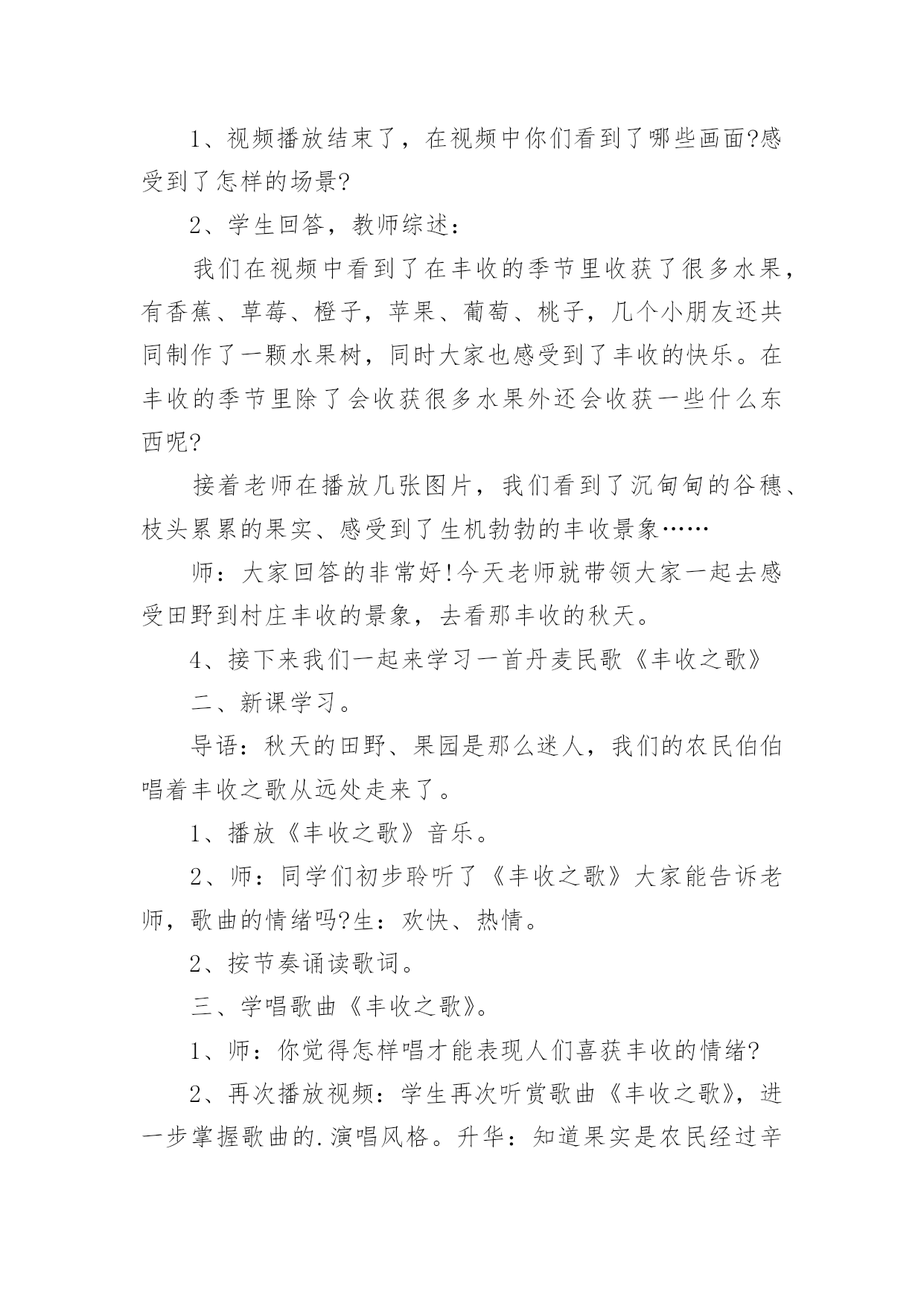 《丰收之歌》教学设计作为一名专为他人授业解惑的人民教师,常常要根据教学需要编写教学设计,借助教学设计可以更好地组织教学活动。那么教学设计应该怎么写才合适呢?以下是小编为大家收集的《丰收之歌》教学设计,仅供参考,大家一起来看看吧。《丰收之歌》教学设计1教学目标:1、用平稳、悠长的气息和柔和、连惯的声音富有表情地歌唱《丰收之歌》,表达丹麦百姓对美好生活的.憧憬。2、学跳集体舞《丰收之歌》教学重点、难点:用柔和、连惯的声音歌唱《丰收之歌》,唱好一音多字处。教学过程:一、组织教学。听曲入室,师生问好!精彩三分钟。二、读谱知识。1、出示课件:视唱歌谱2、观察、思考、探讨:这几个小节同我们以前认识的有什么不同?三、教学新歌《丰收之歌》1、情境导入。(课件出示)猜猜这是来到了哪儿?(丹麦)是什么美景?请听《丰收之歌》2、聆听范唱,了解节拍及乐曲的基本情绪。3、我们用拍手的方式为他们伴奏。4、随乐用la哼唱两遍。5、随乐学曲谱。6、朗读歌词。(要饱含对家乡的热爱之情)7、随乐唱词。四、音乐游戏:1、全班同学分成两大组,先后离开坐位围成两大圈,边唱边跟着领头的小朋友做动作,歌声形成卡农式,最后各大圈又回到自己的坐位结束2、布置家庭作业:在美丽的秋天里,你喜欢什么?是果园的水果?动物园的动物?公园里的花朵?——请同学们根据自己喜爱,把它画在书上,课后给大家说一说,另外,希望同学们利用休息时间到公园、郊外寻找一些树叶,经过自己剪贴,制作一幅精美的艺术作品,为它选上一段音乐,或配上几句歌词。《丰收之歌》教学设计2教学目标:1、引导学生感受秋天的收获与喜悦之情,能够正确的理解歌曲的情绪情感。2、熟练有感情地演唱歌曲《丰收之歌》,激发学生主动参与音乐课堂,进行简单的创编实践活动。3、在在教学中发展学生的思维能力和培养学生的创造性能力,懂得热爱生活、热爱劳动懂珍惜劳动成果,愿意与别人分享劳动的快乐。教学重点:1、学会唱歌曲。学生主动参与音乐互动。2、理解体会丰收的喜悦,懂得珍惜劳动成果,愿意与别人分享劳动的快乐。难点:1、让学生熟悉节奏型,可以熟练的打出节奏。2、能够按节奏型熟练地朗诵歌词。3、有感情的演唱歌曲。教学用具:多媒体、PPT课件教学过程:一、创设情景,感受四季、感受秋天、感受丰收喜悦。师:上课之前老师说出四种颜色请同学们判别初、夏、秋、冬四季的变化,大家想一想它们分别属于哪个季节?(金黄色、五颜六色、雪白色、浓绿色)生:秋季,春季,冬季,夏季。(力求学生用颜色去充分的感受季节的变迁)师:同学们非常棒!播放视频1、视频播放结束了,在视频中你们看到了哪些画面?感受到了怎样的场景?2、学生回答,教师综述:我们在视频中看到了在丰收的季节里收获了很多水果,有香蕉、草莓、橙子,苹果、葡萄、桃子,几个小朋友还共同制作了一颗水果树,同时大家也感受到了丰收的快乐。在丰收的季节里除了会收获很多水果外还会收获一些什么东西呢?接着老师在播放几张图片,我们看到了沉甸甸的谷穗、枝头累累的果实、感受到了生机勃勃的丰收景象……师:大家回答的非常好!今天老师就带领大家一起去感受田野到村庄丰收的景象,去看那丰收的秋天。4、接下来我们一起来学习一首丹麦民歌《丰收之歌》二、新课学习。导语:秋天的田野、果园是那么迷人,我们的农民伯伯唱着丰收之歌从远处走来了。1、播放《丰收之歌》音乐。2、师:同学们初步聆听了《丰收之歌》大家能告诉老师,歌曲的情绪吗?生:欢快、热情。2、按节奏诵读歌词。三、学唱歌曲《丰收之歌》。1、师:你觉得怎样唱才能表现人们喜获丰收的情绪?2、再次播放视频:学生再次听赏歌曲《丰收之歌》,进一步掌握歌曲的.演唱风格。升华:知道果实是农民经过辛劳和汗水换来的,教育学生要珍惜劳动成果,对需要帮助的人要伸出援助之手。3、教师教唱,一句一句教授学生方法:多次演唱,拍打节奏演唱,以小组为单位演唱。(师生互动,面向全体,引导每位学生积极参与,团结合作,在实践中感受丰收的喜悦,发挥学生的表演才能)3、游戏:1、画画2、猜谜语大家来猜猜吧。(出示谜语)一个老汉尺把长,胡子长在头顶上,身穿几层单衣裳,巧把珍珠衣内藏。(打一农作物)生:是玉米。4、法律知识点播四、课堂小结。师:秋天是一个丰收的季节,是一个与人分享快乐、分享劳动成果的季节。农民伯伯经过自己的双手辛勤的劳动获得了物质上的大丰收,老师希望同学们通过自己的努力获得知识上的大丰收。那就让我们大家一起演唱着《丰收之歌》结束今天的课堂吧。《丰收之歌》教学设计3一、教学目标1、认知目标:学习歌曲《丰收之歌》,体会歌曲中欢乐、热烈的情绪,能感知歌曲的旋律走向。2、技能目标:能运用简单的打击乐器进行创编,并能参与到不同的音乐活动中。3、情感目标:通过学习歌曲,能体会丰收的喜悦,懂得珍惜劳动成果,愿意与他人分享劳动的快乐。教学重点:学会歌曲,