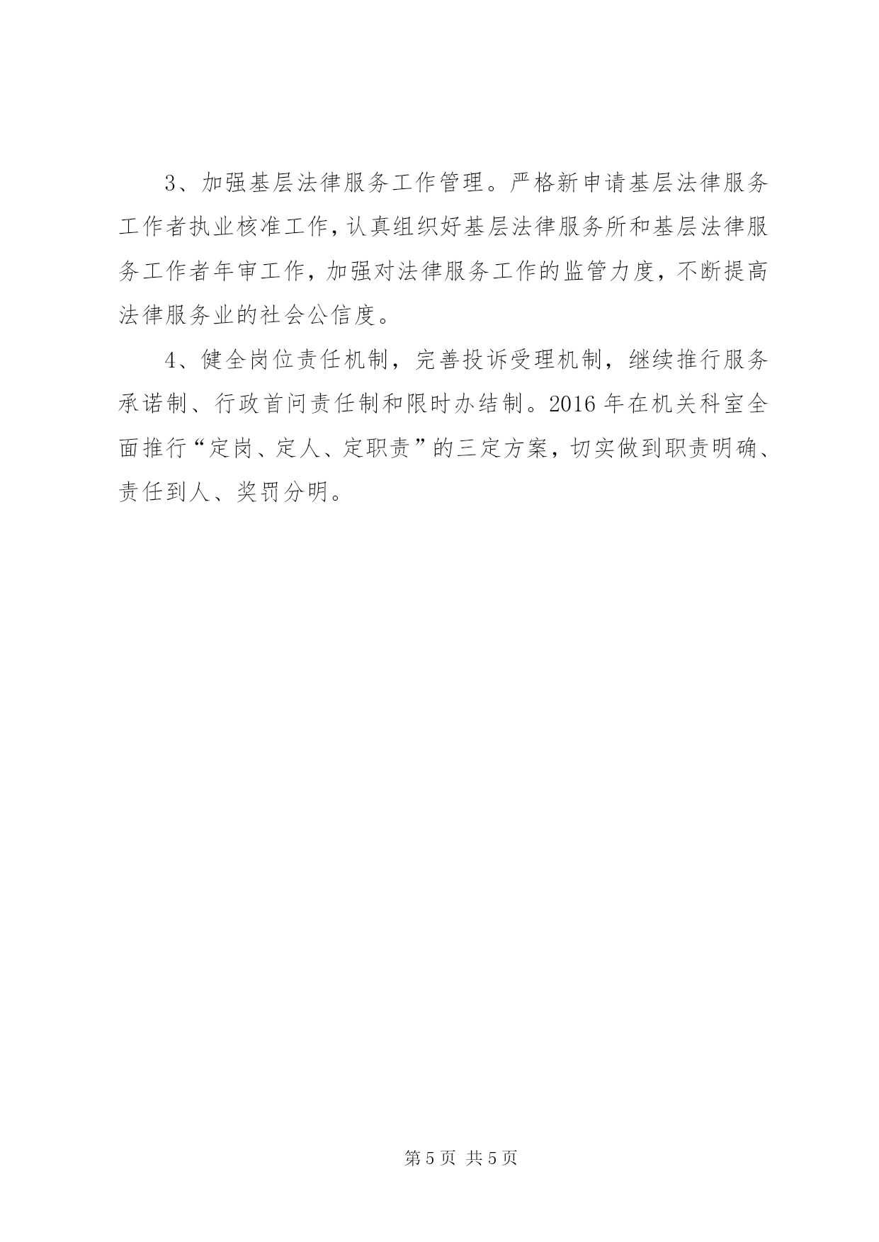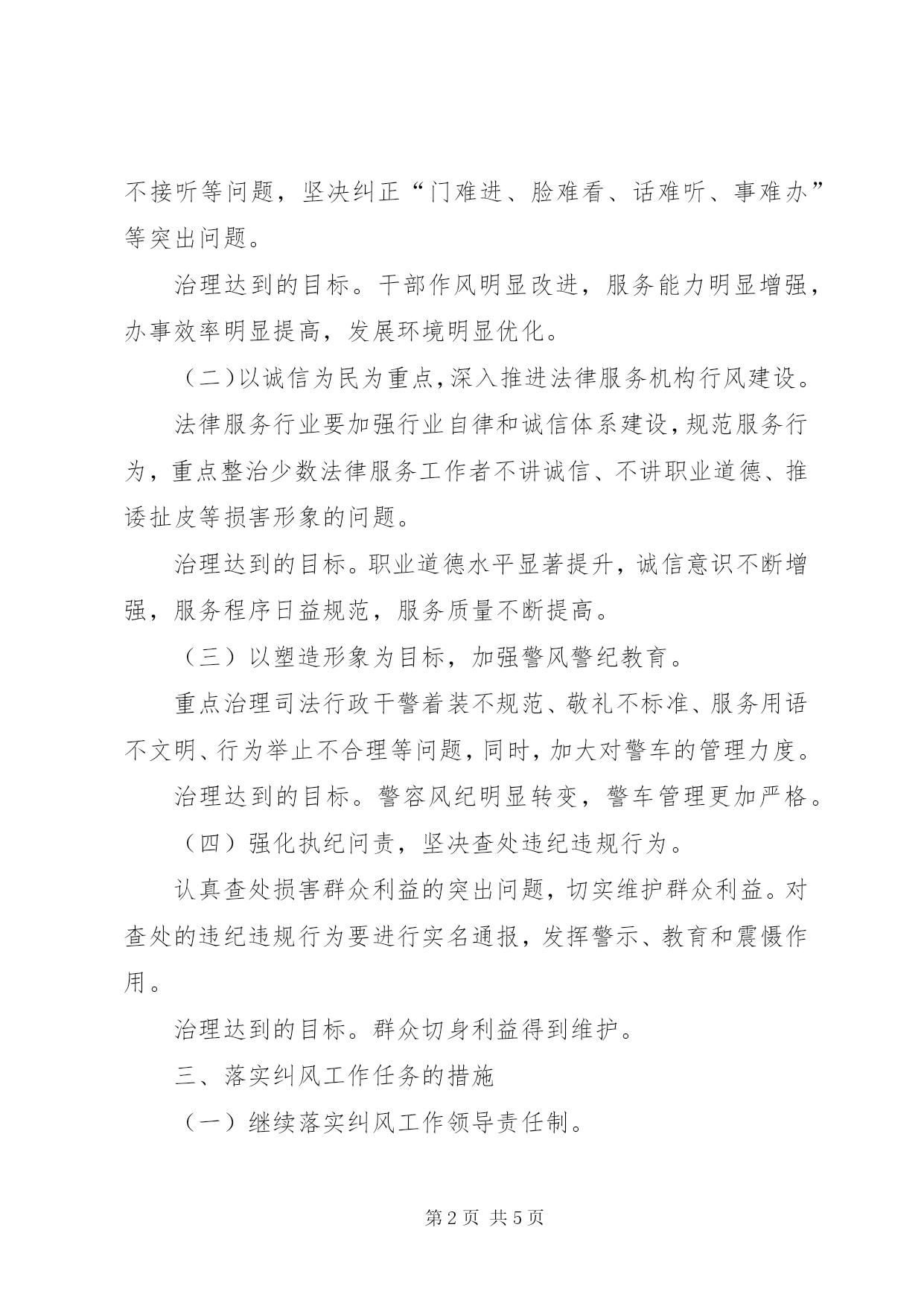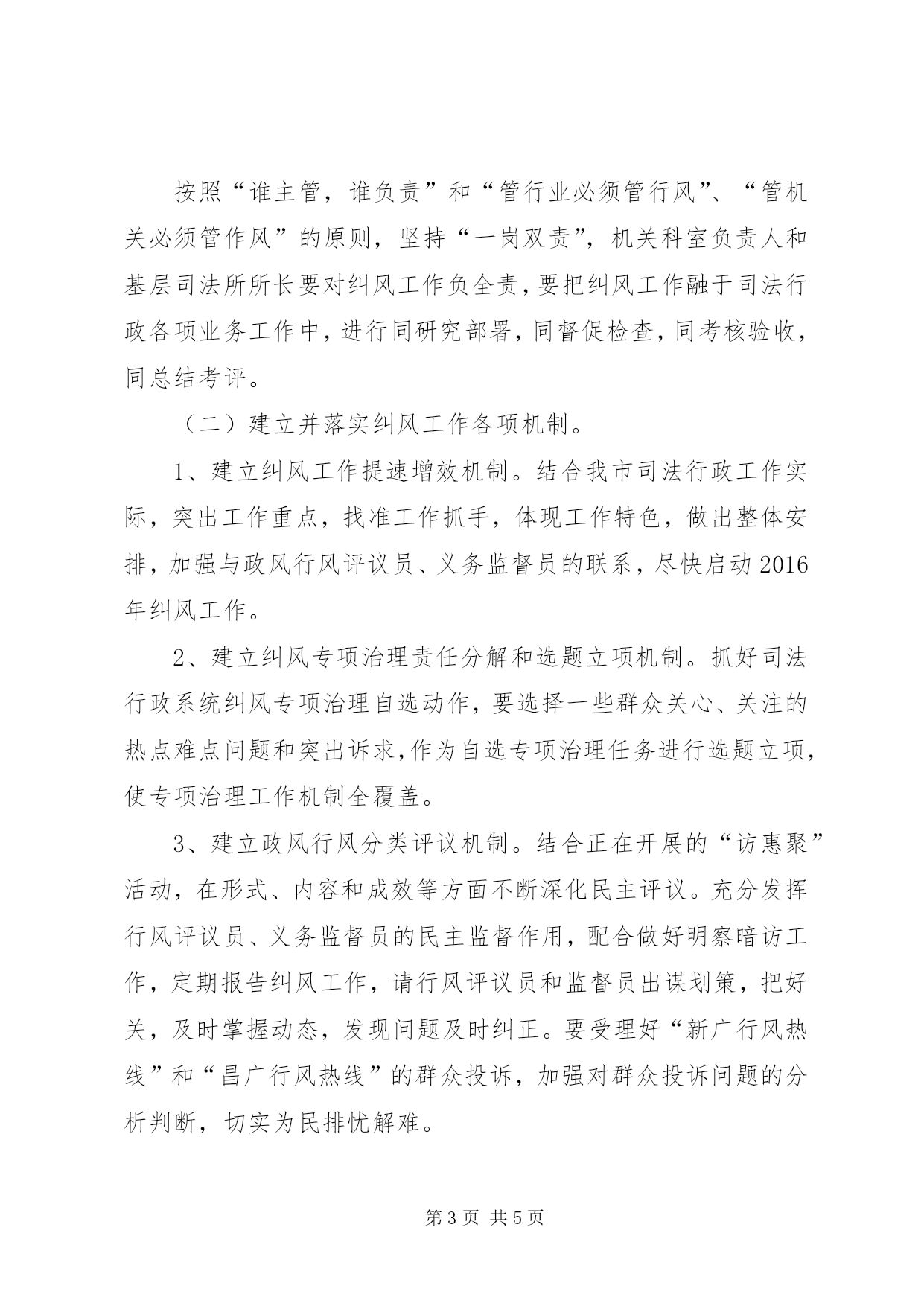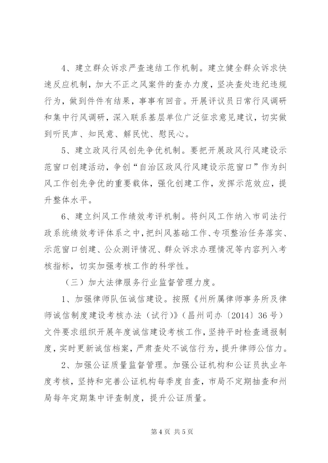 第PAGE\*Arabic\*MERGEFORMAT5页共NUMPAGES\*MERGEFORMAT5页市司法行政系统纠风工作意见为深入贯彻落实国务院、区、州、市人民政府关于纠风工作的部署和要求,根据市人民政府纠风办《关于印发的通知》(昌市政纠字〔2016〕2号)和州司法局《关于印发的通知》(昌州司办〔2016〕14号)文件精神,特制定2016年市司法行政系统纠风工作安排意见。一、总体要求深入贯彻落实党的十八大及十八届三中、四中、五中全会、国务院和区州市人民政府廉政工作会议精神,坚持围绕中心、服务大局,以人为本、关注民生,标本兼治、纠建并举,以维护人民群众切身利益为出发点,以人民满意为工作标准,扎实抓好纠风专项治理工作,切实加强政风行风建设,着力解决群众反映强烈的突出问题。全面开展损害群众利益“严查年”活动,严查快办损害群众利益典型案件,积极回应社会关切,努力提高司法行政系统纠风工作科学化水平,为实现市社会稳定和长治久安提供坚强保障。二、主要任务(一)以勤政高效为重点,深入推进司法行政机关作风建设。认真开展机关效能督查工作,重点查找机关是否存在“懒、散、庸、浮、拖、贪、奢”现象和基层司法所不按时上班、无故关门也不告知去向、不公布工作人员及联系方式或有联系方式而不接听等问题,坚决纠正“门难进、脸难看、话难听、事难办”等突出问题。治理达到的目标。干部作风明显改进,服务能力明显增强,办事效率明显提高,发展环境明显优化。(二)以诚信为民为重点,深入推进法律服务机构行风建设。法律服务行业要加强行业自律和诚信体系建设,规范服务行为,重点整治少数法律服务工作者不讲诚信、不讲职业道德、推诿扯皮等损害形象的问题。治理达到的目标。职业道德水平显著提升,诚信意识不断增强,服务程序日益规范,服务质量不断提高。(三)以塑造形象为目标,加强警风警纪教育。重点治理司法行政干警着装不规范、敬礼不标准、服务用语不文明、行为举止不合理等问题,同时,加大对警车的管理力度。治理达到的目标。警容风纪明显转变,警车管理更加严格。(四)强化执纪问责,坚决查处违纪违规行为。认真查处损害群众利益的突出问题,切实维护群众利益。对查处的违纪违规行为要进行实名通报,发挥警示、教育和震慑作用。治理达到的目标。群众切身利益得到维护。三、落实纠风工作任务的措施(一)继续落实纠风工作领导责任制。按照“谁主管,谁负责”和“管行业必须管行风”、“管机关必须管作风”的原则,坚持“一岗双责”,机关科室负责人和基层司法所所长要对纠风工作负全责,要把纠风工作融于司法行政各项业务工作中,进行同研究部署,同督促检查,同考核验收,同总结考评。(二)建立并落实纠风工作各项机制。1、建立纠风工作提速增效机制。结合我市司法行政工作实际,突出工作重点,找准工作抓手,体现工作特色,做出整体安排,加强与政风行风评议员、义务监督员的联系,尽快启动2016年纠风工作。2、建立纠风专项治理责任分解和选题立项机制。抓好司法行政系统纠风专项治理自选动作,要选择一些群众关心、关注的热点难点问题和突出诉求,作为自选专项治理任务进行选题立项,使专项治理工作机制全覆盖。3、建立政风行风分类评议机制。结合正在开展的“访惠聚”活动,在形式、内容和成效等方面不断深化民主评议。充分发挥行风评议员、义务监督员的民主监督作用,配合做好明察暗访工作,定期报告纠风工作,请行风评议员和监督员出谋划策,把好关,及时掌握动态,发现问题及时纠正。要受理好“新广行风热线”和“昌广行风热线”的群众投诉,加强对群众投诉问题的分析判断,切实为民排忧解难。4、建立群众诉求严查速结工作机制。建立健全群众诉求快速反应机制,加大不正之风案件的查办力度,坚决查处违纪违规行为,做到件件有结果,事事有回音。开展评议员日常行风调研和集中行风调研,深入联系基层单位广泛征求意见建议,切实做到听民声、知民意、解民忧、慰民心。5、建立政风行风创先争优机制。要把开展政风行风建设示范窗口创建活动,争创“自治区政风行风建设示范窗口”作为纠风工作创先争优的重要载体,强化创建工作,发挥示范效应,提升整体水平。6、建立纠风工作绩效考评机制。将纠风工作纳入市司法行政系统绩效考评体系之中,把纠风基础工作、专项整治任务落实、示范窗口创建、公众测评情况、群众诉求办理情况等内容列入考核指标,切实加强考核工作的科学性。(三)加大法律服务行业监督管理力度。1、加强律师队伍诚信建设。按照《州所属律师事务所及律师诚信制度建设考核办法(试行)》(昌州司办〔2014〕36号)文件要求组织开展年度诚信建设考核工作,坚持平时检查通报制度,实时更新诚信档案,严肃查处不诚信行为,提升律师公信力。2、加强公证质量监督管理。加强公证机构和公证员执业年度考核,坚持和完善公证机构每季度自查,市局不定期抽查和州局每年