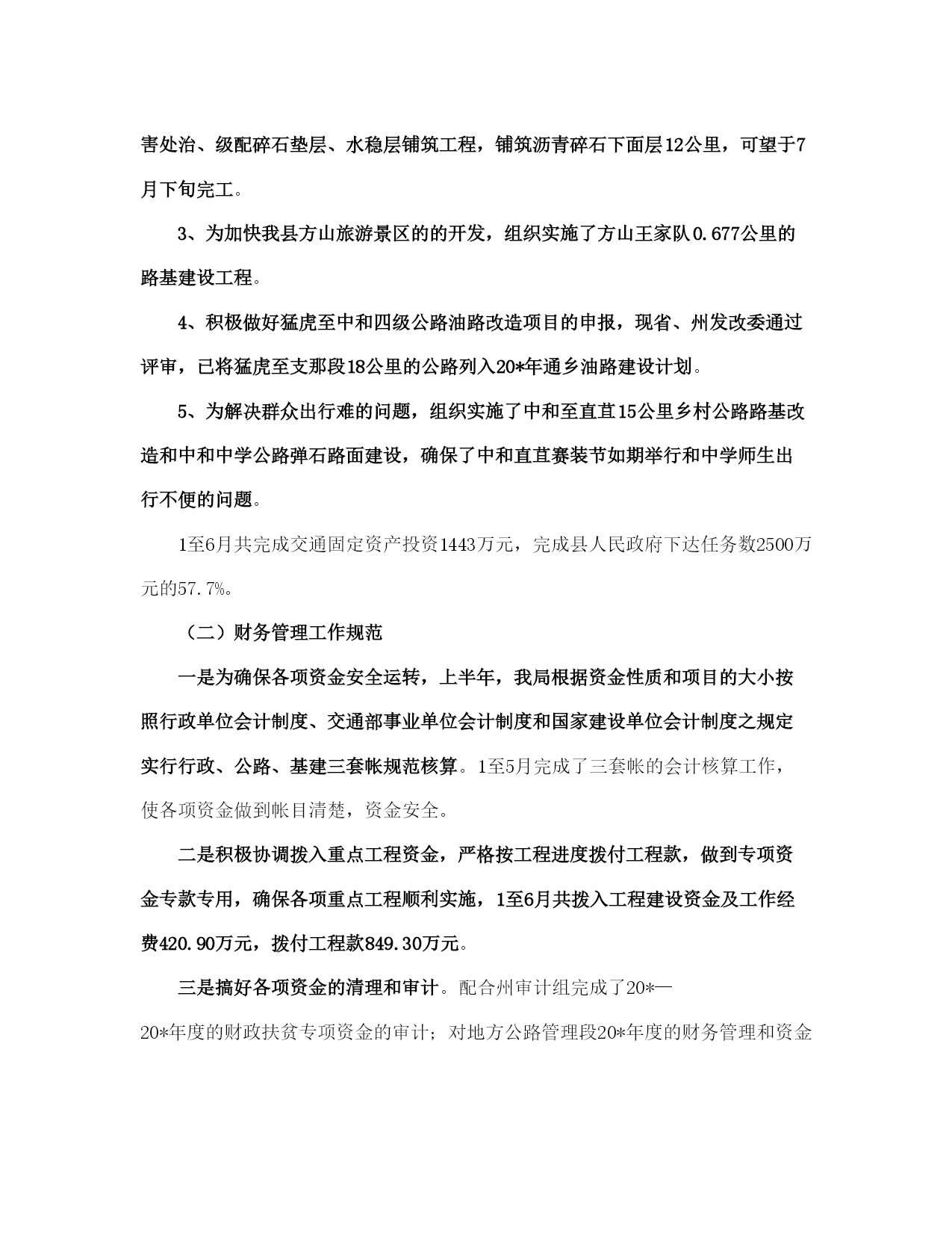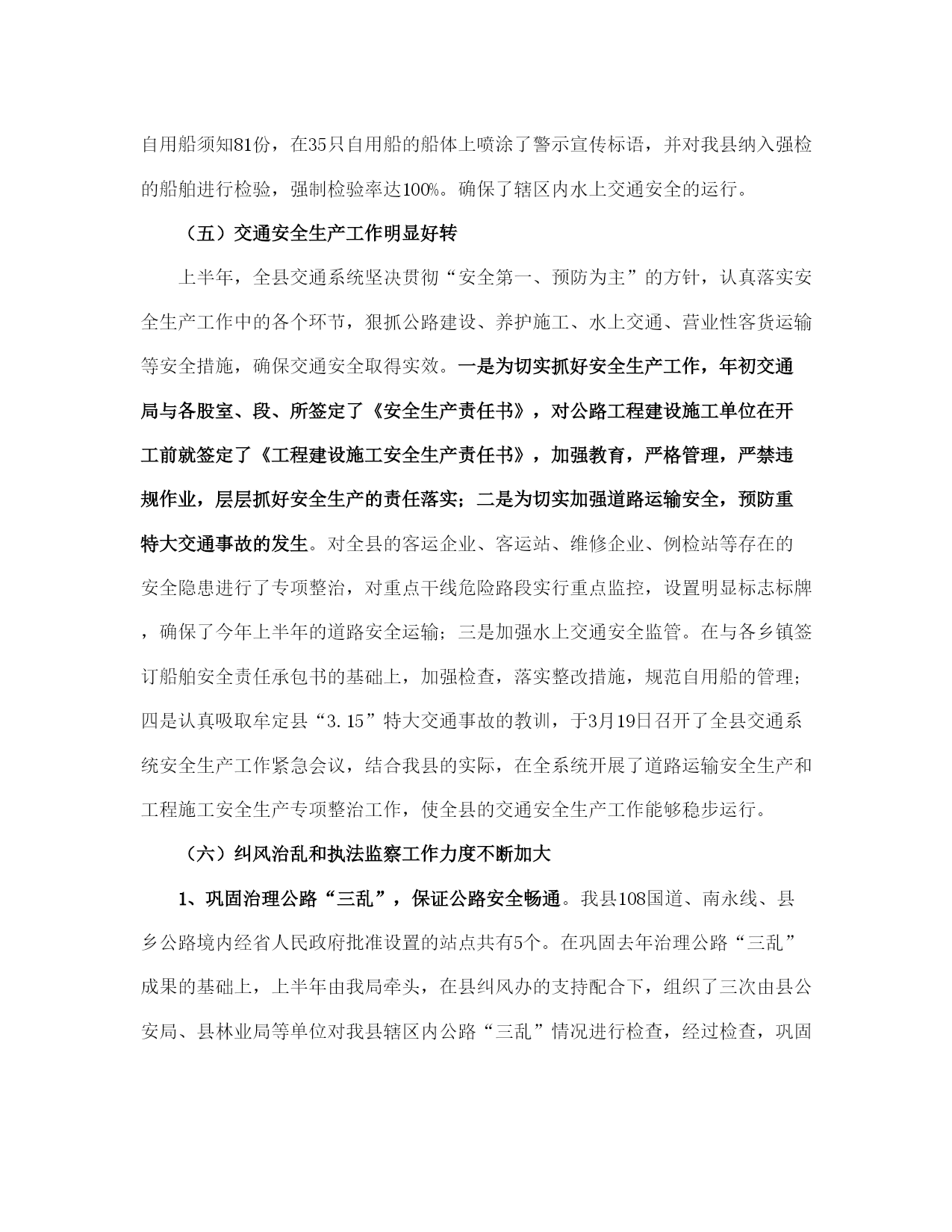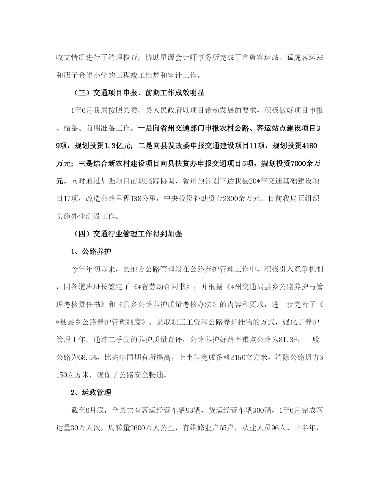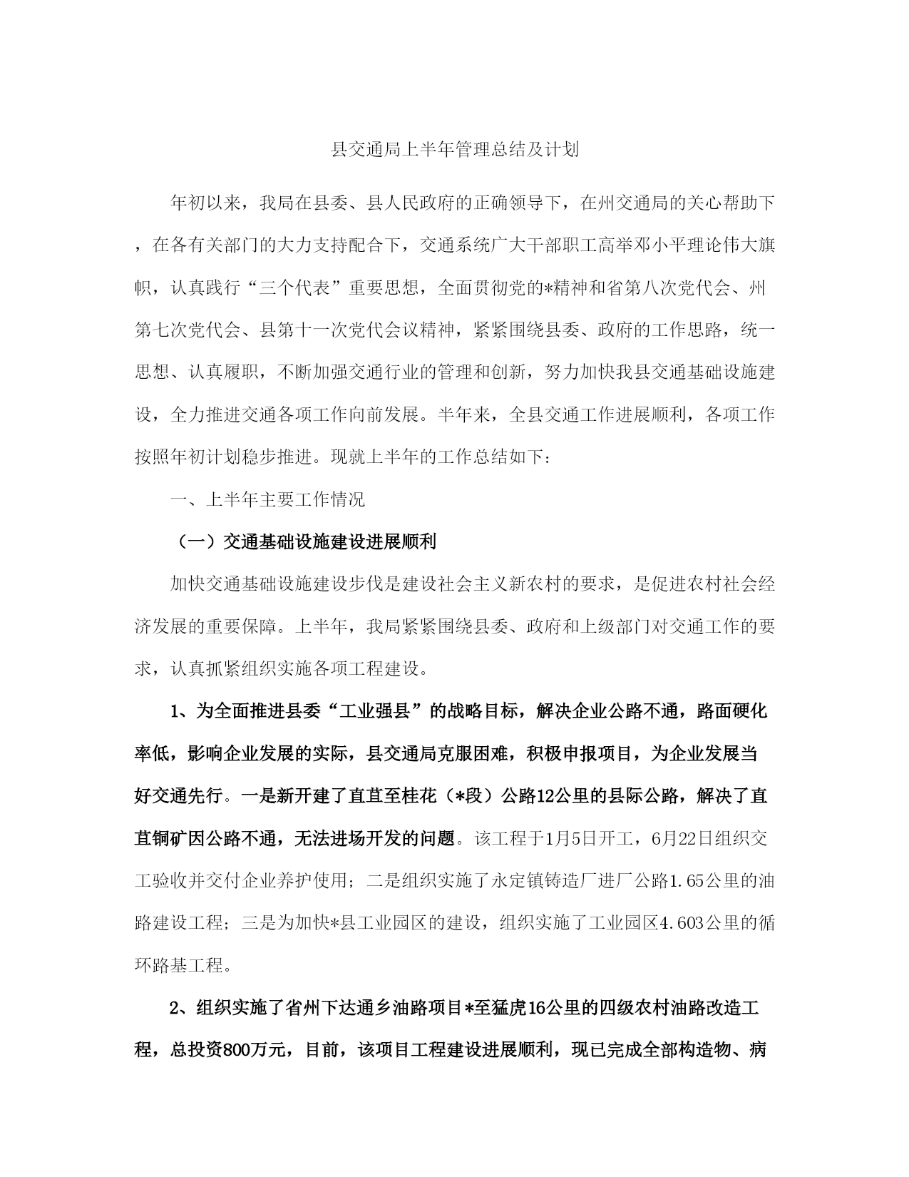 县交通局上半管理总结及计划(完整版)文档资料可直接使用,可编辑,欢迎下载县交通局上半年管理总结及计划年初以来,我局在县委、县人民政府的正确领导下,在州交通局的关心帮助下,在各有关部门的大力支持配合下,交通系统广大干部职工高举邓小平理论伟大旗帜,认真践行“三个代表”重要思想,全面贯彻党的*精神和省第八次党代会、州第七次党代会、县第十一次党代会议精神,紧紧围绕县委、政府的工作思路,统一思想、认真履职,不断加强交通行业的管理和创新,努力加快我县交通基础设施建设,全力推进交通各项工作向前发展。半年来,全县交通工作进展顺利,各项工作按照年初计划稳步推进。现就上半年的工作总结如下:一、上半年主要工作情况(一)交通基础设施建设进展顺利加快交通基础设施建设步伐是建设社会主义新农村的要求,是促进农村社会经济发展的重要保障。上半年,我局紧紧围绕县委、政府和上级部门对交通工作的要求,认真抓紧组织实施各项工程建设。1、为全面推进县委“工业强县”的战略目标,解决企业公路不通,路面硬化率低,影响企业发展的实际,县交通局克服困难,积极申报项目,为企业发展当好交通先行。一是新开建了直苴至桂花(*段)公路12公里的县际公路,解决了直苴铜矿因公路不通,无法进场开发的问题。该工程于1月5日开工,6月22日组织交工验收并交付企业养护使用;二是组织实施了永定镇铸造厂进厂公路1.65公里的油路建设工程;三是为加快*县工业园区的建设,组织实施了工业园区4.603公里的循环路基工程。2、组织实施了省州下达通乡油路项目*至猛虎16公里的四级农村油路改造工程,总投资800万元,目前,该项目工程建设进展顺利,现已完成全部构造物、病害处治、级配碎石垫层、水稳层铺筑工程,铺筑沥青碎石下面层12公里,可望于7月下旬完工。3、为加快我县方山旅游景区的的开发,组织实施了方山王家队0.677公里的路基建设工程。4、积极做好猛虎至中和四级公路油路改造项目的申报,现省、州发改委通过评审,已将猛虎至支那段18公里的公路列入20*年通乡油路建设计划。5、为解决群众出行难的问题,组织实施了中和至直苴15公里乡村公路路基改造和中和中学公路弹石路面建设,确保了中和直苴赛装节如期举行和中学师生出行不便的问题。1至6月共完成交通固定资产投资1443万元,完成县人民政府下达任务数2500万元的57.7%。(二)财务管理工作规范一是为确保各项资金安全运转,上半年,我局根据资金性质和项目的大小按照行政单位会计制度、交通部事业单位会计制度和国家建设单位会计制度之规定实行行政、公路、基建三套帐规范核算。1至5月完成了三套帐的会计核算工作,使各项资金做到帐目清楚,资金安全。二是积极协调拨入重点工程资金,严格按工程进度拨付工程款,做到专项资金专款专用,确保各项重点工程顺利实施,1至6月共拨入工程建设资金及工作经费420.90万元,拨付工程款849.30万元。三是搞好各项资金的清理和审计。配合州审计组完成了20*—20*年度的财政扶贫专项资金的审计;对地方公路管理段20*年度的财务管理和资金收支情况进行了清理检查;协助星源会计师事务所完成了宜就客运站、猛虎客运站和店子希望小学的工程竣工结算和审计工作。(三)交通项目申报、前期工作成效明显。1至6月我局按照县委、县人民政府以项目带动发展的要求,积极做好项目申报、储备、前期准备工作。一是向省州交通部门申报农村公路、客运站点建设项目39项,规划投资1.3亿元;二是向县发改委申报交通建设项目11项,规划投资4180万元;三是结合新农村建设项目向县扶贫办申报交通项目5项,规划投资7000余万元。同时通过加强项目前期跟踪协调,省州预计划下达我县20*年交通基础建设项目17项,改造公路里程138公里,中央投资补助资金2300余万元。目前我局正组织实施外业测设工作。(四)交通行业管理工作得到加强1、公路养护今年年初以来,县地方公路管理段在公路养护管理工作中,积极引入竞争机制,同各道班班长签定了《*省劳动合同书》,并根据《*州交通局县乡公路养护与管理考核责任书》和《县乡公路养护质量考核办法》的内容和要求,进一步完善了《*县县乡公路养护管理制度》。采取职工工资和公路养护挂钩的方式,强化了养护管理工作。通过二季度的养护质量查评,公路养护好路率重点公路为81.3%,一般公路为68.5%,比去年同期有所提高。上半年完成备料2150立方米,清除公路坍方3150立方米,确保了公路安全畅通。2、运政管理截至6月底,全县共有客运经营车辆93辆,货运经营车辆300辆,1至6月完成客运量30万人次,周转量2600万人公里,有维修业户65户,从业人员96人。上半年,共征收运管费22万元,作出行政许可45份。为进一步加强驾驶员培训和运输辅助业管理,严厉打击无证经营的违法行