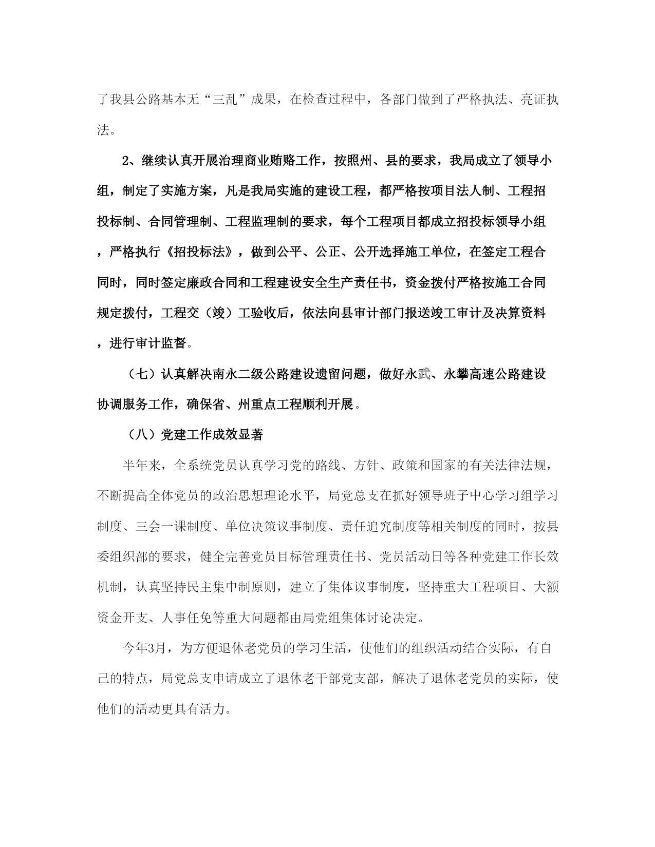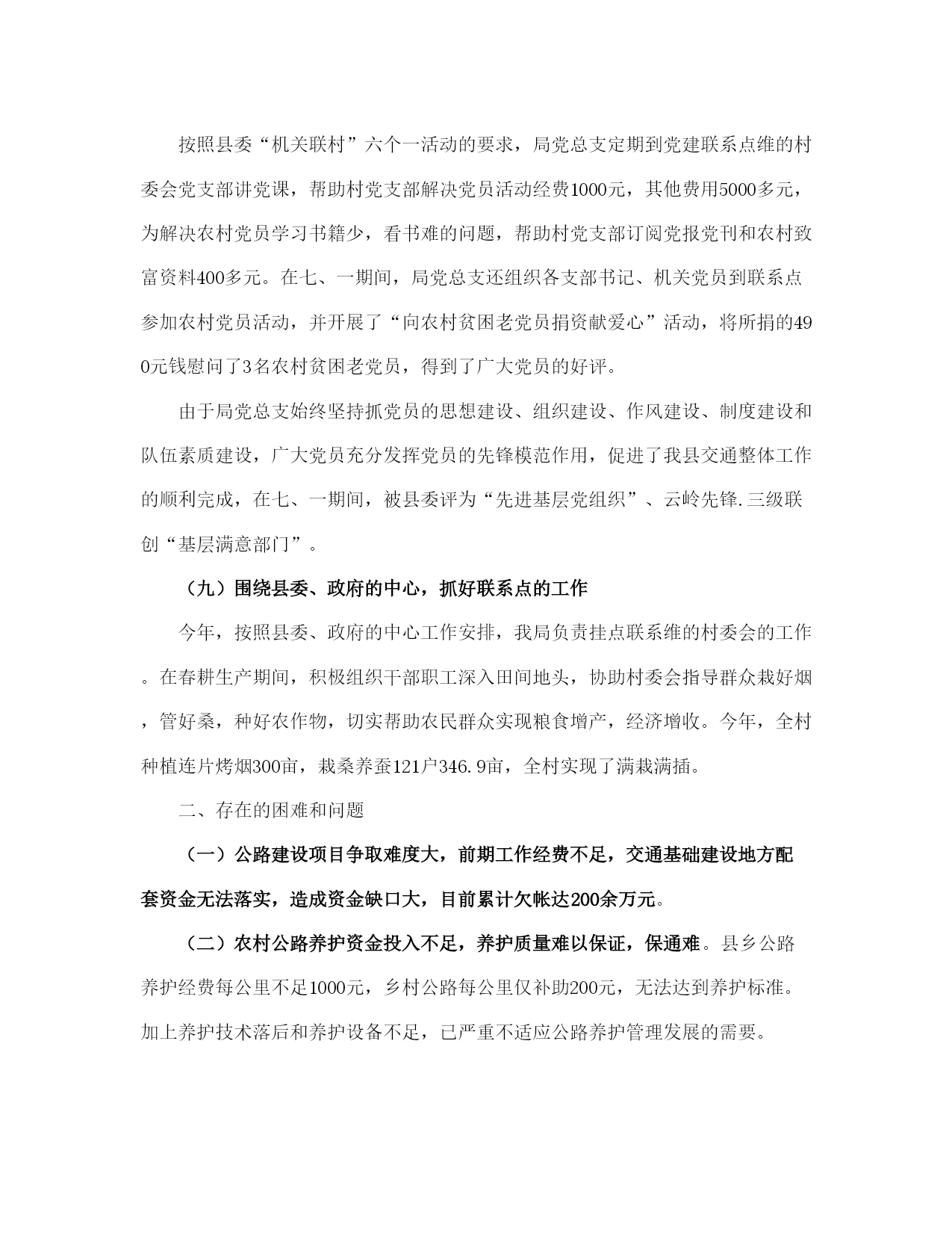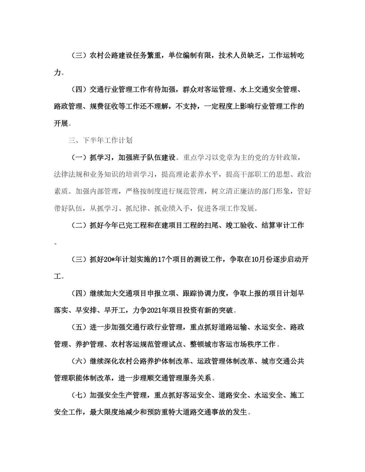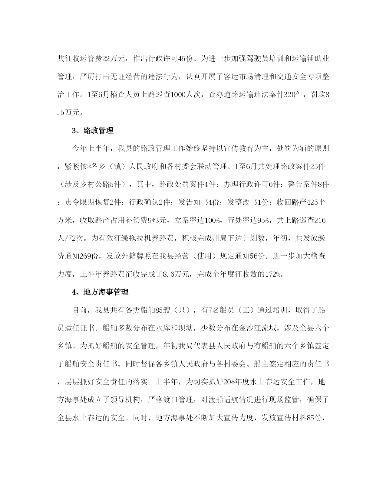 县交通局上半管理总结及计划(完整版)文档资料可直接使用,可编辑,欢迎下载县交通局上半年管理总结及计划年初以来,我局在县委、县人民政府的正确领导下,在州交通局的关心帮助下,在各有关部门的大力支持配合下,交通系统广大干部职工高举邓小平理论伟大旗帜,认真践行“三个代表”重要思想,全面贯彻党的*精神和省第八次党代会、州第七次党代会、县第十一次党代会议精神,紧紧围绕县委、政府的工作思路,统一思想、认真履职,不断加强交通行业的管理和创新,努力加快我县交通基础设施建设,全力推进交通各项工作向前发展。半年来,全县交通工作进展顺利,各项工作按照年初计划稳步推进。现就上半年的工作总结如下:一、上半年主要工作情况(一)交通基础设施建设进展顺利加快交通基础设施建设步伐是建设社会主义新农村的要求,是促进农村社会经济发展的重要保障。上半年,我局紧紧围绕县委、政府和上级部门对交通工作的要求,认真抓紧组织实施各项工程建设。1、为全面推进县委“工业强县”的战略目标,解决企业公路不通,路面硬化率低,影响企业发展的实际,县交通局克服困难,积极申报项目,为企业发展当好交通先行。一是新开建了直苴至桂花(*段)公路12公里的县际公路,解决了直苴铜矿因公路不通,无法进场开发的问题。该工程于1月5日开工,6月22日组织交工验收并交付企业养护使用;二是组织实施了永定镇铸造厂进厂公路1.65公里的油路建设工程;三是为加快*县工业园区的建设,组织实施了工业园区4.603公里的循环路基工程。2、组织实施了省州下达通乡油路项目*至猛虎16公里的四级农村油路改造工程,总投资800万元,目前,该项目工程建设进展顺利,现已完成全部构造物、病害处治、级配碎石垫层、水稳层铺筑工程,铺筑沥青碎石下面层12公里,可望于7月下旬完工。3、为加快我县方山旅游景区的的开发,组织实施了方山王家队0.677公里的路基建设工程。4、积极做好猛虎至中和四级公路油路改造项目的申报,现省、州发改委通过评审,已将猛虎至支那段18公里的公路列入20*年通乡油路建设计划。5、为解决群众出行难的问题,组织实施了中和至直苴15公里乡村公路路基改造和中和中学公路弹石路面建设,确保了中和直苴赛装节如期举行和中学师生出行不便的问题。1至6月共完成交通固定资产投资1443万元,完成县人民政府下达任务数2500万元的57.7%。(二)财务管理工作规范一是为确保各项资金安全运转,上半年,我局根据资金性质和项目的大小按照行政单位会计制度、交通部事业单位会计制度和国家建设单位会计制度之规定实行行政、公路、基建三套帐规范核算。1至5月完成了三套帐的会计核算工作,使各项资金做到帐目清楚,资金安全。二是积极协调拨入重点工程资金,严格按工程进度拨付工程款,做到专项资金专款专用,确保各项重点工程顺利实施,1至6月共拨入工程建设资金及工作经费420.90万元,拨付工程款849.30万元。三是搞好各项资金的清理和审计。配合州审计组完成了20*—20*年度的财政扶贫专项资金的审计;对地方公路管理段20*年度的财务管理和资金收支情况进行了清理检查;协助星源会计师事务所完成了宜就客运站、猛虎客运站和店子希望小学的工程竣工结算和审计工作。(三)交通项目申报、前期工作成效明显。1至6月我局按照县委、县人民政府以项目带动发展的要求,积极做好项目申报、储备、前期准备工作。一是向省州交通部门申报农村公路、客运站点建设项目39项,规划投资1.3亿元;二是向县发改委申报交通建设项目11项,规划投资4180万元;三是结合新农村建设项目向县扶贫办申报交通项目5项,规划投资7000余万元。同时通过加强项目前期跟踪协调,省州预计划下达我县20*年交通基础建设项目17项,改造公路里程138公里,中央投资补助资金2300余万元。目前我局正组织实施外业测设工作。(四)交通行业管理工作得到加强1、公路养护今年年初以来,县地方公路管理段在公路养护管理工作中,积极引入竞争机制,同各道班班长签定了《*省劳动合同书》,并根据《*州交通局县乡公路养护与管理考核责任书》和《县乡公路养护质量考核办法》的内容和要求,进一步完善了《*县县乡公路养护管理制度》。采取职工工资和公路养护挂钩的方式,强化了养护管理工作。通过二季度的养护质量查评,公路养护好路率重点公路为81.3%,一般公路为68.5%,比去年同期有所提高。上半年完成备料2150立方米,清除公路坍方3150立方米,确保了公路安全畅通。2、运政管理截至6月底,全县共有客运经营车辆93辆,货运经营车辆300辆,1至6月完成客运量30万人次,周转量2600万人公里,有维修业户65户,从业人员96人。上半年,共征收运管费22万元,作出行政许可45份。为进一步加强驾驶员培训和运输辅助业管理,严厉打击无证经营的违法行