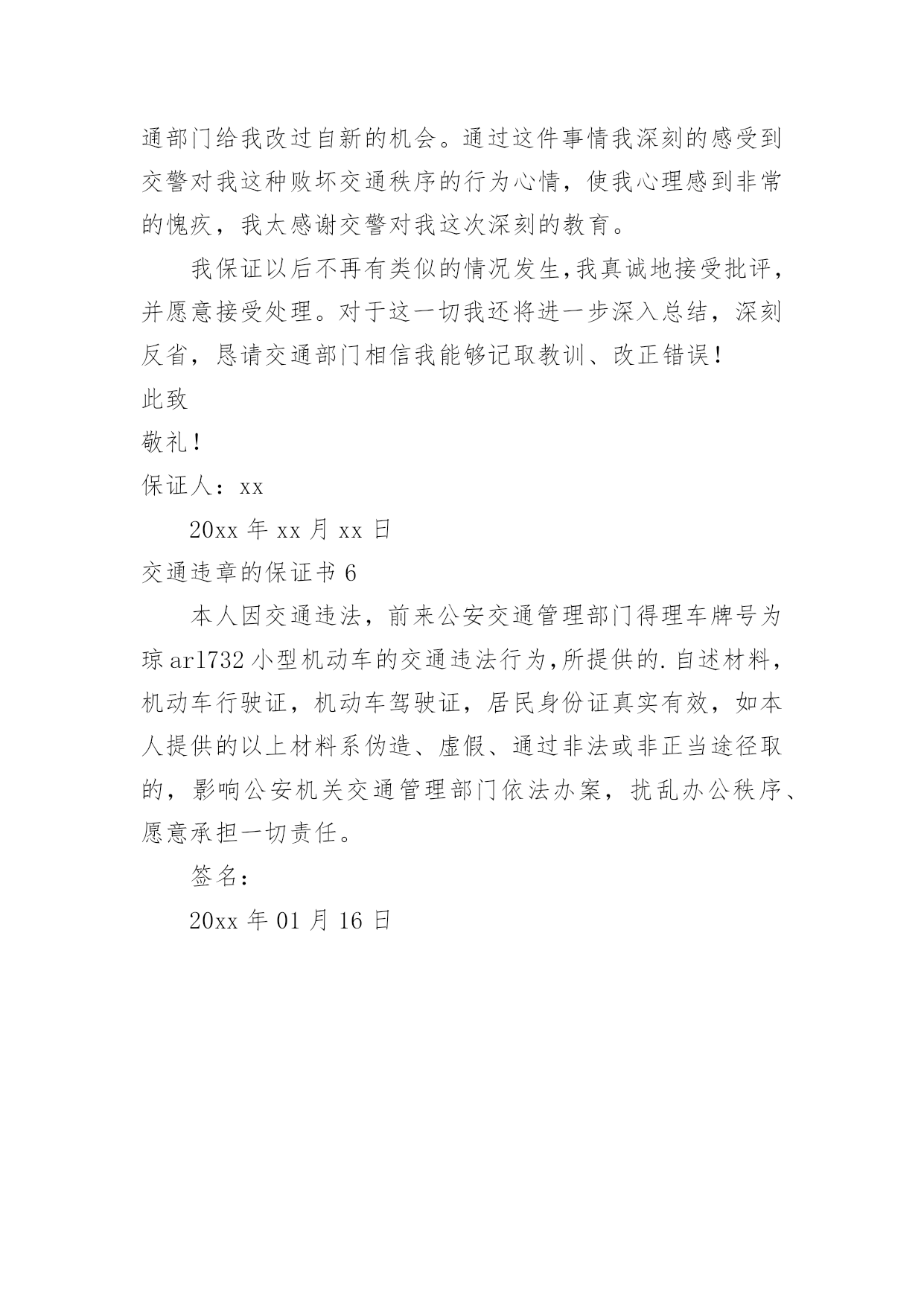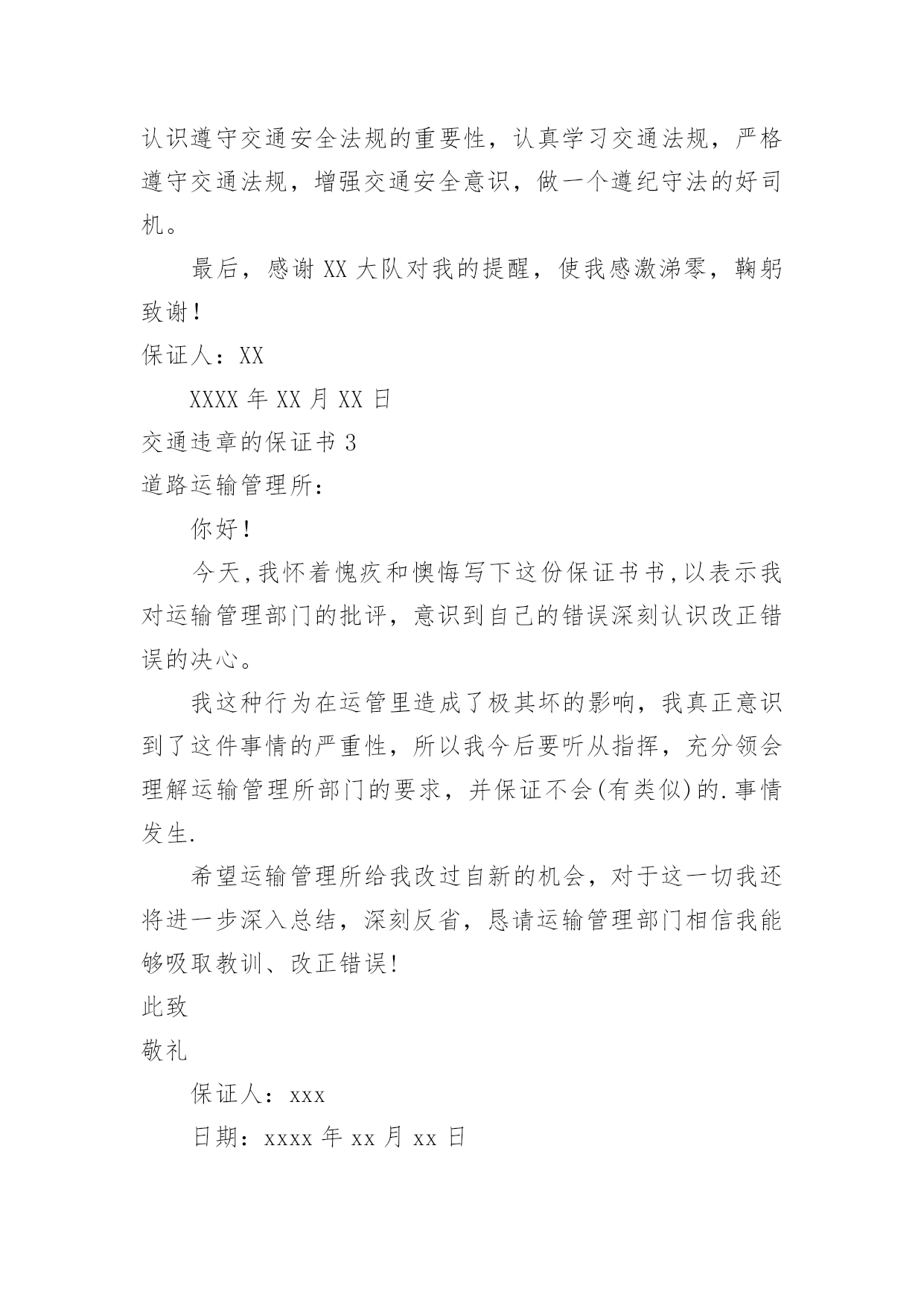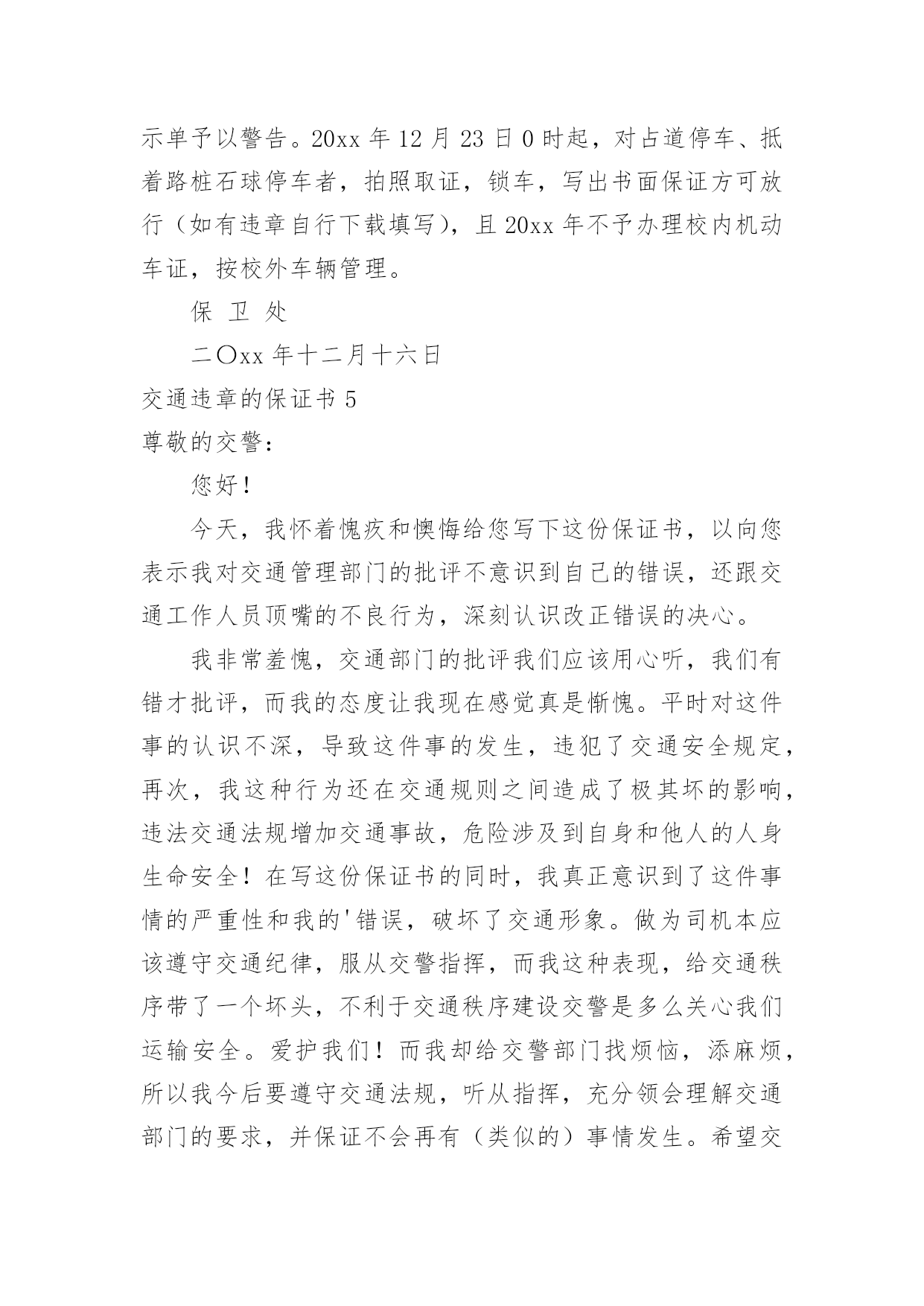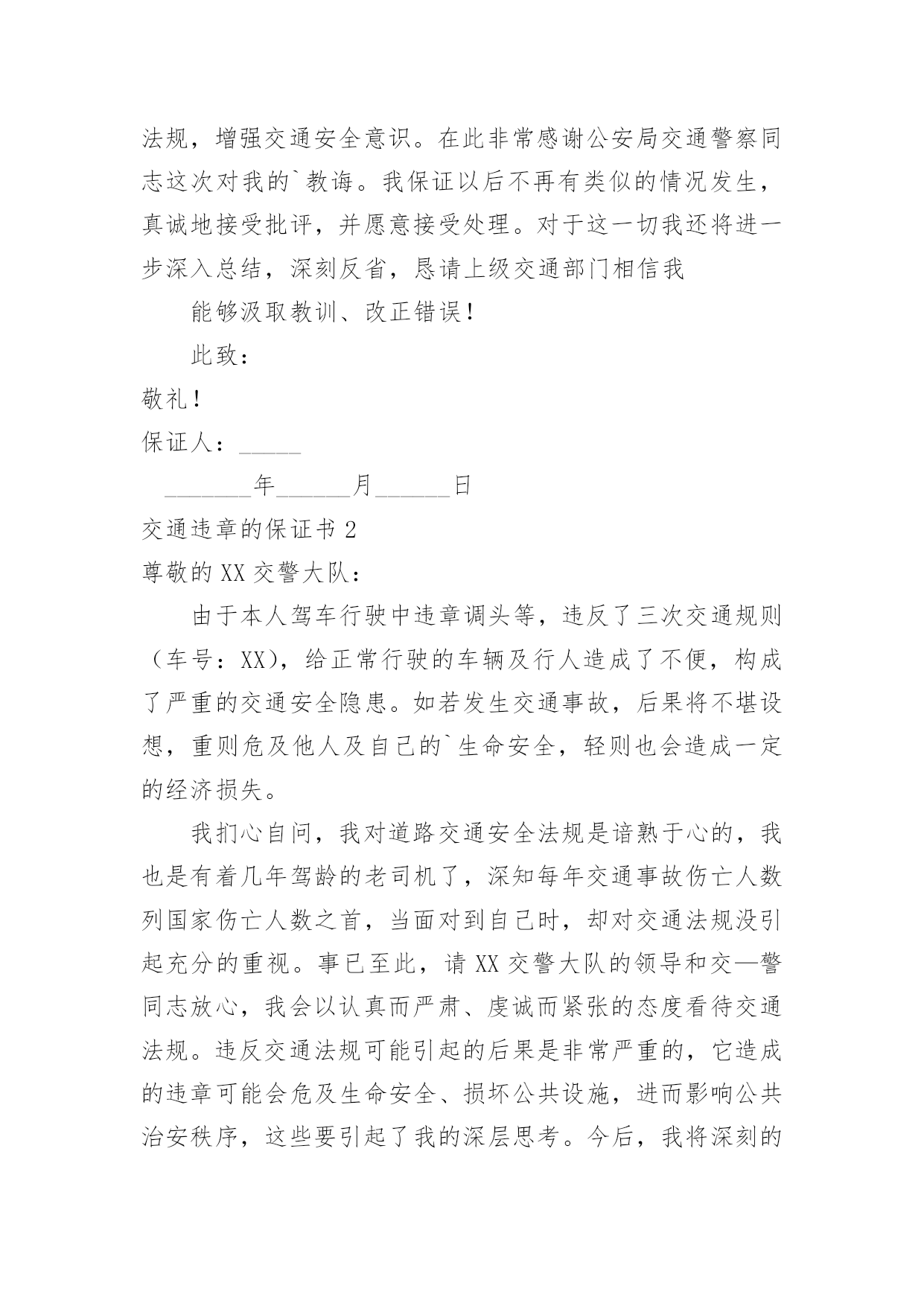 交通违章的保证书交通违章的保证书在当下社会,保证书使用的次数愈发增长,要注意保证书在写作时具有一定的格式。其实写保证书并没有想象中那么难,以下是小编精心整理的交通违章的保证书,欢迎阅读,希望大家能够喜欢。交通违章的保证书1尊敬的上级交__警部门:我叫_____,________人,于________年______月______日在__路段强行超车,此外本人驾驶证为准驾车型b2,而所驾驶车辆为牵引车,严重地违反了道路交通安全法及其实施条例,给正常的车辆交通行驶造成严重的安全隐患。如今被公安局交通警察大队及时制止,及时处理(行政拘留___天,罚款________元)。如果发生交通意外,将会造成严重的人员伤亡和财产损失。严重违反了《道路交通安全法》第29条等相关条款。事已至此,我还是要给上级交__警部门做出深刻检讨,一定正视自己的错误,为自己的行为负责。除缴纳罚款之外,自觉接受身边家人和朋友对我的监督,以后决不再犯这样的错误。立誓做一个遵守交通规则的正义青年,积极参与交通安全知识教育,深刻认识交通安全的重要性,严格遵守交通法规,增强交通安全意识。在此非常感谢公安局交通警察同志这次对我的`教诲。我保证以后不再有类似的情况发生,真诚地接受批评,并愿意接受处理。对于这一切我还将进一步深入总结,深刻反省,恳请上级交通部门相信我能够汲取教训、改正错误!此致:敬礼!保证人:____________年______月______日交通违章的保证书2尊敬的XX交警大队:由于本人驾车行驶中违章调头等,违反了三次交通规则(车号:XX),给正常行驶的车辆及行人造成了不便,构成了严重的交通安全隐患。如若发生交通事故,后果将不堪设想,重则危及他人及自己的`生命安全,轻则也会造成一定的经济损失。我扪心自问,我对道路交通安全法规是谙熟于心的,我也是有着几年驾龄的老司机了,深知每年交通事故伤亡人数列国家伤亡人数之首,当面对到自己时,却对交通法规没引起充分的重视。事已至此,请XX交警大队的领导和交—警同志放心,我会以认真而严肃、虔诚而紧张的态度看待交通法规。违反交通法规可能引起的后果是非常严重的,它造成的违章可能会危及生命安全、损坏公共设施,进而影响公共治安秩序,这些要引起了我的深层思考。今后,我将深刻的认识遵守交通安全法规的重要性,认真学习交通法规,严格遵守交通法规,增强交通安全意识,做一个遵纪守法的好司机。最后,感谢XX大队对我的提醒,使我感激涕零,鞠躬致谢!保证人:XXXXXX年XX月XX日交通违章的保证书3道路运输管理所:你好!今天,我怀着愧疚和懊悔写下这份保证书书,以表示我对运输管理部门的批评,意识到自己的错误深刻认识改正错误的决心。我这种行为在运管里造成了极其坏的影响,我真正意识到了这件事情的严重性,所以我今后要听从指挥,充分领会理解运输管理所部门的要求,并保证不会(有类似)的.事情发生.希望运输管理所给我改过自新的机会,对于这一切我还将进一步深入总结,深刻反省,恳请运输管理部门相信我能够吸取教训、改正错误!此致敬礼保证人:xxx日期:xxxx年xx月xx日交通违章的保证书4各进入华北电力大学的机动车驾驶员:12月11日,深圳光明荣健农批市场发生火灾,由于消防通道被其他车辆占用,消防车无法近距离救援。一场惨烈火灾,已夺走了16条生命,令人痛心疾首,更催人警醒。众所周知,一旦有火情,就意味着将与时间赛跑,因为这关系到人民群众的生命财产安全,对于消防车来说,争分夺秒地赶到火灾地点是神圣的职责,消防通道被其他车辆占用,便是在给救援"添堵"。然而,乱停车,停车不入位一直是我校不和谐音符,占道停车、路口停车的现象在学校屡见不鲜。诸如,一食堂门口占道停车;b座和f座楼周边占道停车。在不能停车的区域停车,特别是抵着路桩、石球停车的行为更加恶劣,因为设置路桩、石球一个主要目的就是为了预留消防通道,应急时可以迅速打开。高校是教书育人的场所,所有教职员工都负有"育人"的责任,你不经意的随意乱停乱放,有可能造成意想不到的后果。一屋不扫何以扫天下,一车不正何以正学生,我们希望所有进入华北电力大学的机动车司机都能受到大学文化、理念和精神的.熏陶,成为一个高尚的人,一个纯粹的人,一个有道德的人。我们受学校委托管理校内交通,就必须严格履职,规范管理,特决定在加强道德教育的同时,加强管理措施,现公布如下:即日起,对所有乱停乱放车辆予以拍照取证,并张贴告示单予以警告。20xx年12月23日0时起,对占道停车、抵着路桩石球停车者,拍照取证,锁车,写出书面保证方可放行(如有违章自行下载填写),且20xx年不予办理校内机动车证,按校外车辆管理。保卫处二〇xx年十二月十六日交通违章的保证书5尊敬的交警:您好!今天,我怀着愧疚和懊悔给您写下这份保证书,以向您表示我对交通管理部门的批评不意识到自己