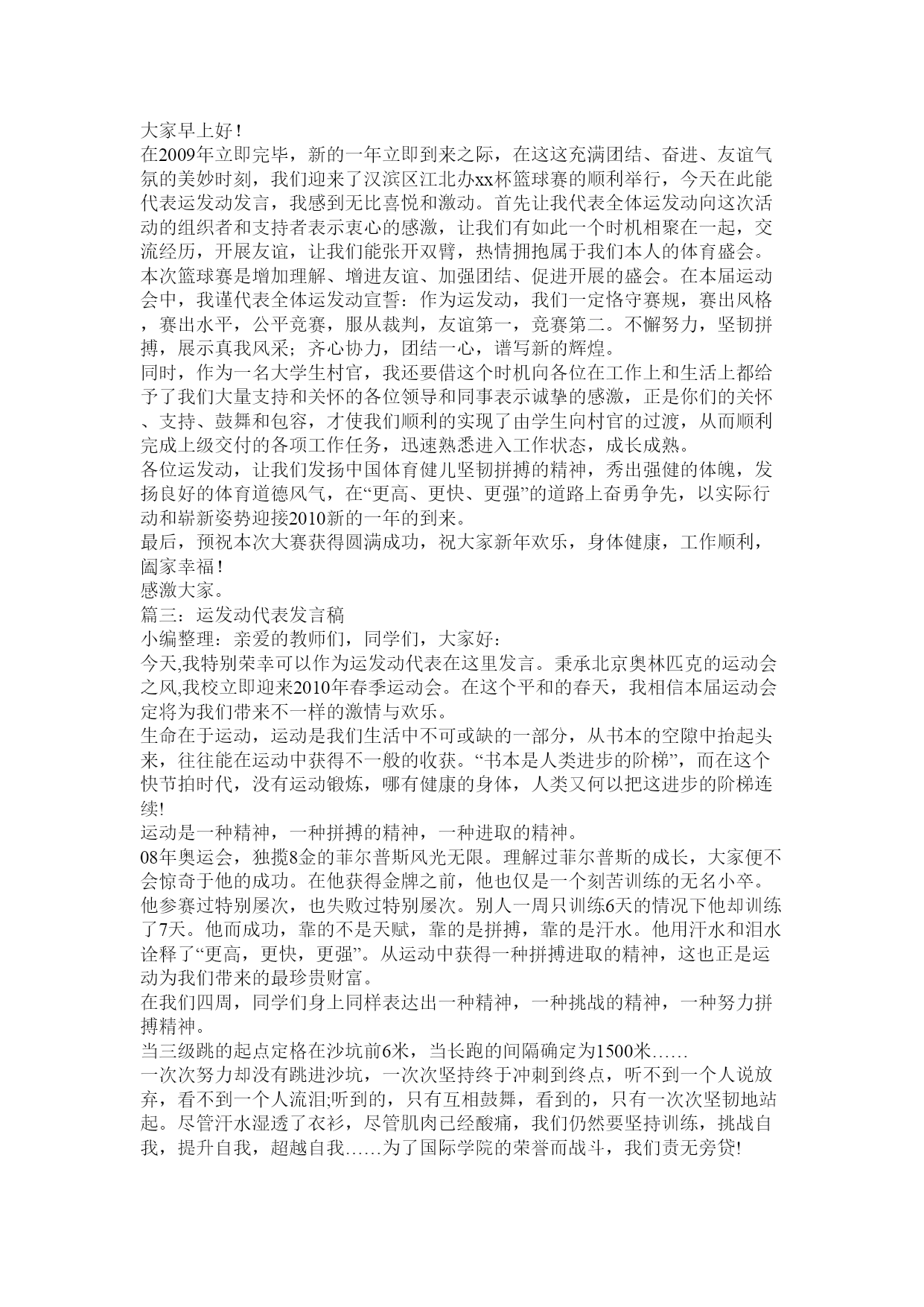运发动代表致辞篇一:运发动代表发言稿尊敬的教师、亲爱的同学:上午好!特别荣幸与大家相约在2013年的冬季,一起参加大溪小学秋季运动会。我们特别幸福!由于这里,明丽的阳光是给我们的,湛蓝的天空是给我们的,冬日的空气是给我们的,收获的喜悦是给我们的,还有这片等待我们去激活的大溪运动场也是给我们的。这里,是我们抛开学习压力,放飞心灵,展示自我的舞台。运动健儿驰骋,他们意气风发,这是种美;拉拉队员热情地高喊,他们无微不至、善解人意,这也是种美。我们不断都有着友谊第一、竞赛第二的心态,站在起跑线上,站在辉煌的领奖台上。体育竞赛是一种用力来挥写,用美来传达,用速来超越,用度来衡量的运动方式,它传承的是人的个性化,表达的是人的成熟化,展现的是人的人格化。运动需要亲身地体验,身临其境地感受,用心肠体悟,英勇地尝试,也需要公平地竞争。我们要雄心勃勃地站在场上,也要以锱铢必较的精神去对待它。运动更需要一种博大的心来真诚对待,象奥林匹克格言一样,追求更快、更高、更强。个人|企业应届毕业生网职场资讯秋季运动会开幕式学生代表发言稿发布时间:2015-10-09发言稿一:亲爱的教师、亲爱的同学们:大家好!在今天这个秋高气爽、云淡日丽的日子里又迎来了一年一度的秋季运动会!我怀着期盼、兴奋的心情迎接这次运动会。俗话说:生命在于运动,而我们的运动会正是表达了这一特点。假设不经常运动,多加锻炼,我们的身体免疫力就会下降,易生病。因此请大家在运动会上大显身手吧!优秀的运发动们,我们要发挥出最好的水平,呈现出我们所特有的活力与活力。对竞争,我们要做到友谊第一,竞赛第二,要做到胜不骄,败不馁。看短跑运发动,他们那矫健的步伐和向前的冲刺,让我们学会了英勇面对;看接力运发动们,他们手中那根接力棒在传递中显得格外闪亮,在他们身上我们学会了团结;看跳绳运发动向上那锲而不舍,使我们学会坚持??,在丰富的运动场上,我们随时能感到蓬勃和活力。中国人原来在世界人眼里是“东亚病夫”,随着中国的富强和壮大,中国人不断努力加强运动并参加奥运会勇夺金牌,姚明、刘翔、李娜等越来越多耳熟能详的运动健儿成为我们的骄傲。世界人对中国人的看法发生的翻天覆地的变化。而我们这次开展秋季运动会确实是本着民强那么国强之根本,让全体学生勇跃参加!“天高任鸟飞,海阔凭鱼跃”。我衷心希望各班的体育健儿在运动场上一展雄姿,赛出水平,赛出友谊,赛出风格,发扬奥动精神,向着玩高、更快、更强的目的而努力,制造出新的成绩。最后祝运动会圆满成功!篇二:篮球赛运发动代表发言稿尊敬各位领导、各位来宾、全体运发动、裁判员:大家早上好!在2009年立即完毕,新的一年立即到来之际,在这这充满团结、奋进、友谊气氛的美妙时刻,我们迎来了汉滨区江北办xx杯篮球赛的顺利举行,今天在此能代表运发动发言,我感到无比喜悦和激动。首先让我代表全体运发动向这次活动的组织者和支持者表示衷心的感激,让我们有如此一个时机相聚在一起,交流经历,开展友谊,让我们能张开双臂,热情拥抱属于我们本人的体育盛会。本次篮球赛是增加理解、增进友谊、加强团结、促进开展的盛会。在本届运动会中,我谨代表全体运发动宣誓:作为运发动,我们一定恪守赛规,赛出风格,赛出水平,公平竞赛,服从裁判,友谊第一,竞赛第二。不懈努力,坚韧拼搏,展示真我风采;齐心协力,团结一心,谱写新的辉煌。同时,作为一名大学生村官,我还要借这个时机向各位在工作上和生活上都给予了我们大量支持和关怀的各位领导和同事表示诚挚的感激,正是你们的关怀、支持、鼓舞和包容,才使我们顺利的实现了由学生向村官的过渡,从而顺利完成上级交付的各项工作任务,迅速熟悉进入工作状态,成长成熟。各位运发动,让我们发扬中国体育健儿坚韧拼搏的精神,秀出强健的体魄,发扬良好的体育道德风气,在“更高、更快、更强”的道路上奋勇争先,以实际行动和崭新姿势迎接2010新的一年的到来。最后,预祝本次大赛获得圆满成功,祝大家新年欢乐,身体健康,工作顺利,阖家幸福!感激大家。篇三:运发动代表发言稿小编整理:亲爱的教师们,同学们,大家好:今天,我特别荣幸可以作为运发动代表在这里发言。秉承北京奥林匹克的运动会之风,我校立即迎来2010年春季运动会。在这个平和的春天,我相信本届运动会定将为我们带来不一样的激情与欢乐。生命在于运动,运动是我们生活中不可或缺的一部分,从书本的空隙中抬起头来,往往能在运动中获得不一般的收获。“书本是人类进步的阶梯”,而在这个快节拍时代,没有运动锻炼,哪有健康的身体,人类又何以把这进步的阶梯连续!运动是一种精神,一种拼搏的精神,一种进取的精神。08年奥运会,独揽8金的菲尔普斯风光无限。理解过菲尔普斯的成长,大家便不会惊奇于他的成功。在他获得金牌之前,他也仅是一个刻苦训练的无名小卒。