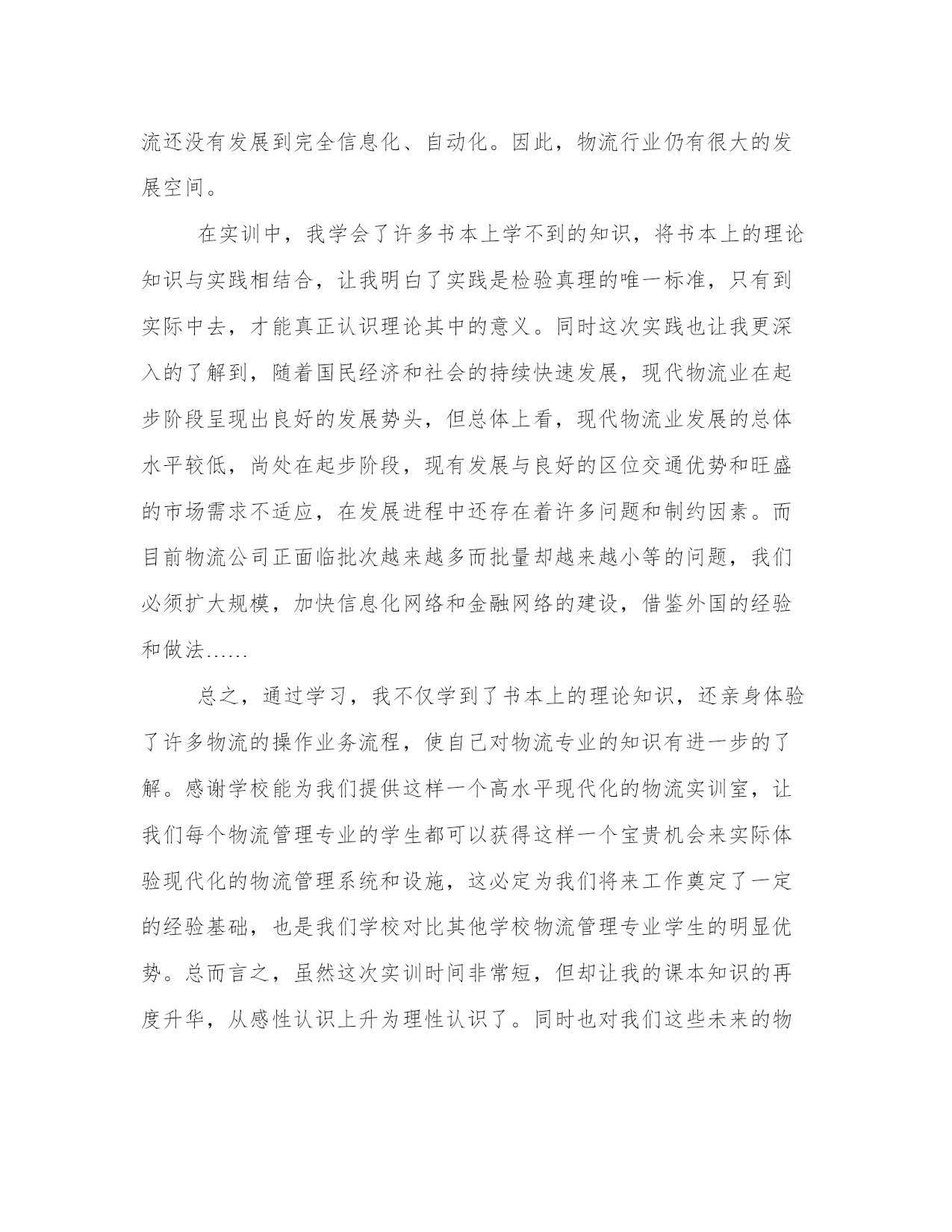 物流实习体会报告经过这几周对物流管理的实训,我们在实训课上接触了许多先进的物流管理系统,它把我们日常学习的与专业有关的知识紧密的接合了起来,这让我们深刻明白学习是一个环环相扣的环节。同时,我们了解到物流工作的复杂性,但在在此实训中充分了解物流企业相关的运营操作程序,增强感性认识,并可从中进一步了解、巩固与深化已经学过的理论知识了解运作方式,将我们所学到的专业知识和具体实践相结合,以提高我们的专业综合素质和能力,当然也为了让我们对物流公司的运营状况有一个整体的了解,对中国物流行业的发展状况有一个比较全面的认识,增强我们对所学专业的认识,提高学习专业知识的兴趣,切身体会到工作中不同当事人面临的具体工作与他们之间的互动关系,对针对这些操作每天都有不同的心得体会,而且发现了不同的问题,使我们在实习中充分发挥主观能动性,真正理解并吸收课堂中所学到的知识,为将来走上工作岗位打下良好基础,可以说在这次实训中,我们受益匪浅!通过这段时间的学习,使我对我国的物流行业现状有一定的了解。中国物流业大多是由运输、仓储业转变而来的,各方面的设施设备都还不够完善,管理有的还保留原有的管理模式。现在国内物流企业很多作业都无法运用到现代技术。课本上知识的现代化在现实中根本无法看到,从而得出,理论与现实有很大的差距,也看得出我国的物流还没有发展到完全信息化、自动化。因此,物流行业仍有很大的发展空间。在实训中,我学会了许多书本上学不到的知识,将书本上的理论知识与实践相结合,让我明白了实践是检验真理的唯一标准,只有到实际中去,才能真正认识理论其中的意义。同时这次实践也让我更深入的了解到,随着国民经济和社会的持续快速发展,现代物流业在起步阶段呈现出良好的发展势头,但总体上看,现代物流业发展的总体水平较低,尚处在起步阶段,现有发展与良好的区位交通优势和旺盛的市场需求不适应,在发展进程中还存在着许多问题和制约因素。而目前物流公司正面临批次越来越多而批量却越来越小等的问题,我们必须扩大规模,加快信息化网络和金融网络的建设,借鉴外国的经验和做法……总之,通过学习,我不仅学到了书本上的理论知识,还亲身体验了许多物流的操作业务流程,使自己对物流专业的知识有进一步的了解。感谢学校能为我们提供这样一个高水平现代化的物流实训室,让我们每个物流管理专业的学生都可以获得这样一个宝贵机会来实际体验现代化的物流管理系统和设施,这必定为我们将来工作奠定了一定的经验基础,也是我们学校对比其他学校物流管理专业学生的明显优势。总而言之,虽然这次实训时间非常短,但却让我的课本知识的再度升华,从感性认识上升为理性认识了。同时也对我们这些未来的物流从业人员要面对的问题有了更深刻的认识,对于肩上所背负的责任:为中国物流业奉献自己的一份心力有了更明确的理解。