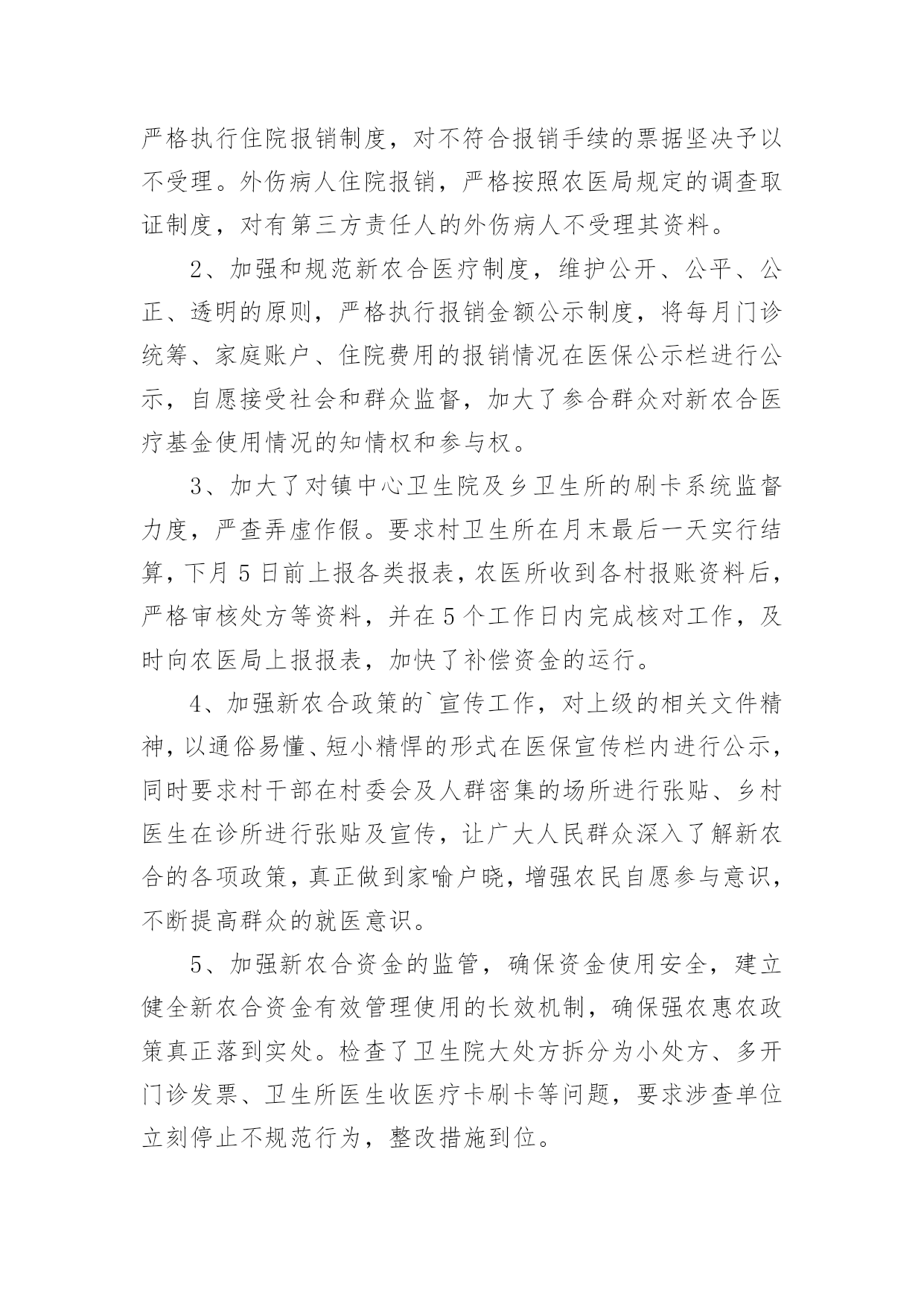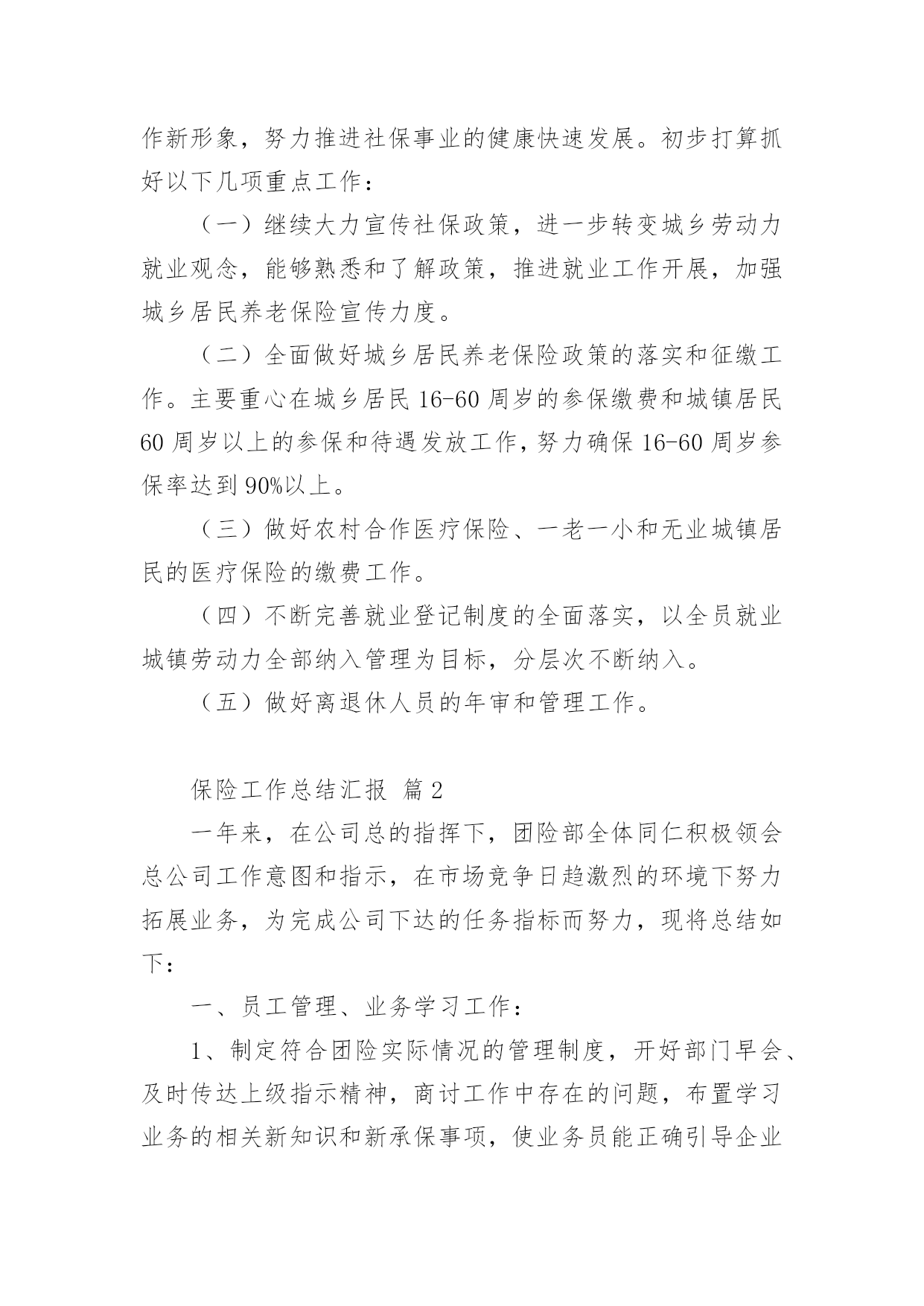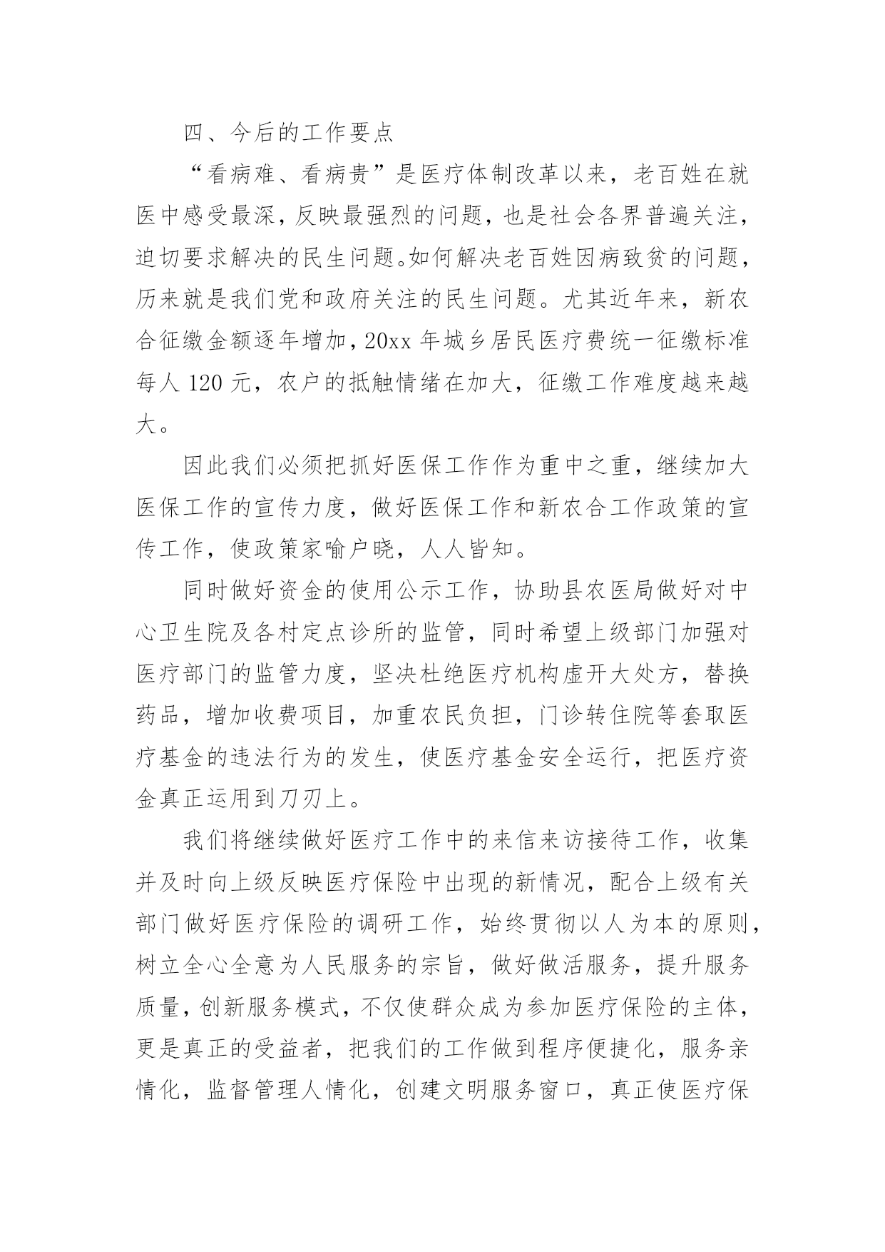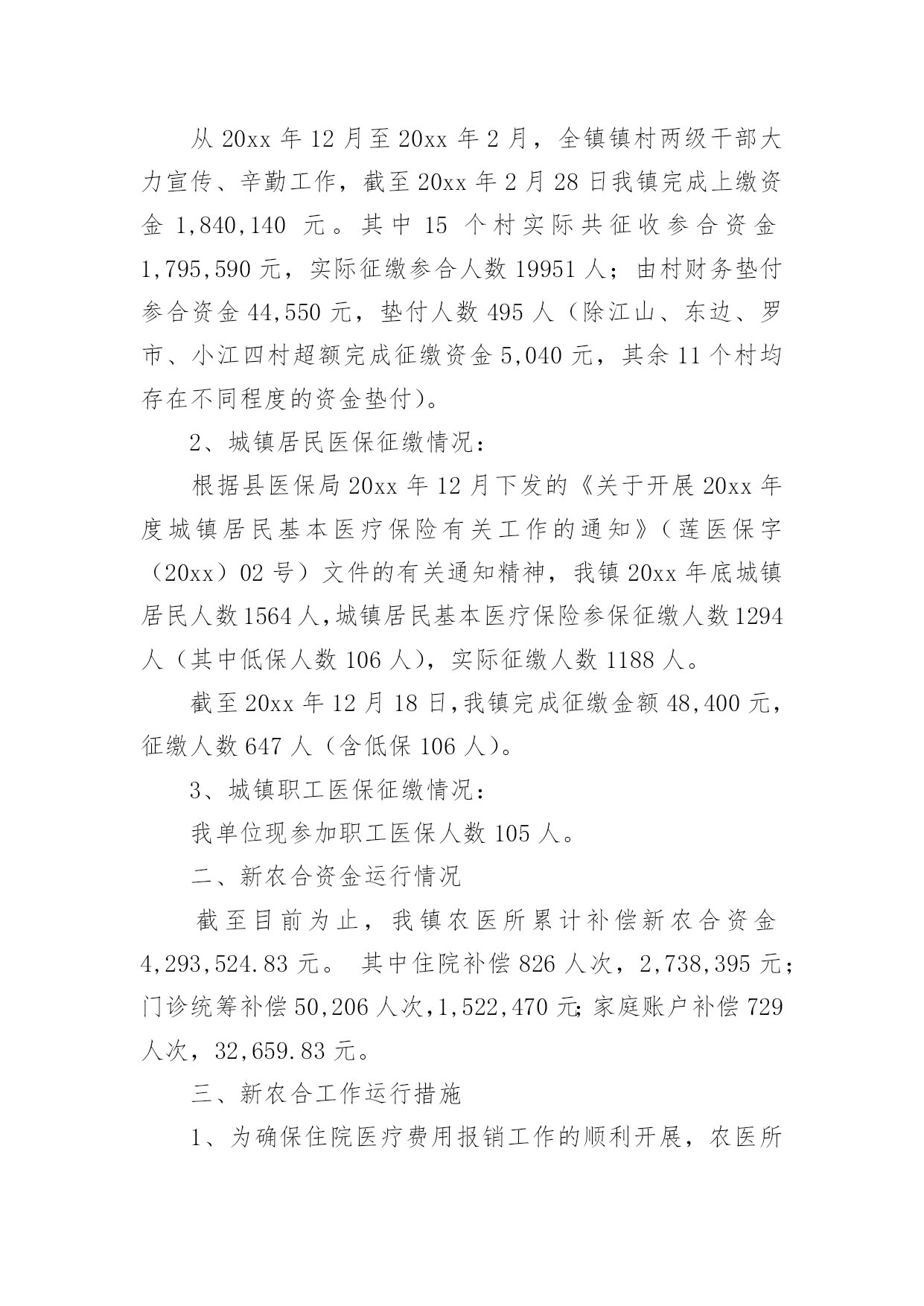 保险工作总结汇报在学习和工作的日常里,汇报的使用范围越来越广,汇报时通常会多讲一些重点工作的内容,非重点的内容简单介绍即可,那么,汇报应该怎么写呢?以下是小编为大家整理的保险工作总结汇报,欢迎大家借鉴与参考,希望对大家有所帮助。保险工作总结汇报篇1今年以来,我镇的医疗保险工作在镇党委、政府和上级主管部门的领导下,认真贯彻落实上级有关医疗保险文件精神,按照年初制定的工作计划,紧紧围绕搞好“民生工程”的工作目标,以强化管理,优化服务为手段,为保障广大参保人员的医疗待遇,维护社会稳定,促进我镇各项事业的全面、协调、快速发展,取得了一定的工作成效。现将今年以来的工作情况总结如下:一、我镇20xx年各项医保工作征缴情况1、新农合征缴情况:根据县农医局20xx年12月下发的《关于开展20xx年度新型农村合作医疗保险有关工作的通知》(莲新农合委办(20xx)02号)文件的有关通知精神,我镇20xx年底农业人口22497人,参合任务数21597人(其中民政统筹人数1151人),需征缴参合人数20446人,20xx年征缴参合标准90元/人,征缴参合资金1,840,140元。从20xx年12月至20xx年2月,全镇镇村两级干部大力宣传、辛勤工作,截至20xx年2月28日我镇完成上缴资金1,840,140元。其中15个村实际共征收参合资金1,795,590元,实际征缴参合人数19951人;由村财务垫付参合资金44,550元,垫付人数495人(除江山、东边、罗市、小江四村超额完成征缴资金5,040元,其余11个村均存在不同程度的资金垫付)。2、城镇居民医保征缴情况:根据县医保局20xx年12月下发的《关于开展20xx年度城镇居民基本医疗保险有关工作的通知》(莲医保字(20xx)02号)文件的有关通知精神,我镇20xx年底城镇居民人数1564人,城镇居民基本医疗保险参保征缴人数1294人(其中低保人数106人),实际征缴人数1188人。截至20xx年12月18日,我镇完成征缴金额48,400元,征缴人数647人(含低保106人)。3、城镇职工医保征缴情况:我单位现参加职工医保人数105人。二、新农合资金运行情况截至目前为止,我镇农医所累计补偿新农合资金4,293,524.83元。其中住院补偿826人次,2,738,395元;门诊统筹补偿50,206人次,1,522,470元;家庭账户补偿729人次,32,659.83元。三、新农合工作运行措施1、为确保住院医疗费用报销工作的顺利开展,农医所严格执行住院报销制度,对不符合报销手续的票据坚决予以不受理。外伤病人住院报销,严格按照农医局规定的调查取证制度,对有第三方责任人的外伤病人不受理其资料。2、加强和规范新农合医疗制度,维护公开、公平、公正、透明的原则,严格执行报销金额公示制度,将每月门诊统筹、家庭账户、住院费用的报销情况在医保公示栏进行公示,自愿接受社会和群众监督,加大了参合群众对新农合医疗基金使用情况的知情权和参与权。3、加大了对镇中心卫生院及乡卫生所的刷卡系统监督力度,严查弄虚作假。要求村卫生所在月末最后一天实行结算,下月5日前上报各类报表,农医所收到各村报账资料后,严格审核处方等资料,并在5个工作日内完成核对工作,及时向农医局上报报表,加快了补偿资金的运行。4、加强新农合政策的`宣传工作,对上级的相关文件精神,以通俗易懂、短小精悍的形式在医保宣传栏内进行公示,同时要求村干部在村委会及人群密集的场所进行张贴、乡村医生在诊所进行张贴及宣传,让广大人民群众深入了解新农合的各项政策,真正做到家喻户晓,增强农民自愿参与意识,不断提高群众的就医意识。5、加强新农合资金的监管,确保资金使用安全,建立健全新农合资金有效管理使用的长效机制,确保强农惠农政策真正落到实处。检查了卫生院大处方拆分为小处方、多开门诊发票、卫生所医生收医疗卡刷卡等问题,要求涉查单位立刻停止不规范行为,整改措施到位。四、今后的工作要点“看病难、看病贵”是医疗体制改革以来,老百姓在就医中感受最深,反映最强烈的问题,也是社会各界普遍关注,迫切要求解决的民生问题。如何解决老百姓因病致贫的问题,历来就是我们党和政府关注的民生问题。尤其近年来,新农合征缴金额逐年增加,20xx年城乡居民医疗费统一征缴标准每人120元,农户的抵触情绪在加大,征缴工作难度越来越大。因此我们必须把抓好医保工作作为重中之重,继续加大医保工作的宣传力度,做好医保工作和新农合工作政策的宣传工作,使政策家喻户晓,人人皆知。同时做好资金的使用公示工作,协助县农医局做好对中心卫生院及各村定点诊所的监管,同时希望上级部门加强对医疗部门的监管力度,坚决杜绝医疗机构虚开大处方,替换药品,增加收费项目,加重农民负担,门诊转住院等套取医疗基金的违法行为的发生,使医疗基金安全运行,把医疗资金真正