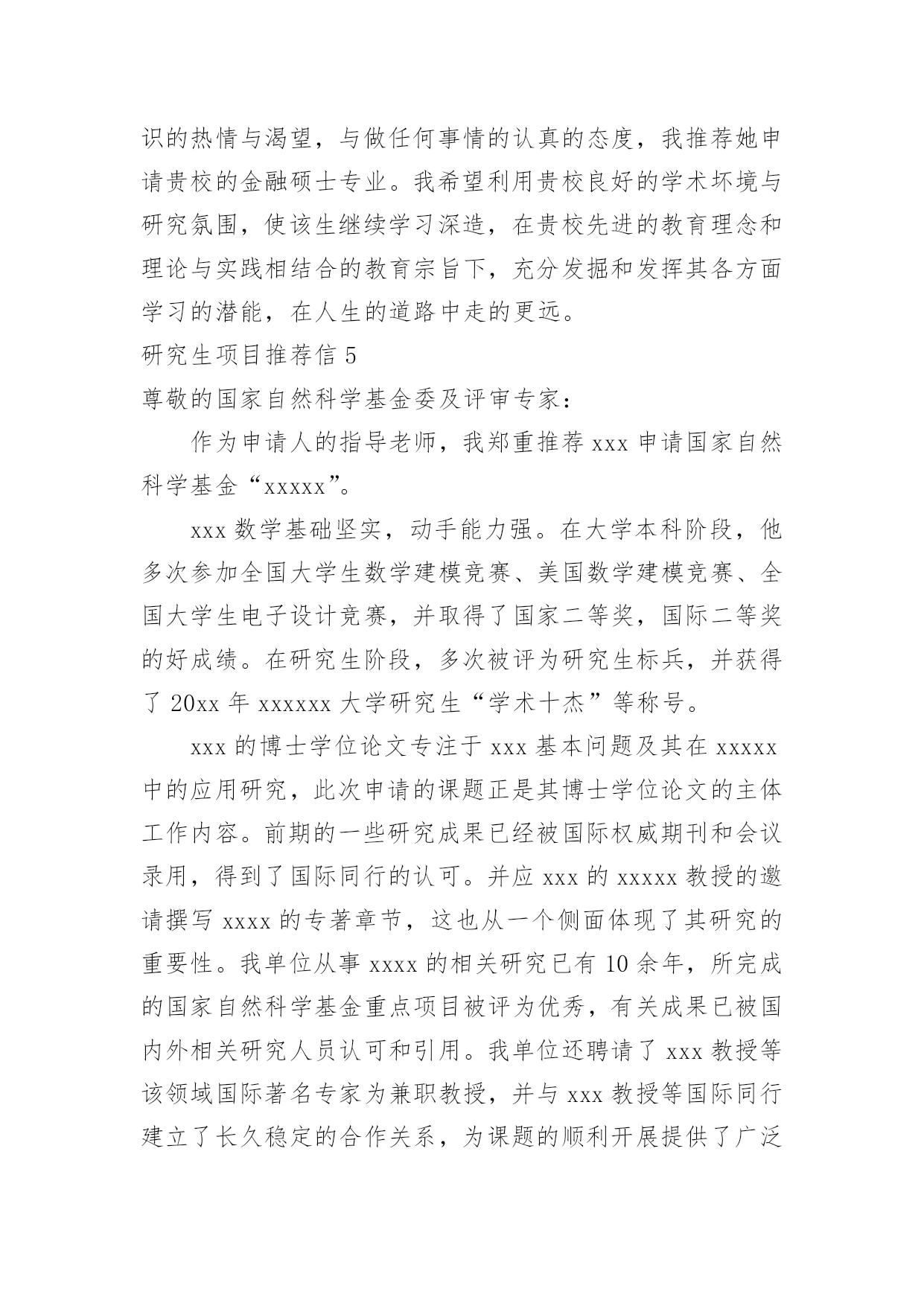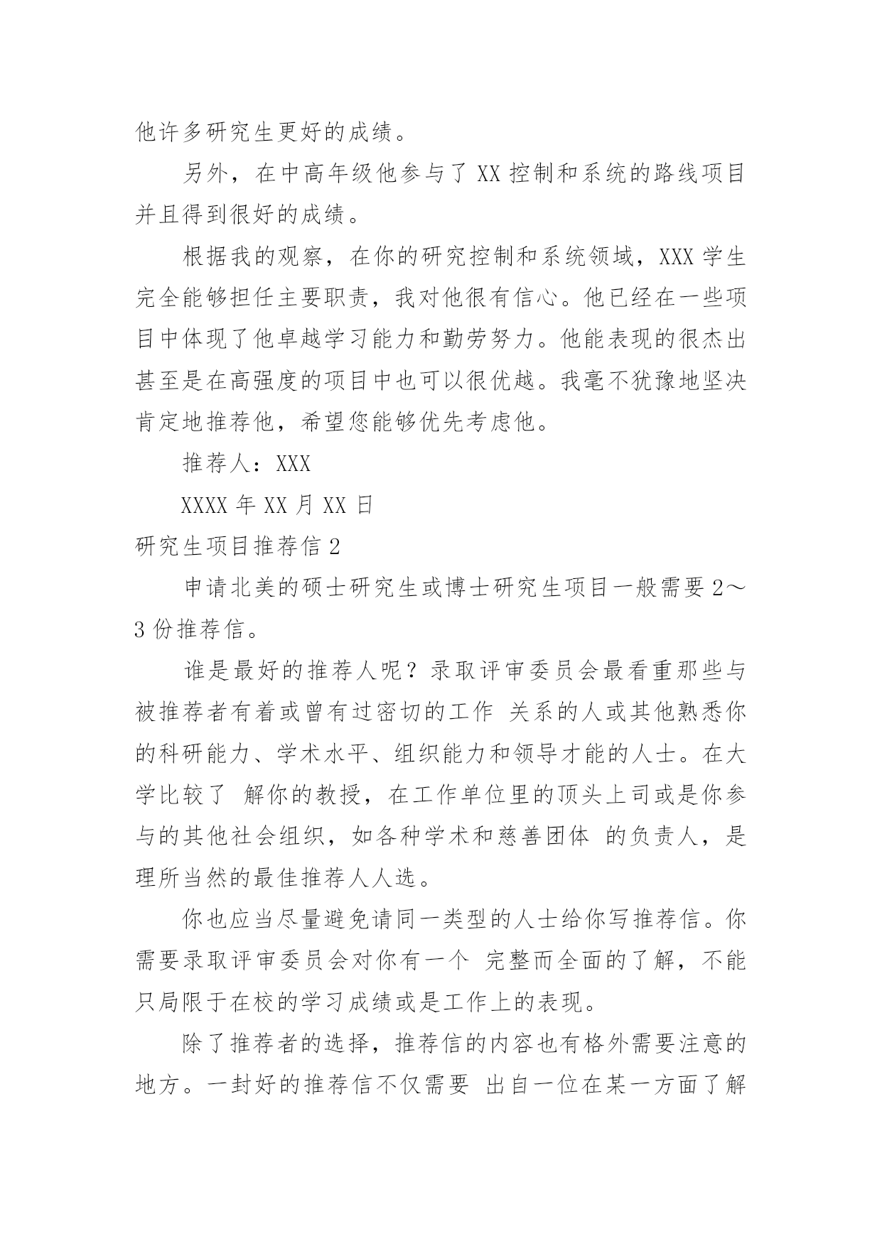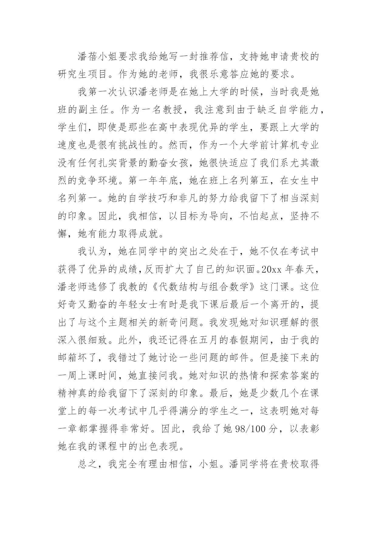 研究生项目推荐信研究生项目推荐信随着个人素质的提升,越来越多人会去使用推荐信,一封好的推荐信能为申请人加分。大家知道推荐信的格式吗?下面是小编为大家收集的研究生项目推荐信,仅供参考,希望能够帮助到大家。研究生项目推荐信1尊敬的领导:您好!我很荣幸推荐我的学生XXX申请参加您的研究生项目。XXX学生曾经参加过我的“XX控制系统”项目以及他在中高年级期间的“XXX理论”项目。并获得很高的成绩和评价。其中,在针对性研究生开放的课题中,他是仅有的参与的三位本科学生之一。在指导他的期间,我了解到他是一个好学和勤奋的人,他总是积极发言并学习掌握一些知识。其实有一些任务对一般的学生是有难度的,可他总能出色地解决这些问题,这些正是因为他的逻辑和分析思维能力以及对理论的清晰构想。在最后的项目中,他也打动了我。在解决开发项目中自由易变的优选问题,他深思熟虑并且熟练地完成了它,所以项目能够运转良好,甚至是发生一些特殊情况,但是它仍就能够很好的运转和阅读。因此我给了他比其他许多研究生更好的成绩。另外,在中高年级他参与了XX控制和系统的路线项目并且得到很好的成绩。根据我的观察,在你的研究控制和系统领域,XXX学生完全能够担任主要职责,我对他很有信心。他已经在一些项目中体现了他卓越学习能力和勤劳努力。他能表现的很杰出甚至是在高强度的项目中也可以很优越。我毫不犹豫地坚决肯定地推荐他,希望您能够优先考虑他。推荐人:XXXXXXX年XX月XX日研究生项目推荐信2申请北美的硕士研究生或博士研究生项目一般需要2~3份推荐信。谁是最好的推荐人呢?录取评审委员会最看重那些与被推荐者有着或曾有过密切的工作关系的人或其他熟悉你的科研能力、学术水平、组织能力和领导才能的人士。在大学比较了解你的教授,在工作单位里的顶头上司或是你参与的其他社会组织,如各种学术和慈善团体的负责人,是理所当然的最佳推荐人人选。你也应当尽量避免请同一类型的人士给你写推荐信。你需要录取评审委员会对你有一个完整而全面的了解,不能只局限于在校的学习成绩或是工作上的表现。除了推荐者的选择,推荐信的内容也有格外需要注意的地方。一封好的推荐信不仅需要出自一位在某一方面了解你的人士之手,而且这封信对你的评价必须要有具体的例子来佐证。许许多多的推荐信都犯着一个雷同而且是致使的错误,那就是几乎每一句话都堆满了赞美的形容词或名词,但却不举一件事例来证明。这样的推荐信是苍白无力的,它不增加评审委员会对你的任何了解,甚至会让读者产生疑问:你的教授,你的顶头上司,为什么不能说出你任何一件具体的成就!当然,即使是十分了解你的推荐者也不能保证完全了解或是记得你的具体成就和能力,他们也可能不清楚在推荐信上详细介绍你的重要性。你所应该做的是与推荐者交谈一次,提醒他们你所具有的能力和已获得的成就并表明你希望他们能够提到这些事实。推荐者如果恰当地而又正面谈到申请人的不足,就会增加推荐信的真实性,而且也显示出对被推荐者深刻的了解。这样的推荐信就会更加有分量。此外,许多申请者在细节上相当马虎,他们去替推荐者打印给自己的几封推荐信时,不仅行文的口气、格式完全没有变化,连使用的纸张、信封、字型、字号也一模一样。国外的评审委员往往不了解中国的特殊国情,他们可能据此判断你在伪造推荐信。总之:推荐信是除自述外最重要的出国留学申请文件,起着从侧面介绍、证明的作用。由于其客观性,推荐信能起到自述所起不到的作用。研究生项目推荐信3亲爱的录取委员会:潘蓓小姐要求我给她写一封推荐信,支持她申请贵校的研究生项目。作为她的老师,我很乐意答应她的要求。我第一次认识潘老师是在她上大学的时候,当时我是她班的副主任。作为一名教授,我注意到由于缺乏自学能力,学生们,即使是那些在高中表现优异的学生,要跟上大学的速度也是很有挑战性的。然而,作为一个大学前计算机专业没有任何扎实背景的勤奋女孩,她很快适应了我们系尤其激烈的竞争环境。第一年年底,她在班上名列第五,在女生中名列第一。她的自学技巧和非凡的努力给我留下了相当深刻的印象。因此,我相信,以目标为导向,不怕起点,坚持不懈,她有能力取得成就。我认为,她在同学中的突出之处在于,她不仅在考试中获得了优异的成绩,反而扩大了自己的知识面。20xx年春天,潘老师选修了我教的《代数结构与组合数学》这门课。这位好奇又勤奋的年轻女士有时是我下课后最后一个离开的,提出了与这个主题相关的新奇问题。我发现她对知识理解的很深入很细致。此外,我还记得在五月的春假期间,由于我的邮箱坏了,我错过了她讨论一些问题的邮件。但是接下来的一周上课时间,她直接问我。她对知识的热情和探索答案的精神真的给我留下了深刻的印象。最后,她是少数几个在课堂上的每一次考试中几乎得满分的学生之一,这表明她对每一章都掌握得非常好。因此,我给了她98/100分,以表彰她在我的课程中的出
