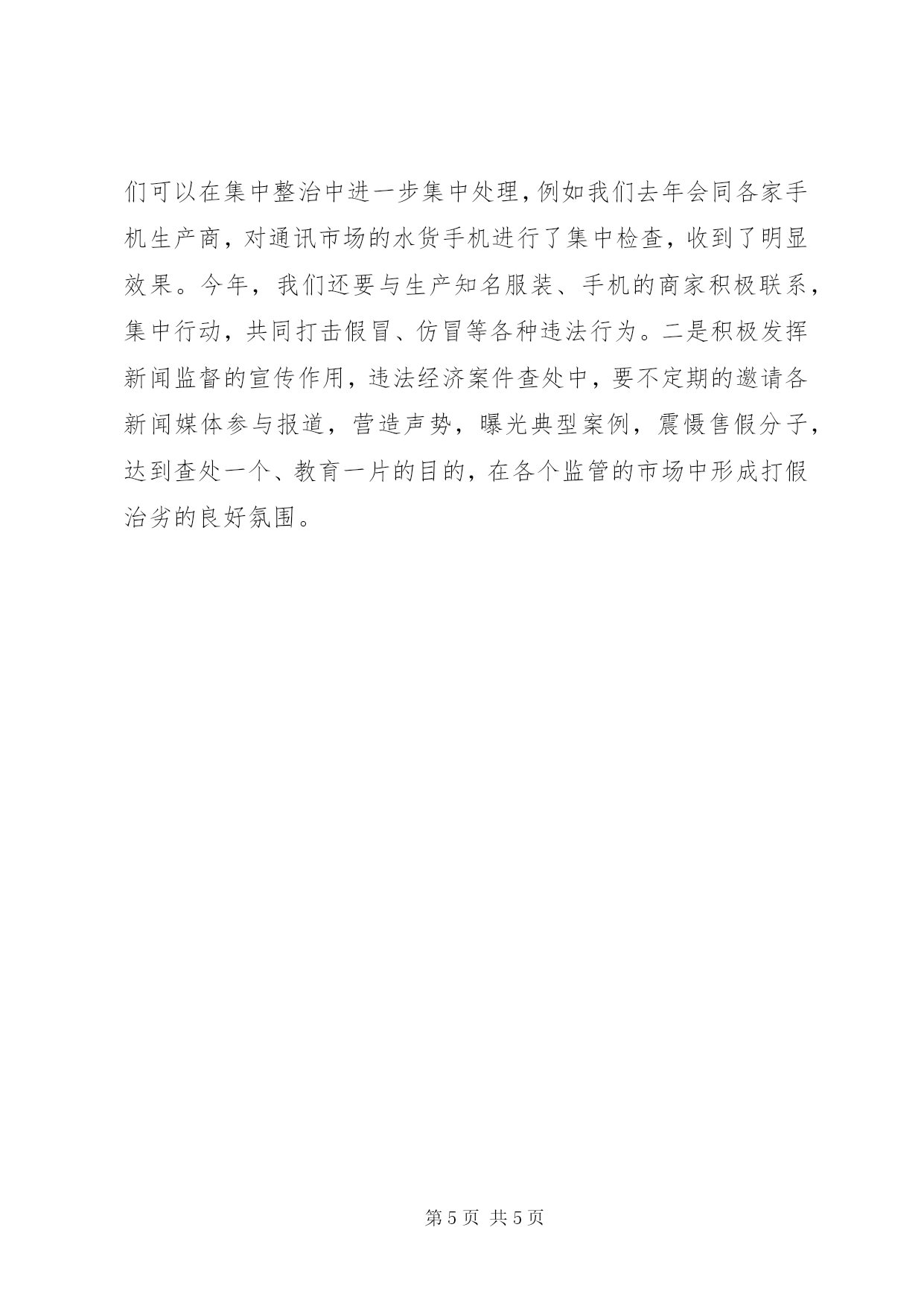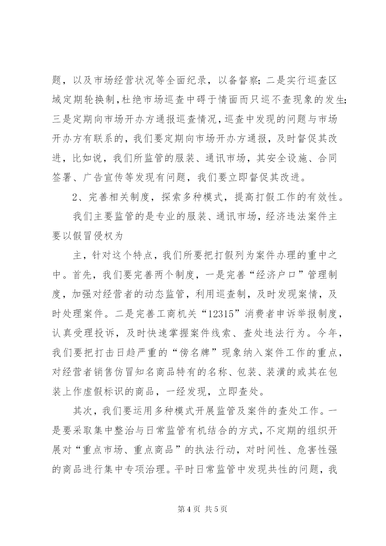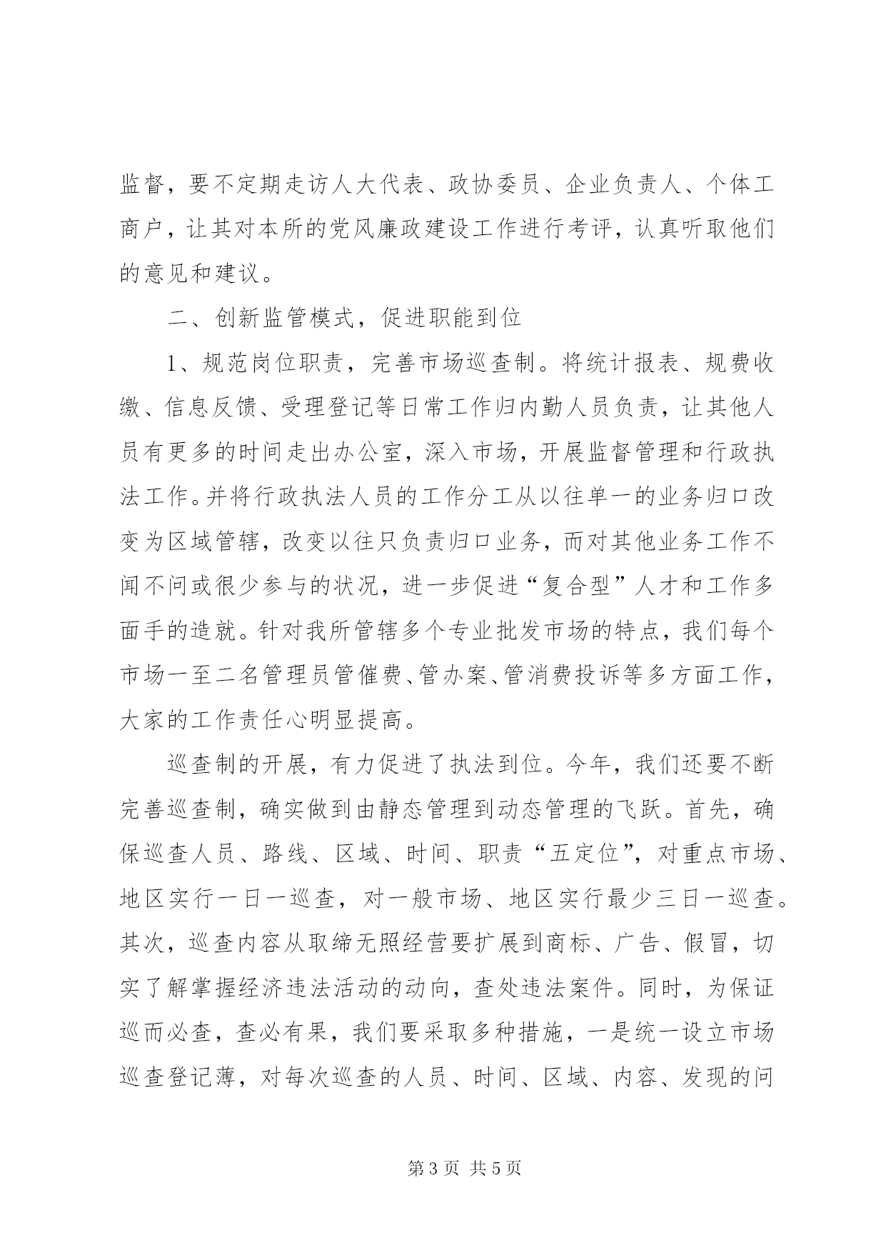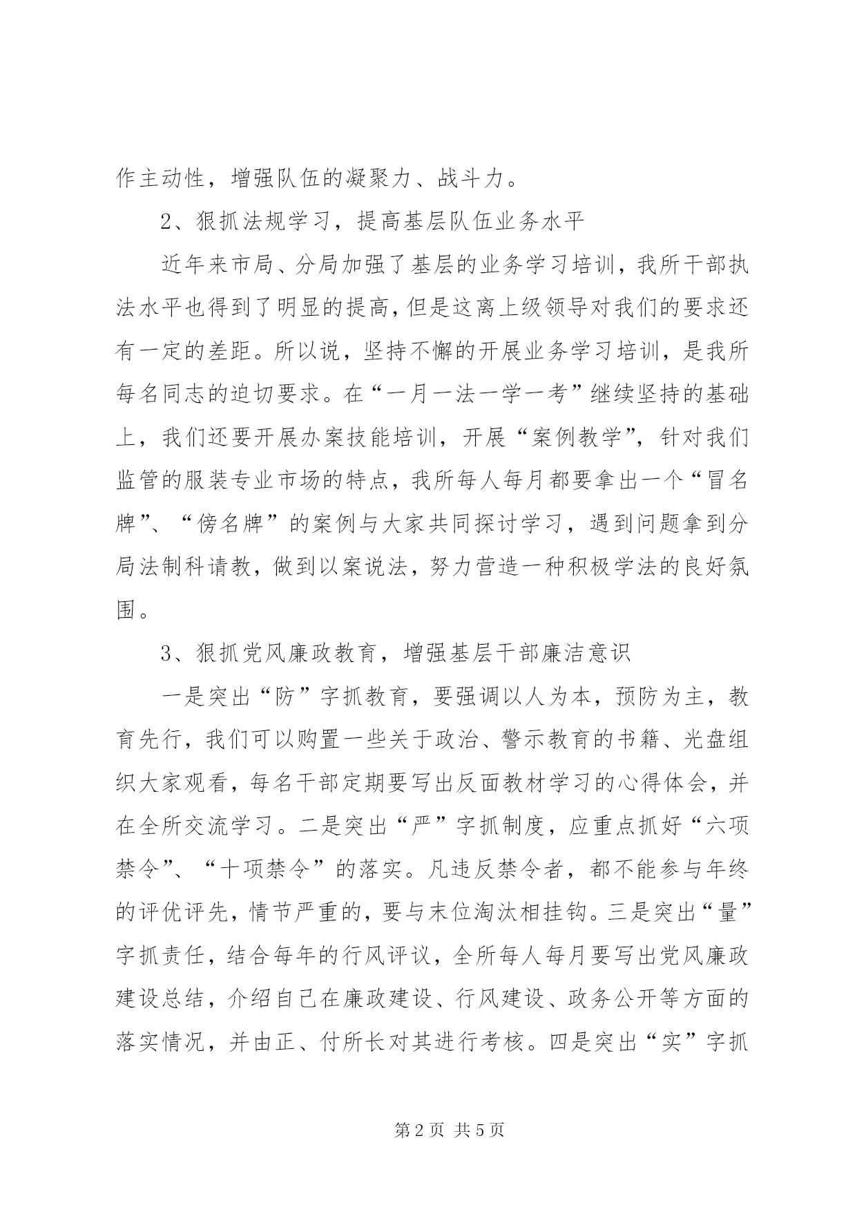 第PAGE\*Arabic\*MERGEFORMAT5页共NUMPAGES\*MERGEFORMAT5页工商所队伍建设汇报队伍建设常抓不懈监管模式开拓创新工商所是工商机关的缩影,是工商机关的一面镜子,基层工商所队伍素质的高低可以直接反映出我们这支队伍的执法水平和服务质量,反映出工商行政管理系统的精神风貌,因此只有不断提高基层队伍素质,不断创新监管模式,把工商所建设成为坚强的战斗堡垒,工商行政机关的职能作用才能得到充分发挥,工商行政管理的各项工作才有切实保障,下面结合我所实际,就当前如何抓好工商所队伍建设、创新监管模式谈几点看法:一、好教育培训,提高队伍素质1、狠抓政治思想学习,提高基层队伍政治素质基层工商所政治思想的学习,要充分发挥好基层党支部的桥头堡作用,加强基层组织领导,树立“讲学习、讲政治、讲正气”的良好作风。教育内容上,认真学习“三个代表”重要思想,深刻领会十六大精神,通过学习典型先进、组织“争当任命满意公务员”大讨论等形式,树立大家全心全意为人民服务的宗旨,树立公仆意识,从讲政治的高度,强化行政执法的政治属性。下一步,我们要积极落实“末位淘汰”等制度,在全所形成“不进则退,慢进也是退”的危机意识,形成“人人有压力,个个有动力,奋勇争上游”的良好氛围,以此提高全所干部的学习积极性、工作主动性,增强队伍的凝聚力、战斗力。2、狠抓法规学习,提高基层队伍业务水平近年来市局、分局加强了基层的业务学习培训,我所干部执法水平也得到了明显的提高,但是这离上级领导对我们的要求还有一定的差距。所以说,坚持不懈的开展业务学习培训,是我所每名同志的迫切要求。在“一月一法一学一考”继续坚持的基础上,我们还要开展办案技能培训,开展“案例教学”,针对我们监管的服装专业市场的特点,我所每人每月都要拿出一个“冒名牌”、“傍名牌”的案例与大家共同探讨学习,遇到问题拿到分局法制科请教,做到以案说法,努力营造一种积极学法的良好氛围。3、狠抓党风廉政教育,增强基层干部廉洁意识一是突出“防”字抓教育,要强调以人为本,预防为主,教育先行,我们可以购置一些关于政治、警示教育的书籍、光盘组织大家观看,每名干部定期要写出反面教材学习的心得体会,并在全所交流学习。二是突出“严”字抓制度,应重点抓好“六项禁令”、“十项禁令”的落实。凡违反禁令者,都不能参与年终的评优评先,情节严重的,要与末位淘汰相挂钩。三是突出“量”字抓责任,结合每年的行风评议,全所每人每月要写出党风廉政建设总结,介绍自己在廉政建设、行风建设、政务公开等方面的落实情况,并由正、付所长对其进行考核。四是突出“实”字抓监督,要不定期走访人大代表、政协委员、企业负责人、个体工商户,让其对本所的党风廉政建设工作进行考评,认真听取他们的意见和建议。二、创新监管模式,促进职能到位1、规范岗位职责,完善市场巡查制。将统计报表、规费收缴、信息反馈、受理登记等日常工作归内勤人员负责,让其他人员有更多的时间走出办公室,深入市场,开展监督管理和行政执法工作。并将行政执法人员的工作分工从以往单一的业务归口改变为区域管辖,改变以往只负责归口业务,而对其他业务工作不闻不问或很少参与的状况,进一步促进“复合型”人才和工作多面手的造就。针对我所管辖多个专业批发市场的特点,我们每个市场一至二名管理员管催费、管办案、管消费投诉等多方面工作,大家的工作责任心明显提高。巡查制的开展,有力促进了执法到位。今年,我们还要不断完善巡查制,确实做到由静态管理到动态管理的飞跃。首先,确保巡查人员、路线、区域、时间、职责“五定位”,对重点市场、地区实行一日一巡查,对一般市场、地区实行最少三日一巡查。其次,巡查内容从取缔无照经营要扩展到商标、广告、假冒,切实了解掌握经济违法活动的动向,查处违法案件。同时,为保证巡而必查,查必有果,我们要采取多种措施,一是统一设立市场巡查登记薄,对每次巡查的人员、时间、区域、内容、发现的问题,以及市场经营状况等全面纪录,以备督察;二是实行巡查区域定期轮换制,杜绝市场巡查中碍于情面而只巡不查现象的发生;三是定期向市场开办方通报巡查情况,巡查中发现的问题与市场开办方有联系的,我们要定期向市场开办方通报,及时督促其改进,比如说,我们所监管的服装、通讯市场,其安全设施、合同签署、广告宣传等发现有问题,我们要立即督促其改进。2、完善相关制度,探索多种模式,提高打假工作的有效性。我们主要监管的是专业的服装、通讯市场,经济违法案件主要以假冒侵权为主,针对这个特点,我们所要把打假列为案件办理的重中之中。首先,我们要完善两个制度,一是完善“经济户口”管理制度,加强对经营者的动态监管,利用巡查制,及时发现案情,及时处理案件。二是完善工商机关“12315”消费者申诉举报制度,认真受理投诉,及时快速掌握案件线索、查处违法行为