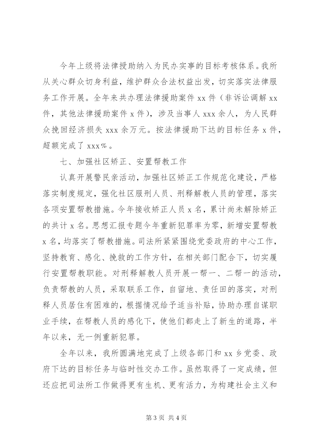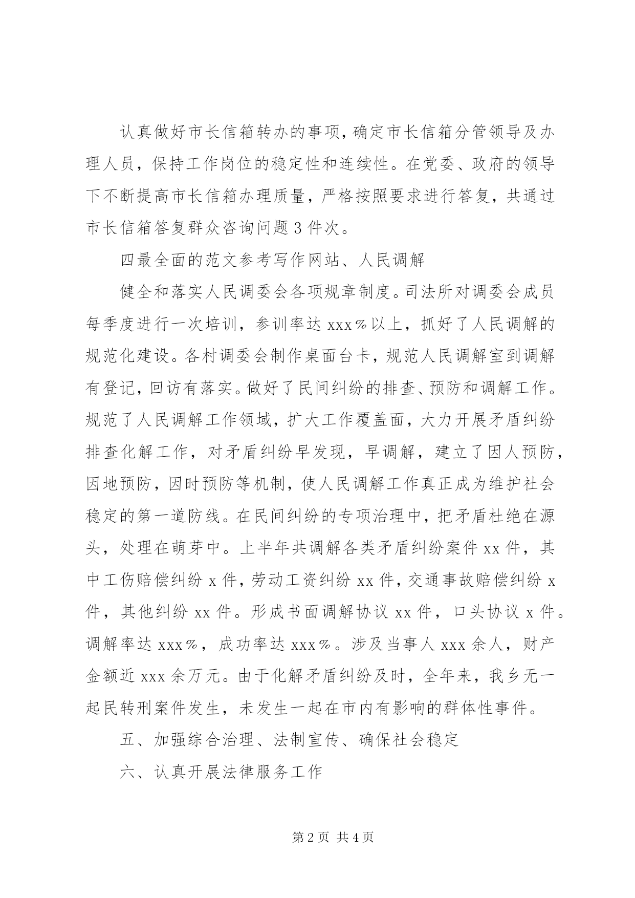 第PAGE\*Arabic\*MERGEFORMAT4页共NUMPAGES\*MERGEFORMAT4页司法所XX年工作总结材料2016年上半年以来,xx司法所在XX县区司法局、xx乡党委、政府的领导下,始终坚持按照两学一做要求,全面贯彻落实科学发展观和十八大精神,深入贯彻党的方针、路线、政策,围绕乡党委工作大局,充分发挥司法行政部门职能作用,整体推进普法和依法治理工作,维护社会稳定为根本目标,以维护人民群众根本利益为根本出发点,努力化解各种社会矛盾纠纷,为促进依法治国基本方略,构建和谐社会,全面建设小康社会营造良好的社会环境。为下一步工作更好开展,现我所将xxxx年上半年年的工作情况作如下总结:一、建立健全组织机构乡党委、政府高度重视司法行政工作,把司法所建设、人民调解、社区矫正、安置帮教、群众工作、法律援助工作、综合治理、稳定等工作纳入党委、政府的议事日程。二、健全各项规章制度司法所对所开展的工作,项项有职责,事事有责任。年初有计划,年底有考核。将各项职责、制度上墙,做到有章可循,有据可查,责任清、任务明。三、群众工作勤摸底、严排查。对群众反映的情况及时处理地、疏导,用法律法规进行讲解、宣传。动之以情、晓之以理。认真做好市长信箱转办的事项,确定市长信箱分管领导及办理人员,保持工作岗位的稳定性和连续性。在党委、政府的领导下不断提高市长信箱办理质量,严格按照要求进行答复,共通过市长信箱答复群众咨询问题3件次。四最全面的范文参考写作网站、人民调解健全和落实人民调委会各项规章制度。司法所对调委会成员每季度进行一次培训,参训率达xxx﹪以上,抓好了人民调解的规范化建设。各村调委会制作桌面台卡,规范人民调解室到调解有登记,回访有落实。做好了民间纠纷的排查、预防和调解工作。规范了人民调解工作领域,扩大工作覆盖面,大力开展矛盾纠纷排查化解工作,对矛盾纠纷早发现,早调解,建立了因人预防,因地预防,因时预防等机制,使人民调解工作真正成为维护社会稳定的第一道防线。在民间纠纷的专项治理中,把矛盾杜绝在源头,处理在萌芽中。上半年共调解各类矛盾纠纷案件xx件,其中工伤赔偿纠纷x件,劳动工资纠纷xx件,交通事故赔偿纠纷x件,其他纠纷xx件。形成书面调解协议xx件,口头协议x件。调解率达xxx﹪,成功率达xxx﹪。涉及当事人xxx余人,财产金额近xxx余万元。由于化解矛盾纠纷及时,全年来,我乡无一起民转刑案件发生,未发生一起在市内有影响的群体性事件。五、加强综合治理、法制宣传、确保社会稳定六、认真开展法律服务工作今年上级将法律授助纳入为民办实事的目标考核体系。我所从关心群众切身利益,维护群众合法权益出发,切实落实法律服务工作开展。全年来共办理法律援助案件xx件(非诉讼调解xx件,其他法律援助案件x件),涉及当事人xxx余人,为人民群众挽回经济损失xxx余万元。按法律援助下达的目标任务x件,超额完成了xxx﹪。七、加强社区矫正、安置帮教工作认真开展警民亲活动,加强社区矫正工作规范化建设,严格落实制度规定,强化社区服刑人员、刑释解教人员的管理,落实各项安置帮教措施。今年接收矫正人员x名,累计尚未解除矫正的共计x名。思想汇报专题今年重新犯罪率为零,新增安置帮教x名,均落实了帮教措施。司法所紧紧围绕党委政府的中心工作,坚持教育、感化、挽救的工作方针,在相关部门配合下,切实履行安置帮教职能。对刑释解教人员开展一帮一、二帮一的活动,负责帮教的人员,采取联系工作,自留地、责任田的落实,对刑释人员居住有困难的,根据情况给予适当补贴,协助办理自谋职业手续,在帮教人员的感化下,使他们都走上了新生的道路,半年以来,无一例重新犯罪。全年以来,我所圆满地完成了上级各部门和xx乡党委、政府下达的目标任务与临时性交办工作。虽然取得了一定成绩,但还应把司法所工作做得更有生机、更有活力,为构建社会主义和谐社会,做出更大的贡献,努力实现市委提出让广大人民更加幸福自豪的奋斗目标而努力。