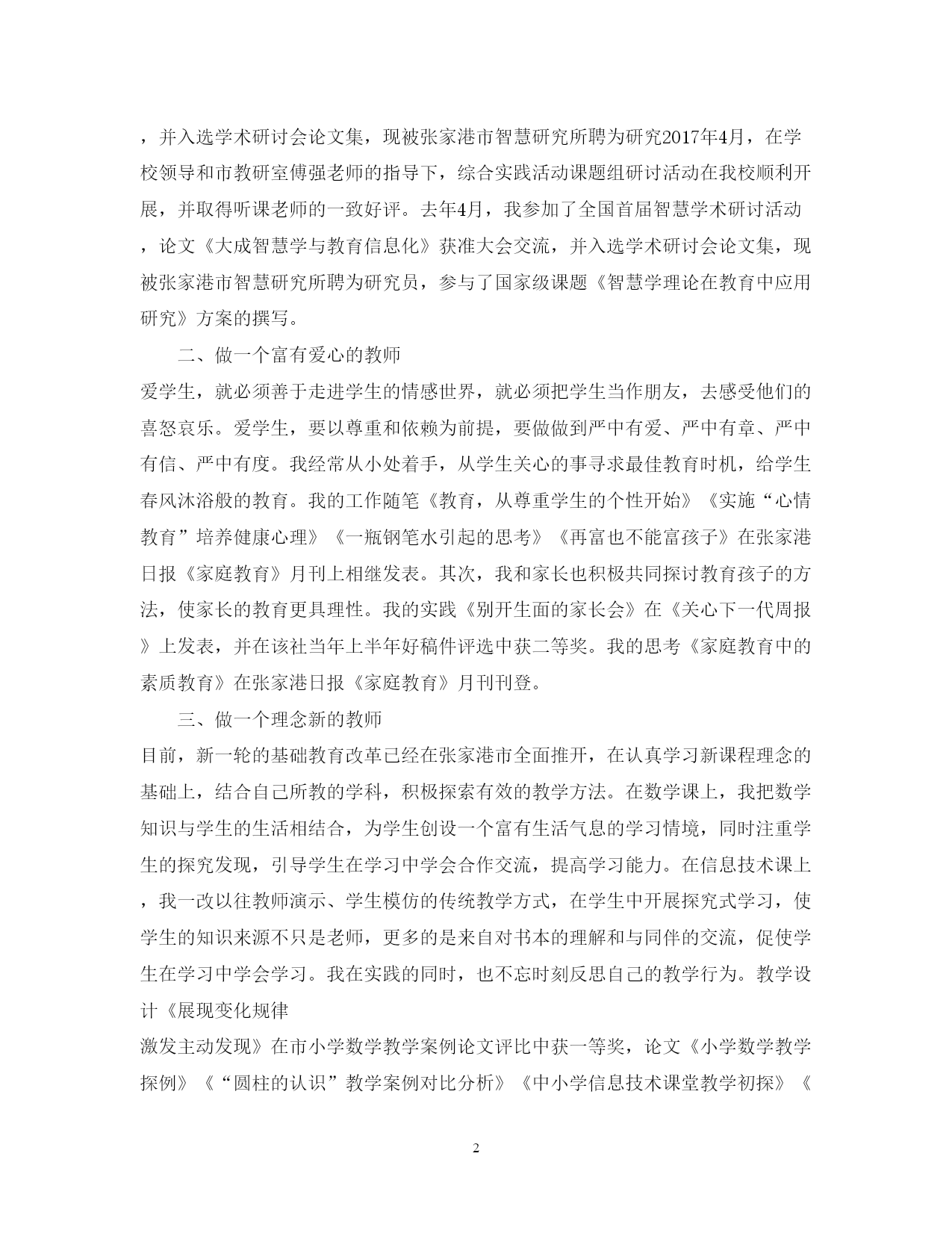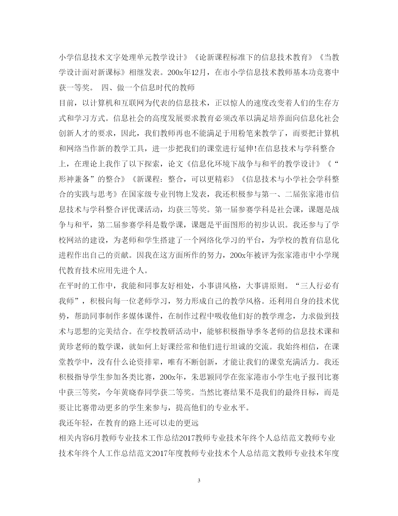 此资料由网络收集而来,如有侵权请告知上传者立即删除。资料共分享,我们负责传递知识。PAGEPAGE4高级教师专业技术工作总结范文本人于1994年毕业于xx高等专科学校,96年8月分配到xx中学,98年调到xx小学,99年到xx小学,一直工作至今,小学高级教师职称专业技术工作总结。98年9月经xx市中小学教师职务评审委员会评为小学一级教师,同年获教师资格证书,99年1月,参加xx市办公自动化考核,成绩合格。99年12月取得了现代化教育技术合格证书,200x年11月参加普通话培训考核达到二级乙等。200x年5月,参加全国成人高考,录取xx省xx大学科学与计算机系,现本科在读。200x年10月参加了xx省职称计算机考核,成绩合格。共通过三篇论文鉴定,其中二篇达到良好。现任三到六年级的信息技术教学工作。自从参加工作以来,我首先在师德上严格要求自己,要做一个合格的人民教师!认真学习和领会xxx的十六大精神和“三个代表”重要思想,与时俱进,爱岗敬业,为人师表,热爱学生,尊重学生,争取让每个学生都能享受到最好的教育,都能有不同程度的发展。基于以上认识,我在工作上兢兢业业,不敢有丝毫马虎,备好每一节课,上好每一堂课,批好每一份作业,教育好每一个学生,努力去做一个深受学生尊重和信赖的老师。一、做一个科研型教师教师的从教之日,正是重新学习之时。新时代要求教师具备的不只是操作技巧,还要有直面新情况、分析新问题、解决新矛盾的本领。在学校领导的指引下,我积极投身于学校教科研,被学校聘为教科员,协助教科室开展教学研究工作。在朱玉棣老师的指点下,成功申请了市级课题《综合实践活动设计模式的研究》,由我执笔撰写了《东莱中心小学综合实践活动课程方案》,我的活动方案《奔向二00八》也被选送苏州。200x年4月,在学校领导和市教研室傅强老师的指导下,综合实践活动课题组研讨活动在我校顺利开展,并取得听课老师的一致好评。去年4月,我参加了全国首届智慧学术研讨活动,论文《大成智慧学与教育信息化》获准大会交流,并入选学术研讨会论文集,现被张家港市智慧研究所聘为研究2017年4月,在学校领导和市教研室傅强老师的指导下,综合实践活动课题组研讨活动在我校顺利开展,并取得听课老师的一致好评。去年4月,我参加了全国首届智慧学术研讨活动,论文《大成智慧学与教育信息化》获准大会交流,并入选学术研讨会论文集,现被张家港市智慧研究所聘为研究员,参与了国家级课题《智慧学理论在教育中应用研究》方案的撰写。二、做一个富有爱心的教师爱学生,就必须善于走进学生的情感世界,就必须把学生当作朋友,去感受他们的喜怒哀乐。爱学生,要以尊重和依赖为前提,要做做到严中有爱、严中有章、严中有信、严中有度。我经常从小处着手,从学生关心的事寻求最佳教育时机,给学生春风沐浴般的教育。我的工作随笔《教育,从尊重学生的个性开始》《实施“心情教育”培养健康心理》《一瓶钢笔水引起的思考》《再富也不能富孩子》在张家港日报《家庭教育》月刊上相继发表。其次,我和家长也积极共同探讨教育孩子的方法,使家长的教育更具理性。我的实践《别开生面的家长会》在《关心下一代周报》上发表,并在该社当年上半年好稿件评选中获二等奖。我的思考《家庭教育中的素质教育》在张家港日报《家庭教育》月刊刊登。三、做一个理念新的教师目前,新一轮的基础教育改革已经在张家港市全面推开,在认真学习新课程理念的基础上,结合自己所教的学科,积极探索有效的教学方法。在数学课上,我把数学知识与学生的生活相结合,为学生创设一个富有生活气息的学习情境,同时注重学生的探究发现,引导学生在学习中学会合作交流,提高学习能力。在信息技术课上,我一改以往教师演示、学生模仿的传统教学方式,在学生中开展探究式学习,使学生的知识来源不只是老师,更多的是来自对书本的理解和与同伴的交流,促使学生在学习中学会学习。我在实践的同时,也不忘时刻反思自己的教学行为。教学设计《展现变化规律激发主动发现》在市小学数学教学案例论文评比中获一等奖,论文《小学数学教学探例》《“圆柱的认识”教学案例对比分析》《中小学信息技术课堂教学初探》《小学信息技术文字处理单元教学设计》《论新课程标准下的信息技术教育》《当教学设计面对新课标》相继发表。200x年12月,在市小学信息技术教师基本功竞赛中获一等奖。四、做一个信息时代的教师目前,以计算机和互联网为代表的信息技术,正以惊人的速度改变着人们的生存方式和学习方式。信息社会的高度发展要求教育必须改革以满足培养面向信息化社会创新人才的要求,因此,我们教师再也不能满足于用粉笔来教学了,而要把计算机和网络当作新的教学工具,进一步把我们的课堂进行延伸!在信息技术与学科整合上,在理论上我作了以下探索,论文《信息化环境下战争与和平的教学设计》《“形神兼备”的整合》《新