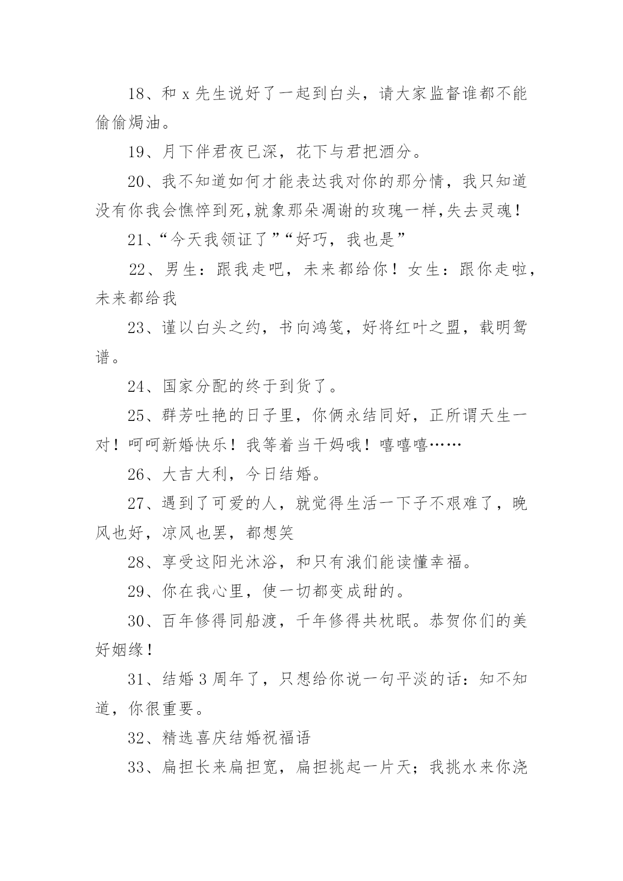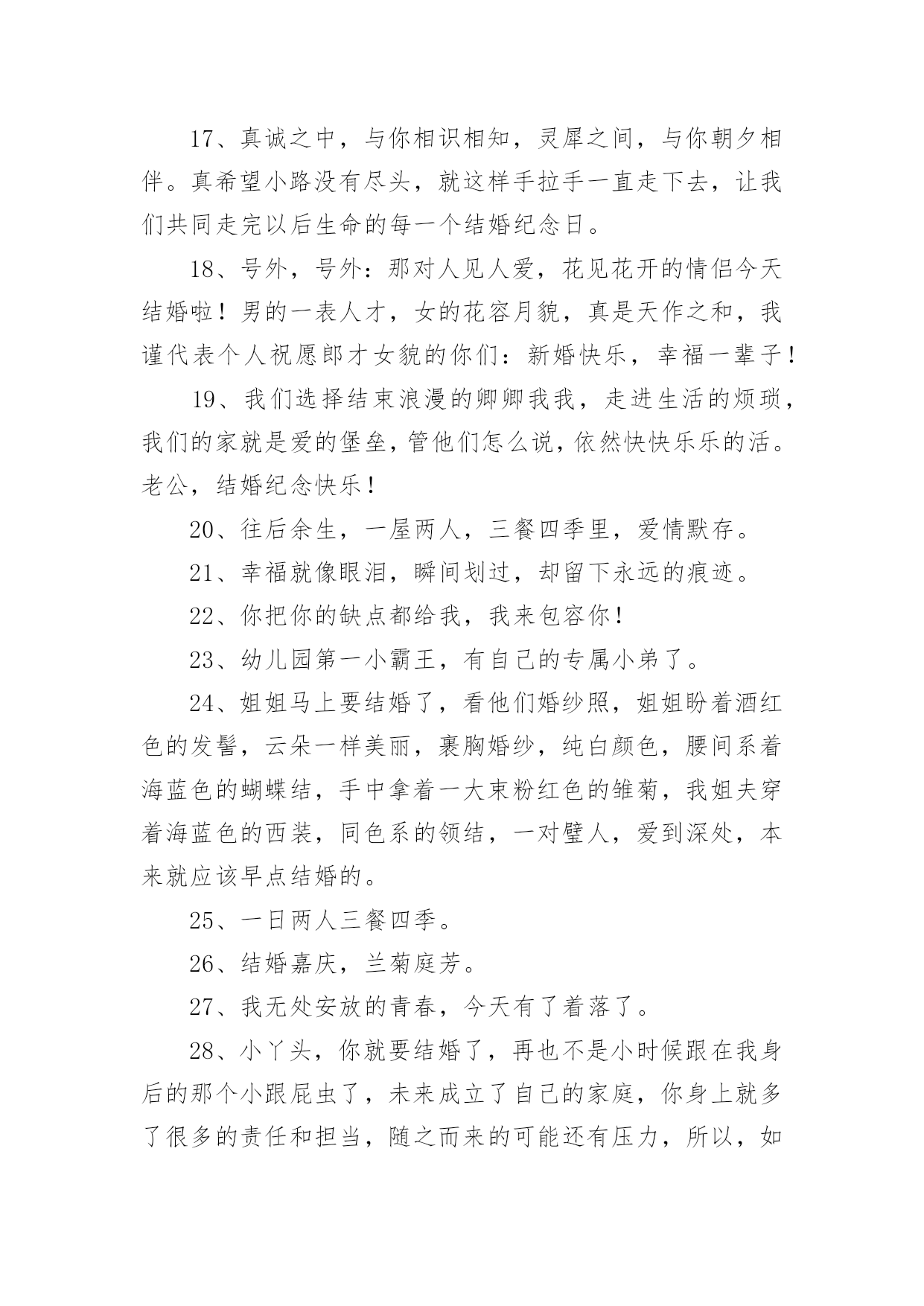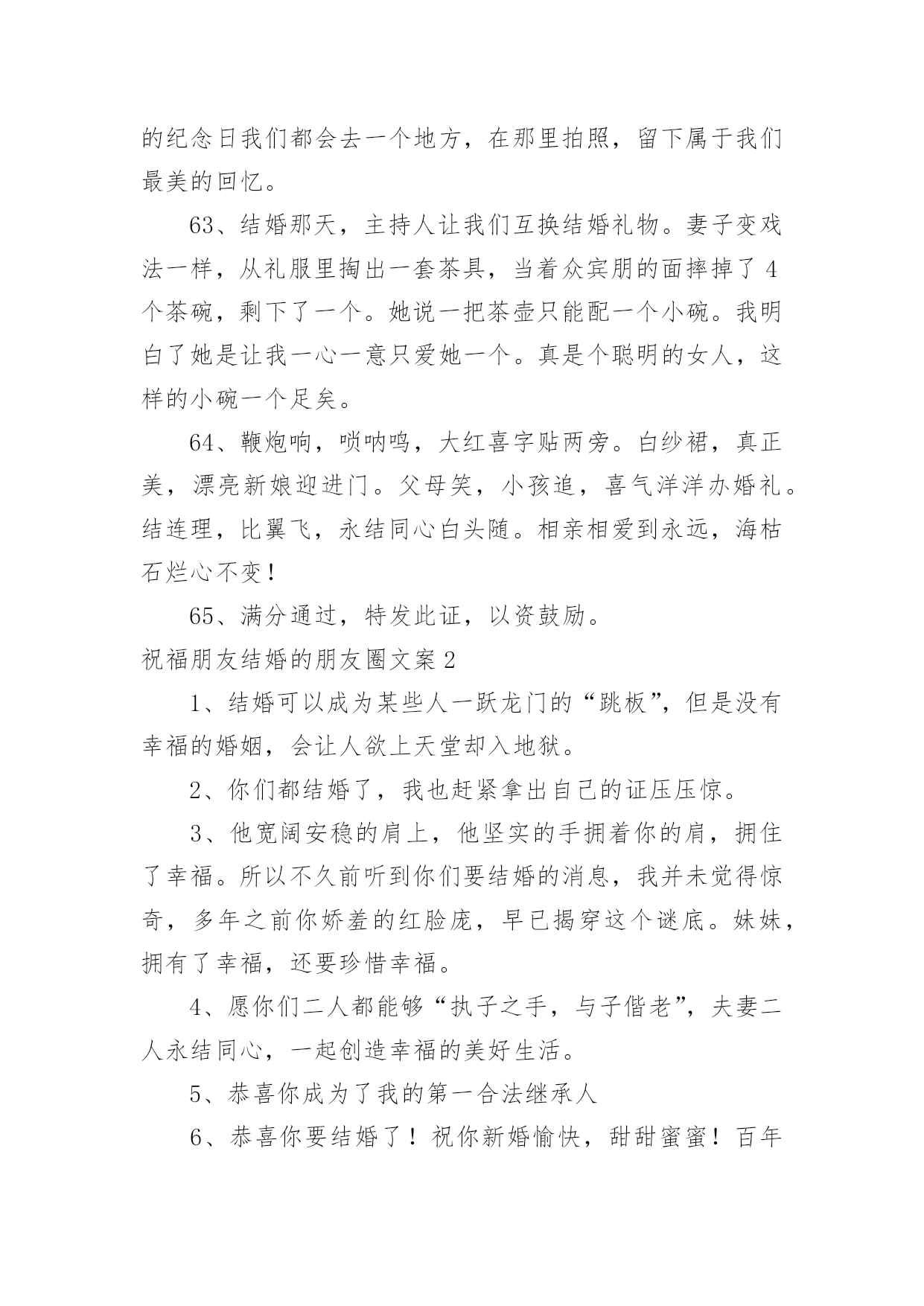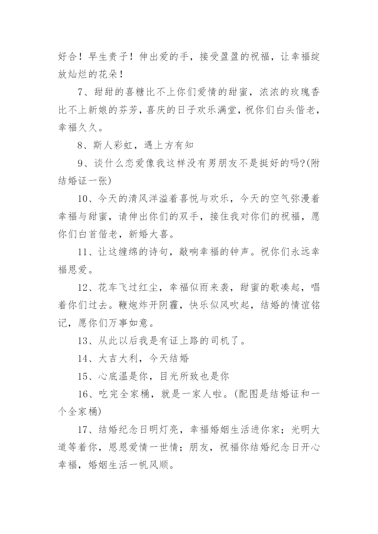 祝福朋友结婚的朋友圈文案祝福朋友结婚的朋友圈文案在平日的学习、工作和生活里,大家都接触过比较经典的文案吧,文案用以分享自己生活中值得纪念的小确幸。你知道什么样的文案才有创意吗?以下是小编整理的祝福朋友结婚的朋友圈文案,仅供参考,欢迎大家阅读。祝福朋友结婚的朋友圈文案11、珠联壁合洞房春暖,花好月圆鱼水情深。2、因为有缘,所以结缘;因为有份,所有不分;因为有爱,所有依赖;因为有情,所以温馨;因为快乐,所以幸福。愿你们牵手人生风雨,永远不离不弃!3、我不是诗人,只是俗人,但是我对你们结婚的恭贺之情却是最真切的,我希望你们能够永浴爱河,早生贵子,幸福白头。4、未来路途遥远,所以我们在一起啦5、爱情就像花一样,有开有结;人生的路就像山路一样,有平有凹;人在结婚那天是最快乐也最是难忘,让我们共同来祝福这对新人吧!祝:新婚快乐、早生贵子。6、用了五年时间,终于将自己给推销出去了。值得祝贺。7、真善美,就是你一直以来的品质;真命天子,会伴着你的一生一世;弟弟,你要结婚了,祝愿你结婚幸福,早日产下真命天子。8、岁月凝眸,让快乐停留,成功牵手,幸福与你共白头,祝新婚快乐百年好合!我不知,满天云彩何处是尽头?我不知,百花怒放娇美能多久?我只知,心跳多久,结婚祝福语就有多久!9、海枯石烂同心永结,地阔天高比翼齐飞。祝你们永结同心,百年好合!结婚纪念日快乐,甜甜蜜蜜!夫妻恩恩爱爱到永远!10、胭正红,脂正浓,风月无边胭脂情。青竹马,白玉马,翩翩公子驾宝马。伊羞赧,郎蜜甜,缠缠绵绵入帷帘。天亦长,地亦久,天长地久共白头。祝:白头到老,百年好合!11、一纸老虎,一米老鼠,点花烛,一起住;一个成了丈夫,一个未来当母,噜噜噜,真幸福!祝小两口结婚快乐乎!12、在生活的路上,一起菜鸟互啄吧。13、结婚是爱情的终点,因为大家都说"婚姻是爱情的坟墓"。可我说结婚是爱情的起点,因为她是“夫妻”爱情“相濡以沫”的开始。14、十二年的婚姻很平淡,但是我们过的很真实,很幸福。15、山水一程,实乃三生有幸。16、我只想好好和一个人一直走下去,不管未来会遇到什么。17、真诚之中,与你相识相知,灵犀之间,与你朝夕相伴。真希望小路没有尽头,就这样手拉手一直走下去,让我们共同走完以后生命的每一个结婚纪念日。18、号外,号外:那对人见人爱,花见花开的情侣今天结婚啦!男的一表人才,女的花容月貌,真是天作之和,我谨代表个人祝愿郎才女貌的你们:新婚快乐,幸福一辈子!19、我们选择结束浪漫的卿卿我我,走进生活的烦琐,我们的家就是爱的堡垒,管他们怎么说,依然快快乐乐的活。老公,结婚纪念快乐!20、往后余生,一屋两人,三餐四季里,爱情默存。21、幸福就像眼泪,瞬间划过,却留下永远的痕迹。22、你把你的缺点都给我,我来包容你!23、幼儿园第一小霸王,有自己的专属小弟了。24、姐姐马上要结婚了,看他们婚纱照,姐姐盼着酒红色的发髻,云朵一样美丽,裹胸婚纱,纯白颜色,腰间系着海蓝色的蝴蝶结,手中拿着一大束粉红色的雏菊,我姐夫穿着海蓝色的西装,同色系的领结,一对璧人,爱到深处,本来就应该早点结婚的。25、一日两人三餐四季。26、结婚嘉庆,兰菊庭芳。27、我无处安放的青春,今天有了着落了。28、小丫头,你就要结婚了,再也不是小时候跟在我身后的那个小跟屁虫了,未来成立了自己的家庭,你身上就多了很多的责任和担当,随之而来的可能还有压力,所以,如果有问题的话,小姨永远是你的知心大姐姐,一定要多联系~29、持证上岗,合法开车。30、笑语笑颜,笑声连连。贺喜贺辞,贺事件件。香烟香酒,香火冉冉。家和家睦,家庭暖暖。新人新婚,新居闪闪。好时好景,好日绵绵。31、点赞的份子钱可打八五折。32、此后上帝归上帝,而我归你。33、千载一时不再来,九天阊阖庆今开,志同道合堪为友,玉骨冰肌岂染埃;两颗丹心同锦织,一支红杏依云栽,良缘夙缔成佳耦,永生福乐主恩培。34、我可以忘记很多事,但是唯有你,是我独家的记忆。35、还单身的喜遇良缘,已结婚的早生贵子,有孩子的搞好计划生育!36、恭喜你要结婚了!祝你新婚愉快,甜甜蜜蜜!百年好合!早生贵子!伸出爱的手,接受盈盈的祝福,让幸福绽放灿烂的花朵!37、祝姐姐姐夫甜甜蜜蜜!早生贵子你们本就是天生一对,地造一双,而今共偕连理,今后更需彼此宽容、互相照顾,祝福你们!38、执子之手,与子偕老,相守一生,不离不弃。39、花开两朵结同心,双潭映月心相印。八方云集上嘉宾,万千宠爱于一身。三声礼炮邀祥云,幸福从此入家门。祝:结婚纪念日快乐!40、甜蜜蜜,祝你甜蜜蜜:爱情甜蜜,相偎相依;情绪甜蜜,快乐随行;生活甜蜜,相互扶持;家庭甜蜜,不离不弃;岁月甜蜜,白首同心。41、单身时,无拘无束,孤独无助!恋爱时,小心呵护,任其摆布!结婚时,不堪重负,钱包卡住!离婚时,没吃没住,只剩内裤!42、心愿是,如初见,不