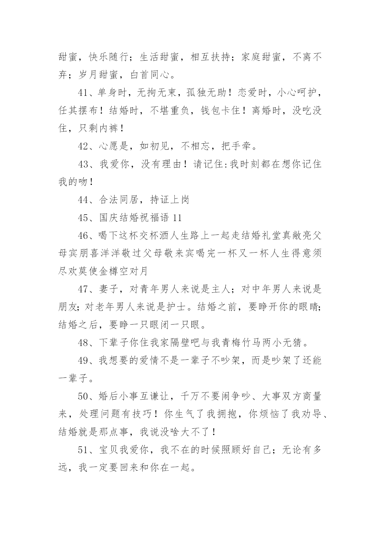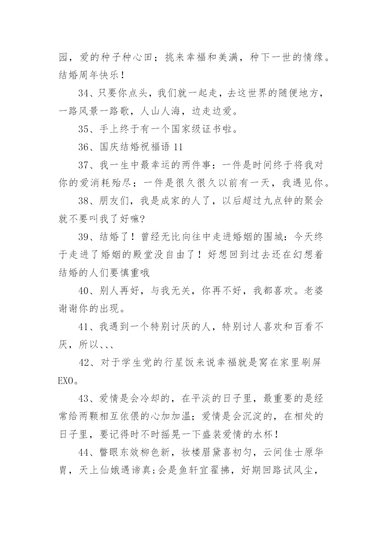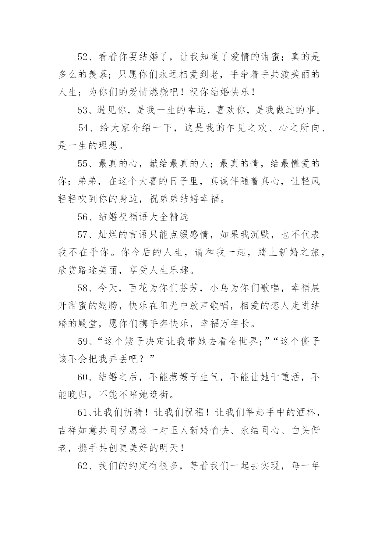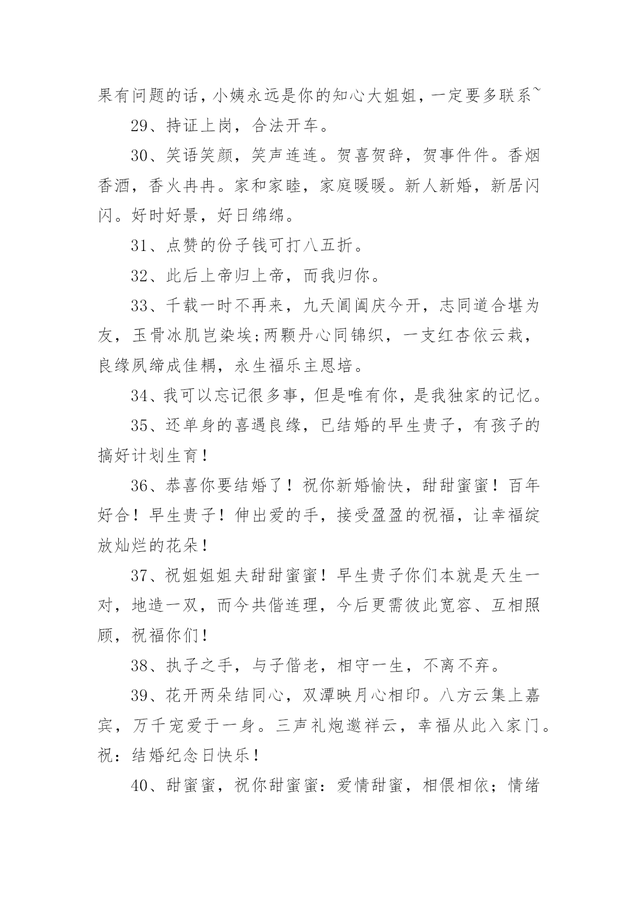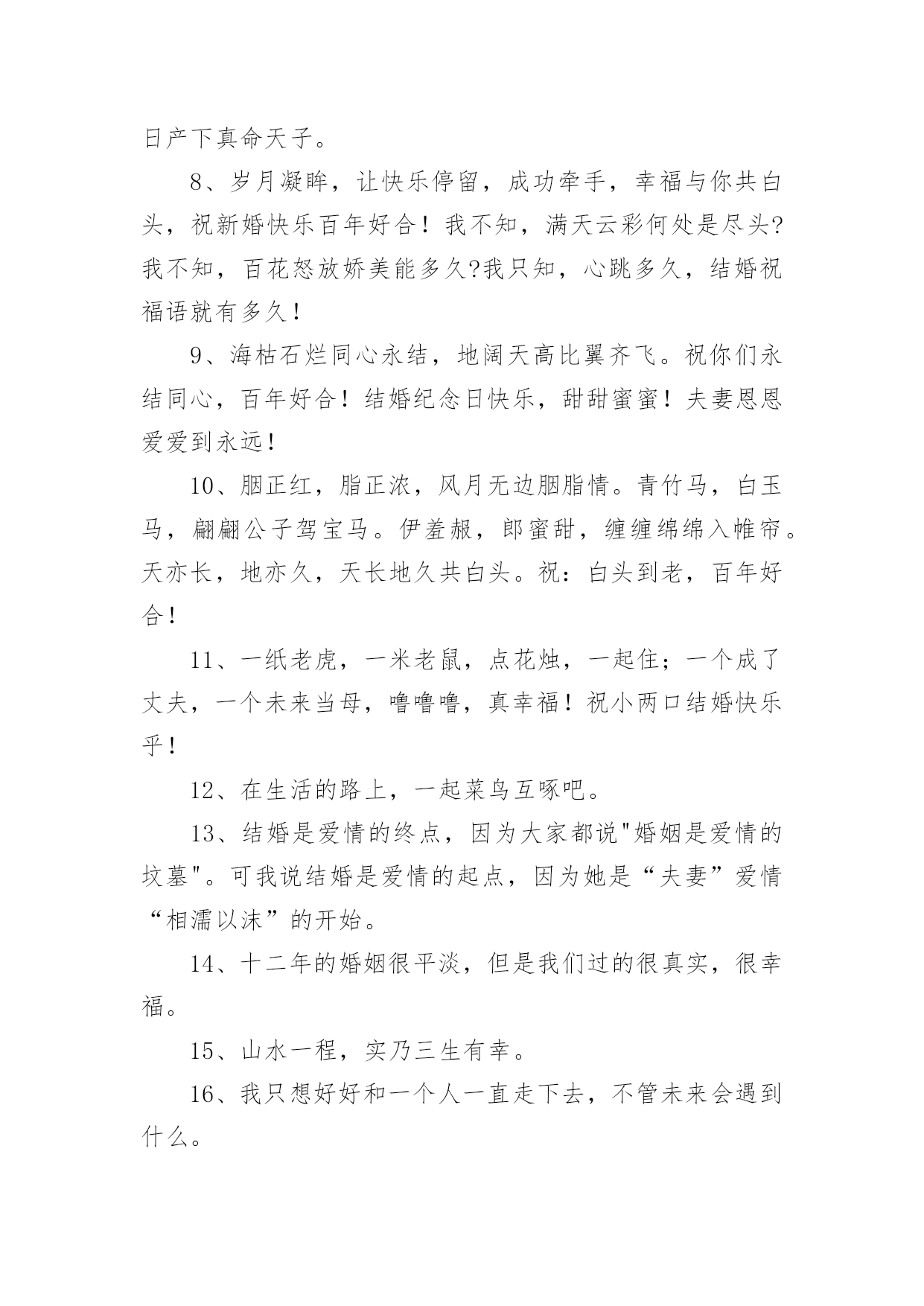 祝福朋友结婚的朋友圈文案祝福朋友结婚的朋友圈文案在平日的学习、工作和生活里,大家都接触过比较经典的文案吧,文案用以分享自己生活中值得纪念的小确幸。你知道什么样的文案才有创意吗?以下是小编整理的祝福朋友结婚的朋友圈文案,仅供参考,欢迎大家阅读。祝福朋友结婚的朋友圈文案11、珠联壁合洞房春暖,花好月圆鱼水情深。2、因为有缘,所以结缘;因为有份,所有不分;因为有爱,所有依赖;因为有情,所以温馨;因为快乐,所以幸福。愿你们牵手人生风雨,永远不离不弃!3、我不是诗人,只是俗人,但是我对你们结婚的恭贺之情却是最真切的,我希望你们能够永浴爱河,早生贵子,幸福白头。4、未来路途遥远,所以我们在一起啦5、爱情就像花一样,有开有结;人生的路就像山路一样,有平有凹;人在结婚那天是最快乐也最是难忘,让我们共同来祝福这对新人吧!祝:新婚快乐、早生贵子。6、用了五年时间,终于将自己给推销出去了。值得祝贺。7、真善美,就是你一直以来的品质;真命天子,会伴着你的一生一世;弟弟,你要结婚了,祝愿你结婚幸福,早日产下真命天子。8、岁月凝眸,让快乐停留,成功牵手,幸福与你共白头,祝新婚快乐百年好合!我不知,满天云彩何处是尽头?我不知,百花怒放娇美能多久?我只知,心跳多久,结婚祝福语就有多久!9、海枯石烂同心永结,地阔天高比翼齐飞。祝你们永结同心,百年好合!结婚纪念日快乐,甜甜蜜蜜!夫妻恩恩爱爱到永远!10、胭正红,脂正浓,风月无边胭脂情。青竹马,白玉马,翩翩公子驾宝马。伊羞赧,郎蜜甜,缠缠绵绵入帷帘。天亦长,地亦久,天长地久共白头。祝:白头到老,百年好合!11、一纸老虎,一米老鼠,点花烛,一起住;一个成了丈夫,一个未来当母,噜噜噜,真幸福!祝小两口结婚快乐乎!12、在生活的路上,一起菜鸟互啄吧。13、结婚是爱情的终点,因为大家都说"婚姻是爱情的坟墓"。可我说结婚是爱情的起点,因为她是“夫妻”爱情“相濡以沫”的开始。14、十二年的婚姻很平淡,但是我们过的很真实,很幸福。15、山水一程,实乃三生有幸。16、我只想好好和一个人一直走下去,不管未来会遇到什么。17、真诚之中,与你相识相知,灵犀之间,与你朝夕相伴。真希望小路没有尽头,就这样手拉手一直走下去,让我们共同走完以后生命的每一个结婚纪念日。18、号外,号外:那对人见人爱,花见花开的情侣今天结婚啦!男的一表人才,女的花容月貌,真是天作之和,我谨代表个人祝愿郎才女貌的你们:新婚快乐,幸福一辈子!19、我们选择结束浪漫的卿卿我我,走进生活的烦琐,我们的家就是爱的堡垒,管他们怎么说,依然快快乐乐的活。老公,结婚纪念快乐!20、往后余生,一屋两人,三餐四季里,爱情默存。21、幸福就像眼泪,瞬间划过,却留下永远的痕迹。22、你把你的缺点都给我,我来包容你!23、幼儿园第一小霸王,有自己的专属小弟了。24、姐姐马上要结婚了,看他们婚纱照,姐姐盼着酒红色的发髻,云朵一样美丽,裹胸婚纱,纯白颜色,腰间系着海蓝色的蝴蝶结,手中拿着一大束粉红色的雏菊,我姐夫穿着海蓝色的西装,同色系的领结,一对璧人,爱到深处,本来就应该早点结婚的。25、一日两人三餐四季。26、结婚嘉庆,兰菊庭芳。27、我无处安放的青春,今天有了着落了。28、小丫头,你就要结婚了,再也不是小时候跟在我身后的那个小跟屁虫了,未来成立了自己的家庭,你身上就多了很多的责任和担当,随之而来的可能还有压力,所以,如果有问题的话,小姨永远是你的知心大姐姐,一定要多联系~29、持证上岗,合法开车。30、笑语笑颜,笑声连连。贺喜贺辞,贺事件件。香烟香酒,香火冉冉。家和家睦,家庭暖暖。新人新婚,新居闪闪。好时好景,好日绵绵。31、点赞的份子钱可打八五折。32、此后上帝归上帝,而我归你。33、千载一时不再来,九天阊阖庆今开,志同道合堪为友,玉骨冰肌岂染埃;两颗丹心同锦织,一支红杏依云栽,良缘夙缔成佳耦,永生福乐主恩培。34、我可以忘记很多事,但是唯有你,是我独家的记忆。35、还单身的喜遇良缘,已结婚的早生贵子,有孩子的搞好计划生育!36、恭喜你要结婚了!祝你新婚愉快,甜甜蜜蜜!百年好合!早生贵子!伸出爱的手,接受盈盈的祝福,让幸福绽放灿烂的花朵!37、祝姐姐姐夫甜甜蜜蜜!早生贵子你们本就是天生一对,地造一双,而今共偕连理,今后更需彼此宽容、互相照顾,祝福你们!38、执子之手,与子偕老,相守一生,不离不弃。39、花开两朵结同心,双潭映月心相印。八方云集上嘉宾,万千宠爱于一身。三声礼炮邀祥云,幸福从此入家门。祝:结婚纪念日快乐!40、甜蜜蜜,祝你甜蜜蜜:爱情甜蜜,相偎相依;情绪甜蜜,快乐随行;生活甜蜜,相互扶持;家庭甜蜜,不离不弃;岁月甜蜜,白首同心。41、单身时,无拘无束,孤独无助!恋爱时,小心呵护,任其摆布!结婚时,不堪重负,钱包卡住!离婚时,没吃没住,只剩内裤!42、心愿是,如初见,不