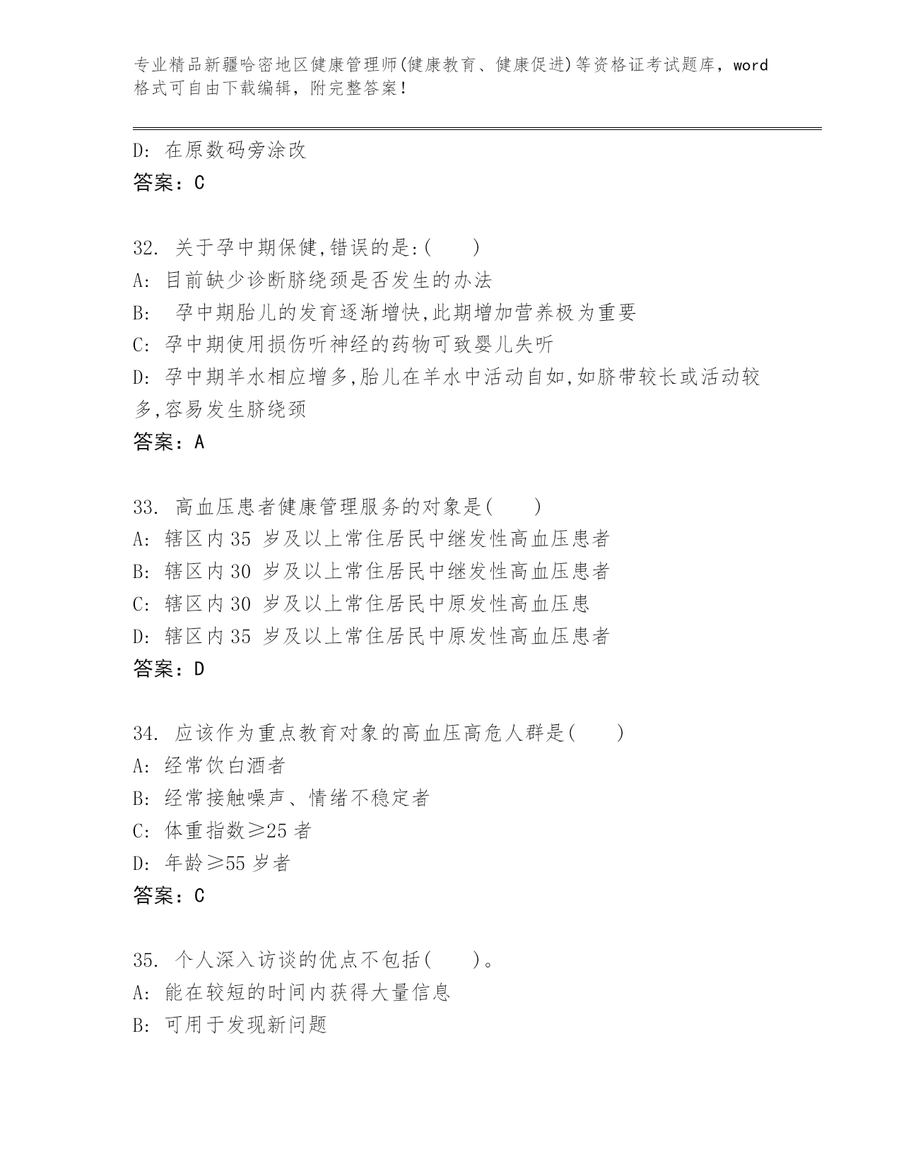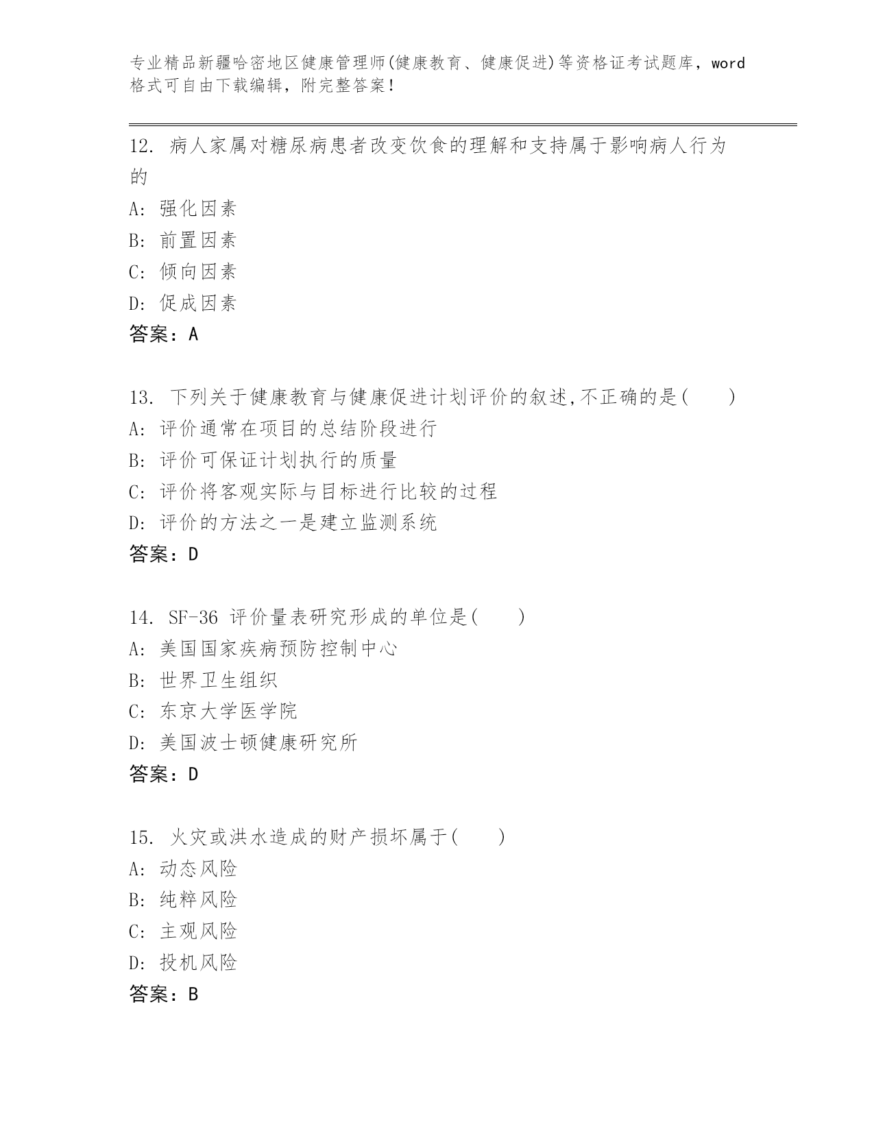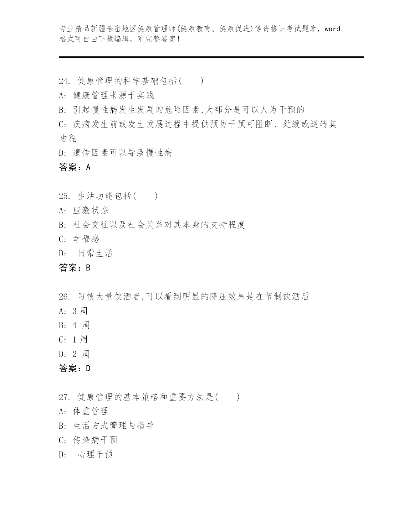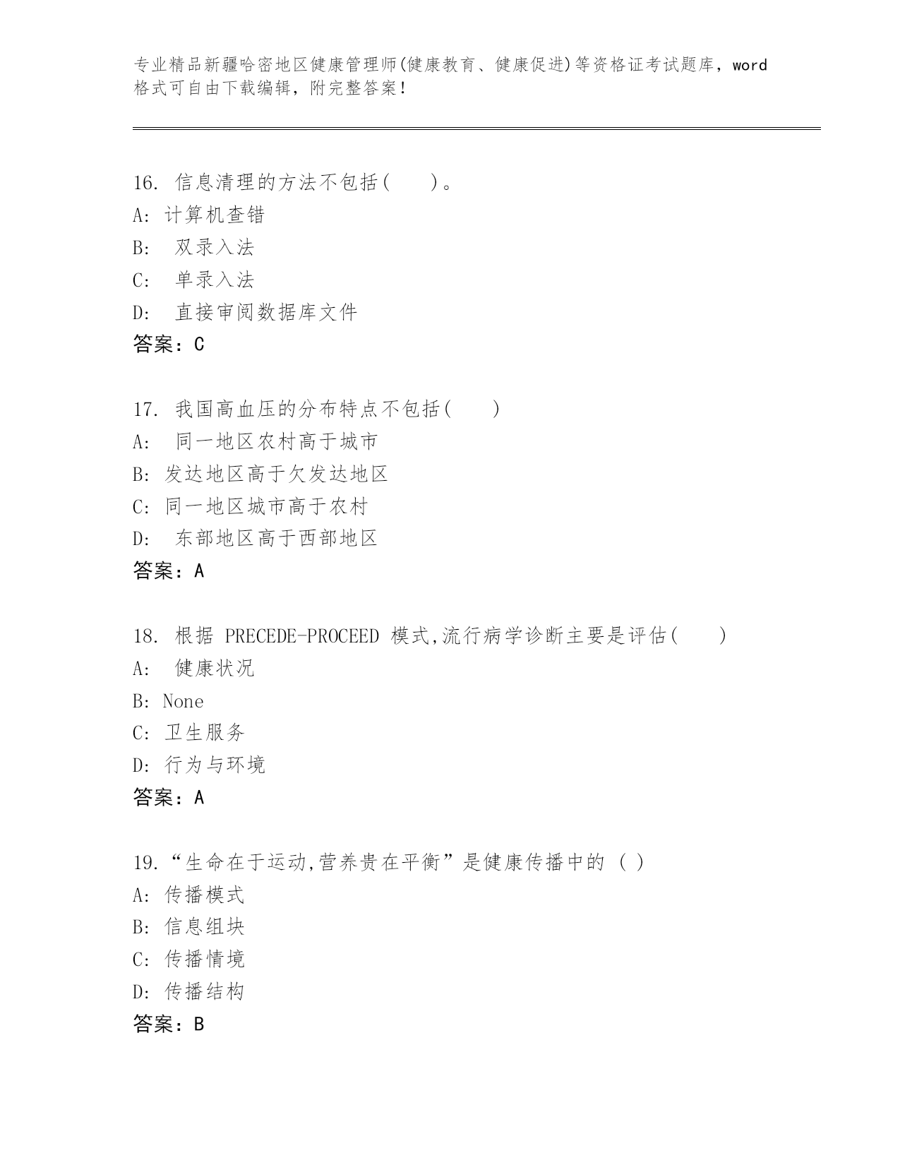 精品新疆哈密地区健康管理师(健康教育、健康促进)等资格证考试内部题库及参考答案(最新)