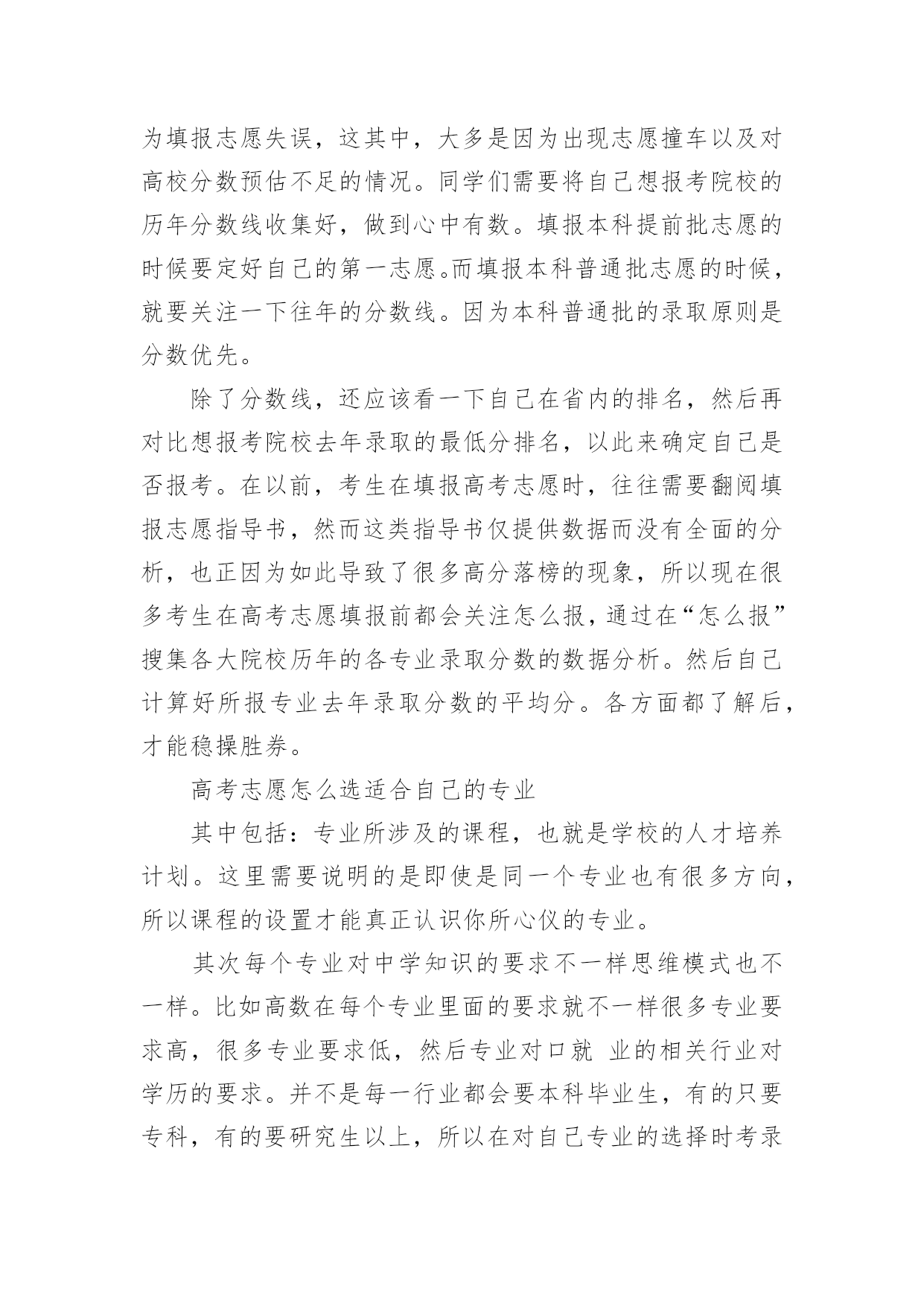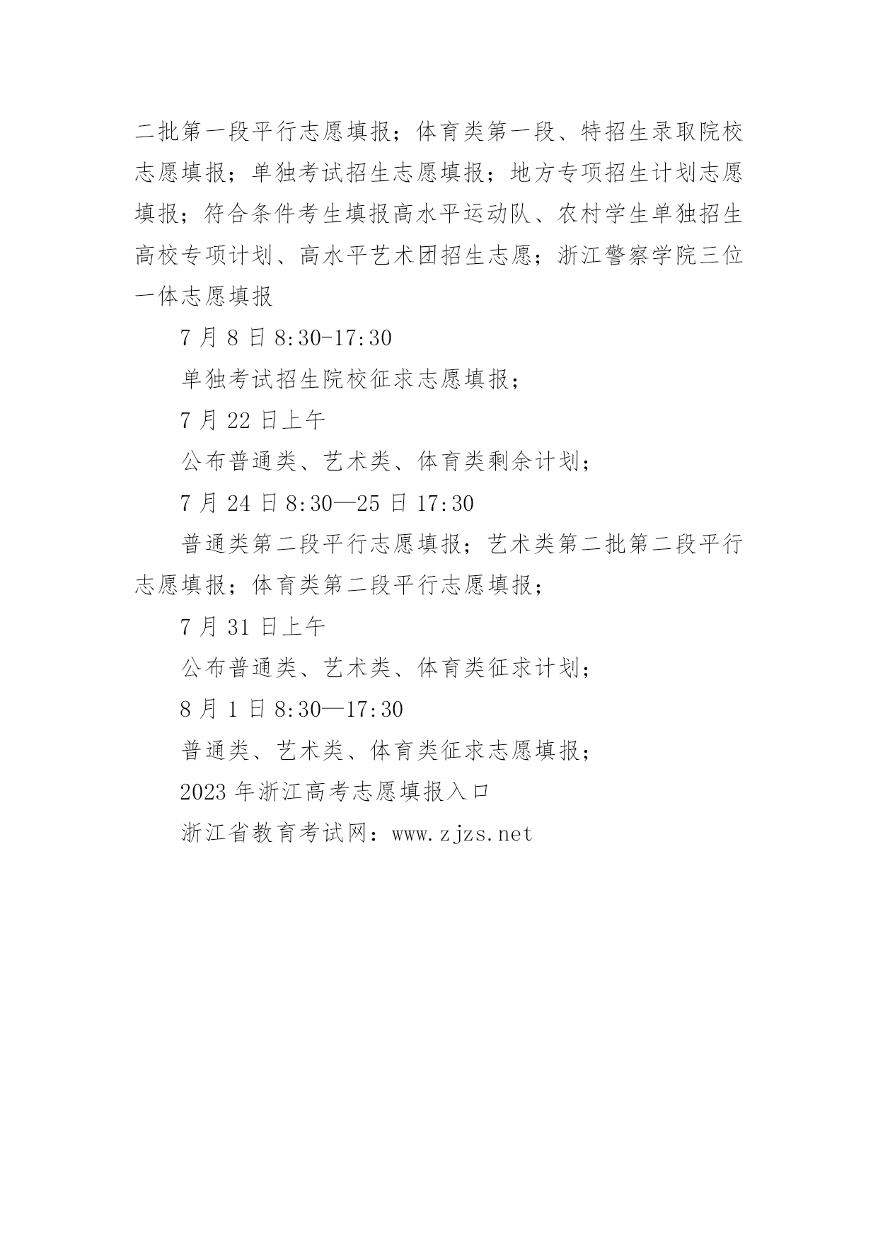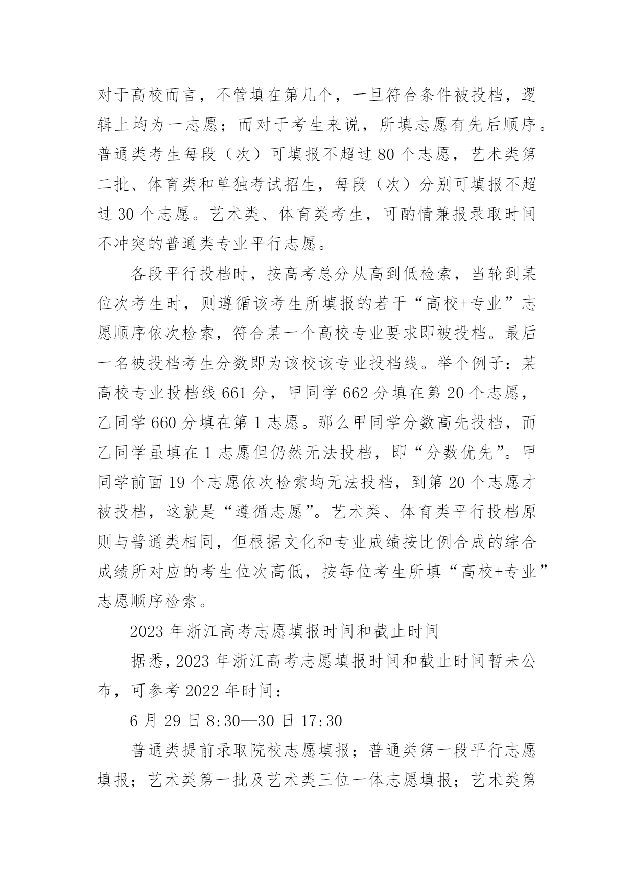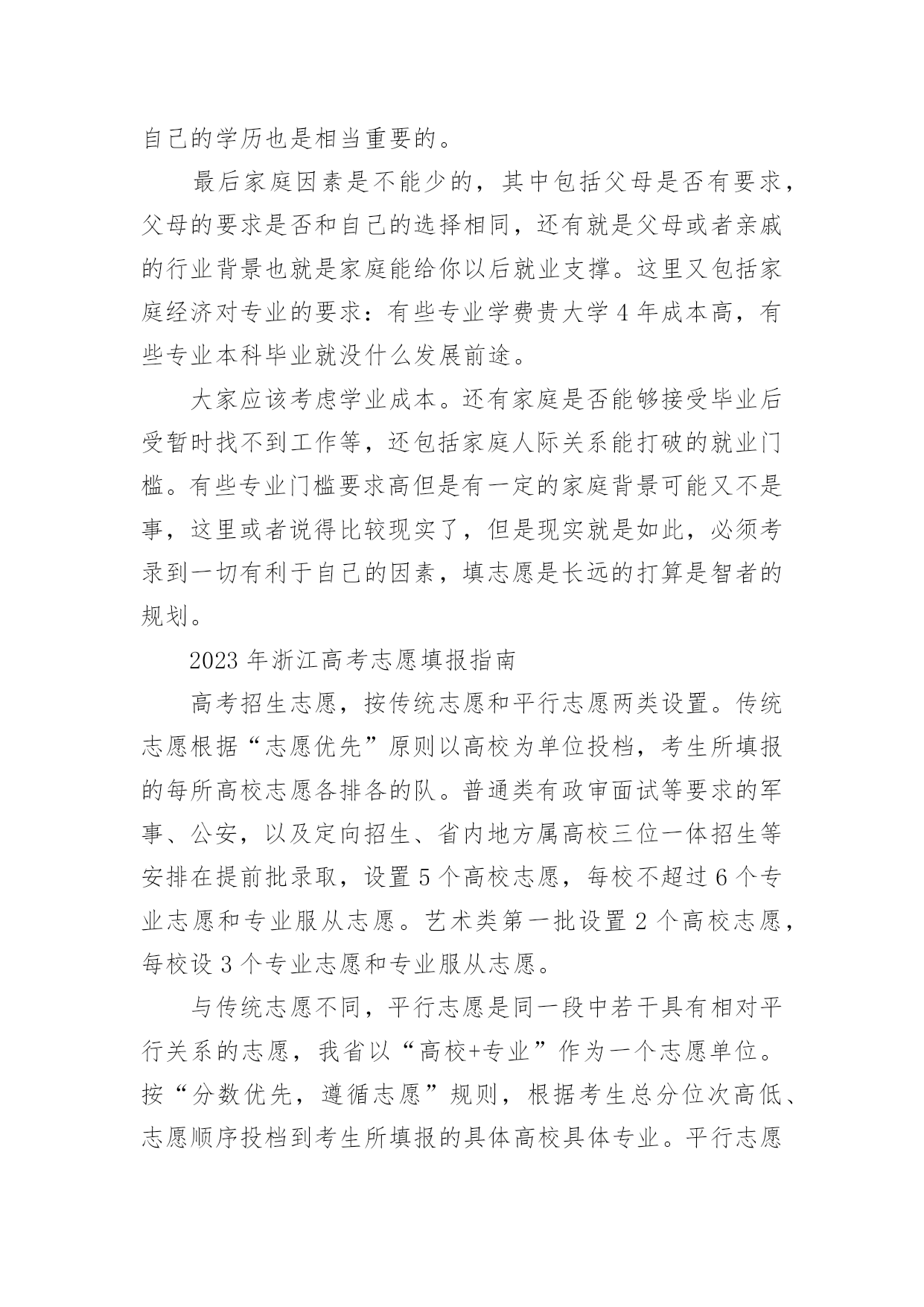 浙江高考志愿填报指南浙江高考志愿填报指南又到了大学新生该选专业的时候啦,怎么才能从成百上千的专业中选择适合自己的呢?高考志愿怎么填呢?下面是小编准备的浙江高考志愿填报指南有关资料,仅供大家参考!浙江高考志愿填报指南志愿填报:兴趣为王,专业优先选择专业重要的还是看自己的兴趣,不要因为当下什么专业比较火热、就业前景看似比较好,而选择一个考生自己压根就不感兴趣的专业。毕竟今天的热门可能是明天冷门,只要能够选择自己喜欢的专业,努力学习将来也必然会大有成就,大学生活很珍贵,你一定要选择一个比较喜欢的专业来充实自己的头脑。有的本科院校里的某个专业分数线并不低,因为这个专业可能是这所学校的王牌专业,是同类学校中的佼佼者。这个专业的毕业生,在毕业的时候会很吃香。如果这所学校的综合情况并不是很好,但是我们还是可以就读于这所学校。但是并不是说你可以完全就凭借自己的意志来随便选择专业,因为毕竟本科生现在已经不稀缺了。同学们在填报志愿的时候,最好将兴趣和前途联系到一起。在选择面前,适合自己的终究是最好的。志愿填报:参考历年分数线,尽量服从调剂据统计数据显示,每年落榜的考生中,有46%的考生因为填报志愿失误,这其中,大多是因为出现志愿撞车以及对高校分数预估不足的情况。同学们需要将自己想报考院校的历年分数线收集好,做到心中有数。填报本科提前批志愿的时候要定好自己的第一志愿。而填报本科普通批志愿的时候,就要关注一下往年的分数线。因为本科普通批的录取原则是分数优先。除了分数线,还应该看一下自己在省内的排名,然后再对比想报考院校去年录取的最低分排名,以此来确定自己是否报考。在以前,考生在填报高考志愿时,往往需要翻阅填报志愿指导书,然而这类指导书仅提供数据而没有全面的分析,也正因为如此导致了很多高分落榜的现象,所以现在很多考生在高考志愿填报前都会关注怎么报,通过在“怎么报”搜集各大院校历年的各专业录取分数的数据分析。然后自己计算好所报专业去年录取分数的平均分。各方面都了解后,才能稳操胜券。高考志愿怎么选适合自己的专业其中包括:专业所涉及的课程,也就是学校的人才培养计划。这里需要说明的是即使是同一个专业也有很多方向,所以课程的设置才能真正认识你所心仪的专业。其次每个专业对中学知识的要求不一样思维模式也不一样。比如高数在每个专业里面的要求就不一样很多专业要求高,很多专业要求低,然后专业对口就业的相关行业对学历的要求。并不是每一行业都会要本科毕业生,有的只要专科,有的要研究生以上,所以在对自己专业的选择时考录自己的学历也是相当重要的。最后家庭因素是不能少的,其中包括父母是否有要求,父母的要求是否和自己的选择相同,还有就是父母或者亲戚的行业背景也就是家庭能给你以后就业支撑。这里又包括家庭经济对专业的要求:有些专业学费贵大学4年成本高,有些专业本科毕业就没什么发展前途。大家应该考虑学业成本。还有家庭是否能够接受毕业后受暂时找不到工作等,还包括家庭人际关系能打破的就业门槛。有些专业门槛要求高但是有一定的家庭背景可能又不是事,这里或者说得比较现实了,但是现实就是如此,必须考录到一切有利于自己的因素,填志愿是长远的打算是智者的规划。2023年浙江高考志愿填报指南高考招生志愿,按传统志愿和平行志愿两类设置。传统志愿根据“志愿优先”原则以高校为单位投档,考生所填报的每所高校志愿各排各的队。普通类有政审面试等要求的军事、公安,以及定向招生、省内地方属高校三位一体招生等安排在提前批录取,设置5个高校志愿,每校不超过6个专业志愿和专业服从志愿。艺术类第一批设置2个高校志愿,每校设3个专业志愿和专业服从志愿。与传统志愿不同,平行志愿是同一段中若干具有相对平行关系的志愿,我省以“高校+专业”作为一个志愿单位。按“分数优先,遵循志愿”规则,根据考生总分位次高低、志愿顺序投档到考生所填报的具体高校具体专业。平行志愿对于高校而言,不管填在第几个,一旦符合条件被投档,逻辑上均为一志愿;而对于考生来说,所填志愿有先后顺序。普通类考生每段(次)可填报不超过80个志愿,艺术类第二批、体育类和单独考试招生,每段(次)分别可填报不超过30个志愿。艺术类、体育类考生,可酌情兼报录取时间不冲突的普通类专业平行志愿。各段平行投档时,按高考总分从高到低检索,当轮到某位次考生时,则遵循该考生所填报的若干“高校+专业”志愿顺序依次检索,符合某一个高校专业要求即被投档。最后一名被投档考生分数即为该校该专业投档线。举个例子:某高校专业投档线661分,甲同学662分填在第20个志愿,乙同学660分填在第1志愿。那么甲同学分数高先投档,而乙同学虽填在1志愿但仍然无法投档,即“分数优先”。甲同学前面19个志愿依次检索均无法投档,到第20个志愿才被投档,这就是“遵循志愿”。艺术类、体育类平行投档原则与普通类相同,但根据文化和专业