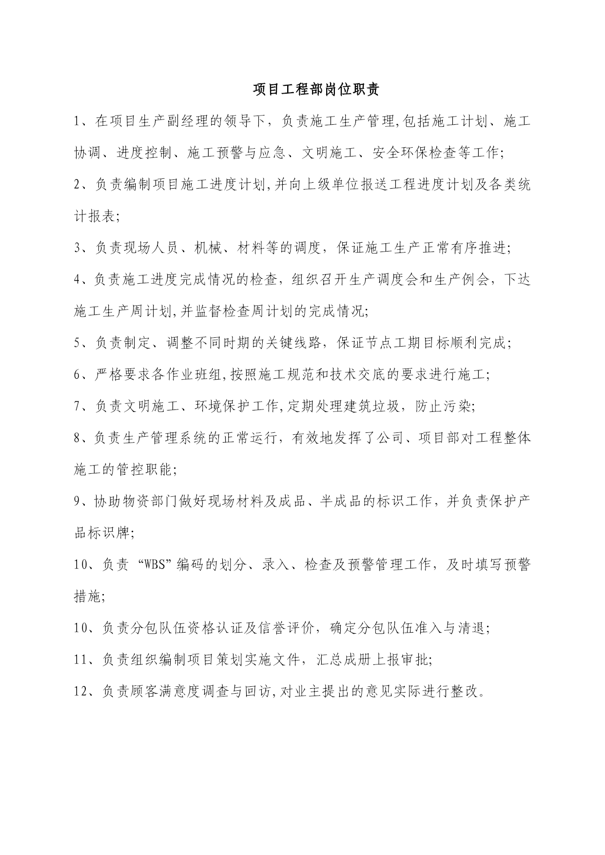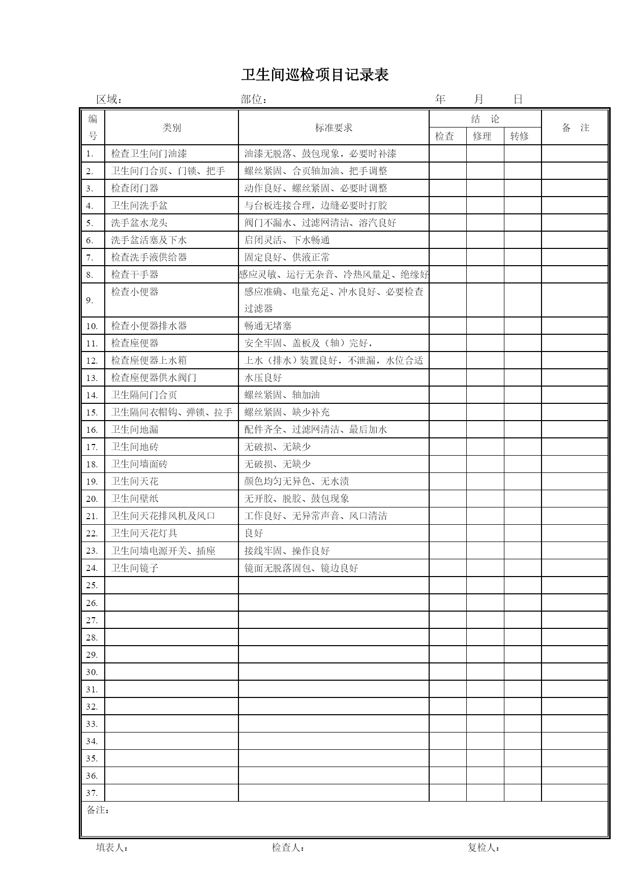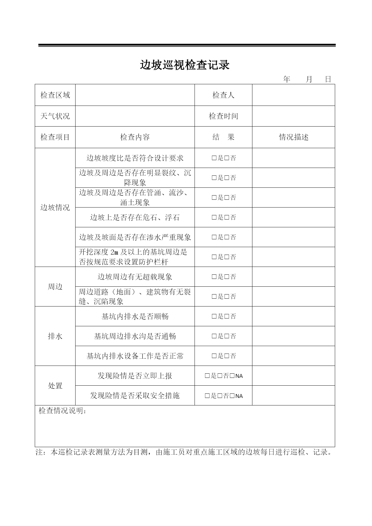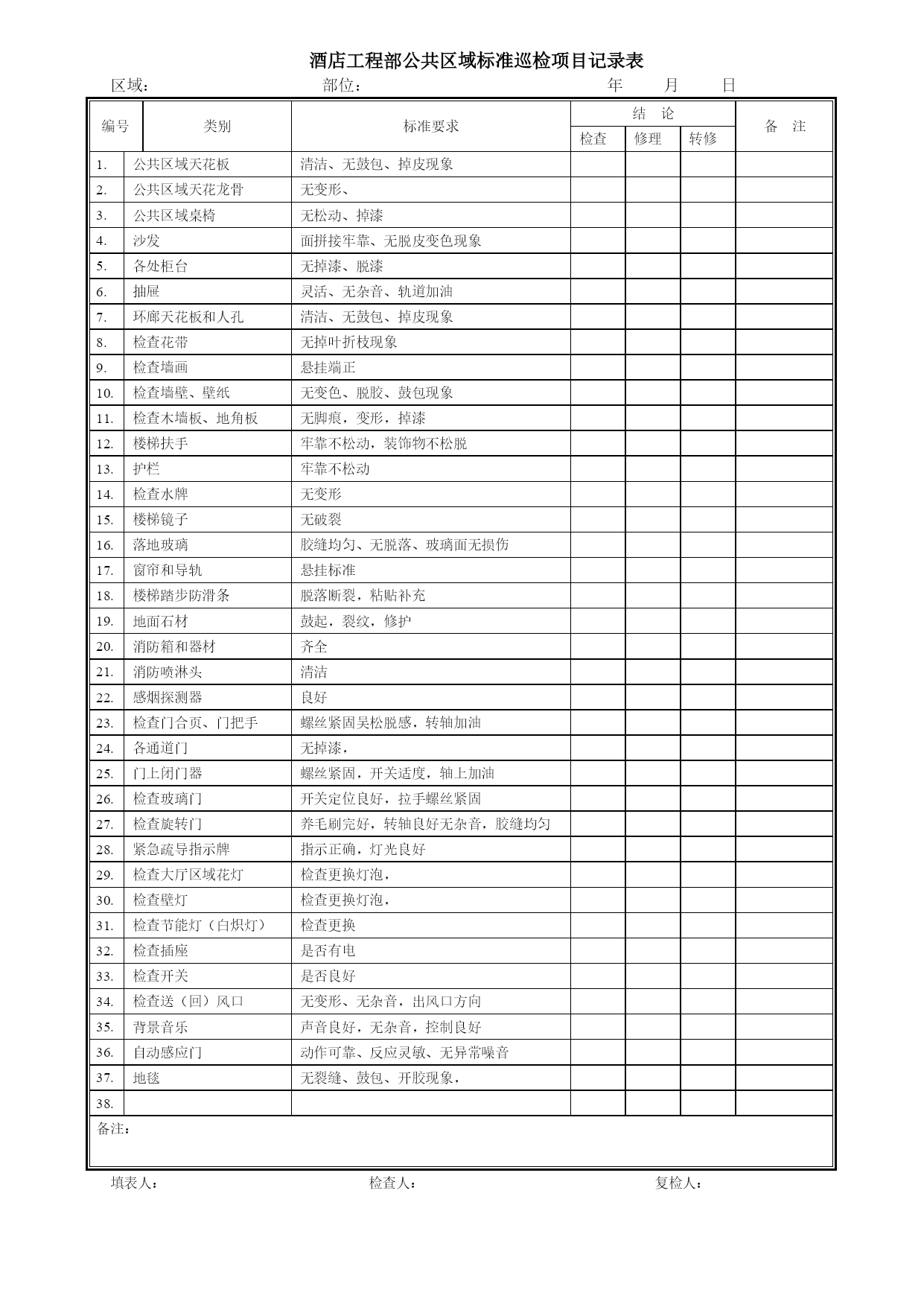 酒店工程部公共区域标准巡检项目记录表优质资料(可以直接使用,可编辑优质资料,欢迎下载)酒店工程部公共区域标准巡检项目记录表区域:部位:年月日编号类别标准要求结论备注检查修理转修公共区域天花板清洁、无鼓包、掉皮现象公共区域天花龙骨无变形、公共区域桌椅无松动、掉漆沙发面拼接牢靠、无脱皮变色现象各处柜台无掉漆、脱漆抽屉灵活、无杂音、轨道加油环廊天花板和人孔清洁、无鼓包、掉皮现象检查花带无掉叶折枝现象检查墙画悬挂端正检查墙壁、壁纸无变色、脱胶、鼓包现象检查木墙板、地角板无脚痕,变形,掉漆楼梯扶手牢靠不松动,装饰物不松脱护栏牢靠不松动检查水牌无变形楼梯镜子无破裂落地玻璃胶缝均匀、无脱落、玻璃面无损伤窗帘和导轨悬挂标准楼梯踏步防滑条脱落断裂,粘贴补充地面石材鼓起,裂纹,修护消防箱和器材齐全消防喷淋头清洁感烟探测器良好检查门合页、门把手螺丝紧固吴松脱感,转轴加油各通道门无掉漆,门上闭门器螺丝紧固,开关适度,轴上加油检查玻璃门开关定位良好,拉手螺丝紧固检查旋转门养毛刷完好,转轴良好无杂音,胶缝均匀紧急疏导指示牌指示正确,灯光良好检查大厅区域花灯检查更换灯泡,检查壁灯检查更换灯泡,检查节能灯(白炽灯)检查更换检查插座是否有电检查开关是否良好检查送(回)风口无变形、无杂音,出风口方向背景音乐声音良好,无杂音,控制良好自动感应门动作可靠、反应灵敏、无异常噪音地毯无裂缝、鼓包、开胶现象,备注:填表人:检查人:复检人:卫生间巡检项目记录表区域:部位:年月日编号类别标准要求结论备注检查修理转修检查卫生间门油漆油漆无脱落、鼓包现象,必要时补漆卫生间门合页、门锁、把手螺丝紧固、合页轴加油、把手调整检查闭门器动作良好、螺丝紧固、必要时调整卫生间洗手盆与台板连接合理,边缝必要时打胶洗手盆水龙头阀门不漏水、过滤网清洁、溶汽良好洗手盆活塞及下水启闭灵活、下水畅通检查洗手液供给器固定良好、供液正常检查干手器感应灵敏、运行无杂音、冷热风量足、绝缘好检查小便器感应准确、电量充足、冲水良好、必要检查过滤器检查小便器排水器畅通无堵塞检查座便器安全牢固、盖板及(轴)完好,检查座便器上水箱上水(排水)装置良好,不泄漏,水位合适检查座便器供水阀门水压良好卫生隔间门合页螺丝紧固、轴加油卫生隔间衣帽钩、弹锁、拉手螺丝紧固、缺少补充卫生间地漏配件齐全、过滤网清洁、最后加水卫生间地砖无破损、无缺少卫生间墙面砖无破损、无缺少卫生间天花颜色均匀无异色、无水渍卫生间壁纸无开胶、脱胶、鼓包现象卫生间天花排风机及风口工作良好、无异常声音、风口清洁卫生间天花灯具良好卫生间墙电源开关、插座接线牢固、操作良好卫生间镜子镜面无脱落固包、镜边良好备注:填表人:检查人:复检人:边坡巡视检查记录年月日检查区域检查人天气状况检查时间检查项目检查内容结果情况描述边坡情况边坡坡度比是否符合设计要求□是□否边坡及周边是否存在明显裂纹、沉降现象□是□否边坡及周边是否存在管涌、流沙、涌土现象□是□否边坡上是否存在危石、浮石□是□否边坡及坡面是否存在渗水严重现象□是□否开挖深度2m及以上的基坑周边是否按规范要求设置防护栏杆□是□否周边边坡周边有无超载现象□是□否周边道路(地面)、建筑物有无裂缝、沉陷现象□是□否排水基坑内排水是否顺畅□是□否基坑周边排水沟是否通畅□是□否基坑内排水设备工作是否正常□是□否处置发现险情是否立即上报□是□否□NA发现险情是否采取安全措施□是□否□NA检查情况说明:注:本巡检记录表测量方法为目测,由施工员对重点施工区域的边坡每日进行巡检、记录。边坡水平位移和竖向位移监测月报表(区域)监测月报表第页共页第次工程名称:报表编号:天气:观测者:计算者:测试日期:点号水平位移量/mm备注竖向位移量/mm备注本次测试值单次变化累计变化量变化速率本次测试值单次变化累计变化量变化速率D1D2D3D4D5A1A2A3A4说明测点布置示意图详见附图工况安装完毕监测人:注:应视工程及测点变形情况,定期(每月)观测并绘制测点的数据变化曲线图。如观察发现裂纹或明显移位现场立即进行观测。项目工程部岗位职责1、在项目生产副经理的领导下,负责施工生产管理,包括施工计划、施工协调、进度控制、施工预警与应急、文明施工、安全环保检查等工作;2、负责编制项目施工进度计划,并向上级单位报送工程进度计划及各类统计报表;3、负责现场人员、机械、材料等的调度,保证施工生产正常有序推进;4、负责施工进度完成情况的检查,组织召开生产调度会和生产例会,下达施工生产周计划,并监督检查周计划的完成情况;5、负责制定、调整不同时期的关键线路,保证节点工期目标顺利完成;6、严格要求各作业班组,按照施工规范和技术交底的要求进行施工;7、负责文明施工、环境保护工作,定期处理建筑垃圾,防止污染;8、负责生产管理系统的正常运
