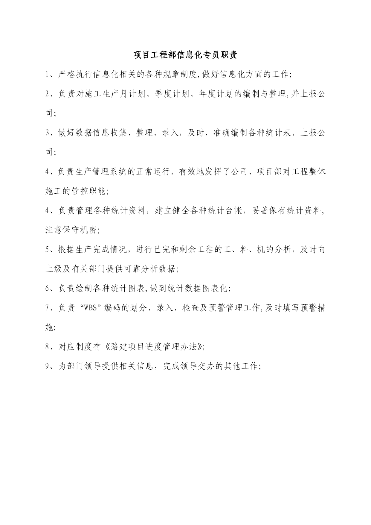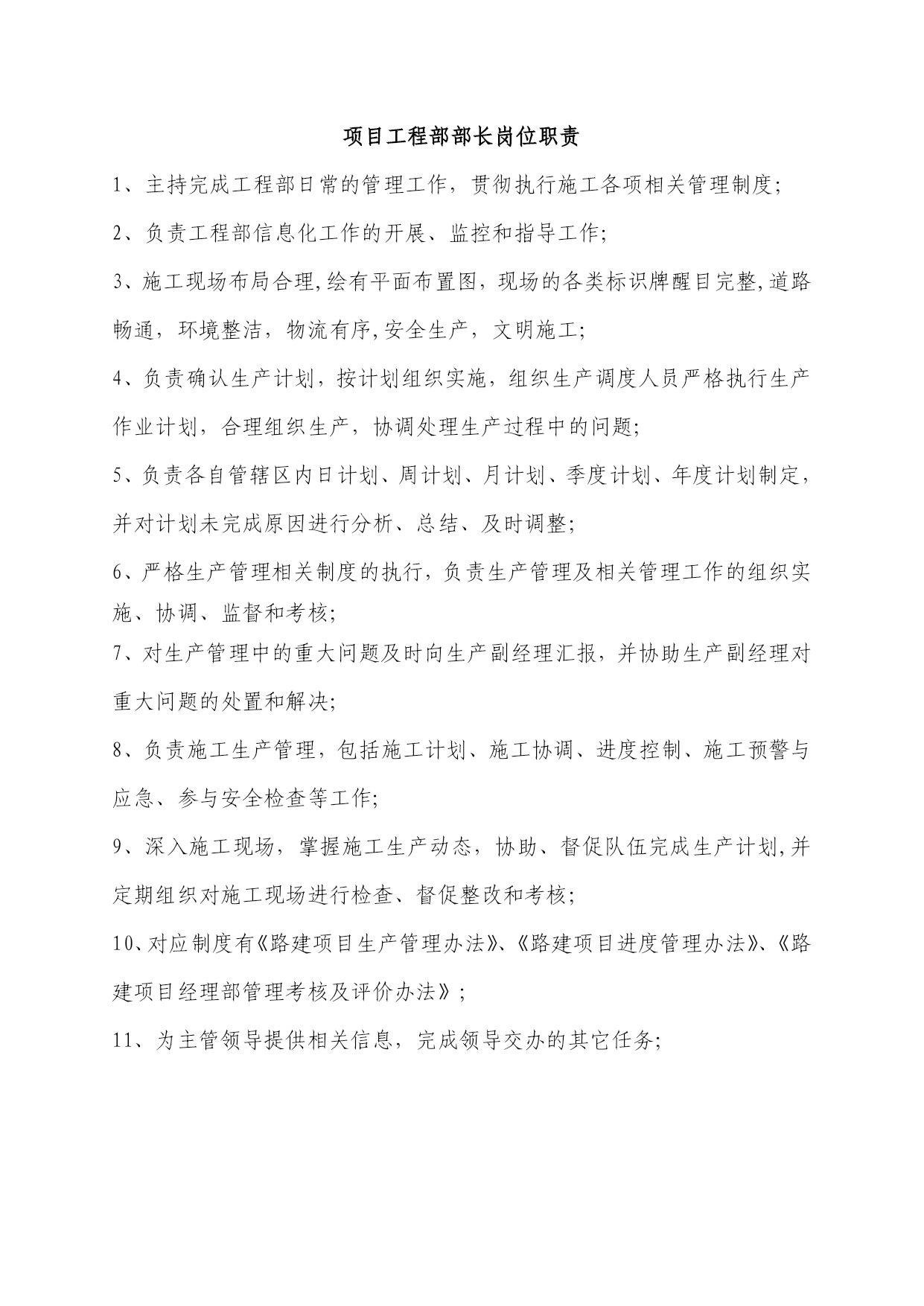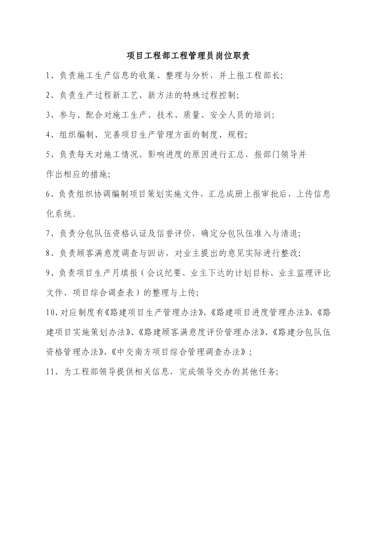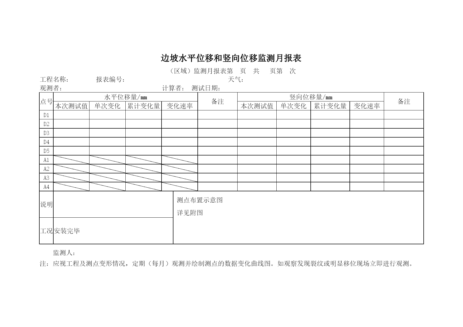 酒店工程部公共区域标准巡检项目记录表优质资料(可以直接使用,可编辑优质资料,欢迎下载)酒店工程部公共区域标准巡检项目记录表区域:部位:年月日编号类别标准要求结论备注检查修理转修公共区域天花板清洁、无鼓包、掉皮现象公共区域天花龙骨无变形、公共区域桌椅无松动、掉漆沙发面拼接牢靠、无脱皮变色现象各处柜台无掉漆、脱漆抽屉灵活、无杂音、轨道加油环廊天花板和人孔清洁、无鼓包、掉皮现象检查花带无掉叶折枝现象检查墙画悬挂端正检查墙壁、壁纸无变色、脱胶、鼓包现象检查木墙板、地角板无脚痕,变形,掉漆楼梯扶手牢靠不松动,装饰物不松脱护栏牢靠不松动检查水牌无变形楼梯镜子无破裂落地玻璃胶缝均匀、无脱落、玻璃面无损伤窗帘和导轨悬挂标准楼梯踏步防滑条脱落断裂,粘贴补充地面石材鼓起,裂纹,修护消防箱和器材齐全消防喷淋头清洁感烟探测器良好检查门合页、门把手螺丝紧固吴松脱感,转轴加油各通道门无掉漆,门上闭门器螺丝紧固,开关适度,轴上加油检查玻璃门开关定位良好,拉手螺丝紧固检查旋转门养毛刷完好,转轴良好无杂音,胶缝均匀紧急疏导指示牌指示正确,灯光良好检查大厅区域花灯检查更换灯泡,检查壁灯检查更换灯泡,检查节能灯(白炽灯)检查更换检查插座是否有电检查开关是否良好检查送(回)风口无变形、无杂音,出风口方向背景音乐声音良好,无杂音,控制良好自动感应门动作可靠、反应灵敏、无异常噪音地毯无裂缝、鼓包、开胶现象,备注:填表人:检查人:复检人:卫生间巡检项目记录表区域:部位:年月日编号类别标准要求结论备注检查修理转修检查卫生间门油漆油漆无脱落、鼓包现象,必要时补漆卫生间门合页、门锁、把手螺丝紧固、合页轴加油、把手调整检查闭门器动作良好、螺丝紧固、必要时调整卫生间洗手盆与台板连接合理,边缝必要时打胶洗手盆水龙头阀门不漏水、过滤网清洁、溶汽良好洗手盆活塞及下水启闭灵活、下水畅通检查洗手液供给器固定良好、供液正常检查干手器感应灵敏、运行无杂音、冷热风量足、绝缘好检查小便器感应准确、电量充足、冲水良好、必要检查过滤器检查小便器排水器畅通无堵塞检查座便器安全牢固、盖板及(轴)完好,检查座便器上水箱上水(排水)装置良好,不泄漏,水位合适检查座便器供水阀门水压良好卫生隔间门合页螺丝紧固、轴加油卫生隔间衣帽钩、弹锁、拉手螺丝紧固、缺少补充卫生间地漏配件齐全、过滤网清洁、最后加水卫生间地砖无破损、无缺少卫生间墙面砖无破损、无缺少卫生间天花颜色均匀无异色、无水渍卫生间壁纸无开胶、脱胶、鼓包现象卫生间天花排风机及风口工作良好、无异常声音、风口清洁卫生间天花灯具良好卫生间墙电源开关、插座接线牢固、操作良好卫生间镜子镜面无脱落固包、镜边良好备注:填表人:检查人:复检人:边坡巡视检查记录年月日检查区域检查人天气状况检查时间检查项目检查内容结果情况描述边坡情况边坡坡度比是否符合设计要求□是□否边坡及周边是否存在明显裂纹、沉降现象□是□否边坡及周边是否存在管涌、流沙、涌土现象□是□否边坡上是否存在危石、浮石□是□否边坡及坡面是否存在渗水严重现象□是□否开挖深度2m及以上的基坑周边是否按规范要求设置防护栏杆□是□否周边边坡周边有无超载现象□是□否周边道路(地面)、建筑物有无裂缝、沉陷现象□是□否排水基坑内排水是否顺畅□是□否基坑周边排水沟是否通畅□是□否基坑内排水设备工作是否正常□是□否处置发现险情是否立即上报□是□否□NA发现险情是否采取安全措施□是□否□NA检查情况说明:注:本巡检记录表测量方法为目测,由施工员对重点施工区域的边坡每日进行巡检、记录。边坡水平位移和竖向位移监测月报表(区域)监测月报表第页共页第次工程名称:报表编号:天气:观测者:计算者:测试日期:点号水平位移量/mm备注竖向位移量/mm备注本次测试值单次变化累计变化量变化速率本次测试值单次变化累计变化量变化速率D1D2D3D4D5A1A2A3A4说明测点布置示意图详见附图工况安装完毕监测人:注:应视工程及测点变形情况,定期(每月)观测并绘制测点的数据变化曲线图。如观察发现裂纹或明显移位现场立即进行观测。项目工程部岗位职责1、在项目生产副经理的领导下,负责施工生产管理,包括施工计划、施工协调、进度控制、施工预警与应急、文明施工、安全环保检查等工作;2、负责编制项目施工进度计划,并向上级单位报送工程进度计划及各类统计报表;3、负责现场人员、机械、材料等的调度,保证施工生产正常有序推进;4、负责施工进度完成情况的检查,组织召开生产调度会和生产例会,下达施工生产周计划,并监督检查周计划的完成情况;5、负责制定、调整不同时期的关键线路,保证节点工期目标顺利完成;6、严格要求各作业班组,按照施工规范和技术交底的要求进行施工;7、负责文明施工、环境保护工作,定期处理建筑垃圾,防止污染;8、负责生产管理系统的正常运