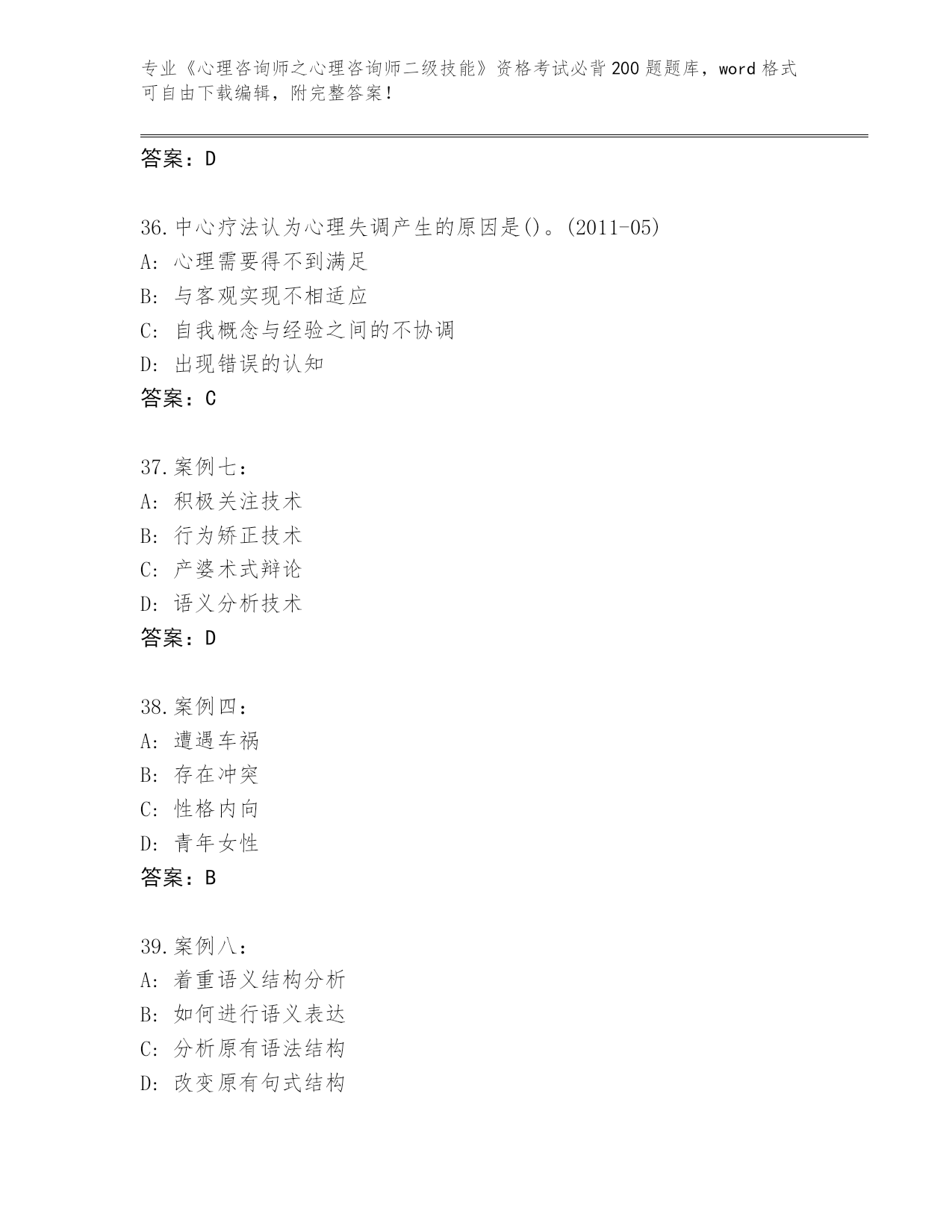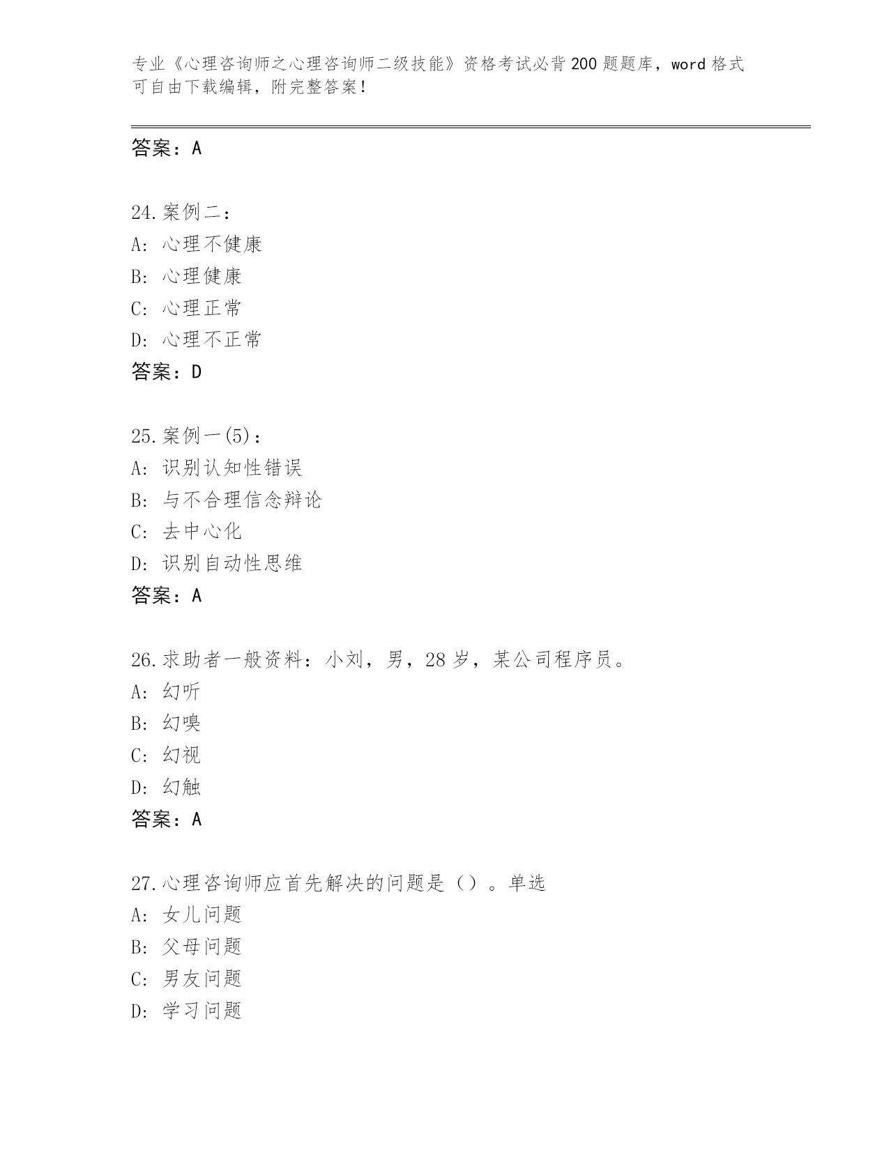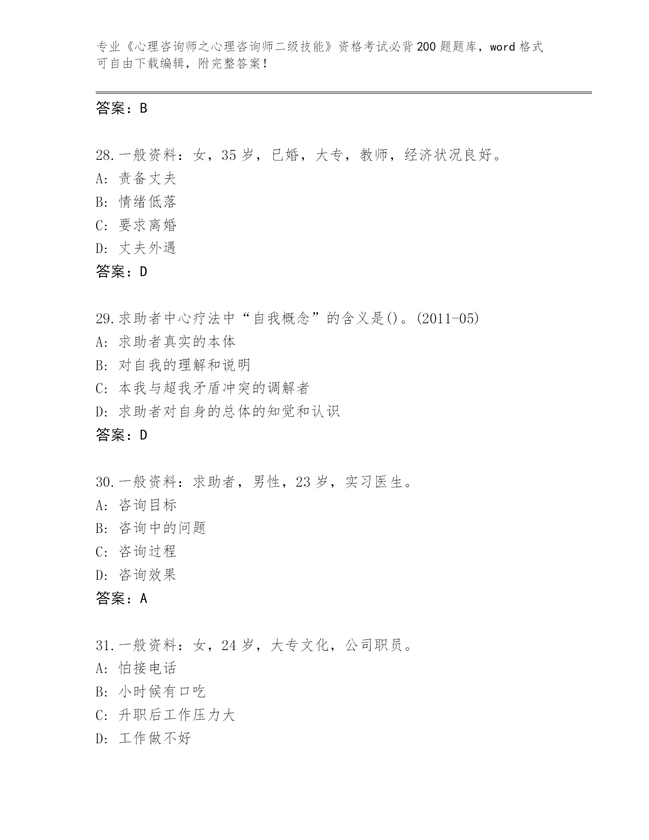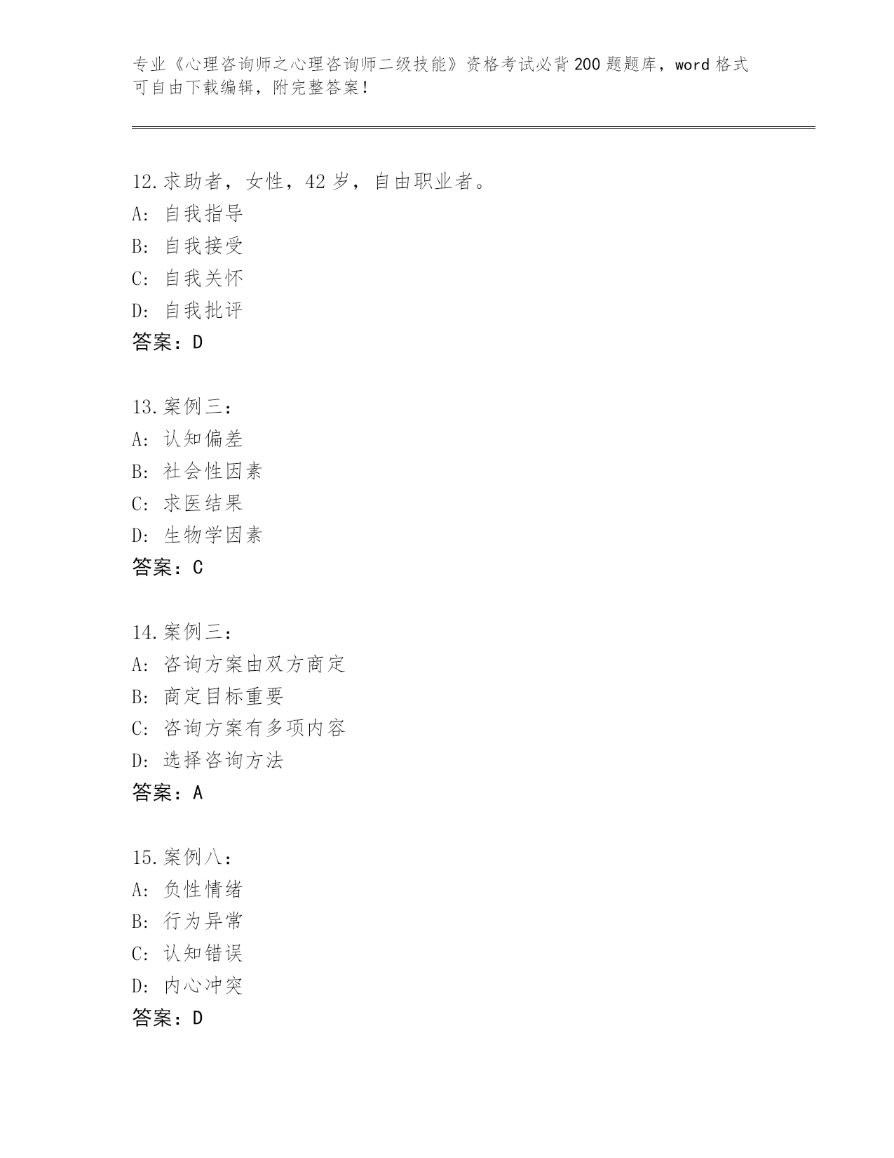 安徽省历年《心理咨询师之心理咨询师二级技能》资格考试必背200题真题题库(夺分金卷)