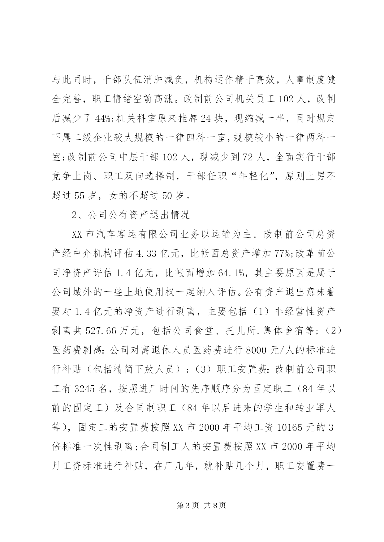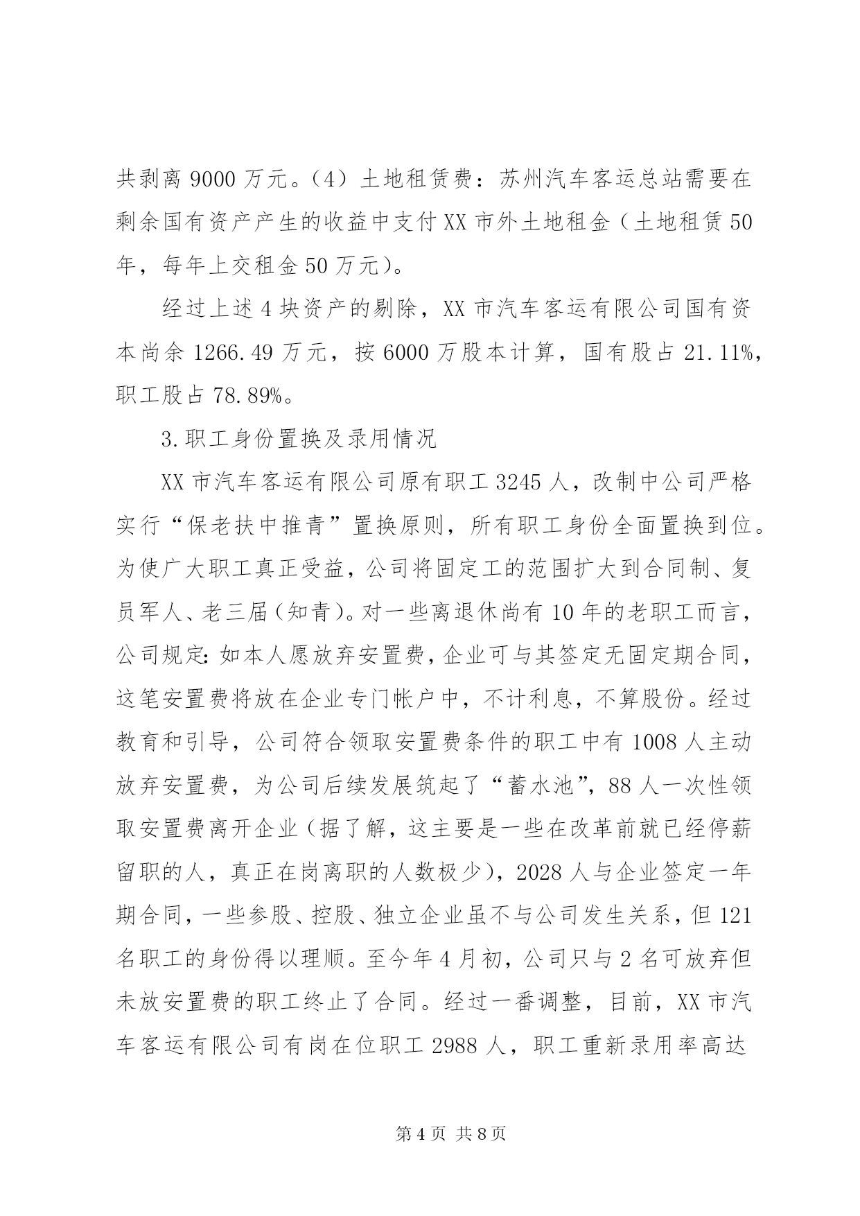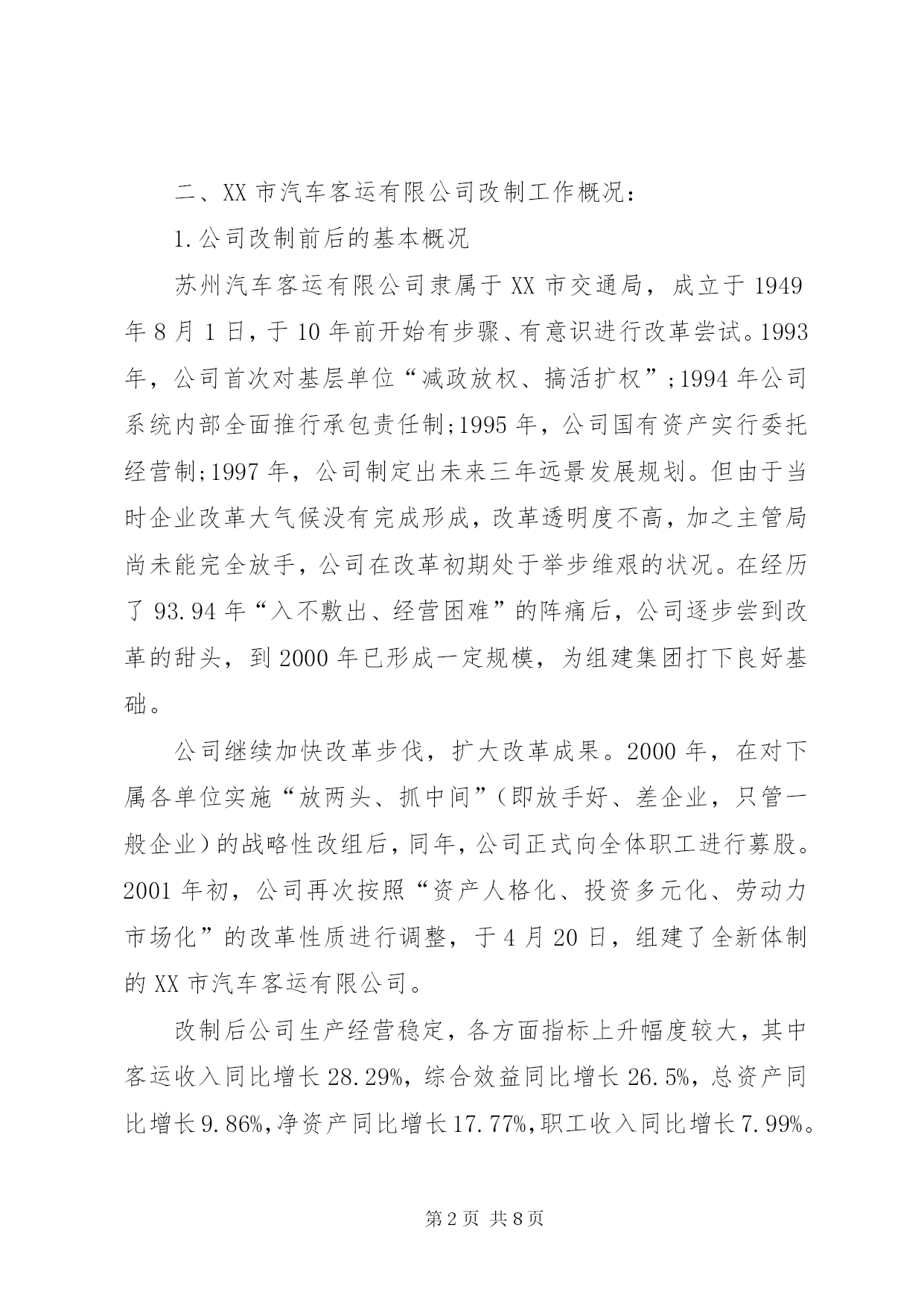 第PAGE\*Arabic\*MERGEFORMAT8页共NUMPAGES\*MERGEFORMAT8页交通公司企业改组改制调研报告2002年4月4日,市交通局副局长、局改革办公室主任陈登峰带领市经济办主任王彬和市长运公司总经理李亚峰等8人赴XX市客运有限公司学习改制成功经验。XX市交通局、XX市汽车客运有限公司的有关领导介绍了企业改制基本概况,使学习小组一行倍受启发。市长运公司总经理李亚峰参观学习后表示:要借鉴苏州的经验和做法,结合本单位实际,力争月内拿出公司改制方案,确保今年改革工作全面完成。现将学习调研情况报告如下:一、XX市交通系统企业改制工作概况XX市交通系统企业改革工作于3年前拉开序幕,准备充分.改革彻底.效果明显。按照“实事求是反映交通企业改制特色”的总体要求,到目前为止,该市交通系统下属的客运、货运、轮船、航务、联运、通港等6家企业中,4家已改制完毕,剩余的轮船、航运2家也将于今年完成。在已改制完的4家企业中,除客运企业目前暂留21.11%的国有股外,其余均成为真正意义上的“非公有制经济”。企改后,XX市交通局对企业各项经营生产“完全放手、不再介入”,只于发展方向上给予适当扶持与指导,主管局工作自身将更加着重于交通基础设施建设与行业管理。未来几年内,XX市交通局将逐步引导XX市汽车客运有限公司走“品牌”之路,打“品牌”效应,接受市场公平、公正的挑战。二、XX市汽车客运有限公司改制工作概况:1.公司改制前后的基本概况苏州汽车客运有限公司隶属于XX市交通局,成立于1949年8月1日,于10年前开始有步骤、有意识进行改革尝试。1993年,公司首次对基层单位“减政放权、搞活扩权”;1994年公司系统内部全面推行承包责任制;1995年,公司国有资产实行委托经营制;1997年,公司制定出未来三年远景发展规划。但由于当时企业改革大气候没有完成形成,改革透明度不高,加之主管局尚未能完全放手,公司在改革初期处于举步维艰的状况。在经历了93.94年“入不敷出、经营困难”的阵痛后,公司逐步尝到改革的甜头,到2000年已形成一定规模,为组建集团打下良好基础。公司继续加快改革步伐,扩大改革成果。2000年,在对下属各单位实施“放两头、抓中间”(即放手好、差企业,只管一般企业)的战略性改组后,同年,公司正式向全体职工进行募股。2001年初,公司再次按照“资产人格化、投资多元化、劳动力市场化”的改革性质进行调整,于4月20日,组建了全新体制的XX市汽车客运有限公司。改制后公司生产经营稳定,各方面指标上升幅度较大,其中客运收入同比增长28.29%,综合效益同比增长26.5%,总资产同比增长9.86%,净资产同比增长17.77%,职工收入同比增长7.99%。与此同时,干部队伍消肿减负,机构运作精干高效,人事制度健全完善,职工情绪空前高涨。改制前公司机关员工102人,改制后减少了44%;机关科室原来挂牌24块,现缩减一半,同时规定下属二级企业较大规模的一律四科一室,规模较小的一律两科一室;改制前公司中层干部102人,现减少到72人,全面实行干部竞争上岗、职工双向选择制,干部任职“年轻化”,原则上男不超过55岁,女的不超过50岁。2、公司公有资产退出情况XX市汽车客运有限公司业务以运输为主。改制前公司总资产经中介机构评估4.33亿元,比帐面总资产增加77%;改革前公司净资产评估1.4亿元,比帐面增加64.1%,其主要原因是属于公司城外的一些土地使用权一起纳入评估。公有资产退出意味着要对1.4亿元的净资产进行剥离,主要包括(1)非经营性资产剥离共527.66万元,包括公司食堂、托儿所.集体舍宿等;(2)医药费剥离:公司对离退休人员医药费进行8000元/人的标准进行补贴(包括精简下放人员);(3)职工安置费:改制前公司职工有3245名,按照进厂时间的先序顺序分为固定职工(84年以前的固定工)及合同制职工(84年以后进来的学生和转业军人等),固定工的安置费按照XX市2000年平均工资10165元的3倍标准一次性剥离;合同制工人的安置费按照XX市2000年平均月工资标准进行补贴,在厂几年,就补贴几个月,职工安置费一共剥离9000万元。(4)土地租赁费:苏州汽车客运总站需要在剩余国有资产产生的收益中支付XX市外土地租金(土地租赁50年,每年上交租金50万元)。经过上述4块资产的剔除,XX市汽车客运有限公司国有资本尚余1266.49万元,按6000万股本计算,国有股占21.11%,职工股占78.89%。3.职工身份置换及录用情况XX市汽车客运有限公司原有职工3245人,改制中公司严格实行“保老扶中推青”置换原则,所有职工身份全面置换到位。为使广大职工真正受益,公司将固定工的范围扩大到合同制、复员军人、老三届(知青)。对一些离退休尚有1