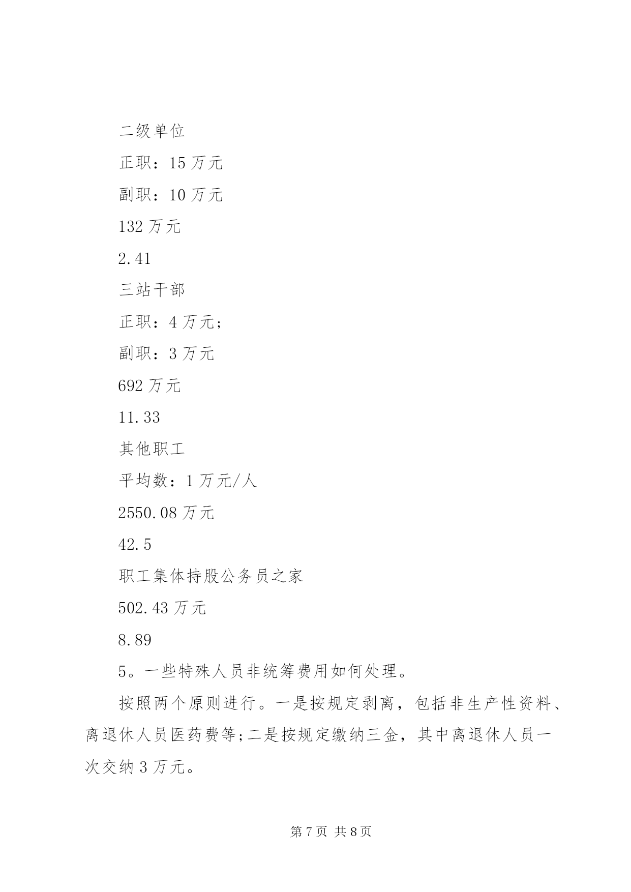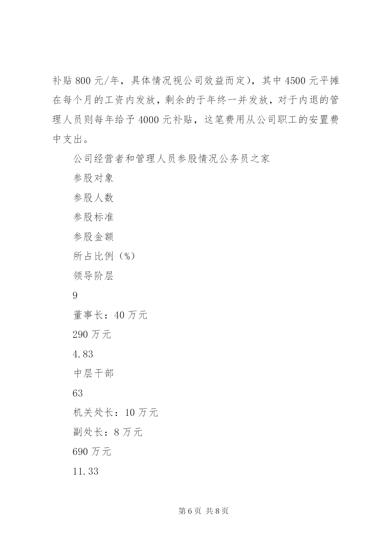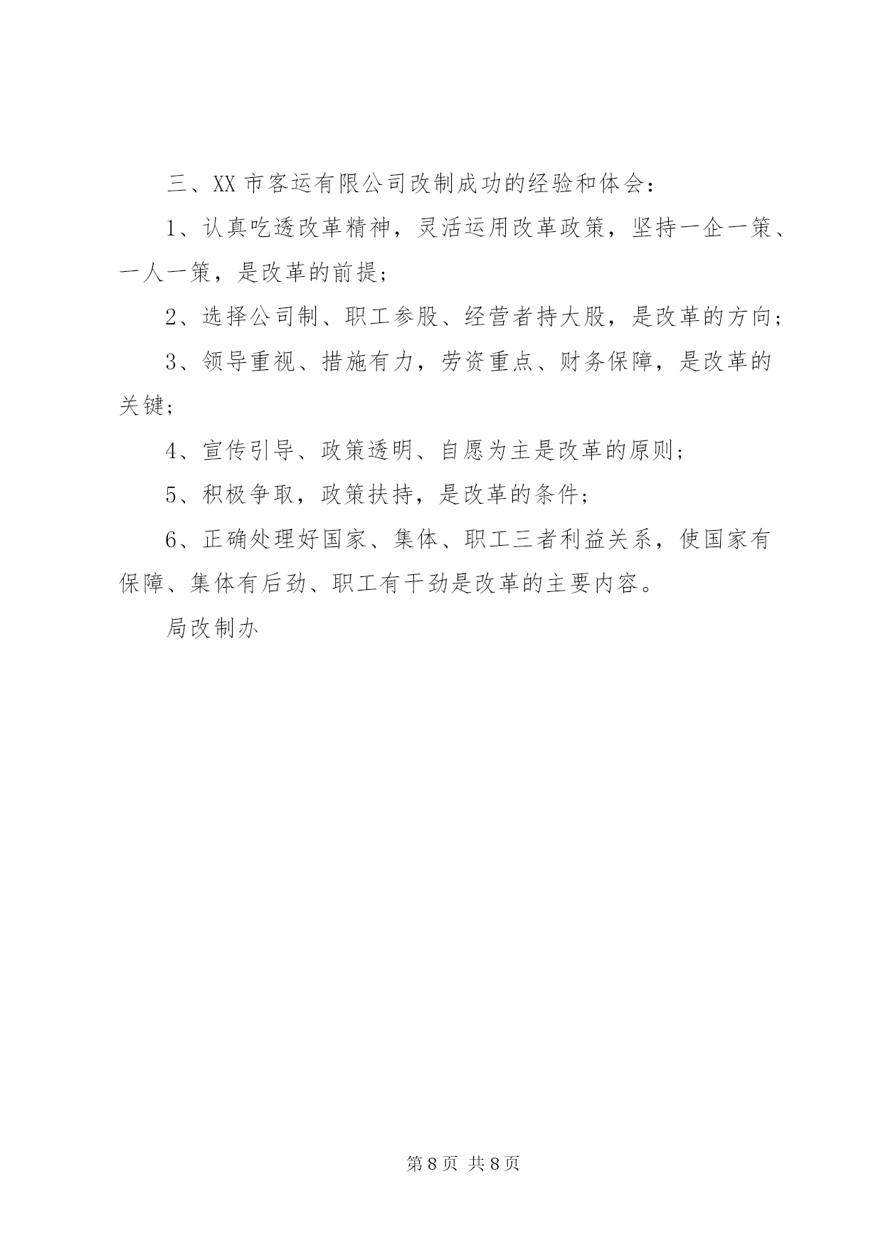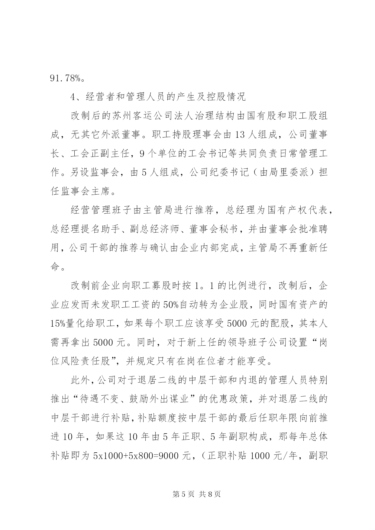 第PAGE\*Arabic\*MERGEFORMAT8页共NUMPAGES\*MERGEFORMAT8页交通公司企业改组改制调研报告2002年4月4日,市交通局副局长、局改革办公室主任陈登峰带领市经济办主任王彬和市长运公司总经理李亚峰等8人赴XX市客运有限公司学习改制成功经验。XX市交通局、XX市汽车客运有限公司的有关领导介绍了企业改制基本概况,使学习小组一行倍受启发。市长运公司总经理李亚峰参观学习后表示:要借鉴苏州的经验和做法,结合本单位实际,力争月内拿出公司改制方案,确保今年改革工作全面完成。现将学习调研情况报告如下:一、XX市交通系统企业改制工作概况XX市交通系统企业改革工作于3年前拉开序幕,准备充分.改革彻底.效果明显。按照“实事求是反映交通企业改制特色”的总体要求,到目前为止,该市交通系统下属的客运、货运、轮船、航务、联运、通港等6家企业中,4家已改制完毕,剩余的轮船、航运2家也将于今年完成。在已改制完的4家企业中,除客运企业目前暂留21.11%的国有股外,其余均成为真正意义上的“非公有制经济”。企改后,XX市交通局对企业各项经营生产“完全放手、不再介入”,只于发展方向上给予适当扶持与指导,主管局工作自身将更加着重于交通基础设施建设与行业管理。未来几年内,XX市交通局将逐步引导XX市汽车客运有限公司走“品牌”之路,打“品牌”效应,接受市场公平、公正的挑战。二、XX市汽车客运有限公司改制工作概况:1.公司改制前后的基本概况苏州汽车客运有限公司隶属于XX市交通局,成立于1949年8月1日,于10年前开始有步骤、有意识进行改革尝试。1993年,公司首次对基层单位“减政放权、搞活扩权”;1994年公司系统内部全面推行承包责任制;1995年,公司国有资产实行委托经营制;1997年,公司制定出未来三年远景发展规划。但由于当时企业改革大气候没有完成形成,改革透明度不高,加之主管局尚未能完全放手,公司在改革初期处于举步维艰的状况。在经历了93.94年“入不敷出、经营困难”的阵痛后,公司逐步尝到改革的甜头,到2000年已形成一定规模,为组建集团打下良好基础。公司继续加快改革步伐,扩大改革成果。2000年,在对下属各单位实施“放两头、抓中间”(即放手好、差企业,只管一般企业)的战略性改组后,同年,公司正式向全体职工进行募股。2001年初,公司再次按照“资产人格化、投资多元化、劳动力市场化”的改革性质进行调整,于4月20日,组建了全新体制的XX市汽车客运有限公司。改制后公司生产经营稳定,各方面指标上升幅度较大,其中客运收入同比增长28.29%,综合效益同比增长26.5%,总资产同比增长9.86%,净资产同比增长17.77%,职工收入同比增长7.99%。与此同时,干部队伍消肿减负,机构运作精干高效,人事制度健全完善,职工情绪空前高涨。改制前公司机关员工102人,改制后减少了44%;机关科室原来挂牌24块,现缩减一半,同时规定下属二级企业较大规模的一律四科一室,规模较小的一律两科一室;改制前公司中层干部102人,现减少到72人,全面实行干部竞争上岗、职工双向选择制,干部任职“年轻化”,原则上男不超过55岁,女的不超过50岁。2、公司公有资产退出情况XX市汽车客运有限公司业务以运输为主。改制前公司总资产经中介机构评估4.33亿元,比帐面总资产增加77%;改革前公司净资产评估1.4亿元,比帐面增加64.1%,其主要原因是属于公司城外的一些土地使用权一起纳入评估。公有资产退出意味着要对1.4亿元的净资产进行剥离,主要包括(1)非经营性资产剥离共527.66万元,包括公司食堂、托儿所.集体舍宿等;(2)医药费剥离:公司对离退休人员医药费进行8000元/人的标准进行补贴(包括精简下放人员);(3)职工安置费:改制前公司职工有3245名,按照进厂时间的先序顺序分为固定职工(84年以前的固定工)及合同制职工(84年以后进来的学生和转业军人等),固定工的安置费按照XX市2000年平均工资10165元的3倍标准一次性剥离;合同制工人的安置费按照XX市2000年平均月工资标准进行补贴,在厂几年,就补贴几个月,职工安置费一共剥离9000万元。(4)土地租赁费:苏州汽车客运总站需要在剩余国有资产产生的收益中支付XX市外土地租金(土地租赁50年,每年上交租金50万元)。经过上述4块资产的剔除,XX市汽车客运有限公司国有资本尚余1266.49万元,按6000万股本计算,国有股占21.11%,职工股占78.89%。3.职工身份置换及录用情况XX市汽车客运有限公司原有职工3245人,改制中公司严格实行“保老扶中推青”置换原则,所有职工身份全面置换到位。为使广大职工真正受益,公司将固定工的范围扩大到合同制、复员军人、老三届(知青)。对一些离退休尚有1