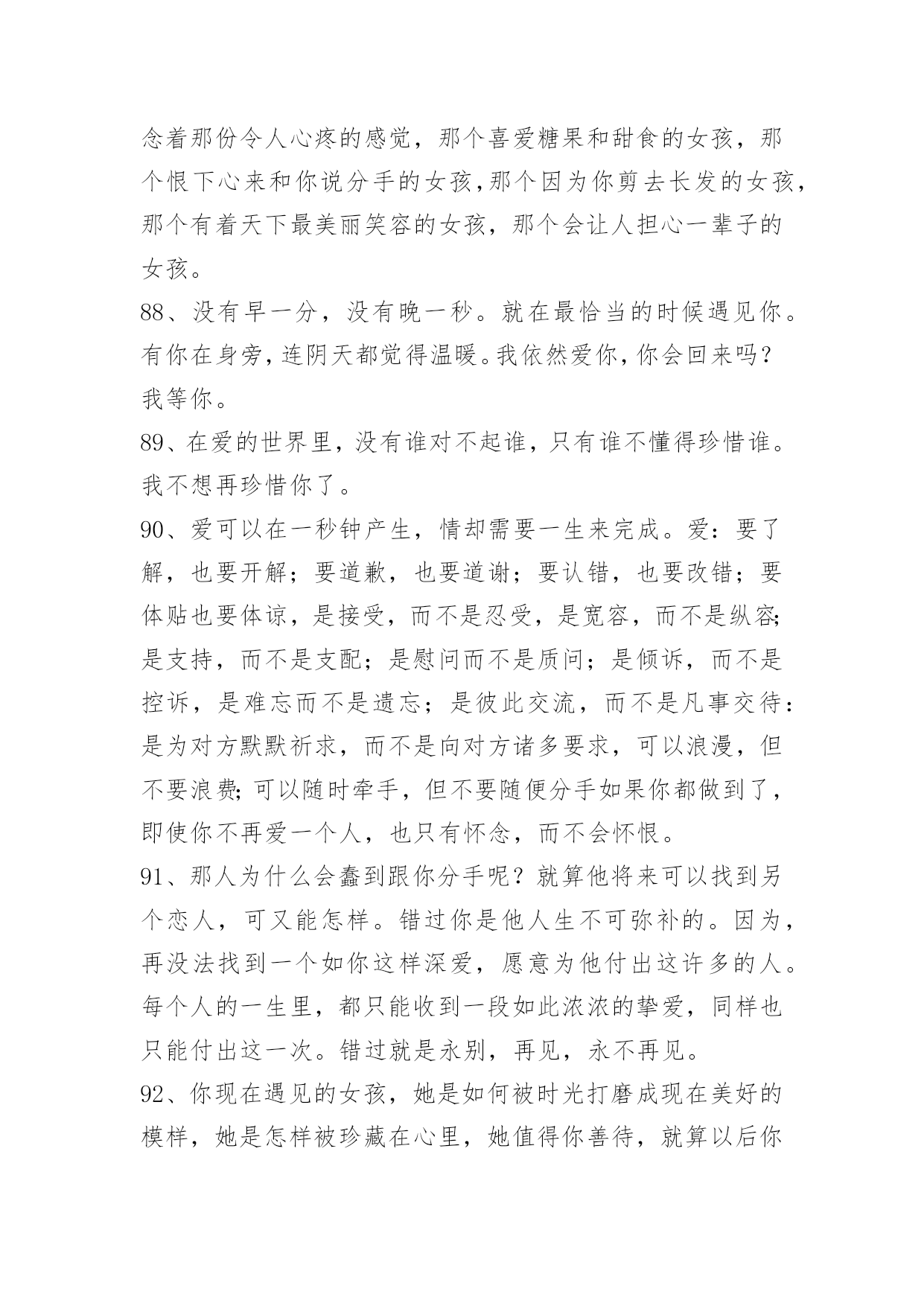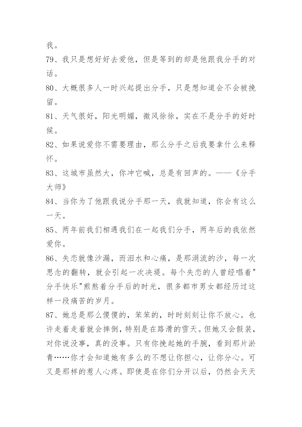 分手的语录95条有关分手的语录汇编95条每次分手两个字到嘴边就是说不出来,我承认,我对你还有爱,但是你对我的态度让我怀疑你是否爱过我。以下是小编整理的分手的语录95条,欢迎大家前来欣赏。1、即然已经协议分手,就不要有太多的留恋,即使我们会难过,也不要互相伤害,就让我们的回忆停在最美的时候。2、我和他相爱了三年,却爱到了分手。3、爱情真的很不可靠,前秒说爱臣妾,后秒就分手。可是臣妾就是有这么傻,竟然还相信爱情。4、呵,真可笑,臣妾拼了命为君等下去,君却对臣妾说分手。5、我放你走,你会找到比我更好的,更适合你的人的。6、我们本来应该是很有将来的,以前的我们不是很开心吗?为什么会这样?但我们的距离越来越远,就只怪我们有缘无份吧!7、深爱你的人正在忏悔,小女人一个,但我很喜欢。8、我昨晚也几乎一晚没睡,除了反省自己的过错,我还要用行动表示,抓紧时间赶制温暖牌,原谅我吧!9、把个性签名更新为:有些人说不清哪里好,但就是谁都替代不了。他若心里有你,还会关注着你。10、我被你弄得遍体鳞伤,你却用不屑与我分手。11、为什么总是这样,爱你的你不要,不爱你的你却拼命忘也忘不了。12、当你再次在我面前留下眼泪的时候,我一开始觉得厌烦,我不是讨厌你的泪水,而是一开始讨厌我们频繁地吵架,频繁的哭泣,亲爱的我们回到过去好不好,如果回不去,亲爱的,我们分手吧。13、我们分手了,分手的理由是我太爱吃醋。我苦笑,到底是因为真的太爱吃醋还是真的爱了。14、我们分手一年多了,我以为我已经忘了你,但看见你和别的女生在一起时,我……心痛了。15、如果可以重来,我是不会与你分手;命运总是这样的捉弄人,或许可以任为我们有缘无份。16、当一个男人夸赞一个女人聪明、善良、温柔、贤惠、多情、漂亮的时候,往往是分手以后。17、我和他今天分手了,我以为他会是我最终的归宿,但我错了不该对爱情有所期待何况是现在。18、其实在我说分手的时候我多希望你能挽留一下,哪怕只是一句舌不得我也会毫不犹豫的留下。19、花心的,脚踩几条船的男人不能要,发现一次一定要分手。老话说了,当断不断,反受其乱。20、我总想找个理由,回到相遇的前头,幻想分手还能做朋友,但我在见你时候,泪水飞出我眼眸。21、每次和你说话你都敷衍我,一点也不在乎我,你再这样分手算了。在你心里我还没有游戏重要。22、总得分手,总得追求。日方长,我们总有相逢的时候。依终须别,此后盼珍重,再叙情更浓。23、松开你的手让你走,没有人会知道我的感受,若有一天你会发现,我在这里等候,分手才是永恒。24、说分手的那一刻我没挽留,不是不爱你,而是不想让你觉得我是个死缠烂打的女人因此讨厌我而已。25、不自私的爱情没有,亲吻牵手,走到最后都是一样的相互所求,稍稍缺少给予,那么就是分手告终。26、我很忙。听到这句话时,朋友心想这哥们儿事业有成;妻子马上觉得自己家务的担子重了;女朋友则一开始担心自己在他心目中的位置,甚至可以理解成一个分手的信号或借口。27、或许,爱就是心甘情愿的付出,甘苦与共的分享。牵了手,就不要,随便说分手。不要等到失去了才知道可贵,不要等到伤害了才来乞求原谅,有些东西失去了永远不会再回来。28、也许是自己感觉到某些方面自己无力达到,尽管并不情愿,还是要有自知之明,知难而退;也许可以叫对方意识到无法解决的难题横在你们中间,叫他/她明白分手是不可避免的。29、很少有人不会面临失恋的痛苦。在这方面,我不想用常规的方式劝你。只是想说,这个世界没有人有义务对另一个人百分百的好。不要妄想分手了他还会像从前那样照顾你体贴你。30、分手只不过是激情过后,彼此都很难平复的伤口。爱得再深总有一天都会很难受,别让泪水一次次蒙住眼眸。相守只不过是激情过后,彼此都没有借口说分手。爱得再深总有一天都会变平淡。31、分手了就做回自己。一个人的世界同样有月升月落,也有美丽的瞬间。把他归为记忆。想他的时候,就想想他的好、他的笑,记得曾经爱过一个人。别去管最后是谁一开始了背叛,开心过就好。32、我之前一直提醒自己,即使我们无法一起,那分手原因也不要是我有了别人,因为我不希望你讨厌我。但明显这是过虑了,分手的原因,根本用不着我去烦恼。而更重要的,是你对这事,根本懒得去管。33、爱情本身就不是平等的,彼此的依赖度不一样,分手的时候彼此的痛苦就不同,或许你现在因为分手而伤心不已,而对方内心却可能因为获得解脱而欢呼雀跃,自己已经如此可怜,何苦再为难自己,开心点吧!34、提出分手的那一刻,要么话很多,要么很沉默。35、我怎么可以活的那么憋屈,连分手都说不出口。36、当我说完那句分手,却没有收到你的一句回复。37、彼此许下诺言,不提分手,不管是个美丽的梦。38、爱情没什么理由,说理由一般都再分手的时候。39、你太让我失望了,分手就分手,可是你不要后悔!40、我应该含笑饮毒酒,然