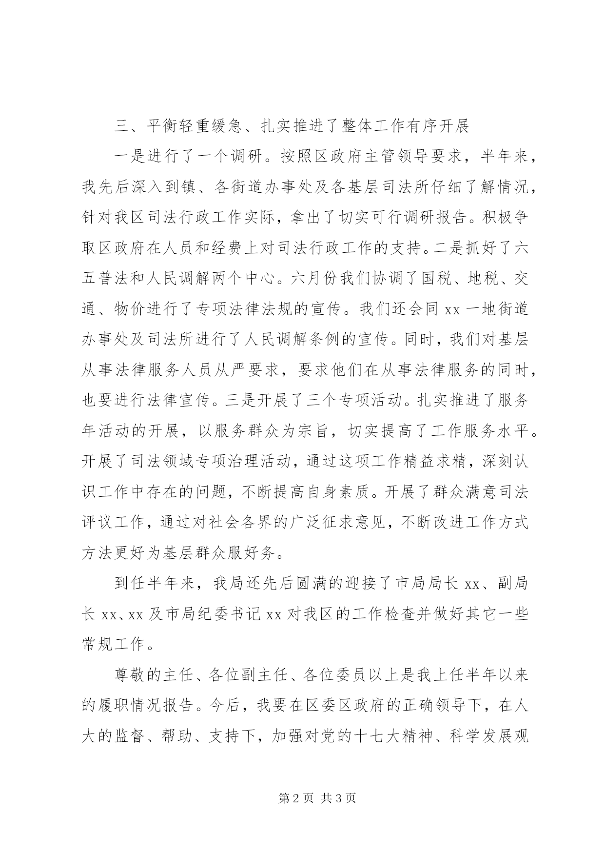 第PAGE\*Arabic\*MERGEFORMAT3页共NUMPAGES\*MERGEFORMAT3页区司法局长履职情况述职报告尊敬的主任、各位副主任,各位委员:感谢区人大常委会给予我这个机会,使我能地向各位汇报我就任司法局局长一职以来我区司法行政工作开展情况,这既是对我的鞭策和鼓励,也是对我局工作的重视和支持。我是今年六月十日被任命为xx区司法局长的。下面,我就半年以来履行职责的情况作述职报告,请予审议。一、加强业务学习、掌握了开展工作的必备资本担任司法局长以来,我深知加强学习法律知识、学习司法行政工作业务的重要意义。半年来,我先后对关民事法律和刑事法律等有关法律知识进行了复习。同时,我还系统地学习了人民调解、安置帮教、五五普法等有关业务知识。为下步开展工作打下了坚实的基础。二、深入了解情况、拿出了切实可行的工作对策半年来,针对我区司法行政工作队伍现状及工作开展情况,我积极上下沟通掌握了第一手资料。通过调查研究,我认识到,我区司法行政工作存在以下问题:一是编多人少。编制13个,实有专职人员五人。二是法律专业人员更少,专兼职七人中只有一人第一学历为法律。三是必要经费保障严重不足,许多工作难于开展。我深刻认识到,要想使今后我区司法行政工作实现大的发展,人员和经费至关重要。三、平衡轻重缓急、扎实推进了整体工作有序开展一是进行了一个调研。按照区政府主管领导要求,半年来,我先后深入到镇、各街道办事处及各基层司法所仔细了解情况,针对我区司法行政工作实际,拿出了切实可行调研报告。积极争取区政府在人员和经费上对司法行政工作的支持。二是抓好了六五普法和人民调解两个中心。六月份我们协调了国税、地税、交通、物价进行了专项法律法规的宣传。我们还会同xx一地街道办事处及司法所进行了人民调解条例的宣传。同时,我们对基层从事法律服务人员从严要求,要求他们在从事法律服务的同时,也要进行法律宣传。三是开展了三个专项活动。扎实推进了服务年活动的开展,以服务群众为宗旨,切实提高了工作服务水平。开展了司法领域专项治理活动,通过这项工作精益求精,深刻认识工作中存在的问题,不断提高自身素质。开展了群众满意司法评议工作,通过对社会各界的广泛征求意见,不断改进工作方式方法更好为基层群众服好务。到任半年来,我局还先后圆满的迎接了市局局长xx、副局长xx、xx及市局纪委书记xx对我区的工作检查并做好其它一些常规工作。尊敬的主任、各位副主任、各位委员以上是我上任半年以来的履职情况报告。今后,我要在区委区政府的正确领导下,在人大的监督、帮助、支持下,加强对党的十七大精神、科学发展观理论的学习和理解,不断提高自身素质,提高工作能力,密切联系群众,不断解放思想,开拓创新,推动我区司法行政工作迈上新台阶,进一步发挥司法行政维护社会稳定的职能作用,为构建生态、平安、和谐、富裕xx做出自己应有的贡献。最感谢各位聆听我的履职发言。履职人:xx