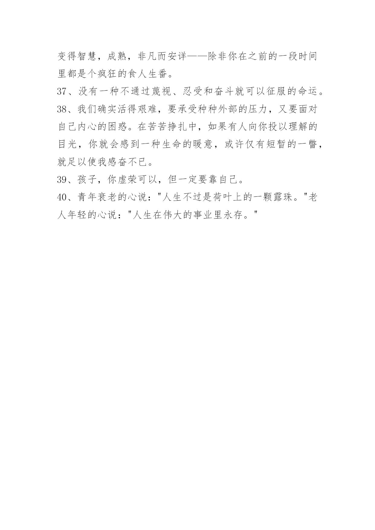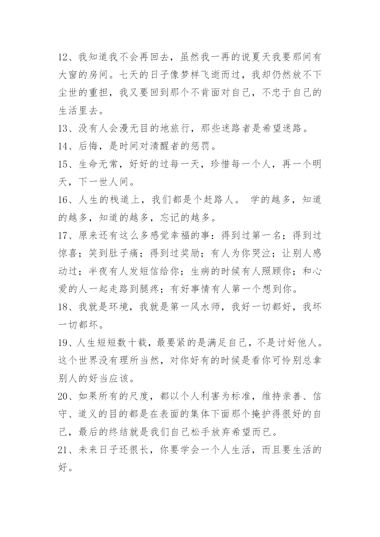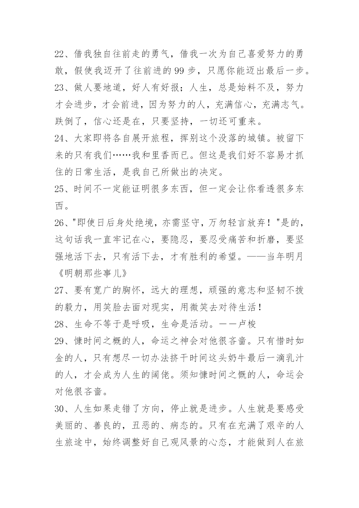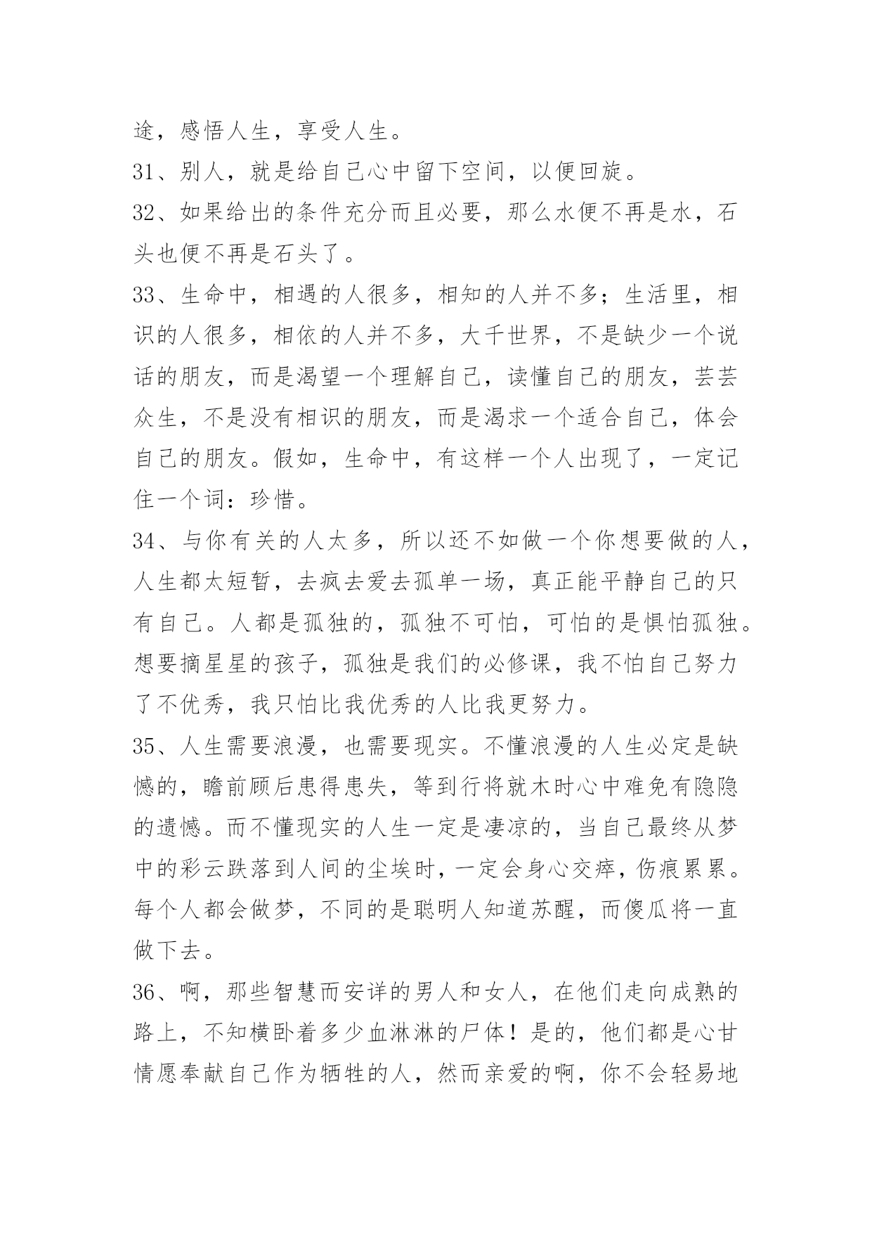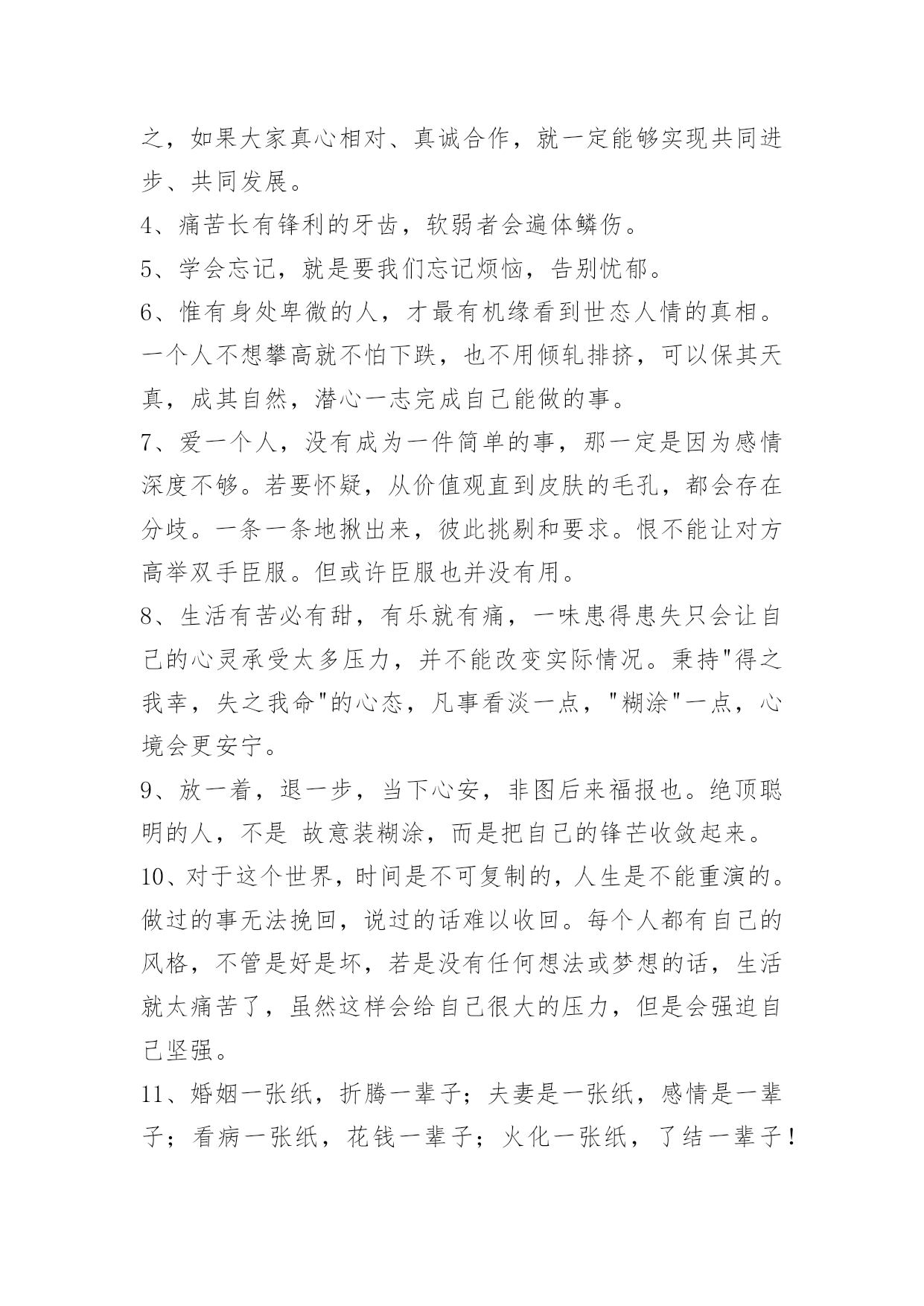 人生的哲理语录40条【精华】2023年人生的哲理语录锦集40条辗转一流年,时光穿梭,岁月如水轻轻地蒸发,光景却是另一番。光阴积累回忆,时间循环生机,每一片旖旎的风光,孕育了每一片代表生机的翠绿,绿化了曾暗黄的校园。春天里的阳光轻暖如棉,细雨如针,轻轻落在浅黄的树叶上,深化每一点绿色,迎来四季的中央,妩媚了夏季艳阳天。以下是小编为大家提供的人生的哲理语录40条,欢迎阅读借鉴。1、能屈能伸代表一种积极向上的心态,不管在什么样的境况之中,都能紧盯着自己的目标,受得了一时的委屈才能成就更大的辉煌。不懂得适时屈伸的人,往往都会迎接失败的结果。2、有人的地方就有事,有事必然有是非。对口蜜腹剑的人微笑着打哈哈。对吹牛拍马的人不要与他为敌。对尖酸刻薄的人保持一定距离。对挑拨离间的人最好谨言慎行。对翻脸无情的人应该留一手。对愤世嫉俗的人睁只眼闭只眼。对雄才大略的人虚心地学习。对敬业乐群的人工作卖力气。对踌躇满志的人尽量顺着他。3、"团结合作"在集体生活和个人成长中十分重要,重视了、搞好了,受益;忽略了、搞砸了,受损。如果一个企业,心不相通,志不相投,战友之间相处,相互看不到优点和长处,只盯着对方的缺点和不足,相互拆台不补台、分心不拧劲,就会形成内耗,工作难做好,企业难发展,个人难进步。反之,如果大家真心相对、真诚合作,就一定能够实现共同进步、共同发展。4、痛苦长有锋利的牙齿,软弱者会遍体鳞伤。5、学会忘记,就是要我们忘记烦恼,告别忧郁。6、惟有身处卑微的人,才最有机缘看到世态人情的真相。一个人不想攀高就不怕下跌,也不用倾轧排挤,可以保其天真,成其自然,潜心一志完成自己能做的事。7、爱一个人,没有成为一件简单的事,那一定是因为感情深度不够。若要怀疑,从价值观直到皮肤的毛孔,都会存在分歧。一条一条地揪出来,彼此挑剔和要求。恨不能让对方高举双手臣服。但或许臣服也并没有用。8、生活有苦必有甜,有乐就有痛,一味患得患失只会让自己的心灵承受太多压力,并不能改变实际情况。秉持"得之我幸,失之我命"的心态,凡事看淡一点,"糊涂"一点,心境会更安宁。9、放一着,退一步,当下心安,非图后来福报也。绝顶聪明的人,不是故意装糊涂,而是把自己的锋芒收敛起来。10、对于这个世界,时间是不可复制的,人生是不能重演的。做过的事无法挽回,说过的话难以收回。每个人都有自己的风格,不管是好是坏,若是没有任何想法或梦想的话,生活就太痛苦了,虽然这样会给自己很大的压力,但是会强迫自己坚强。11、婚姻一张纸,折腾一辈子;夫妻是一张纸,感情是一辈子;看病一张纸,花钱一辈子;火化一张纸,了结一辈子!12、我知道我不会再回去,虽然我一再的说夏天我要那间有大窗的房间。七天的日子像梦样飞逝而过,我却仍然放不下尘世的重担,我又要回到那个不肯面对自己,不忠于自己的生活里去。13、没有人会漫无目的地旅行,那些迷路者是希望迷路。14、后悔,是时间对清醒者的惩罚。15、生命无常,好好的过每一天,珍惜每一个人,再一个明天,下一世人间。16、人生的栈道上,我们都是个赶路人。学的越多,知道的越多,知道的越多,忘记的越多。17、原来还有这么多感觉幸福的事:得到过第一名;得到过惊喜;笑到肚子痛;得到过奖励;有人为你哭泣;让别人感动过;半夜有人发短信给你;生病的时候有人照顾你;和心爱的人一起走路到腿疼;有好事情有人第一个想到你。18、我就是环境,我就是第一风水师,我好一切都好,我坏一切都坏。19、人生短短数十载,最要紧的是满足自己,不是讨好他人。这个世界没有理所当然,对你好有的时候是看你可怜别总拿别人的好当应该。20、如果所有的尺度,都以个人利害为标准,维持亲善、信守、道义的目的都是在表面的集体下面那个掩护得很好的自己,最后的终结就是我们自己松手放弃希望而已。21、未来日子还很长,你要学会一个人生活,而且要生活的好。22、借我独自往前走的勇气,借我一次为自己喜爱努力的勇敢,假使我迈开了往前进的99步,只愿你能迈出最后一步。23、做人要地道,好人有好报;人生,总是始料不及,努力才会进步,才会前进,因为努力的人,充满信心,充满志气。跌倒了,信心还是在,只要坚持,一切还可重来。24、大家即将各自展开旅程,挥别这个没落的城镇。被留下来的只有我们……我和里香而已。但这是我们好不容易才抓住的日常生活,是我自己所做出的决定。25、时间不一定能证明很多东西,但一定会让你看透很多东西。26、"即使日后身处绝境,亦需坚守,万勿轻言放弃!"是的,这句话我一直牢记在心,要隐忍,要忍受痛苦和折磨,要坚强地活下去,只有活下去,才有胜利的希望。——当年明月《明朝那些事儿》27、要有宽广的胸怀,远大的理想,顽强的意志和坚韧不拨的毅力,用笑脸去面对现实,用微笑去对待生活!28、生命不等于是呼吸,生命是活动。――卢梭29、慷时间之概的人,命运之神会对