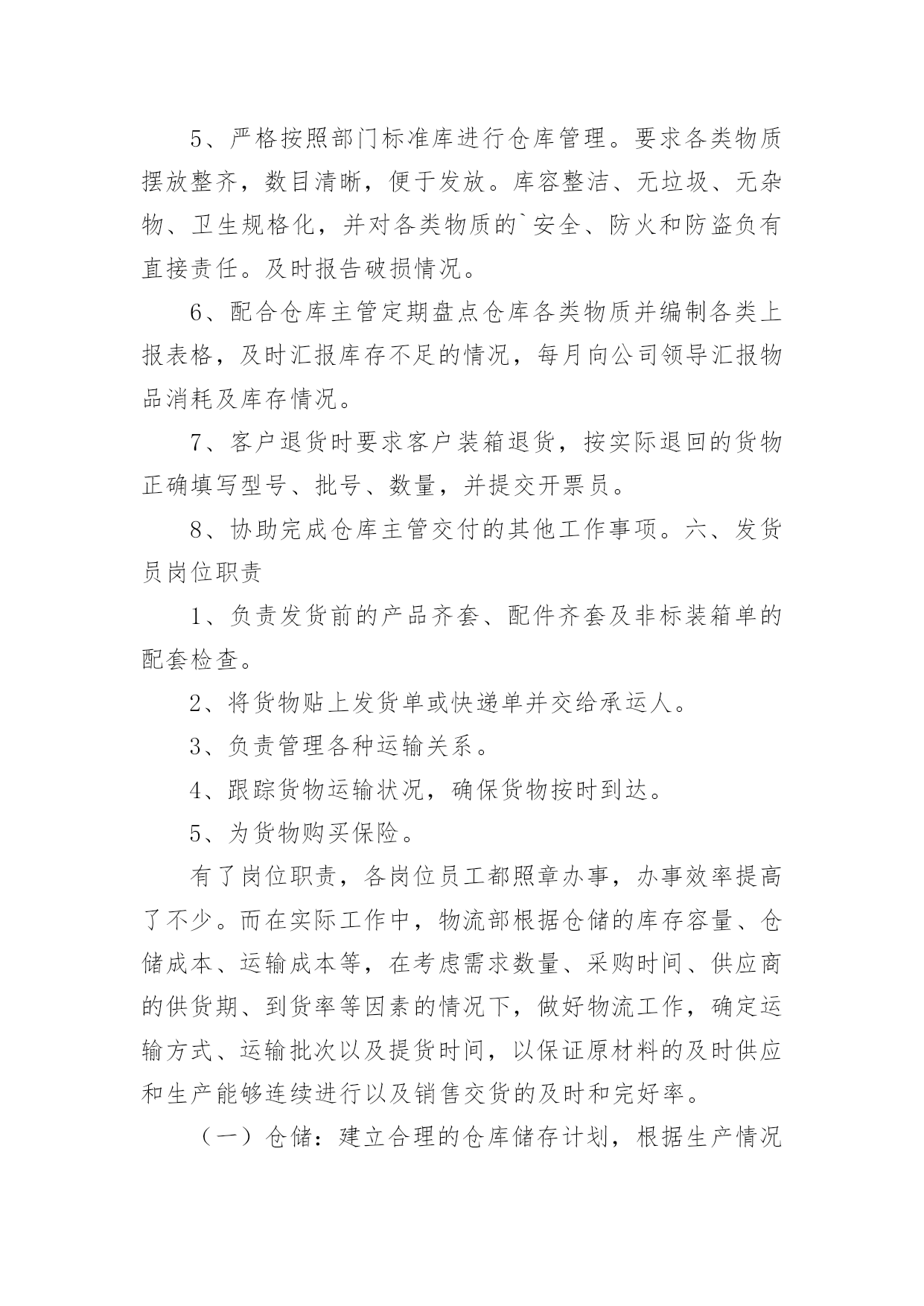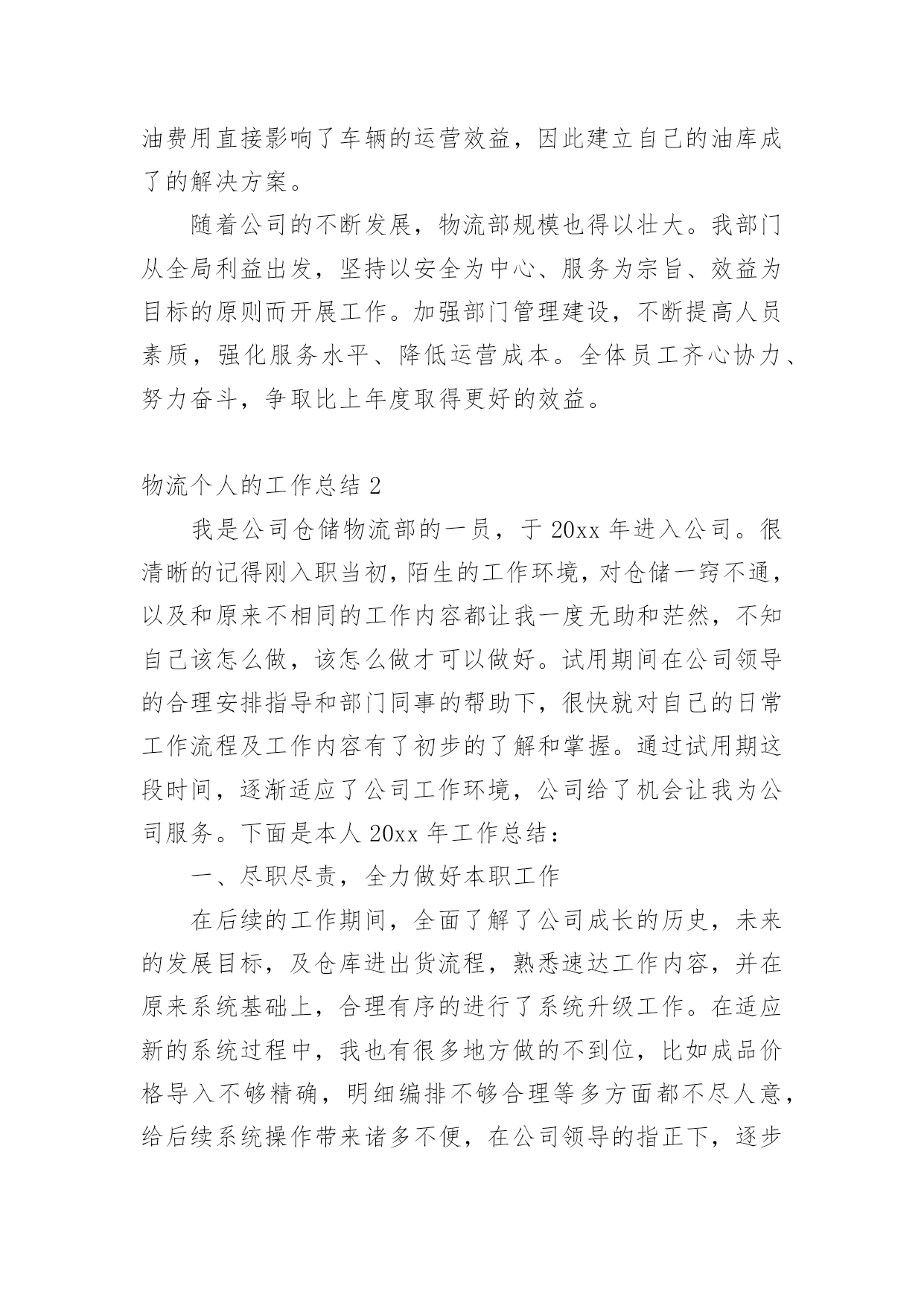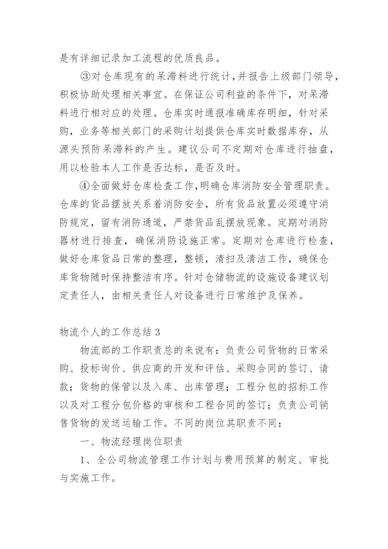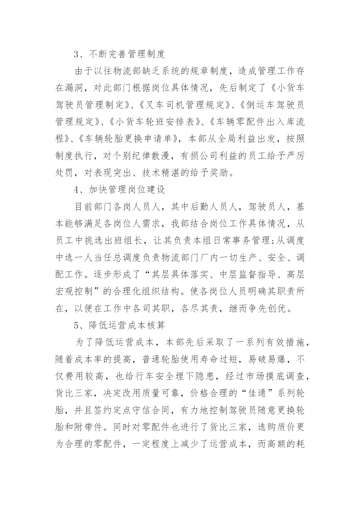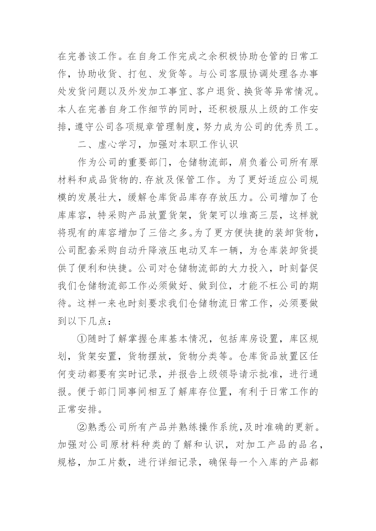 物流个人的工作总结总结是在一段时间内对学习和工作生活等表现加以总结和概括的一种书面材料,它可以有效锻炼我们的语言组织能力,我想我们需要写一份总结了吧。我们该怎么写总结呢?下面是小编收集整理的物流个人的工作总结,希望能够帮助到大家。物流个人的工作总结1回顾20xx年走过的历程,不禁感概万千。展望未来,在20xx年的工作中,物流部将继往开来全体员工围绕着公司的发展。以“中国产品”称号的获得为契机,努力奋斗,强化管理、深化改革、增创效益应做好以下几点方面工作:1、继续提高员工素质我部门坚持组织学习《机动车驾驶员安全教育辅导》、《岗位培训》教材,使广大驾驶员热爱本职工作,在本职上精益上求精。提倡行车讲究语言美,礼让三先风格高的思想品质。2、加强部门服务水平为了提高客户对物流配送的满意度,使企业和客户达到双赢的目的`,我部门极积走访各客户和各地经销商,了解客户销售情况,为了征求客户对运输工作的建议,我部将制定了驾驶员行车服务卡,让广大经销对驾驶员和部门多提宝贵意见,还激励部门驾驶员争当红旗手,不断提高服务水平。3、不断完善管理制度由于以往物流部缺乏系统的规章制度,造成管理工作存在漏洞,对此部门根据岗位具体情况,先后制定了《小货车驾驶员管理制定》、《叉车司机管理规定》、《倒运车驾驶员管理规定》、《小货车轮班安排表》、《车辆零配件出入库流程》、《车辆轮胎更换申请单》,本部从全局利益出发,按照制度执行,对个别纪律散漫,有损公司利益的员工给予严厉处罚,对表现突出、技术精湛的给予奖励。4、加快管理岗位建设目前部门各岗人员人,其中后勤人员人,驾驶员人,基本能够满足各岗位人需求,我部结合岗位工作具体情况,从员工中挑选出班组长,让其负责本组日常事务管理;从调度中选一人当任总调度负责物流部门厂内一切生产、安全、调配工作。逐步形成了“其层具体落实、中层监督指导、高层宏观控制”的合理化组织结构。使各岗位人员明确其职责所在,以便在工作中各司其职,各尽其责,继而争先创优。5、降低运营成本核算为了降低运营成本,本部先后采取了一系列有效措施,随着成本率的提高,普通轮胎使用寿命过短,易破易爆,不仅费用较高,也给行车安全埋下隐患,经过市场摸底调查,货比三家,决定改用质量可靠,价格合理的“佳通”系列轮胎,并且签约定点守信合同,有力地控制驾驶员随意更换轮胎和附带件。同时对零配件也进行了货比三家,选购质价更为合理的零配件,一定程度上减少了运营成本,而高额的耗油费用直接影响了车辆的运营效益,因此建立自己的油库成了的解决方案。随着公司的不断发展,物流部规模也得以壮大。我部门从全局利益出发,坚持以安全为中心、服务为宗旨、效益为目标的原则而开展工作。加强部门管理建设,不断提高人员素质,强化服务水平、降低运营成本。全体员工齐心协力、努力奋斗,争取比上年度取得更好的效益。物流个人的工作总结2我是公司仓储物流部的一员,于20xx年进入公司。很清晰的记得刚入职当初,陌生的工作环境,对仓储一窍不通,以及和原来不相同的工作内容都让我一度无助和茫然,不知自己该怎么做,该怎么做才可以做好。试用期间在公司领导的合理安排指导和部门同事的帮助下,很快就对自己的日常工作流程及工作内容有了初步的了解和掌握。通过试用期这段时间,逐渐适应了公司工作环境,公司给了机会让我为公司服务。下面是本人20xx年工作总结:一、尽职尽责,全力做好本职工作在后续的工作期间,全面了解了公司成长的历史,未来的发展目标,及仓库进出货流程,熟悉速达工作内容,并在原来系统基础上,合理有序的进行了系统升级工作。在适应新的系统过程中,我也有很多地方做的不到位,比如成品价格导入不够精确,明细编排不够合理等多方面都不尽人意,给后续系统操作带来诸多不便,在公司领导的指正下,逐步在完善该工作。在自身工作完成之余积极协助仓管的日常工作,协助收货、打包、发货等。与公司客服协调处理各办事处发货问题以及外发加工事宜、客户退货、换货等异常情况。本人在完善自身工作细节的同时,还积极服从上级的工作安排,遵守公司各项规章管理制度,努力成为公司的优秀员工。二、虚心学习,加强对本职工作认识作为公司的重要部门,仓储物流部,肩负着公司所有原材料和成品货物的.存放及保管工作。为了更好适应公司规模的发展壮大,缓解仓库货品库存存放压力。公司增加了仓库库容,特采购产品放置货架,货架可以堆高三层,这样就将现有的库容增加了三倍之多。为了更方便快捷的装卸货物,公司配套采购自动升降液压电动叉车一辆,为仓库装卸货提供了便利和快捷。公司对仓储物流部的大力投入,时刻督促我们仓储物流部工作必须做好、做到位,才能不枉公司的期待。这样一来也时刻要求我们仓储物流日常工作,必须要做到以下几点:①随时了解掌握仓库基本情况,包括库房设置,库区规划,货架安置,货物摆放,货物分类等。仓库货品放置区任何变动都要