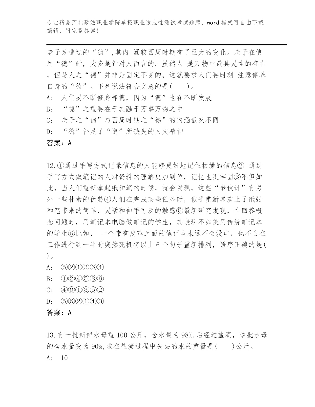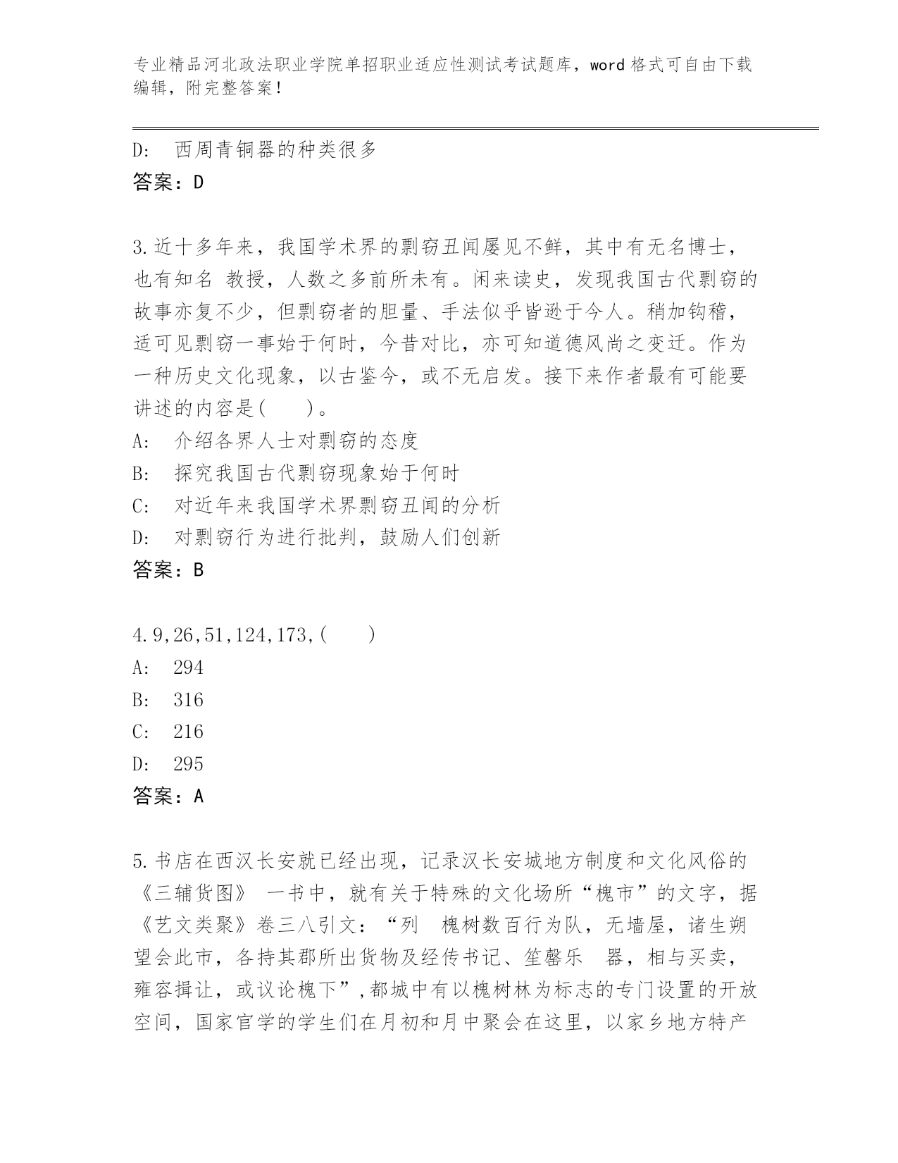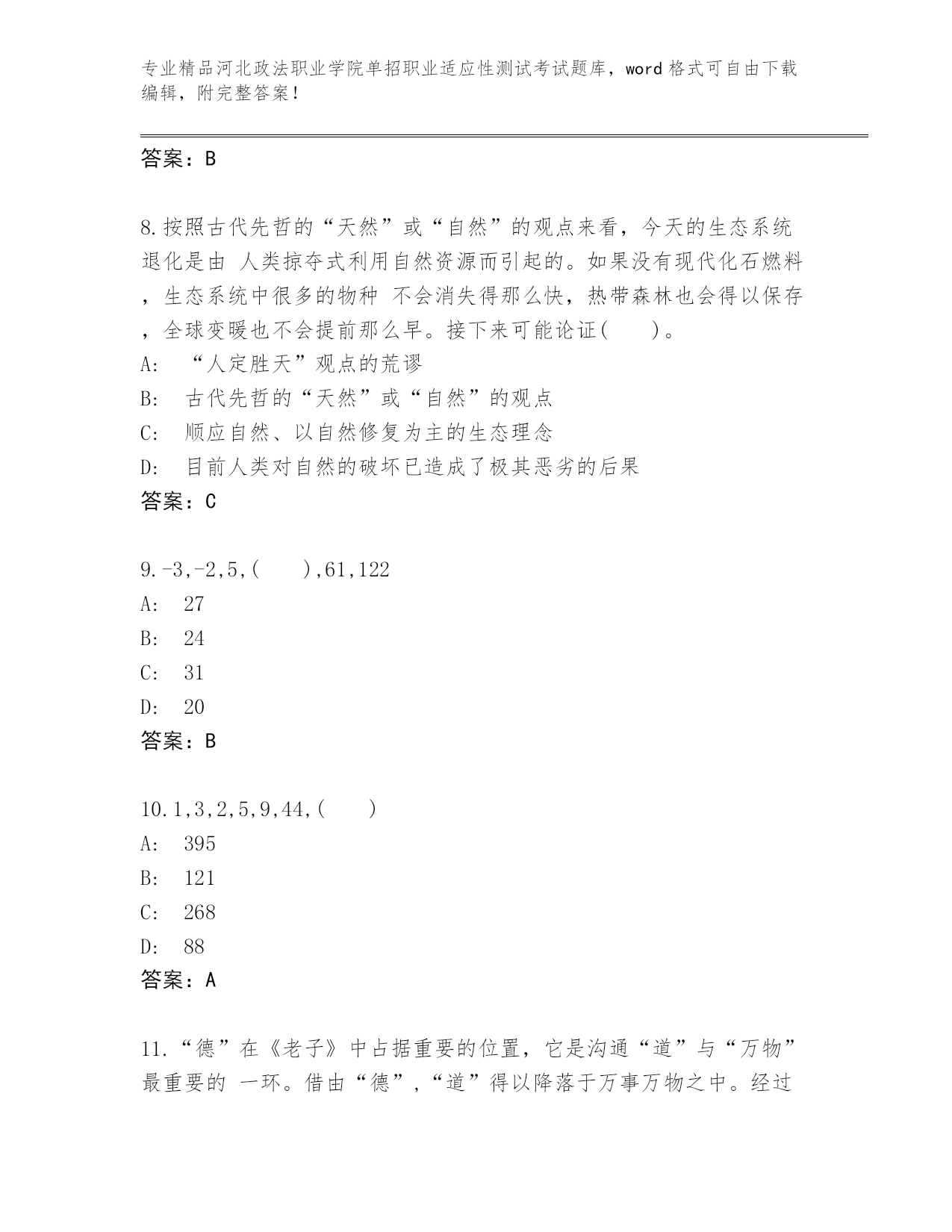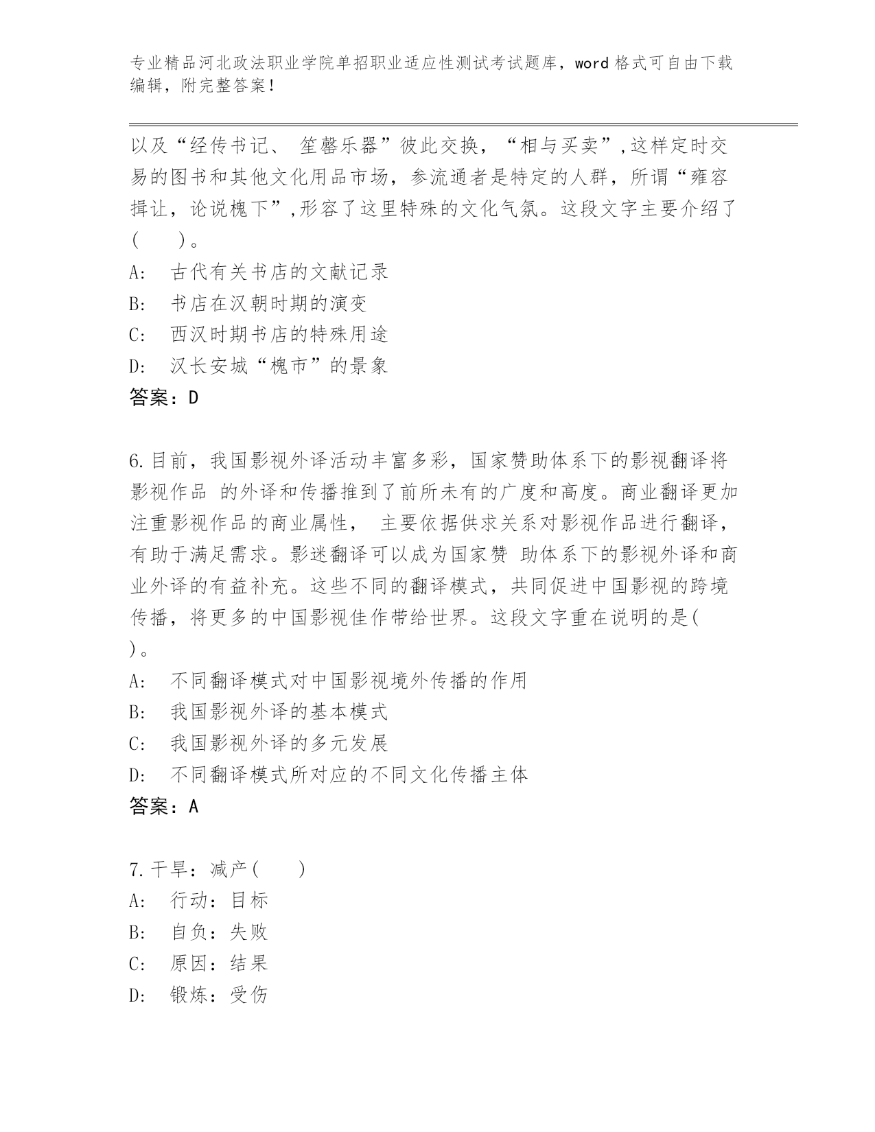 专业精品河北政法职业学院单招职业适应性测试考试题库,word格式可自由下载编辑,附完整答案!优选河北政法职业学院单招职业适应性测试考试优选题库及解析答案第I部分单选题(50题)1.利用诸如高密度脑电图和颅内记录等技术来近距离观察神经元之后,科学家发现,通常用于表征睡眠的慢波并不会在大脑的所有区域同时产生,而是局限于部分区域,而其余区域则观察不到。这一发现表明,同一时刻大脑各区域的睡眠状态并不一致,人类存在“局部睡眠”现象。下列选项如果为真,能削弱上述推论的是()。A:研究人员发现,在非快速眼动睡眠阶段,脑电图显示的全是低频的慢波B:梦游发生在深睡阶段,梦游者虽然能够活动,但大脑并不完全清醒C:高密度脑电图技术实现了大脑不同区域活动的高精度可视化D:人类自身的生理条件能让睡眠和清醒两种状态混合在一起答案:A2.与世界其他国家的青铜制品以武器和工具为主不同,西周的青铜器主要是各种生活(包括祭祀用的)器皿,武器与工具虽然为数不少,但并不显眼。西周青铜器根据用途的不同可分为食器、酒器、水器、乐器、兵器、生产工具等几大类。以食器、酒器、水器和乐器四类最为重要,它们大都用在祭天祀祖、朝会宴飨等礼仪场合,故称礼器。填入画横线部分最恰当的一项是()。A:西周青铜器主要用于礼仪场合B:西周青铜器的数量极多C:西周青铜器基本以礼器为主D:西周青铜器的种类很多答案:D3.近十多年来,我国学术界的剽窃丑闻屡见不鲜,其中有无名博士,也有知名教授,人数之多前所未有。闲来读史,发现我国古代剽窃的故事亦复不少,但剽窃者的胆量、手法似乎皆逊于今人。稍加钩稽,适可见剽窃一事始于何时,今昔对比,亦可知道德风尚之变迁。作为一种历史文化现象,以古鉴今,或不无启发。接下来作者最有可能要讲述的内容是()。A:介绍各界人士对剽窃的态度B:探究我国古代剽窃现象始于何时C:对近年来我国学术界剽窃丑闻的分析D:对剽窃行为进行批判,鼓励人们创新答案:B4.9,26,51,124,173,()A:294B:316C:216D:295答案:A5.书店在西汉长安就已经出现,记录汉长安城地方制度和文化风俗的《三辅货图》一书中,就有关于特殊的文化场所“槐市”的文字,据《艺文类聚》卷三八引文:“列槐树数百行为队,无墙屋,诸生朔望会此市,各持其郡所出货物及经传书记、笙罄乐器,相与买卖,雍容揖让,或议论槐下”,都城中有以槐树林为标志的专门设置的开放空间,国家官学的学生们在月初和月中聚会在这里,以家乡地方特产以及“经传书记、笙罄乐器”彼此交换,“相与买卖”,这样定时交易的图书和其他文化用品市场,参流通者是特定的人群,所谓“雍容揖让,论说槐下”,形容了这里特殊的文化气氛。这段文字主要介绍了()。A:古代有关书店的文献记录B:书店在汉朝时期的演变C:西汉时期书店的特殊用途D:汉长安城“槐市”的景象答案:D6.目前,我国影视外译活动丰富多彩,国家赞助体系下的影视翻译将影视作品的外译和传播推到了前所未有的广度和高度。商业翻译更加注重影视作品的商业属性,主要依据供求关系对影视作品进行翻译,有助于满足需求。影迷翻译可以成为国家赞助体系下的影视外译和商业外译的有益补充。这些不同的翻译模式,共同促进中国影视的跨境传播,将更多的中国影视佳作带给世界。这段文字重在说明的是()。A:不同翻译模式对中国影视境外传播的作用B:我国影视外译的基本模式C:我国影视外译的多元发展D:不同翻译模式所对应的不同文化传播主体答案:A7.干旱:减产()A:行动:目标B:自负:失败C:原因:结果D:锻炼:受伤答案:B8.按照古代先哲的“天然”或“自然”的观点来看,今天的生态系统退化是由人类掠夺式利用自然资源而引起的。如果没有现代化石燃料,生态系统中很多的物种不会消失得那么快,热带森林也会得以保存,全球变暖也不会提前那么早。接下来可能论证()。A:“人定胜天”观点的荒谬B:古代先哲的“天然”或“自然”的观点C:顺应自然、以自然修复为主的生态理念D:目前人类对自然的破坏已造成了极其恶劣的后果答案:C9.-3,-2,5,(),61,122A:27B:24C:31D:20答案:B10.1,3,2,5,9,44,()A:395B:121C:268D:88答案:A11.“德”在《老子》中占据重要的位置,它是沟通“道”与“万物”最重要的一环。借由“德”,“道”得以降落于万事万物之中。经过老子改造过的“德”,其内涵较西周时期有了巨大的变化。老子在使用“德”时,大多是针对人而言的。虽然人是万物中最具灵性的存在,但是人之“德”并非是固定不变的。这就要求人们要时刻注意修养自身的“德”。下列说法符合文意的是(