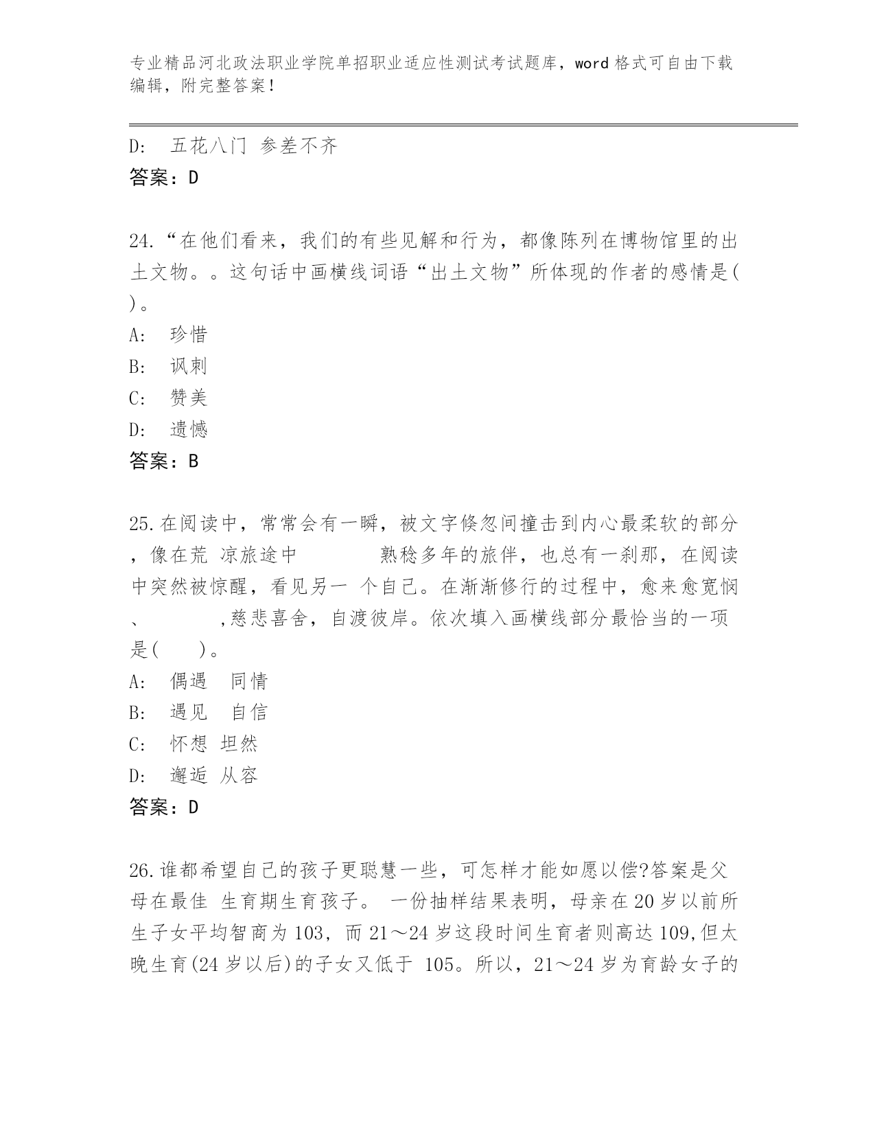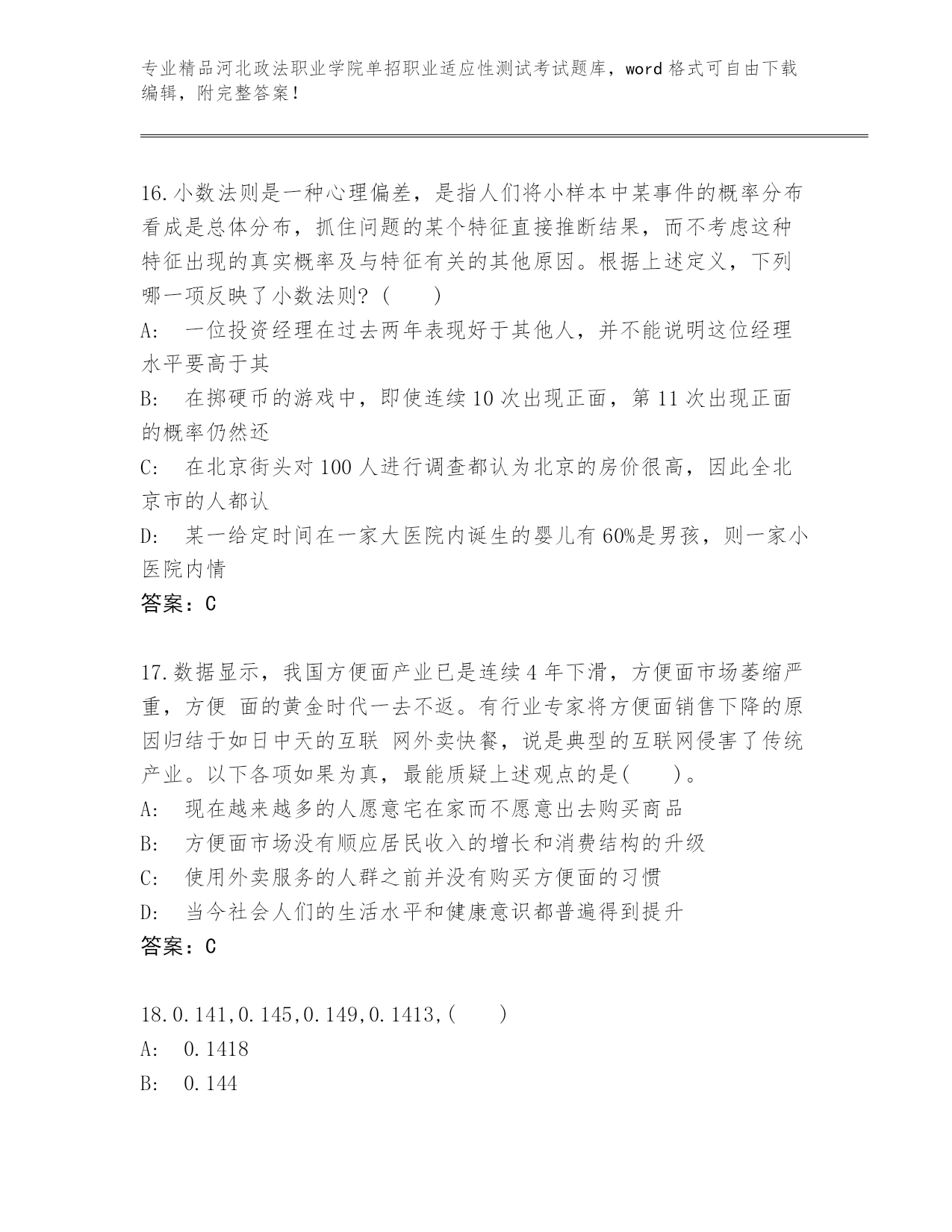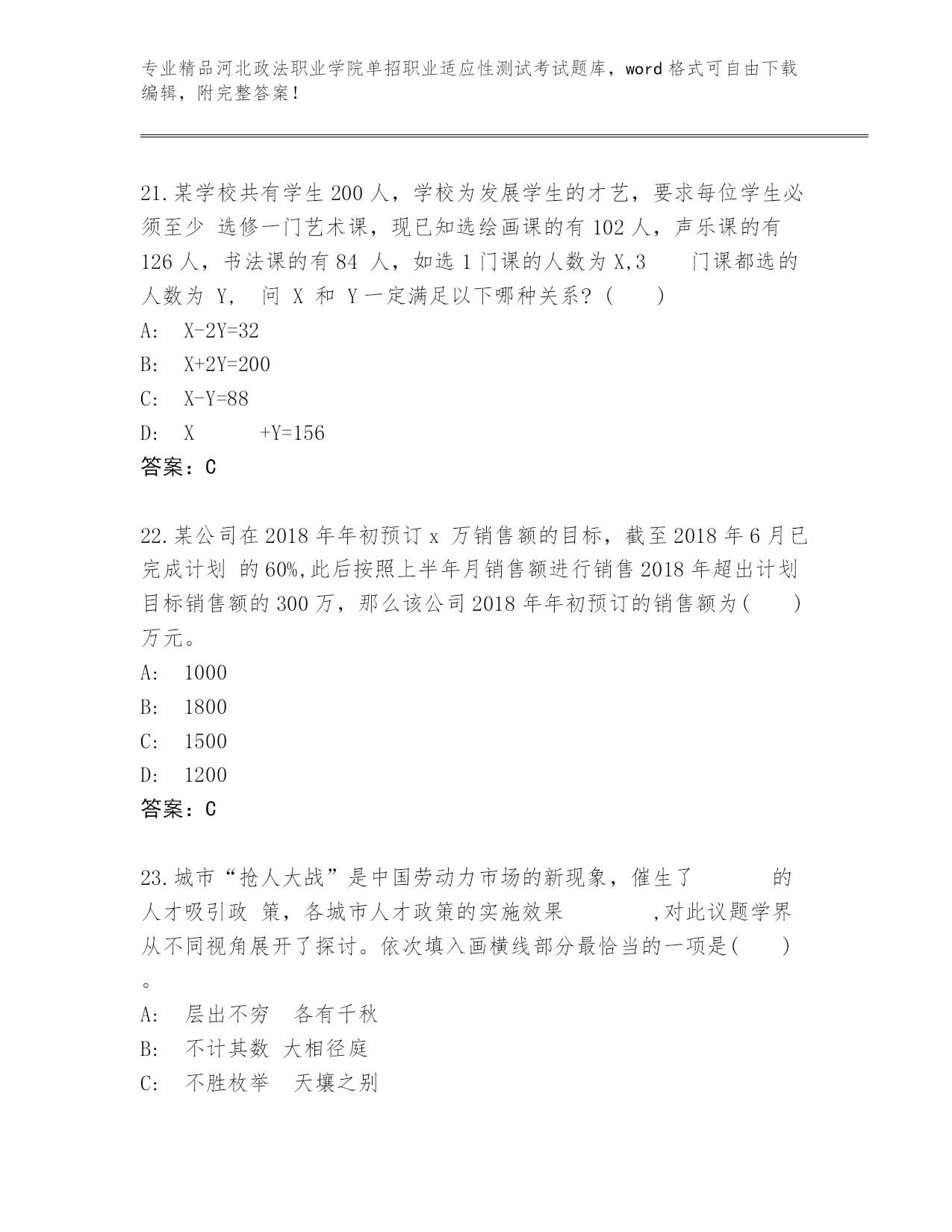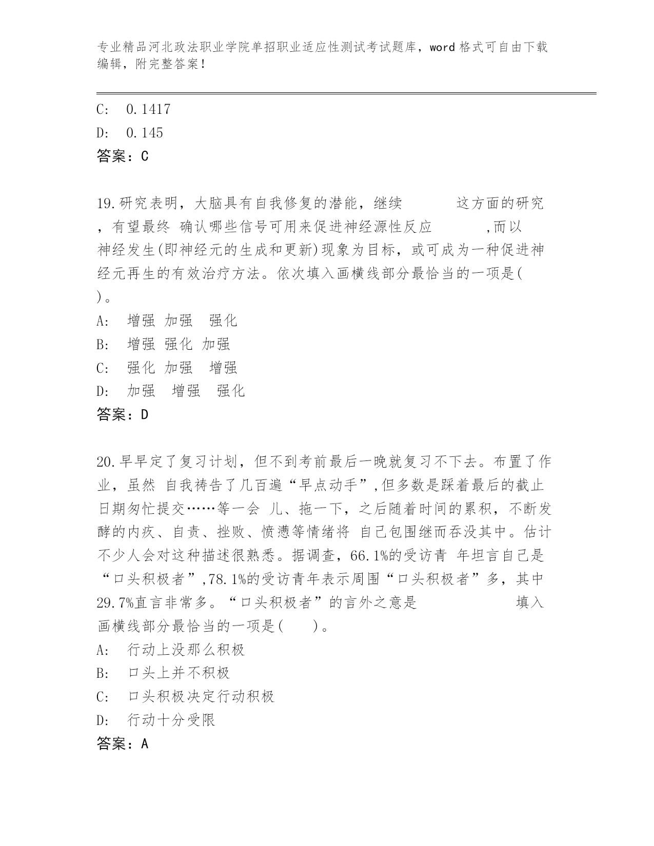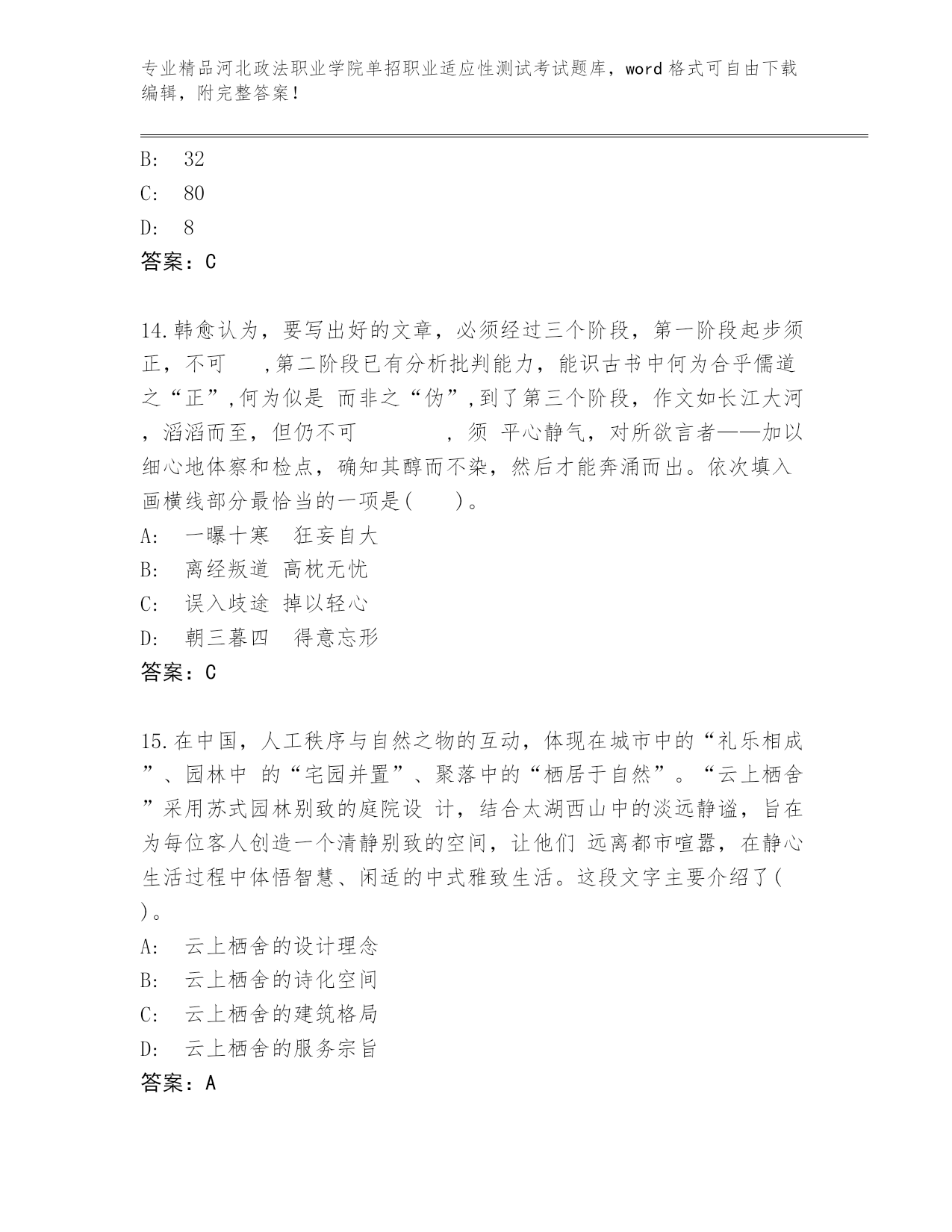 专业精品河北政法职业学院单招职业适应性测试考试题库,word格式可自由下载编辑,附完整答案!优选河北政法职业学院单招职业适应性测试考试优选题库及解析答案第I部分单选题(50题)1.利用诸如高密度脑电图和颅内记录等技术来近距离观察神经元之后,科学家发现,通常用于表征睡眠的慢波并不会在大脑的所有区域同时产生,而是局限于部分区域,而其余区域则观察不到。这一发现表明,同一时刻大脑各区域的睡眠状态并不一致,人类存在“局部睡眠”现象。下列选项如果为真,能削弱上述推论的是()。A:研究人员发现,在非快速眼动睡眠阶段,脑电图显示的全是低频的慢波B:梦游发生在深睡阶段,梦游者虽然能够活动,但大脑并不完全清醒C:高密度脑电图技术实现了大脑不同区域活动的高精度可视化D:人类自身的生理条件能让睡眠和清醒两种状态混合在一起答案:A2.与世界其他国家的青铜制品以武器和工具为主不同,西周的青铜器主要是各种生活(包括祭祀用的)器皿,武器与工具虽然为数不少,但并不显眼。西周青铜器根据用途的不同可分为食器、酒器、水器、乐器、兵器、生产工具等几大类。以食器、酒器、水器和乐器四类最为重要,它们大都用在祭天祀祖、朝会宴飨等礼仪场合,故称礼器。填入画横线部分最恰当的一项是()。A:西周青铜器主要用于礼仪场合B:西周青铜器的数量极多C:西周青铜器基本以礼器为主D:西周青铜器的种类很多答案:D3.近十多年来,我国学术界的剽窃丑闻屡见不鲜,其中有无名博士,也有知名教授,人数之多前所未有。闲来读史,发现我国古代剽窃的故事亦复不少,但剽窃者的胆量、手法似乎皆逊于今人。稍加钩稽,适可见剽窃一事始于何时,今昔对比,亦可知道德风尚之变迁。作为一种历史文化现象,以古鉴今,或不无启发。接下来作者最有可能要讲述的内容是()。A:介绍各界人士对剽窃的态度B:探究我国古代剽窃现象始于何时C:对近年来我国学术界剽窃丑闻的分析D:对剽窃行为进行批判,鼓励人们创新答案:B4.9,26,51,124,173,()A:294B:316C:216D:295答案:A5.书店在西汉长安就已经出现,记录汉长安城地方制度和文化风俗的《三辅货图》一书中,就有关于特殊的文化场所“槐市”的文字,据《艺文类聚》卷三八引文:“列槐树数百行为队,无墙屋,诸生朔望会此市,各持其郡所出货物及经传书记、笙罄乐器,相与买卖,雍容揖让,或议论槐下”,都城中有以槐树林为标志的专门设置的开放空间,国家官学的学生们在月初和月中聚会在这里,以家乡地方特产以及“经传书记、笙罄乐器”彼此交换,“相与买卖”,这样定时交易的图书和其他文化用品市场,参流通者是特定的人群,所谓“雍容揖让,论说槐下”,形容了这里特殊的文化气氛。这段文字主要介绍了()。A:古代有关书店的文献记录B:书店在汉朝时期的演变C:西汉时期书店的特殊用途D:汉长安城“槐市”的景象答案:D6.目前,我国影视外译活动丰富多彩,国家赞助体系下的影视翻译将影视作品的外译和传播推到了前所未有的广度和高度。商业翻译更加注重影视作品的商业属性,主要依据供求关系对影视作品进行翻译,有助于满足需求。影迷翻译可以成为国家赞助体系下的影视外译和商业外译的有益补充。这些不同的翻译模式,共同促进中国影视的跨境传播,将更多的中国影视佳作带给世界。这段文字重在说明的是()。A:不同翻译模式对中国影视境外传播的作用B:我国影视外译的基本模式C:我国影视外译的多元发展D:不同翻译模式所对应的不同文化传播主体答案:A7.干旱:减产()A:行动:目标B:自负:失败C:原因:结果D:锻炼:受伤答案:B8.按照古代先哲的“天然”或“自然”的观点来看,今天的生态系统退化是由人类掠夺式利用自然资源而引起的。如果没有现代化石燃料,生态系统中很多的物种不会消失得那么快,热带森林也会得以保存,全球变暖也不会提前那么早。接下来可能论证()。A:“人定胜天”观点的荒谬B:古代先哲的“天然”或“自然”的观点C:顺应自然、以自然修复为主的生态理念D:目前人类对自然的破坏已造成了极其恶劣的后果答案:C9.-3,-2,5,(),61,122A:27B:24C:31D:20答案:B10.1,3,2,5,9,44,()A:395B:121C:268D:88答案:A11.“德”在《老子》中占据重要的位置,它是沟通“道”与“万物”最重要的一环。借由“德”,“道”得以降落于万事万物之中。经过老子改造过的“德”,其内涵较西周时期有了巨大的变化。老子在使用“德”时,大多是针对人而言的。虽然人是万物中最具灵性的存在,但是人之“德”并非是固定不变的。这就要求人们要时刻注意修养自身的“德”。下列说法符合文意的是(