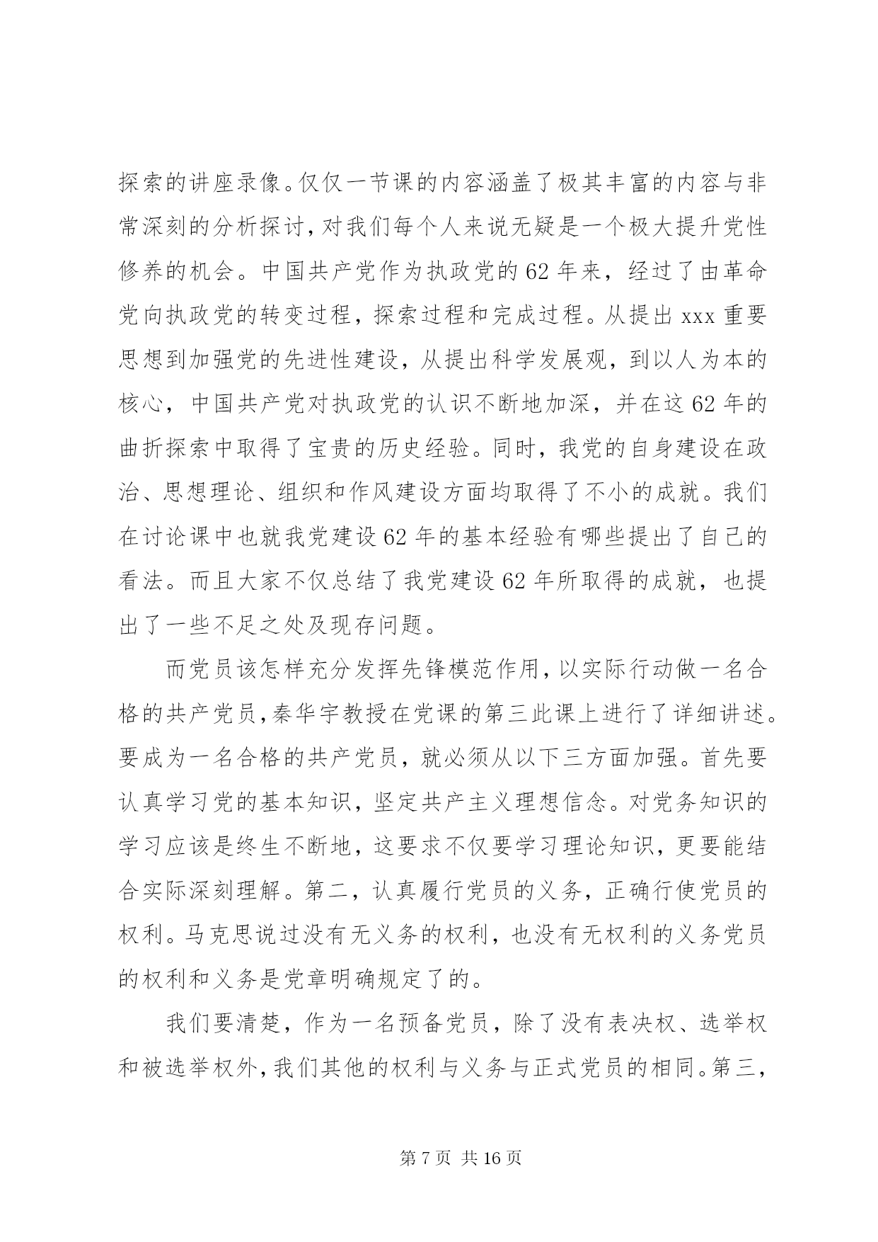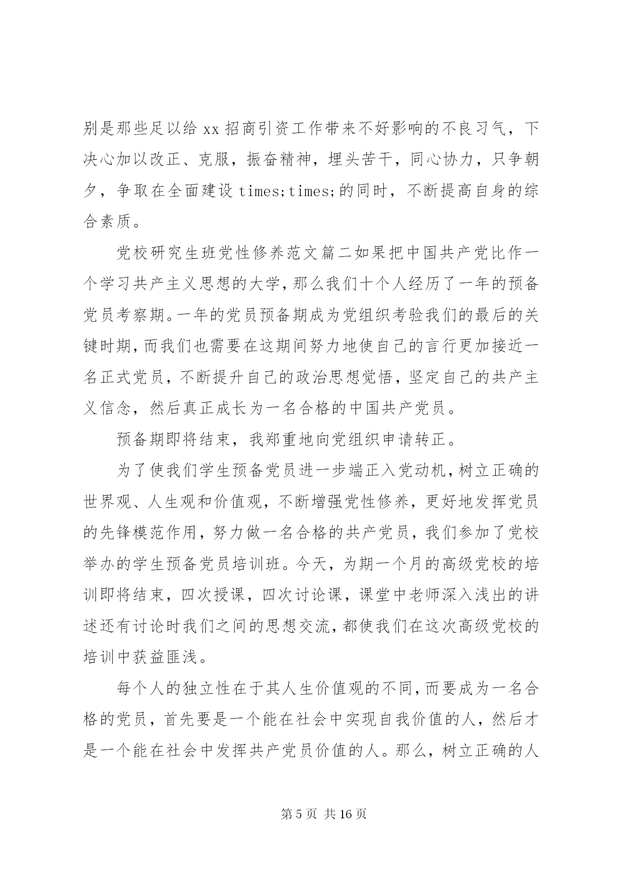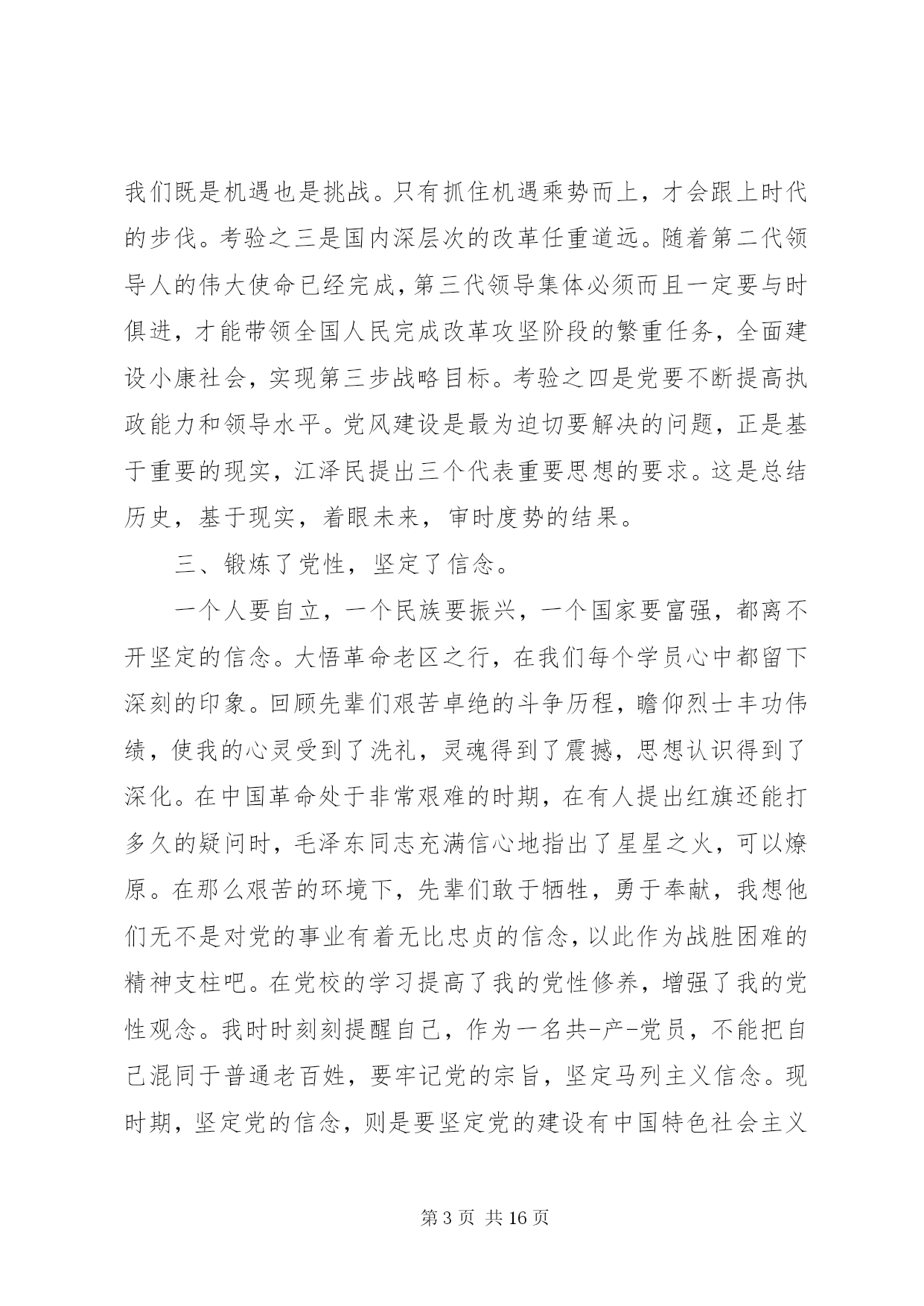 第PAGE\*Arabic\*MERGEFORMAT16页共NUMPAGES\*MERGEFORMAT16页党校研究生班党性修养党校研究生班党性修养范文篇一紧张、充实而又愉快的党校学习生活就要结束了,一年多来,在学校领导的亲切关怀下,在党校和组织部的精心安排下,在各位老师的悉心传授下,我系统学习了《马克思主义基本问题》、《毛泽东思想基本问题》、《邓小平理论基本问题》、《江泽民三个代表思想》等主要课程,涉猎了当代经济、当代科技、当代法律、当代军事以及当代思潮等多个学科,并分赴大悟、孝昌、应城、云梦等地进行了参观考察和社会调查活动,圆满完成了党校学业。系统的学习,使我在政治理论、党性修养和综合能力上得到了全面培训,更加坚定了马克思主义信仰、社会主义信念和建设中国特色社会主义的信心。这里,我简要汇报四点学习体会:一、提高了理论素养,夯实了理论基矗毛泽东思想、邓-小-平理论,是党在领导中国人民进行革命、建设和改革的过程中,把马克思列宁主义同中国实际相结合所产生的两大理论成果。在历史即将跨入21世纪的时候,以江泽民为核心的党的第三代领导集体,高举邓小平理论伟大旗帜,紧紧把握时代脉搏,在深刻总结党的80年历史经验的基础上,紧紧围绕在改革开放和发展社会主义市场经济条件下建设一个什么样的党、怎样建设党这个根本问题,提出了三个代表重要思想,即始终代表中国先进生产力的发展要求,代表中国先进文化的前进方向,代表中国最广大人民的根本利益。。继而又进一步提出提高党的执政能力和领导水平,提高拒腐防变和抵御风险能力这两大历史性课题,系统论述了三个代表重要思想。理论来自实践,科学的理论总是严格地以事实为依据,并在实践中不断接受检验,在实践中不断修正、丰富和发展。实践三个代表,则要在实践中坚持解放思想、实事求是、与时俱进,这是三个代表的精髓所在。在今后的工作中,我要努力的把学到的理论知识同解决主客观实际问题结合起来,同自己的工作实践统一起来,认真研究工作中不断变化的情况、存在的问题,做到胸中有数,学而思,思而信,信而行。通过在行动中解放思想、实事求是、与时俱进,实践好三个代表。二、开阔了思路,拓宽了视野。三个代表重要思想具有与时俱进的创新精神,是我们党顺应时代潮流,把握历史大势的行动纲领。这形势大势便是我系统学习五当代,即当代经济、当代科技、当代法律、当代军事和当代思潮等课程的内容。通过学习,我丰富了知识,拓展了视野,对当前国际国内政治、经济和军事情况有了比较全面的了解,进一步认清了形势,明白了新世纪党面临着十分严峻的考验和挑战。考验之一是世界格局的变化。由单极走向多极,决定了未来世界的复杂多变,作为执政党的中国共产党必须与时俱进才能立于不败之地。考验之二是世界经济全球化。现代科技突飞猛进,这对我们既是机遇也是挑战。只有抓住机遇乘势而上,才会跟上时代的步伐。考验之三是国内深层次的改革任重道远。随着第二代领导人的伟大使命已经完成,第三代领导集体必须而且一定要与时俱进,才能带领全国人民完成改革攻坚阶段的繁重任务,全面建设小康社会,实现第三步战略目标。考验之四是党要不断提高执政能力和领导水平。党风建设是最为迫切要解决的问题,正是基于重要的现实,江泽民提出三个代表重要思想的要求。这是总结历史,基于现实,着眼未来,审时度势的结果。三、锻炼了党性,坚定了信念。一个人要自立,一个民族要振兴,一个国家要富强,都离不开坚定的信念。大悟革命老区之行,在我们每个学员心中都留下深刻的印象。回顾先辈们艰苦卓绝的斗争历程,瞻仰烈士丰功伟绩,使我的心灵受到了洗礼,灵魂得到了震撼,思想认识得到了深化。在中国革命处于非常艰难的时期,在有人提出红旗还能打多久的疑问时,毛泽东同志充满信心地指出了星星之火,可以燎原。在那么艰苦的环境下,先辈们敢于牺牲,勇于奉献,我想他们无不是对党的事业有着无比忠贞的信念,以此作为战胜困难的精神支柱吧。在党校的学习提高了我的党性修养,增强了我的党性观念。我时时刻刻提醒自己,作为一名共-产-党员,不能把自己混同于普通老百姓,要牢记党的宗旨,坚定马列主义信念。现时期,坚定党的信念,则是要坚定党的建设有中国特色社会主义事业的信念。为此,自己要树立正确的世界观、人生观、价值观和权力观,保持良好的政治心态。要立志有所作为,努力做有境界、有智慧、有勇气、有分寸的四有型青年。要淡泊名利,懂得作为一名青年干部,取得成绩,是一件很不容易的事,这里面有个人努力的结果,但更多的是凝结了组织和群众的心血,一定要十分珍惜组织和群众的信任,一定要十分珍惜为人民服务的机会和岗位,一定要对组织、对群众,也对自己负责,好自为之,走好每一步,做到常在河边走,就是不湿鞋。要在复杂多变、充满诱-惑的特殊社会环境中,既成就事业,又健康成长。四、丰富了思维方法,培养了战略思维能力。系统