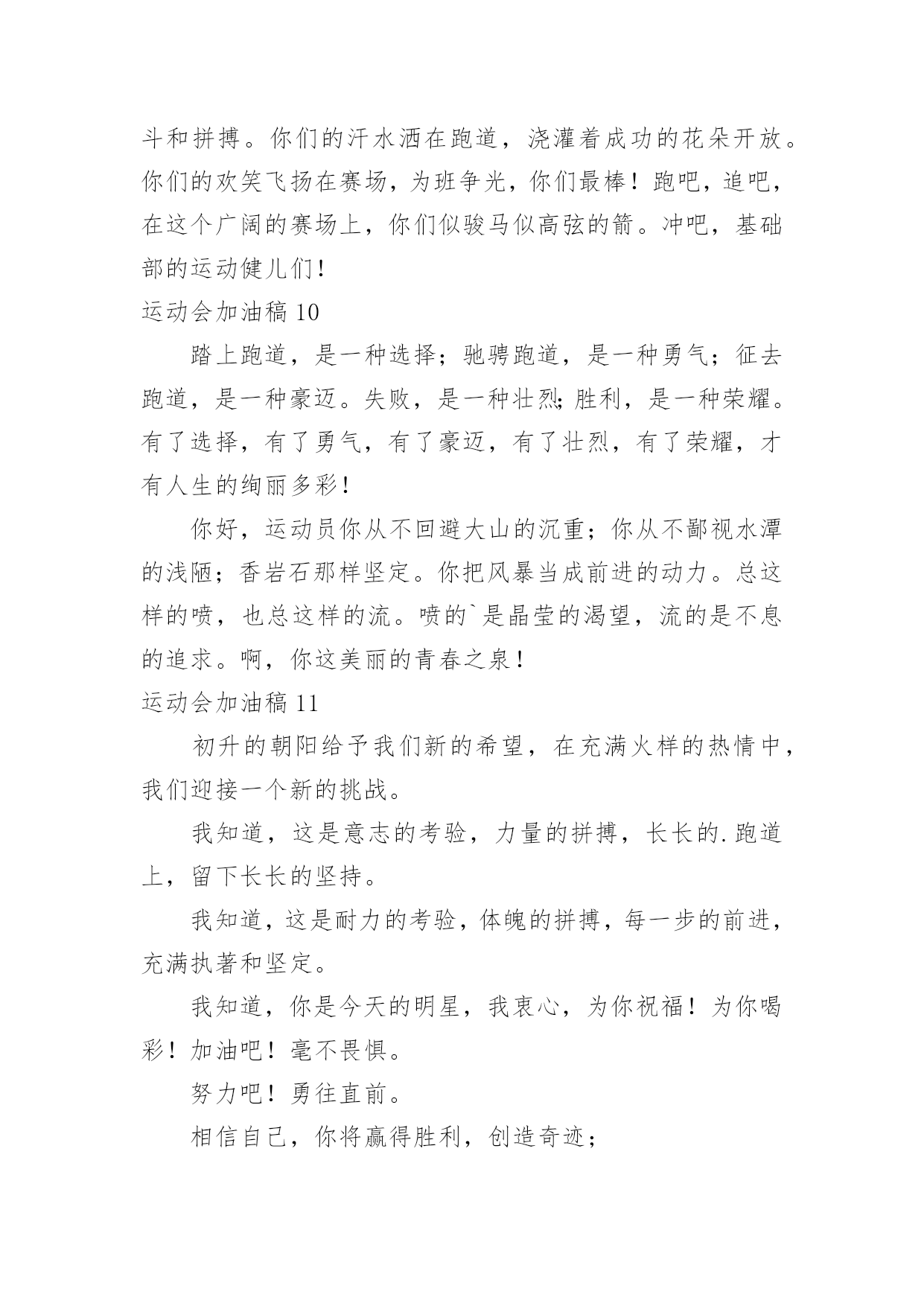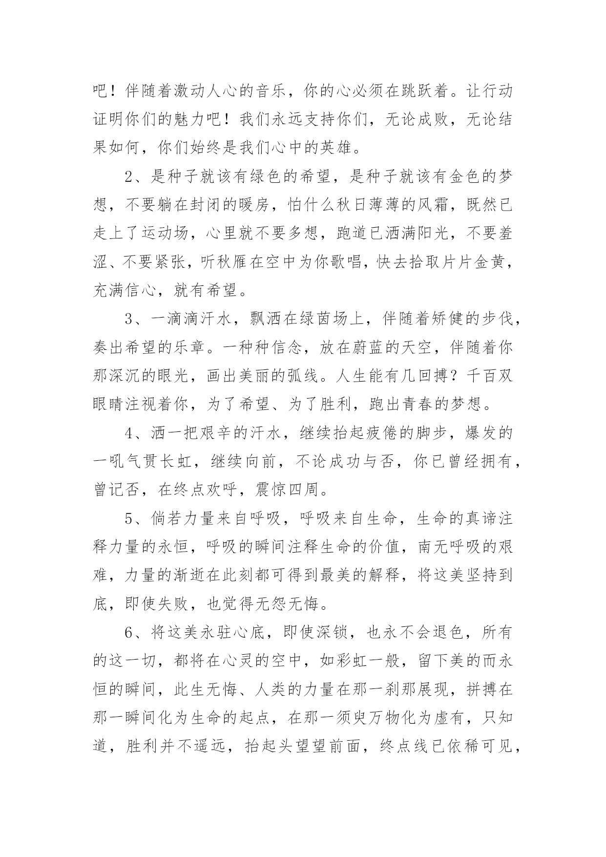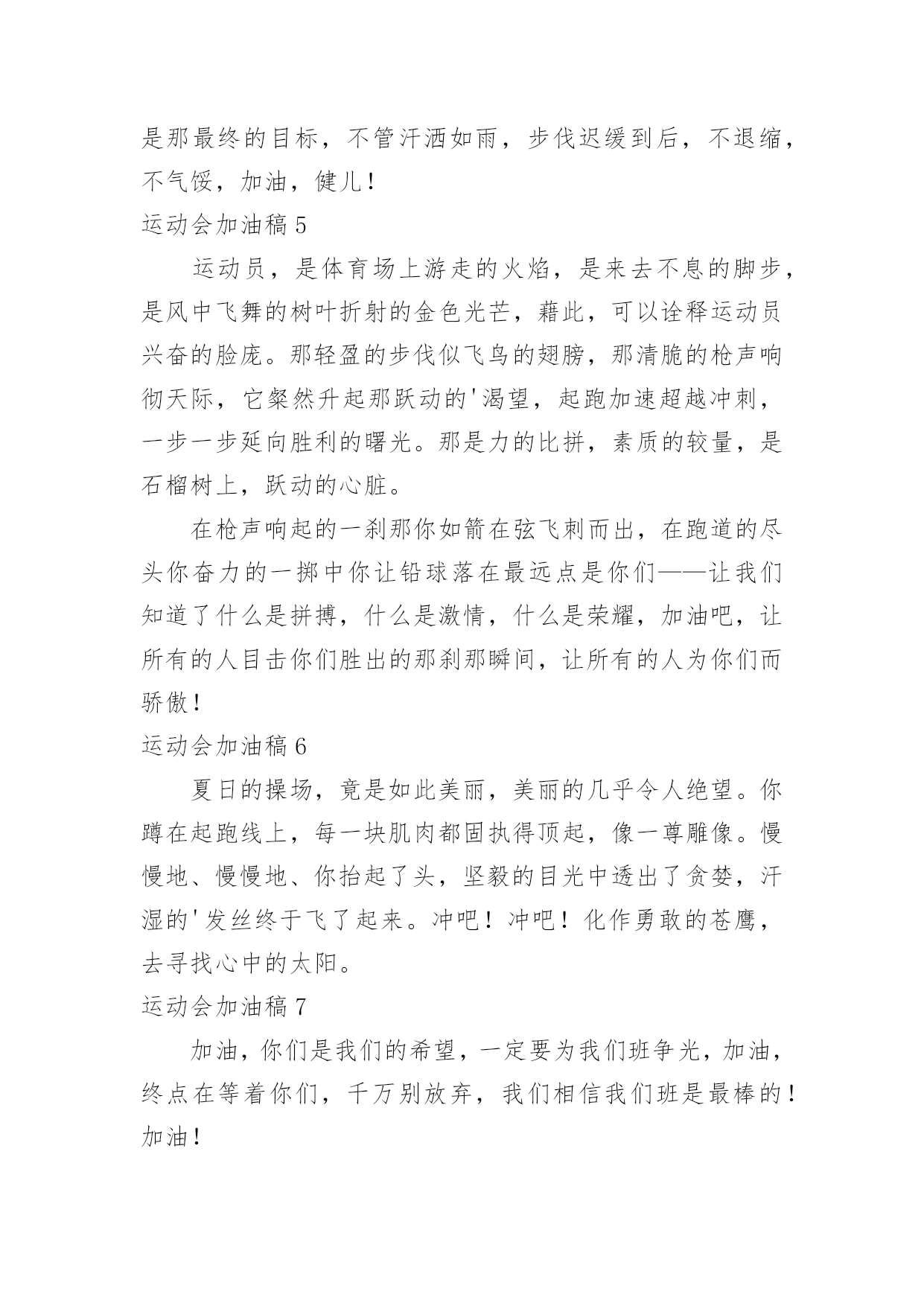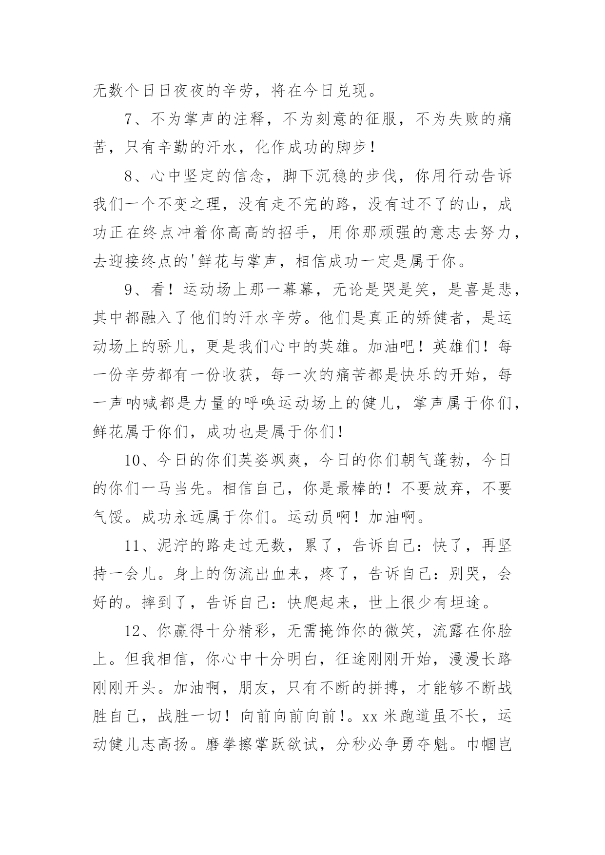 运动会加油稿运动会加油稿在我们平凡的日常里,我们都跟加油稿有着直接或间接的联系,加油稿可以给予对方克服困难的勇气和信心。大家知道加油稿怎么写才正确吗?以下是小编精心整理的运动会加油稿,仅供参考,欢迎大家阅读。运动会加油稿11、致运动员,是体育场上游走的火焰,是来去不息的脚步,是风中飞舞的树叶折射的金色光芒,藉此,能够诠释运动员兴奋的脸庞。那轻盈的步伐似飞鸟的翅膀,那清脆的枪声响彻天际,它粲然升起那跃动的渴望,起跑加速超越冲刺,一步一步延向胜利的曙光。那是力的比拼,素质的较量,是石榴树上,跃动的心脏。2、超越对手,超越自我,是我们的目标,是我们的信念,在清凉的初冬,在喧嚣的田径场上,你们点燃了似火的热情,无论成败,我们都为你们感到自豪,你们永远是我们的骄傲!3、在枪声响起的一刹那你如箭在弦飞刺而出,在跑道的尽头你奋力的一掷中你让铅球落在最远点是你们——让我们明白了什么是拼搏,是们是激情是们是荣耀加油吧,让所有的人目击你们胜出的那刹那瞬间,让所有的人为你们而骄傲。4、每一份辛劳都有一份收获,每一次的痛苦都是快乐的开始,没一声呐喊都是力量的呼唤。我们有着大浪拍岸的豪迈,所以你不必在乎小荷初露的恬静,我们有着春日的阳光明媚,所以不用去羡慕冬日乱玉碎琼,我们是雨天的一把伞,是寒冷冬日里的一盆碳火,温暖的不只是你我,而是大家的心。运动场上的健儿,掌声属于你们,鲜花属于你们,成功也是属于你们!5、在今日的赛场上,我只是个场边的看客。我用眼睛见证了赛场上的是非成败,用心灵感受了运动员的喜怒哀乐。他坚持跑完全程,我学到了坚持的可贵,他摔倒了再站起来,我学会了不怕失败的勇气。场上每一个点滴,都如此的震撼我的心灵。在今日的赛场上,我只是个场边的看客,但我学到了很多。6、在同一片晴空下,我们相聚一齐,或欢乐、或失落、或兴奋、或悲伤,尽数写在我们的脸旁。我们曾一齐悲伤,在那个败北的沙坑上;我们也一齐击掌,在这红色的跑道上。在同一片晴空下,我们拼搏,为美丽的目标;我们奋斗,为班级的辉煌。这就是团结、奋进、礼貌的xx班。7、在这激动的时刻,白云露出了笑脸,太阳为你们而高照。亲爱的运动员们,为了你们的目标而努力向前冲吧!只要你们相信自己能行,我想:胜利的到来就离你们不远了。冲吧,运动员们,我们会为你们呐喊,会为你们加油的,记住,前面的'胜利旗永远为你们而准备的。8、“沙场秋点兵”的壮阔,想必给了我们难以言喻的激情。于是,我放下手中的笔,去感受脉搏与心跳的激烈。在期盼中,在意料中,是悲是喜,是欢是狂,都未可知,但可知的是我们拥有这样一场运动盛会。9、奥林匹克精神佳,运动健将拼搏强。在运动场上的运动健儿们,发挥你们的特长,展示你们的风采,让你们的身影在运动场上留下优美的风景线,让你们的雄心壮志在运动场上发挥的淋漓尽致。10、青春是不老的誓言,飞扬是年轻的梦想,金色的十月,让我们在这长长的跑道上青春飞扬,现出飒爽的风姿,亮出真我的风采,带上同学们的热情,载着同伴们的期望,背负老师的嘱托,在这活力四射的校园里,放飞你的青春活力和运动激情。运动会加油稿2一声枪响班着飒爽的秋风,你们亮出自己的风采,在这短短的100米中,你们与时间争分夺秒,只为了那最后的冲刺。不管结果如何,你们都是胜利者。因为,你们曾与时间竞赛。致长跑运动员磨炼的是非凡的毅力,较量的是超常的体力,拼搏的是出类拔萃的耐力.把长长的'跑道跑成一段漫漫的征途,听!呼啸的风在为你喝彩,看!猎猎的彩旗在为你加油,加油吧!为了到达终点时那一刻的辉煌!运动会加油稿3在起跑线上胡华港连续支付歌曲,攻击和铆钉你健美肌肉蕴含爆发力自信的眼神充满自信枪走火了你开始了一段短暂的旅程在笔直的`跑道上有你稳定的脚印离终点不远冲刺时会给你留下一个锋利的背部开始掌声将为你响起开始胜利和鲜花终将属于你运动会加油稿41、青春在飞扬,个性在张扬,运动场上的运动健儿们,拿出你们的热情,拿出你们的自信,让运动展现你们的风采吧!伴随着激动人心的音乐,你的心必须在跳跃着。让行动证明你们的魅力吧!我们永远支持你们,无论成败,无论结果如何,你们始终是我们心中的英雄。2、是种子就该有绿色的希望,是种子就该有金色的梦想,不要躺在封闭的暖房,怕什么秋日薄薄的风霜,既然已走上了运动场,心里就不要多想,跑道已洒满阳光,不要羞涩、不要紧张,听秋雁在空中为你歌唱,快去拾取片片金黄,充满信心,就有希望。3、一滴滴汗水,飘洒在绿茵场上,伴随着矫健的步伐,奏出希望的乐章。一种种信念,放在蔚蓝的天空,伴随着你那深沉的眼光,画出美丽的弧线。人生能有几回搏?千百双眼睛注视着你,为了希望、为了胜利,跑出青春的梦想。4、洒一把艰辛的汗水,继续抬起疲倦的脚步,爆发的一吼气贯长虹,继续向前,不论成功与否,你已曾经拥有,曾记否,在终点欢呼,震惊四周。5、倘若力量来自呼吸,呼吸来自生命