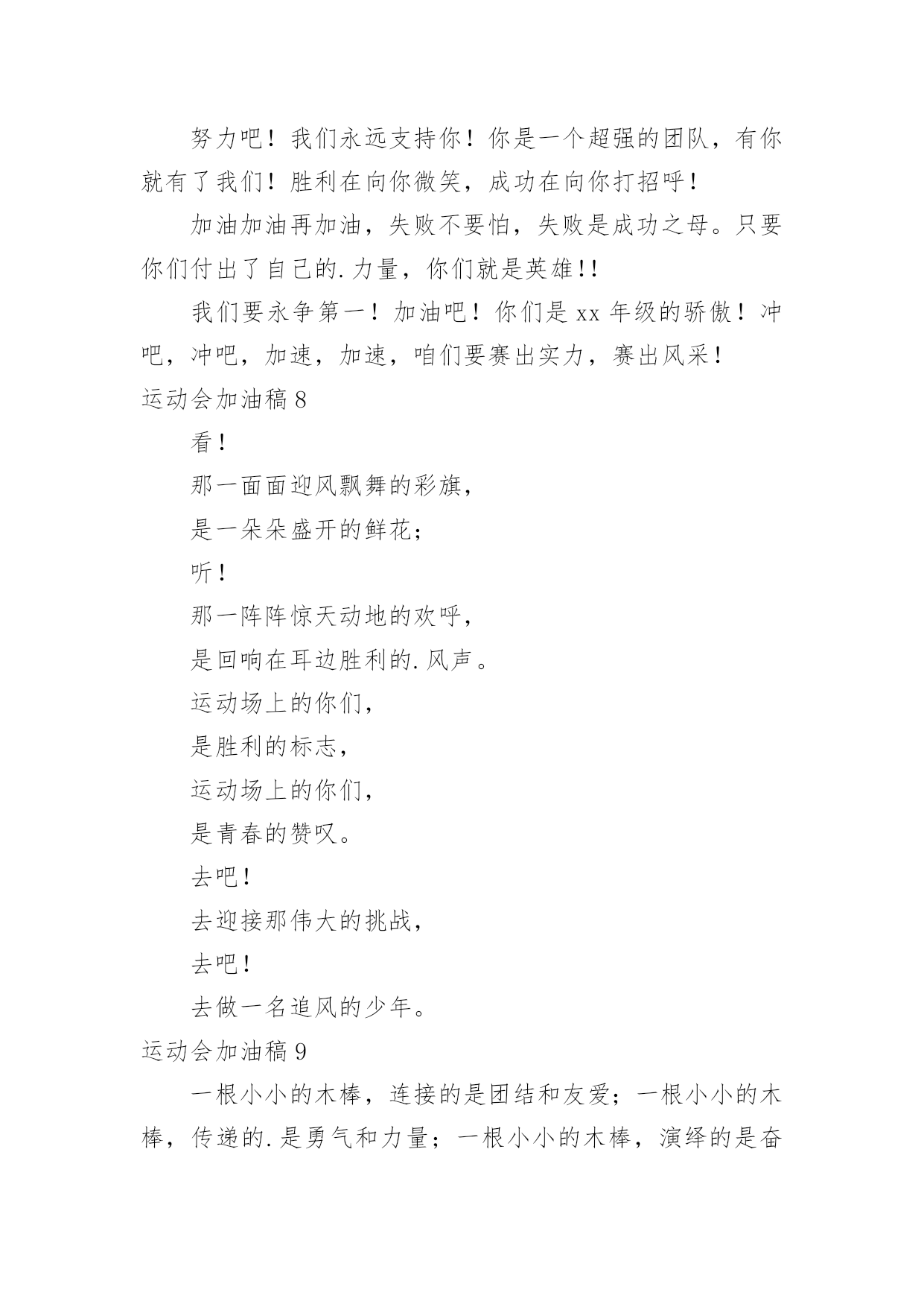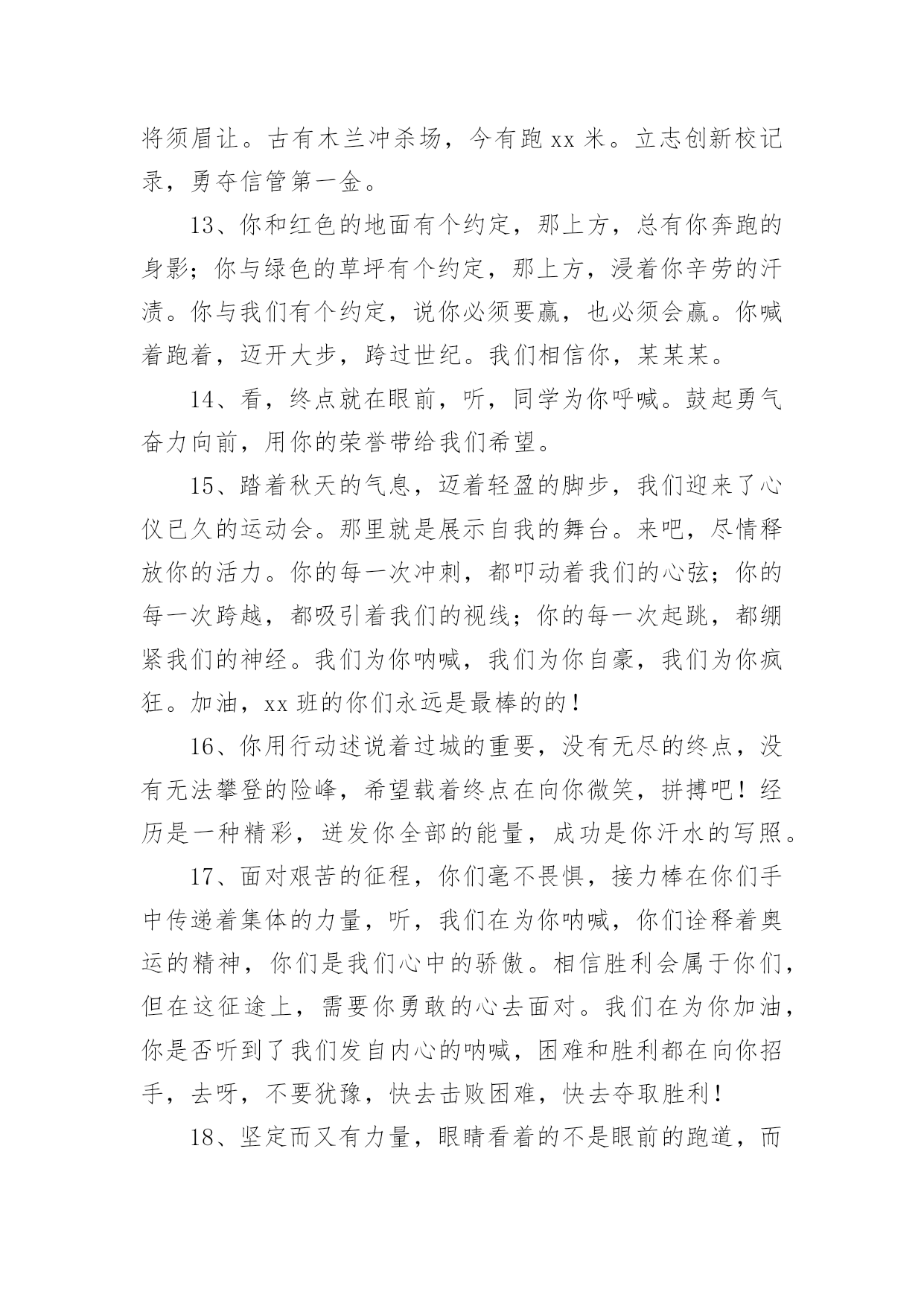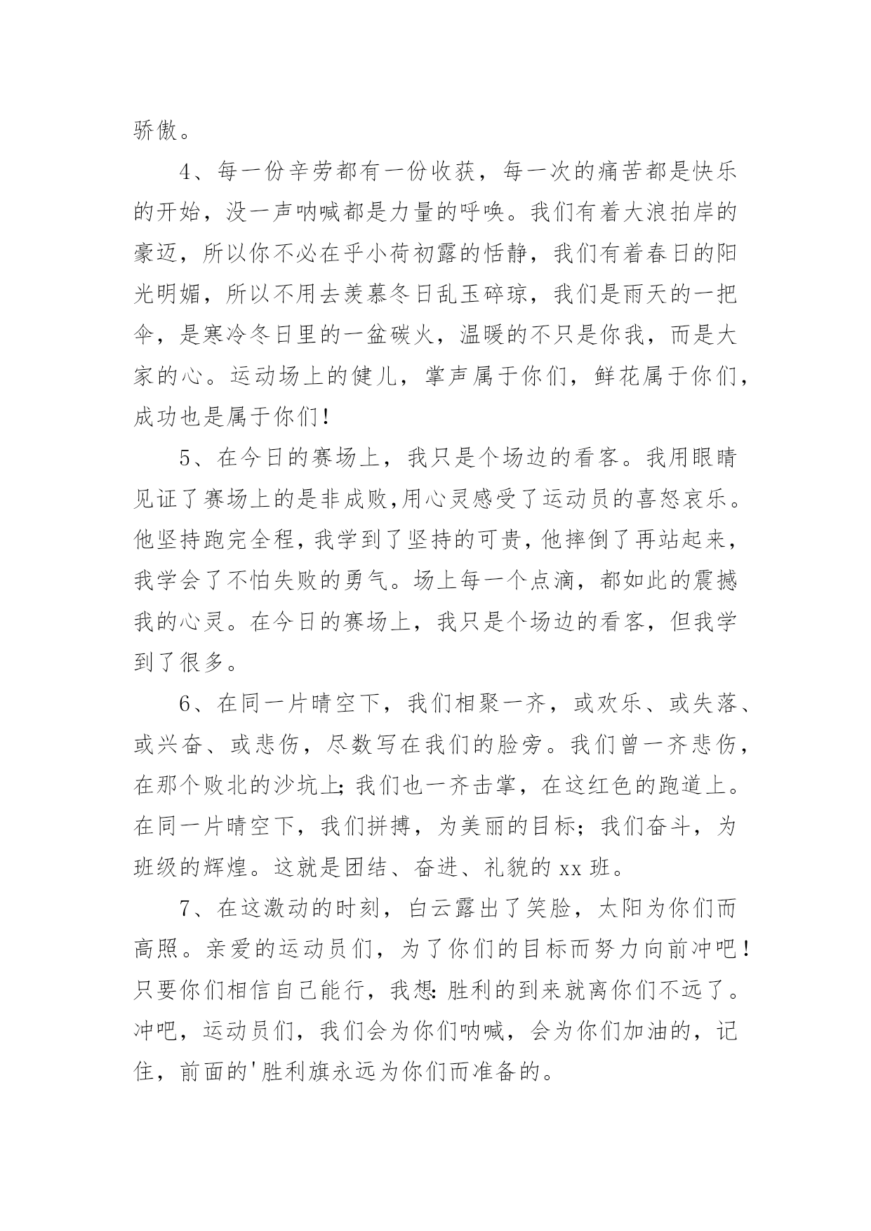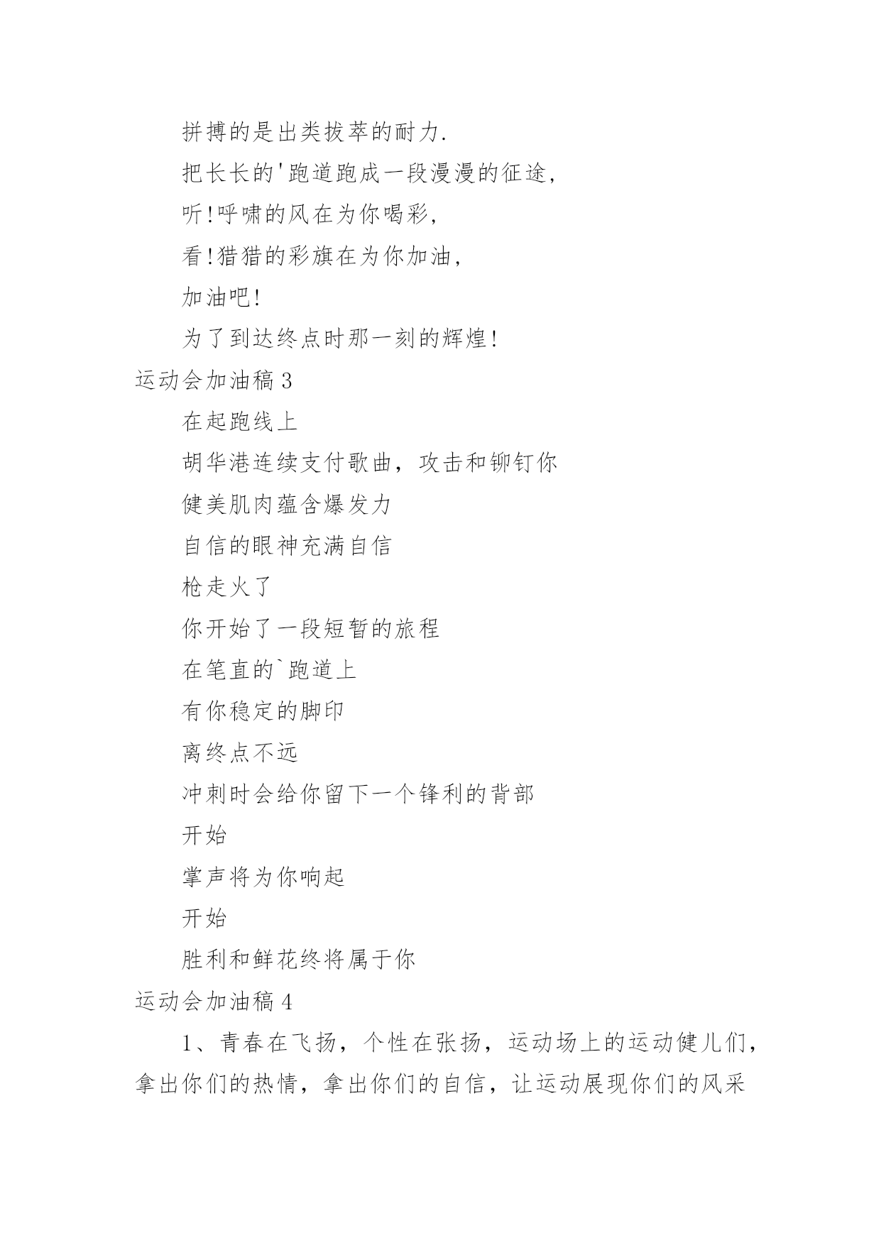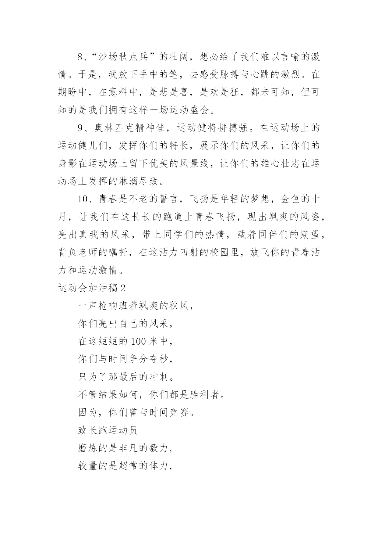 运动会加油稿运动会加油稿在我们平凡的日常里,我们都跟加油稿有着直接或间接的联系,加油稿可以给予对方克服困难的勇气和信心。大家知道加油稿怎么写才正确吗?以下是小编精心整理的运动会加油稿,仅供参考,欢迎大家阅读。运动会加油稿11、致运动员,是体育场上游走的火焰,是来去不息的脚步,是风中飞舞的树叶折射的金色光芒,藉此,能够诠释运动员兴奋的脸庞。那轻盈的步伐似飞鸟的翅膀,那清脆的枪声响彻天际,它粲然升起那跃动的渴望,起跑加速超越冲刺,一步一步延向胜利的曙光。那是力的比拼,素质的较量,是石榴树上,跃动的心脏。2、超越对手,超越自我,是我们的目标,是我们的信念,在清凉的初冬,在喧嚣的田径场上,你们点燃了似火的热情,无论成败,我们都为你们感到自豪,你们永远是我们的骄傲!3、在枪声响起的一刹那你如箭在弦飞刺而出,在跑道的尽头你奋力的一掷中你让铅球落在最远点是你们——让我们明白了什么是拼搏,是们是激情是们是荣耀加油吧,让所有的人目击你们胜出的那刹那瞬间,让所有的人为你们而骄傲。4、每一份辛劳都有一份收获,每一次的痛苦都是快乐的开始,没一声呐喊都是力量的呼唤。我们有着大浪拍岸的豪迈,所以你不必在乎小荷初露的恬静,我们有着春日的阳光明媚,所以不用去羡慕冬日乱玉碎琼,我们是雨天的一把伞,是寒冷冬日里的一盆碳火,温暖的不只是你我,而是大家的心。运动场上的健儿,掌声属于你们,鲜花属于你们,成功也是属于你们!5、在今日的赛场上,我只是个场边的看客。我用眼睛见证了赛场上的是非成败,用心灵感受了运动员的喜怒哀乐。他坚持跑完全程,我学到了坚持的可贵,他摔倒了再站起来,我学会了不怕失败的勇气。场上每一个点滴,都如此的震撼我的心灵。在今日的赛场上,我只是个场边的看客,但我学到了很多。6、在同一片晴空下,我们相聚一齐,或欢乐、或失落、或兴奋、或悲伤,尽数写在我们的脸旁。我们曾一齐悲伤,在那个败北的沙坑上;我们也一齐击掌,在这红色的跑道上。在同一片晴空下,我们拼搏,为美丽的目标;我们奋斗,为班级的辉煌。这就是团结、奋进、礼貌的xx班。7、在这激动的时刻,白云露出了笑脸,太阳为你们而高照。亲爱的运动员们,为了你们的目标而努力向前冲吧!只要你们相信自己能行,我想:胜利的到来就离你们不远了。冲吧,运动员们,我们会为你们呐喊,会为你们加油的,记住,前面的'胜利旗永远为你们而准备的。8、“沙场秋点兵”的壮阔,想必给了我们难以言喻的激情。于是,我放下手中的笔,去感受脉搏与心跳的激烈。在期盼中,在意料中,是悲是喜,是欢是狂,都未可知,但可知的是我们拥有这样一场运动盛会。9、奥林匹克精神佳,运动健将拼搏强。在运动场上的运动健儿们,发挥你们的特长,展示你们的风采,让你们的身影在运动场上留下优美的风景线,让你们的雄心壮志在运动场上发挥的淋漓尽致。10、青春是不老的誓言,飞扬是年轻的梦想,金色的十月,让我们在这长长的跑道上青春飞扬,现出飒爽的风姿,亮出真我的风采,带上同学们的热情,载着同伴们的期望,背负老师的嘱托,在这活力四射的校园里,放飞你的青春活力和运动激情。运动会加油稿2一声枪响班着飒爽的秋风,你们亮出自己的风采,在这短短的100米中,你们与时间争分夺秒,只为了那最后的冲刺。不管结果如何,你们都是胜利者。因为,你们曾与时间竞赛。致长跑运动员磨炼的是非凡的毅力,较量的是超常的体力,拼搏的是出类拔萃的耐力.把长长的'跑道跑成一段漫漫的征途,听!呼啸的风在为你喝彩,看!猎猎的彩旗在为你加油,加油吧!为了到达终点时那一刻的辉煌!运动会加油稿3在起跑线上胡华港连续支付歌曲,攻击和铆钉你健美肌肉蕴含爆发力自信的眼神充满自信枪走火了你开始了一段短暂的旅程在笔直的`跑道上有你稳定的脚印离终点不远冲刺时会给你留下一个锋利的背部开始掌声将为你响起开始胜利和鲜花终将属于你运动会加油稿41、青春在飞扬,个性在张扬,运动场上的运动健儿们,拿出你们的热情,拿出你们的自信,让运动展现你们的风采吧!伴随着激动人心的音乐,你的心必须在跳跃着。让行动证明你们的魅力吧!我们永远支持你们,无论成败,无论结果如何,你们始终是我们心中的英雄。2、是种子就该有绿色的希望,是种子就该有金色的梦想,不要躺在封闭的暖房,怕什么秋日薄薄的风霜,既然已走上了运动场,心里就不要多想,跑道已洒满阳光,不要羞涩、不要紧张,听秋雁在空中为你歌唱,快去拾取片片金黄,充满信心,就有希望。3、一滴滴汗水,飘洒在绿茵场上,伴随着矫健的步伐,奏出希望的乐章。一种种信念,放在蔚蓝的天空,伴随着你那深沉的眼光,画出美丽的弧线。人生能有几回搏?千百双眼睛注视着你,为了希望、为了胜利,跑出青春的梦想。4、洒一把艰辛的汗水,继续抬起疲倦的脚步,爆发的一吼气贯长虹,继续向前,不论成功与否,你已曾经拥有,曾记否,在终点欢呼,震惊四周。5、倘若力量来自呼吸,呼吸来自生命
