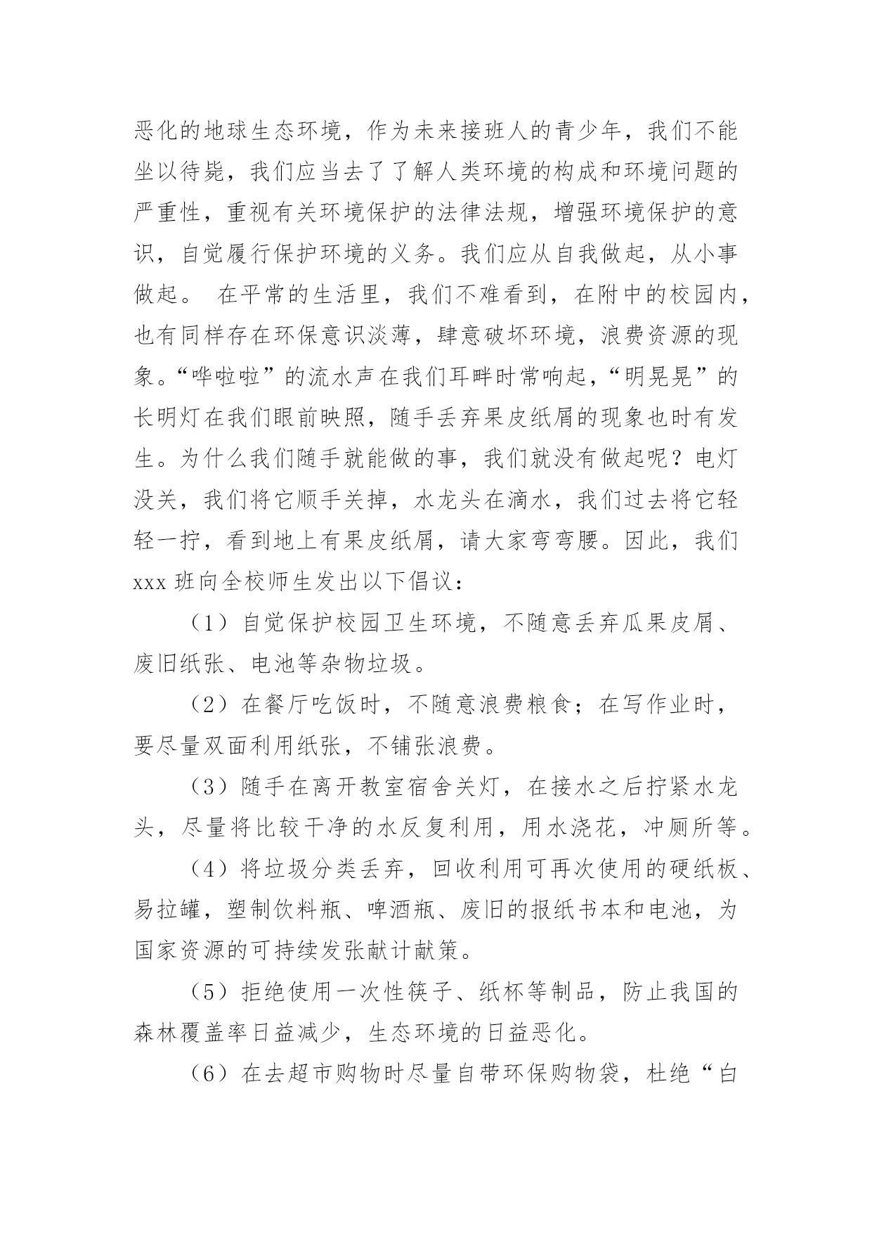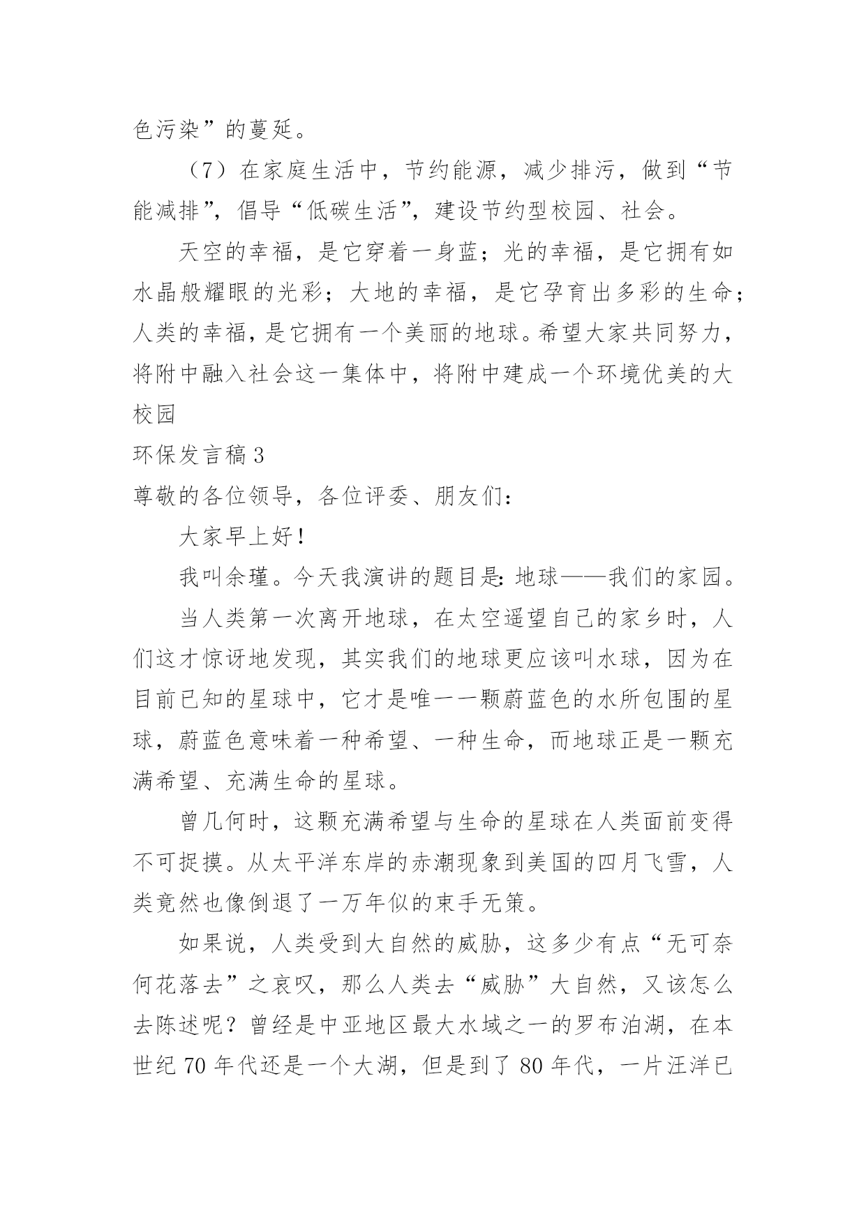 环保发言稿环保发言稿随着社会一步步向前发展,越来越多人会去使用发言稿,发言稿可以帮助发言者更好的表达。怎样写发言稿才能更好地发挥其做用呢?下面是小编收集整理的环保发言稿,欢迎大家借鉴与参考,希望对大家有所帮助。环保发言稿1各位花草树木、水沟河流……们:大家好!我相信大家对我不陌生吧,我就是百年前聚会时的小河呀!那时的我呀,年轻气盛,无人能比,就连智多识广的大海老爷爷也比不过我!可是现在,大家肯定认不出我了吧?我是不是很像刚挖开的黑水沟小弟弟呀?大家看看我吧!现已患了“哮喘”,说话大喘气,上次呀,我还差点得了“癌症”,而且我现在还染上了“河皮癣”!再看看我的衣服吧!有的东西在我身上待了好几年了,看一看啊,他们人类把我点的“五彩缤纷”:这是七月前一个老婆婆的塑料袋;这是一年前一个小孩“送”给我的可口可乐;这是三年前一个农民随手扔下的坏猪肉,现在都被泡涨了……看一看,还哪有一百年前那矫健、清澈、可爱的身影啊!要知道,以前人们在我身上嬉水,在我肚中游泳……七年前的一天,在离岸不远的地方开了一家油漆场,夜晚,总在些人偷偷摸摸的挖着“地道”。有一天那地道通到了我身边,并且接上了一根粗管子,我好奇的朝里看了一下,突然一阵恶臭扑鼻而来,我立即缩头,这时,一阵黑水一下涌出……从那以后,人们不再嬉水、游泳,久而抱怨、污染起我来,要知道害我的人是你们呀!啊,我真希望人们改过自新,不再污染、破坏我们,让我们永远清澈!谢谢大家,我的演讲完毕!环保发言稿2敬爱的老师,亲爱的同学们:大家好!今天我演讲的题目是《环保在我心》。绿树,红叶,青山,蓝天,是大自然赋予人类世界的美妙绝伦的事物。而如今,树已不再苍翠,山已不再青秀,天空也不再湛蓝,这一切都是人类自己酿成的后果。奔腾的河流是大地母亲的血管,河水好似流淌的血液,它有一种神奇的力量,流到哪里,哪里就充满生机,人类择水而居,河流便成了人类生存的依托。可是,今天呢?许多河流生病了,清澈的河水变得又黑又臭,河水里的鱼虾也早已逃之夭夭了!我们同样不会忘记每年春季来自内蒙古的沙尘暴,不会忘记xxxx年那场特大洪水,更不会忘记达到pm2.5的城市越来越少。面对日益恶化的地球生态环境,作为未来接班人的青少年,我们不能坐以待毙,我们应当去了了解人类环境的构成和环境问题的严重性,重视有关环境保护的法律法规,增强环境保护的意识,自觉履行保护环境的义务。我们应从自我做起,从小事做起。在平常的生活里,我们不难看到,在附中的校园内,也有同样存在环保意识淡薄,肆意破坏环境,浪费资源的现象。“哗啦啦”的流水声在我们耳畔时常响起,“明晃晃”的长明灯在我们眼前映照,随手丢弃果皮纸屑的现象也时有发生。为什么我们随手就能做的事,我们就没有做起呢?电灯没关,我们将它顺手关掉,水龙头在滴水,我们过去将它轻轻一拧,看到地上有果皮纸屑,请大家弯弯腰。因此,我们xxx班向全校师生发出以下倡议:(1)自觉保护校园卫生环境,不随意丢弃瓜果皮屑、废旧纸张、电池等杂物垃圾。(2)在餐厅吃饭时,不随意浪费粮食;在写作业时,要尽量双面利用纸张,不铺张浪费。(3)随手在离开教室宿舍关灯,在接水之后拧紧水龙头,尽量将比较干净的水反复利用,用水浇花,冲厕所等。(4)将垃圾分类丢弃,回收利用可再次使用的硬纸板、易拉罐,塑制饮料瓶、啤酒瓶、废旧的报纸书本和电池,为国家资源的可持续发张献计献策。(5)拒绝使用一次性筷子、纸杯等制品,防止我国的森林覆盖率日益减少,生态环境的日益恶化。(6)在去超市购物时尽量自带环保购物袋,杜绝“白色污染”的蔓延。(7)在家庭生活中,节约能源,减少排污,做到“节能减排”,倡导“低碳生活”,建设节约型校园、社会。天空的幸福,是它穿着一身蓝;光的幸福,是它拥有如水晶般耀眼的光彩;大地的幸福,是它孕育出多彩的生命;人类的幸福,是它拥有一个美丽的地球。希望大家共同努力,将附中融入社会这一集体中,将附中建成一个环境优美的大校园环保发言稿3尊敬的各位领导,各位评委、朋友们:大家早上好!我叫余瑾。今天我演讲的题目是:地球——我们的家园。当人类第一次离开地球,在太空遥望自己的家乡时,人们这才惊讶地发现,其实我们的地球更应该叫水球,因为在目前已知的星球中,它才是唯一一颗蔚蓝色的水所包围的星球,蔚蓝色意味着一种希望、一种生命,而地球正是一颗充满希望、充满生命的星球。曾几何时,这颗充满希望与生命的星球在人类面前变得不可捉摸。从太平洋东岸的赤潮现象到美国的四月飞雪,人类竟然也像倒退了一万年似的束手无策。如果说,人类受到大自然的威胁,这多少有点“无可奈何花落去”之哀叹,那么人类去“威胁”大自然,又该怎么去陈述呢?曾经是中亚地区最大水域之一的罗布泊湖,在本世纪70年代还是一个大湖,但是到了80年代,一片汪洋已一去不返,被流沙所掩埋。这种人为造成的后果,怎不叫人痛惜?在对大