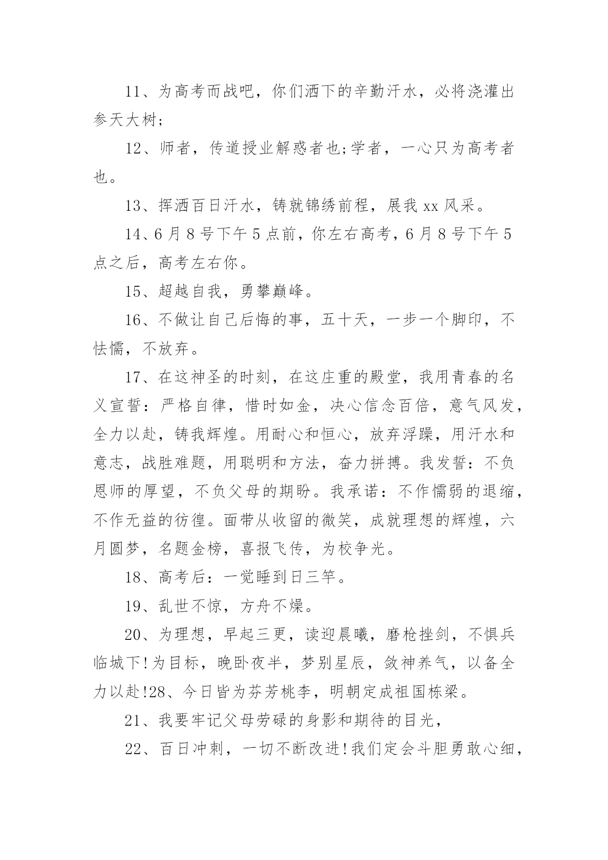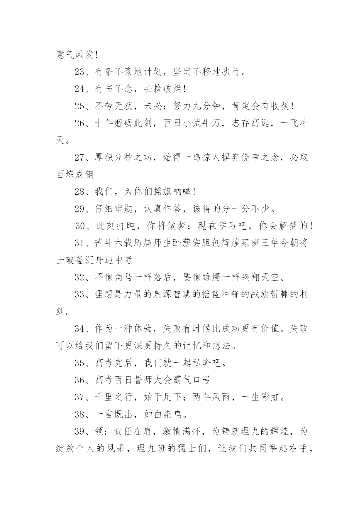 简短押韵的高考励志口号简短押韵的高考励志口号在日常学习、工作抑或是生活中,大家都对那些朗朗上口的口号很是熟悉吧,口号作为意识的表现形式之一,是对当时社会政治、经济、文化的一种反映,不同性质的口号起着不同的作用。那什么样的口号才算得上是经典呢?下面是小编精心整理的简短押韵的高考励志口号,欢迎大家分享。1、不想一辈子吃苦,就必须闻鸡起舞。2、翻卷龙旗,凛然生风;3、“同一个班级,同一个梦想”。同一个班级:就是我们有缘分在这个班级里面啊,大家来自各地,珍惜在一起的机会,共同见证一起奋斗的高三!同一个梦想:我们都是为了高考,为了自己的理想,大家在一起努力奋斗,为了年轻的梦想,为了实现人生的志向,我们拥有同一个梦想!4、高高兴兴走来,轻轻松松离去5、甘于奉献,燃烧激情。6、战斗战斗,顽强战斗。7、任何时候我始终相信,我可以!8、一样的道路,不一样的脚步。9、为高考,抛头颅,洒热血,满腔斗志拼六月。10、有志竟成,笃志好学。11、为高考而战吧,你们洒下的辛勤汗水,必将浇灌出参天大树;12、师者,传道授业解惑者也;学者,一心只为高考者也。13、挥洒百日汗水,铸就锦绣前程,展我xx风采。14、6月8号下午5点前,你左右高考,6月8号下午5点之后,高考左右你。15、超越自我,勇攀巅峰。16、不做让自己后悔的事,五十天,一步一个脚印,不怯懦,不放弃。17、在这神圣的时刻,在这庄重的殿堂,我用青春的名义宣誓:严格自律,惜时如金,决心信念百倍,意气风发,全力以赴,铸我辉煌。用耐心和恒心,放弃浮躁,用汗水和意志,战胜难题,用聪明和方法,奋力拼搏。我发誓:不负恩师的厚望,不负父母的期盼。我承诺:不作懦弱的退缩,不作无益的彷徨。面带从收留的微笑,成就理想的辉煌,六月圆梦,名题金榜,喜报飞传,为校争光。18、高考后:一觉睡到日三竿。19、乱世不惊,方舟不燥。20、为理想,早起三更,读迎晨曦,磨枪挫剑,不惧兵临城下!为目标,晚卧夜半,梦别星辰,敛神养气,以备全力以赴!28、今日皆为芬芳桃李,明朝定成祖国栋梁。21、我要牢记父母劳碌的身影和期待的目光,22、百日冲刺,一切不断改进!我们定会斗胆勇敢心细,意气风发!23、有条不紊地计划,坚定不移地执行。24、有书不念,去捡破烂!25、不劳无获,未必;努力九分钟,肯定会有收获!26、十年磨砺此剑,百日小试牛刀,志存高远,一飞冲天。27、厚积分秒之功,始得一鸣惊人摒弃侥幸之念,必取百炼成钢28、我们,为你们摇旗呐喊!29、仔细审题,认真作答,该得的分一分不少。30、此刻打盹,你将做梦;现在学习吧,你会解梦的!31、苦斗六载历届师生卧薪尝胆创辉煌寒窗三年今朝将士破釜沉舟迎中考32、不像角马一样落后,要像雄鹰一样翱翔天空。33、理想是力量的泉源智慧的摇篮冲锋的战旗斩棘的利剑。34、作为一种体验,失败有时候比成功更有价值。失败可以给我们留下更深更持久的记忆和想法。35、高考完后,我们就一起私奔吧。36、高考百日誓师大会霸气口号37、千里之行,始于足下;两年风雨,一生彩虹。38、一言既出,如白染皂。39、领:责任在肩,激情满怀,为铸就理九的辉煌,为绽放个人的风采,理九班的猛士们,让我们共同举起右手,郑重宣誓:40、奋斗的青春,无悔。努力的高考,无憾。