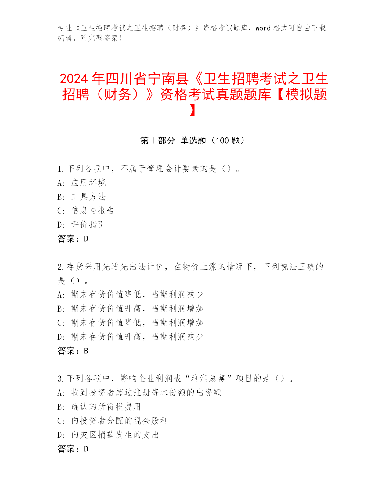2024年四川省宁南县《卫生招聘考试之卫生招聘(财务)》资格考试真题题库【模拟题】