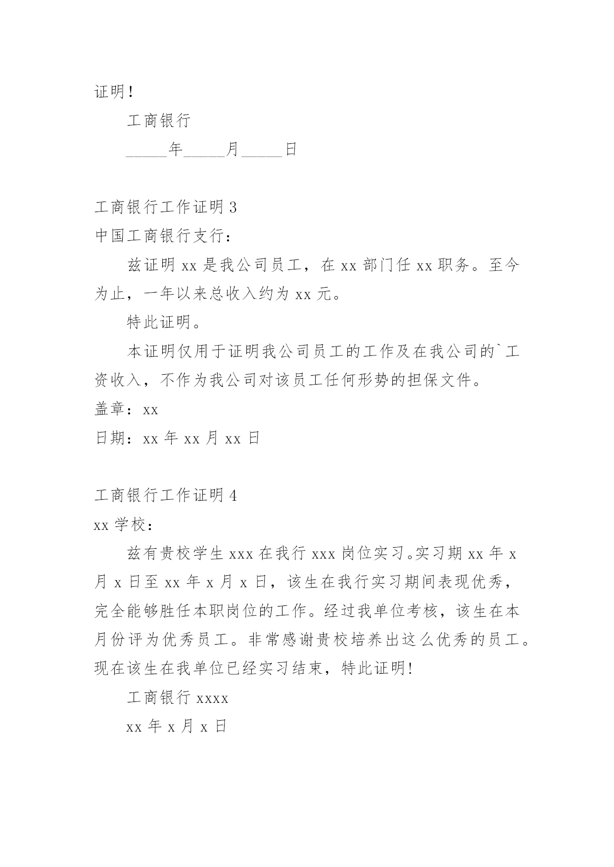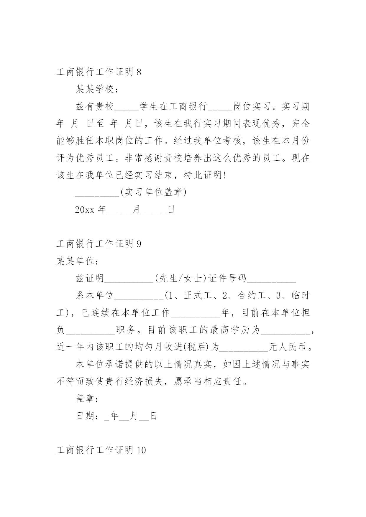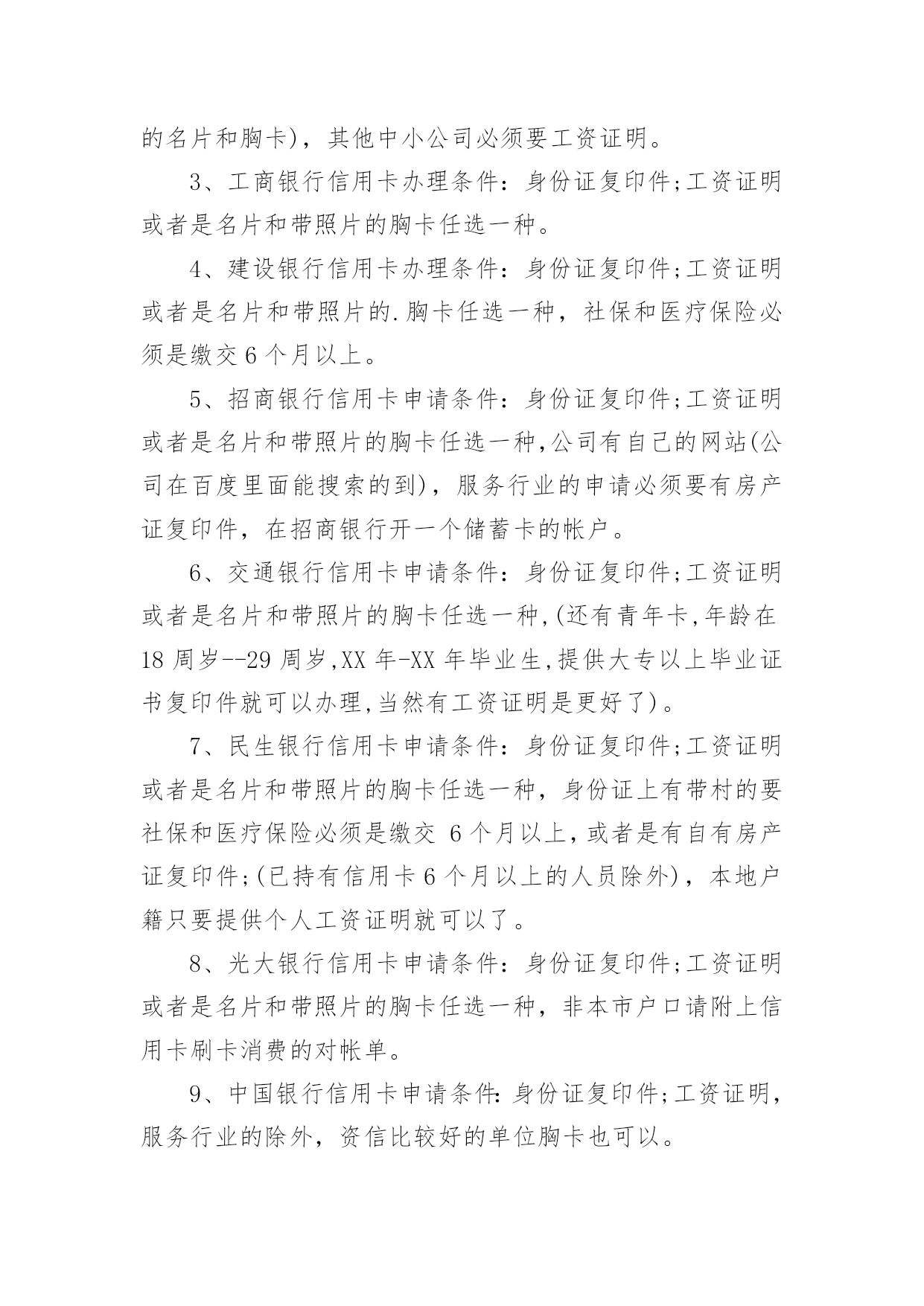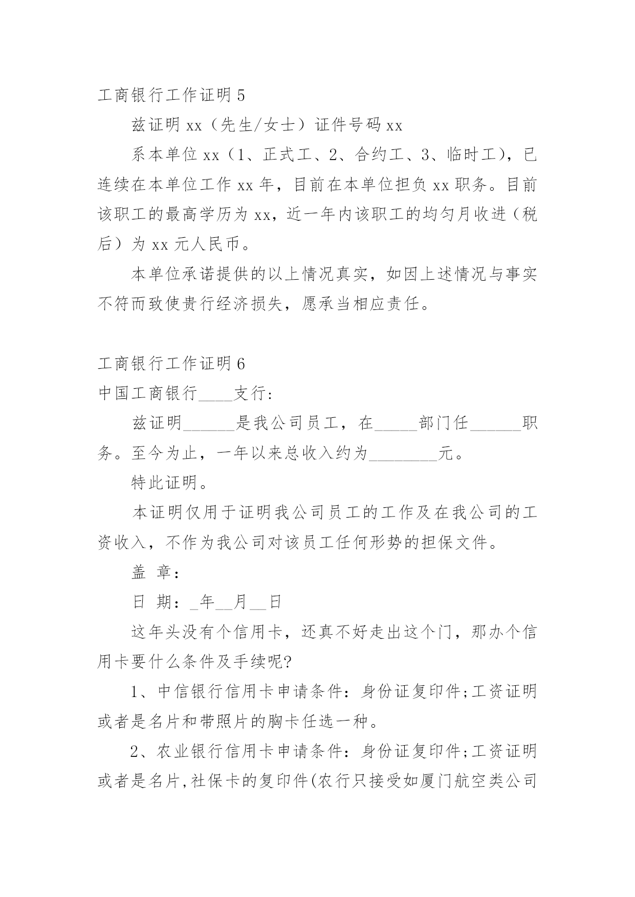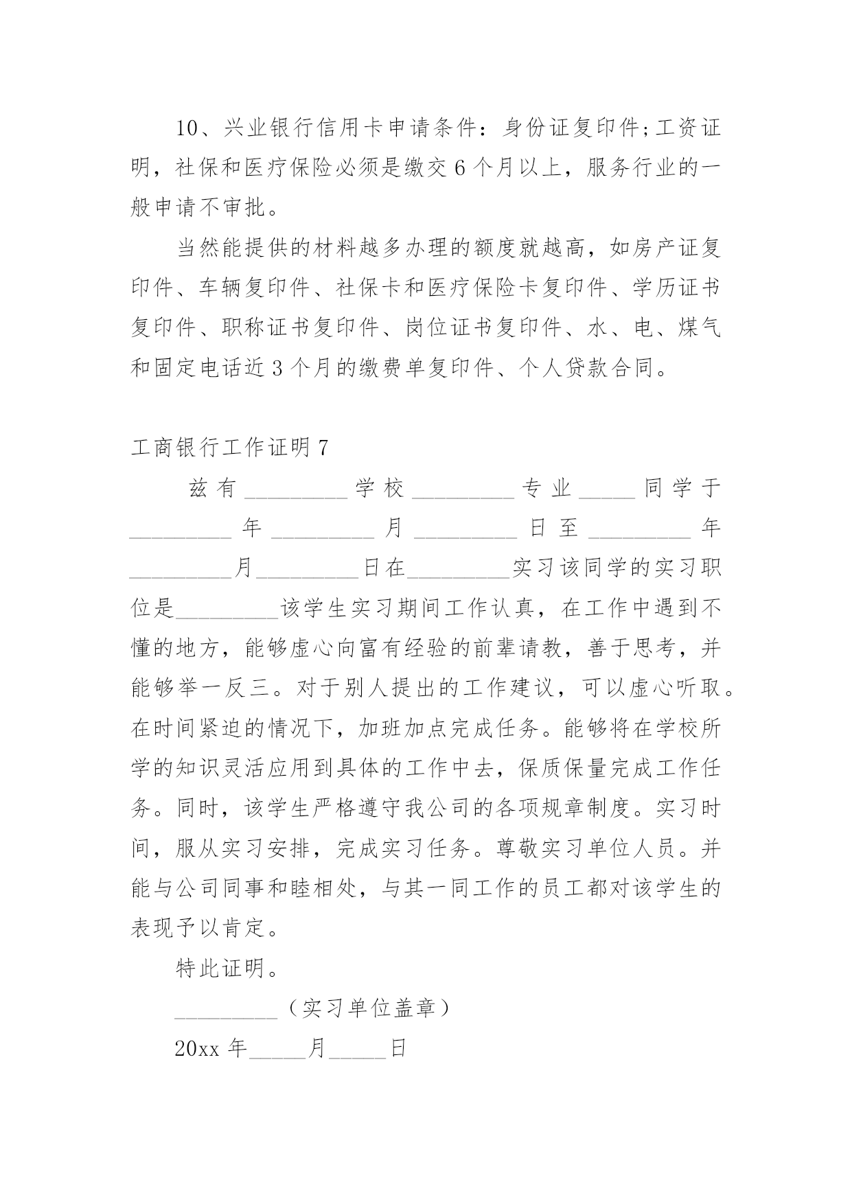 工商银行工作证明在日常生活或是工作学习中,大家对证明都再熟悉不过了吧,证明是由机关、学校、团体等发的证明自己身份、经历或某事真实性的一种凭证。想拟证明却不知道该请教谁?以下是小编整理的工商银行工作证明,希望对大家有所帮助。工商银行工作证明1兹证明xx(先生/女士)证件号码xxxxxxx系本单位xxx(1.正式工、2.合约工、3.临时工),已连续在本单位工作xx年,目前在本单位担负xx职务。目前该职工的最高学历为xx,近一年内该职工的均匀月收进(税后)为xx元人民币。本单位承诺提供的以上情况真实,如因上述情况与事实不符而致使贵行经济损失,愿承当相应责任。xx年x月x日工商银行工作证明2某某学校:兹有贵校_____学生在我行_____岗位实习。实习期_____年_____月_____日至_____年_____月_____日,该生在我行实习期间表现优秀,完全能够胜任本职岗位的工作。经过我单位考核,该生在本月份评为优秀员工。非常感谢贵校培养出这么优秀的员工。现在该生在我单位已经实习结束,特此证明!工商银行_____年_____月_____日工商银行工作证明3中国工商银行支行:兹证明xx是我公司员工,在xx部门任xx职务。至今为止,一年以来总收入约为xx元。特此证明。本证明仅用于证明我公司员工的工作及在我公司的`工资收入,不作为我公司对该员工任何形势的担保文件。盖章:xx日期:xx年xx月xx日工商银行工作证明4xx学校:兹有贵校学生xxx在我行xxx岗位实习。实习期xx年x月x日至xx年x月x日,该生在我行实习期间表现优秀,完全能够胜任本职岗位的工作。经过我单位考核,该生在本月份评为优秀员工。非常感谢贵校培养出这么优秀的员工。现在该生在我单位已经实习结束,特此证明!工商银行xxxxxx年x月x日工商银行工作证明5兹证明xx(先生/女士)证件号码xx系本单位xx(1、正式工、2、合约工、3、临时工),已连续在本单位工作xx年,目前在本单位担负xx职务。目前该职工的最高学历为xx,近一年内该职工的均匀月收进(税后)为xx元人民币。本单位承诺提供的以上情况真实,如因上述情况与事实不符而致使贵行经济损失,愿承当相应责任。工商银行工作证明6中国工商银行____支行:兹证明______是我公司员工,在_____部门任______职务。至今为止,一年以来总收入约为________元。特此证明。本证明仅用于证明我公司员工的工作及在我公司的工资收入,不作为我公司对该员工任何形势的担保文件。盖章:日期:_年__月__日这年头没有个信用卡,还真不好走出这个门,那办个信用卡要什么条件及手续呢?1、中信银行信用卡申请条件:身份证复印件;工资证明或者是名片和带照片的胸卡任选一种。2、农业银行信用卡申请条件:身份证复印件;工资证明或者是名片,社保卡的复印件(农行只接受如厦门航空类公司的名片和胸卡),其他中小公司必须要工资证明。3、工商银行信用卡办理条件:身份证复印件;工资证明或者是名片和带照片的胸卡任选一种。4、建设银行信用卡办理条件:身份证复印件;工资证明或者是名片和带照片的.胸卡任选一种,社保和医疗保险必须是缴交6个月以上。5、招商银行信用卡申请条件:身份证复印件;工资证明或者是名片和带照片的胸卡任选一种,公司有自己的网站(公司在百度里面能搜索的到),服务行业的申请必须要有房产证复印件,在招商银行开一个储蓄卡的帐户。6、交通银行信用卡申请条件:身份证复印件;工资证明或者是名片和带照片的胸卡任选一种,(还有青年卡,年龄在18周岁--29周岁,XX年-XX年毕业生,提供大专以上毕业证书复印件就可以办理,当然有工资证明是更好了)。7、民生银行信用卡申请条件:身份证复印件;工资证明或者是名片和带照片的胸卡任选一种,身份证上有带村的要社保和医疗保险必须是缴交6个月以上,或者是有自有房产证复印件;(已持有信用卡6个月以上的人员除外),本地户籍只要提供个人工资证明就可以了。8、光大银行信用卡申请条件:身份证复印件;工资证明或者是名片和带照片的胸卡任选一种,非本市户口请附上信用卡刷卡消费的对帐单。9、中国银行信用卡申请条件:身份证复印件;工资证明,服务行业的除外,资信比较好的单位胸卡也可以。10、兴业银行信用卡申请条件:身份证复印件;工资证明,社保和医疗保险必须是缴交6个月以上,服务行业的一般申请不审批。当然能提供的材料越多办理的额度就越高,如房产证复印件、车辆复印件、社保卡和医疗保险卡复印件、学历证书复印件、职称证书复印件、岗位证书复印件、水、电、煤气和固定电话近3个月的缴费单复印件、个人贷款合同。工商银行工作证明7兹有_________学校_________专业_____同学于_________年_________月_________日至_________年_____