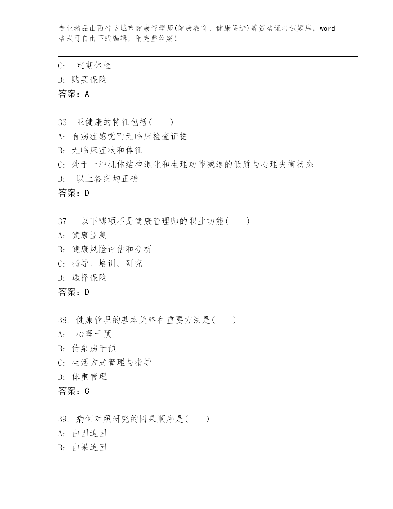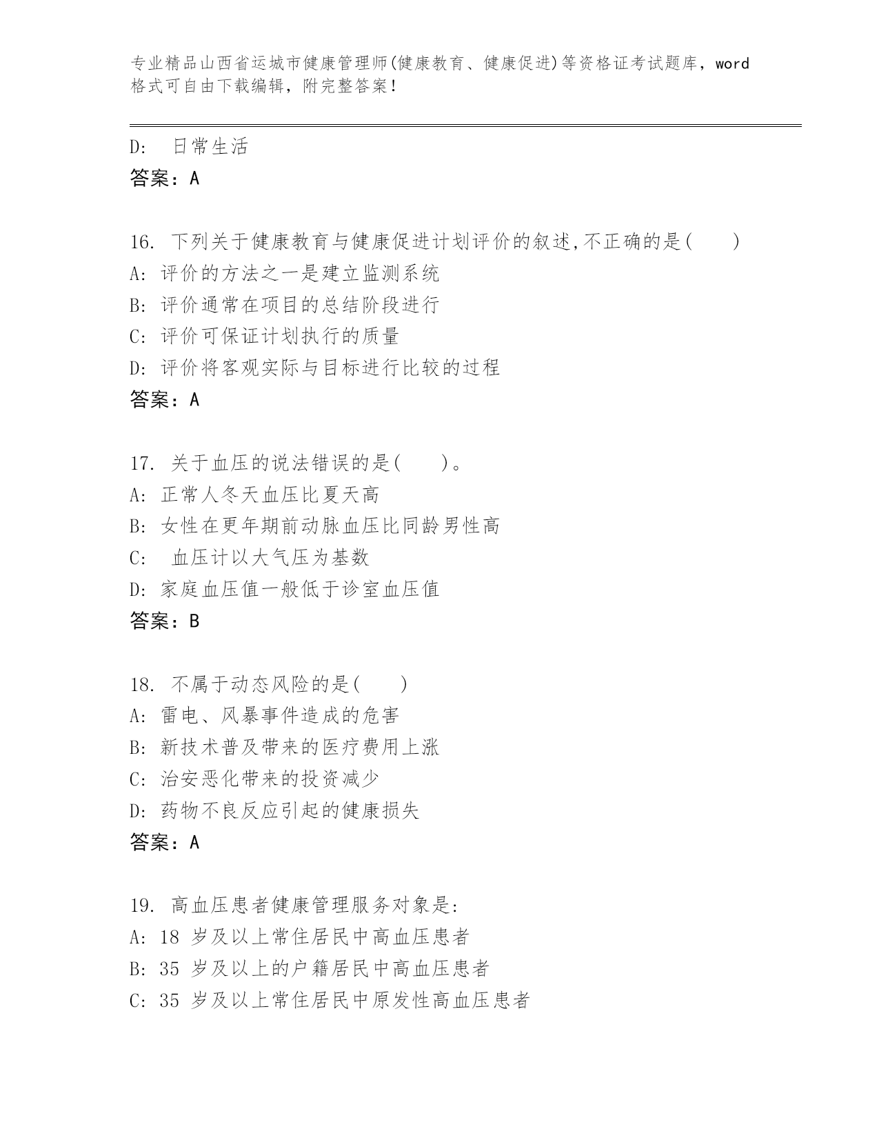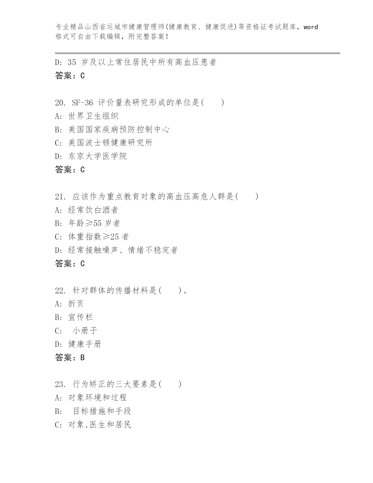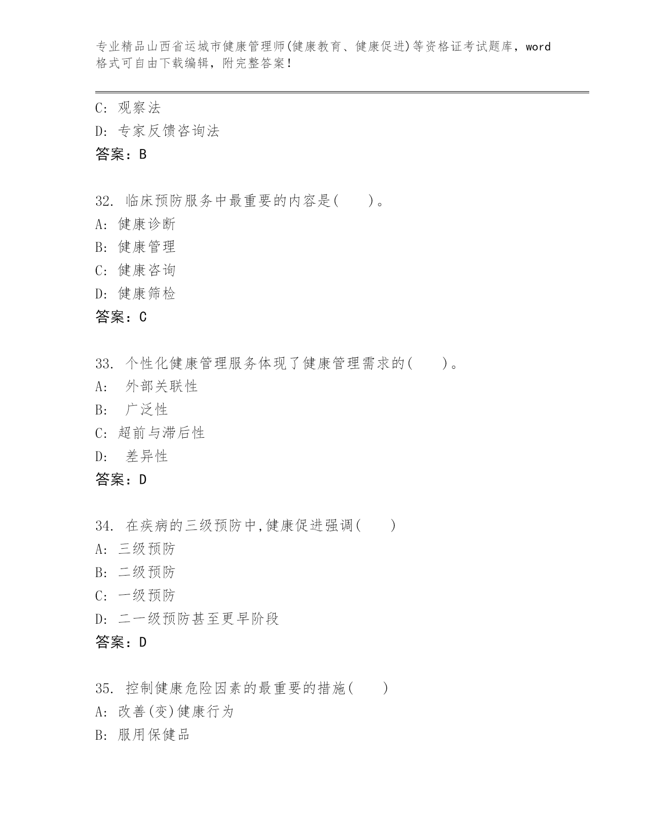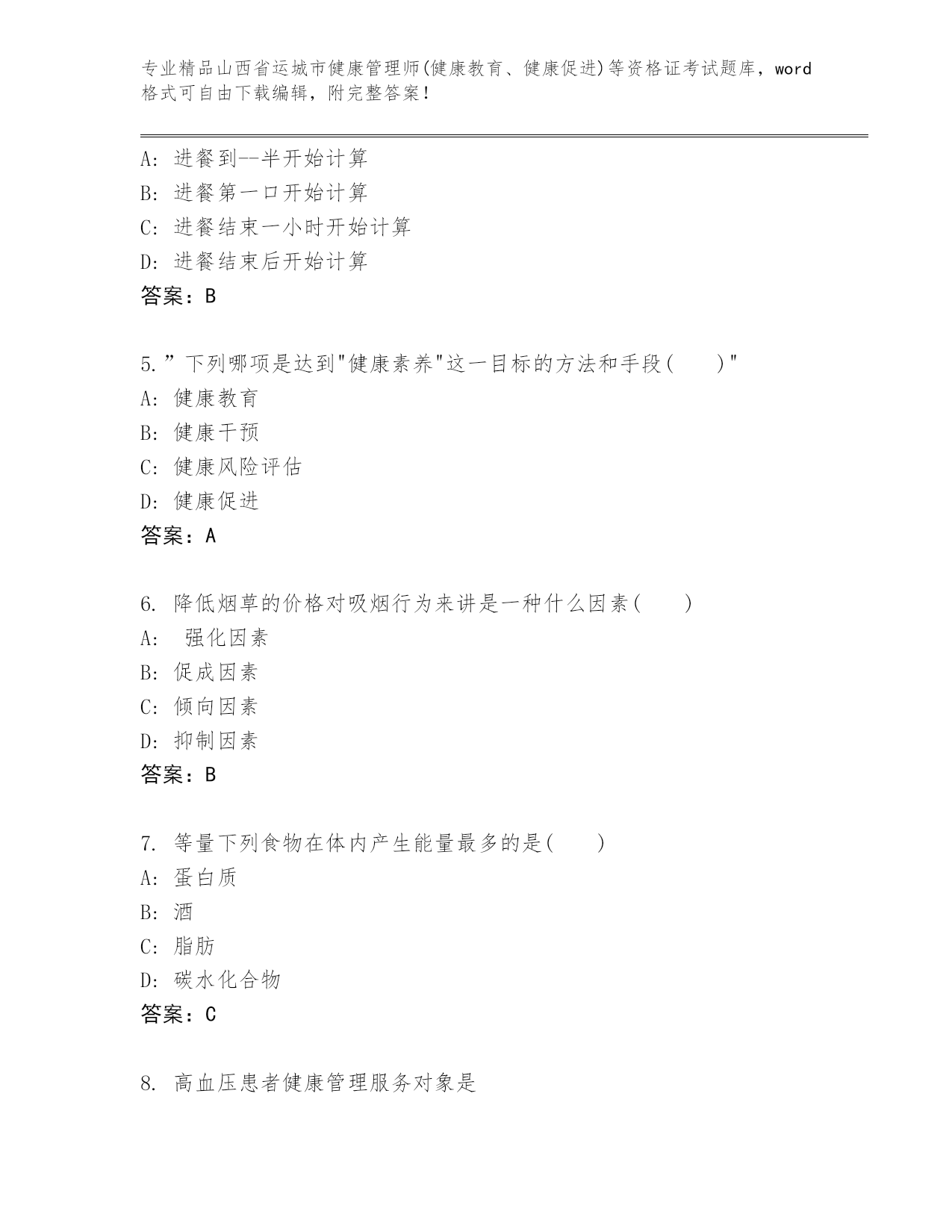 优选山西省运城市健康管理师(健康教育、健康促进)等资格证考试大全含答案(B卷).docx