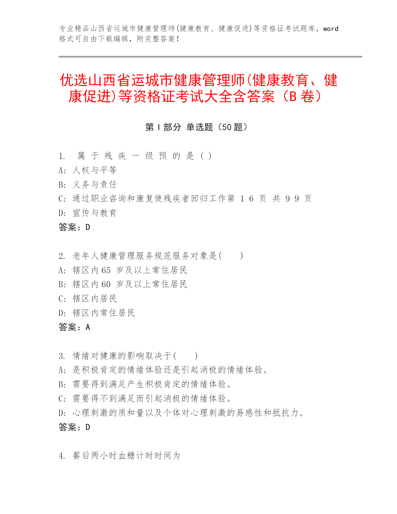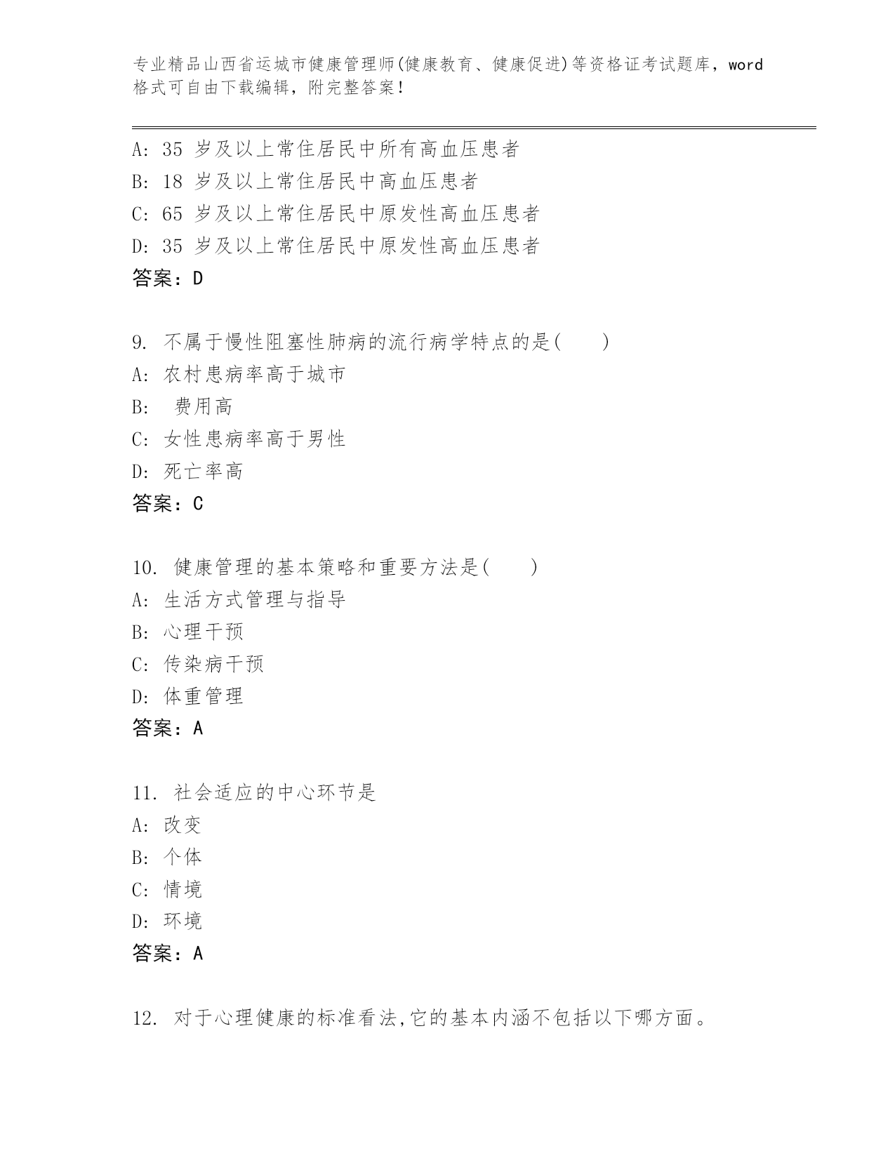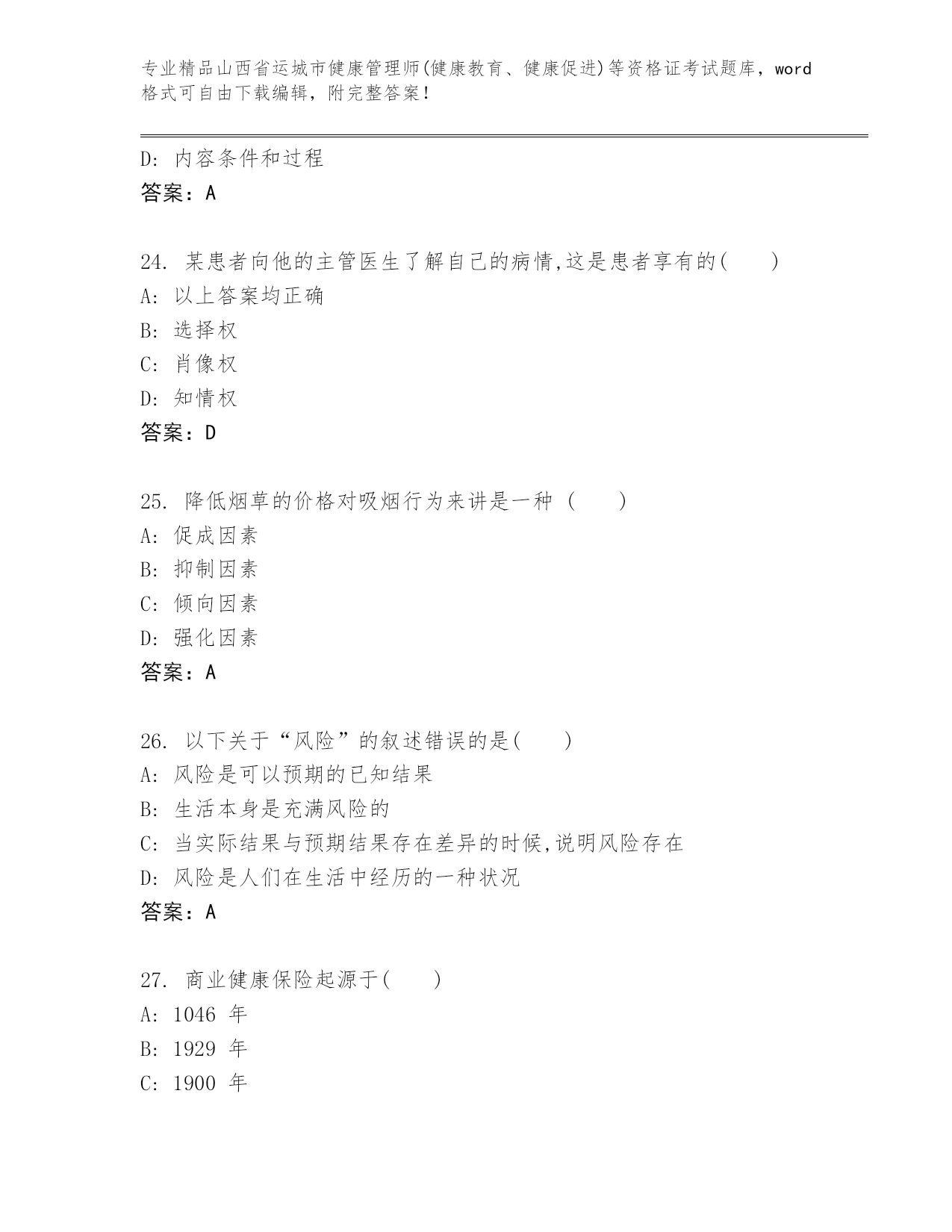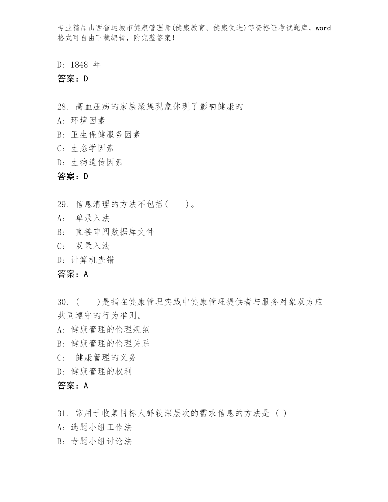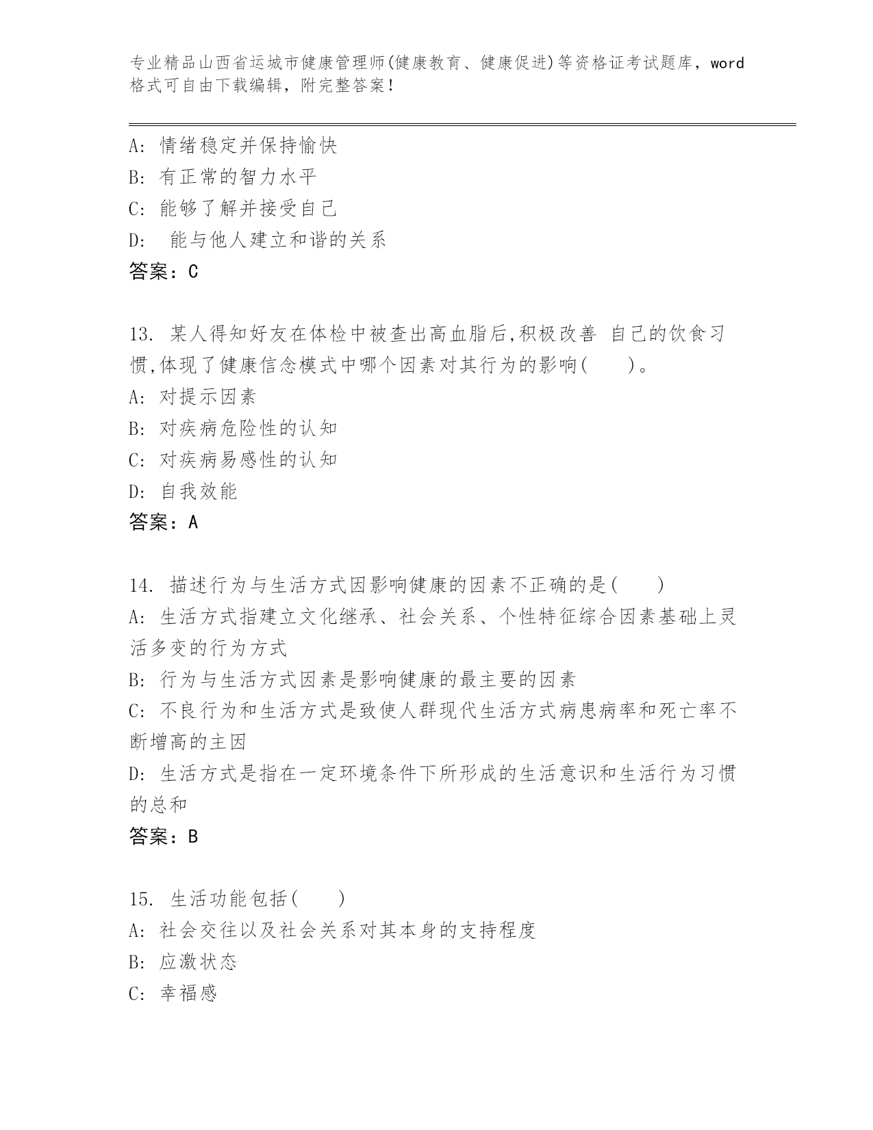 优选山西省运城市健康管理师(健康教育、健康促进)等资格证考试大全含答案(B卷).docx