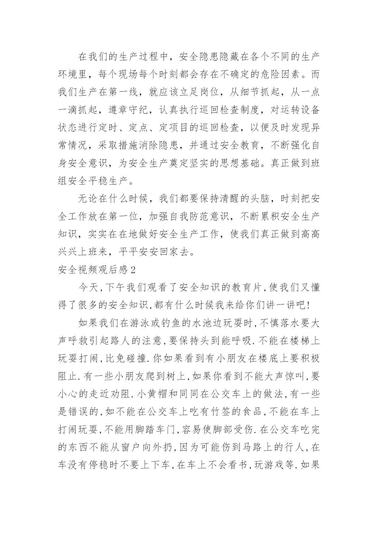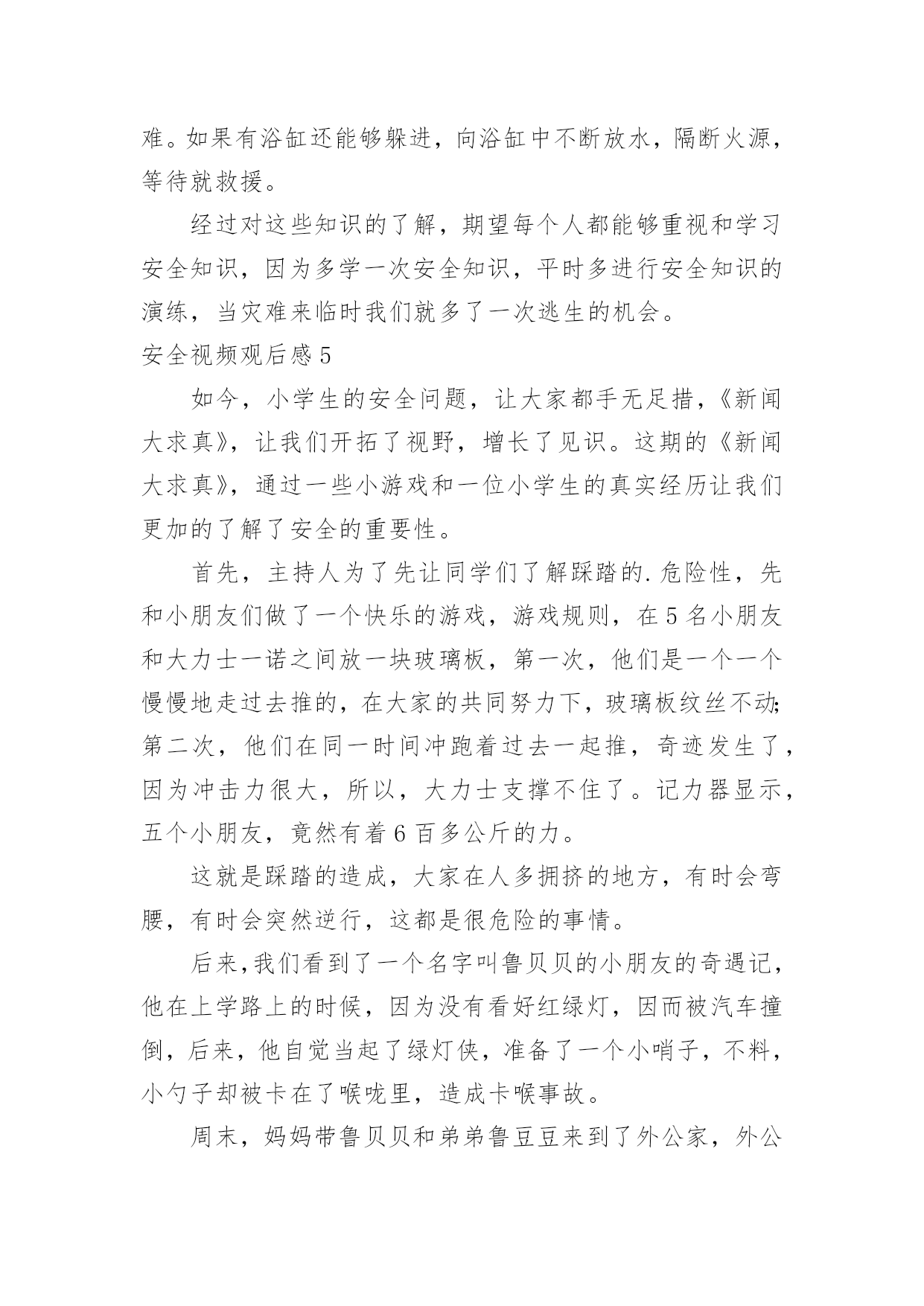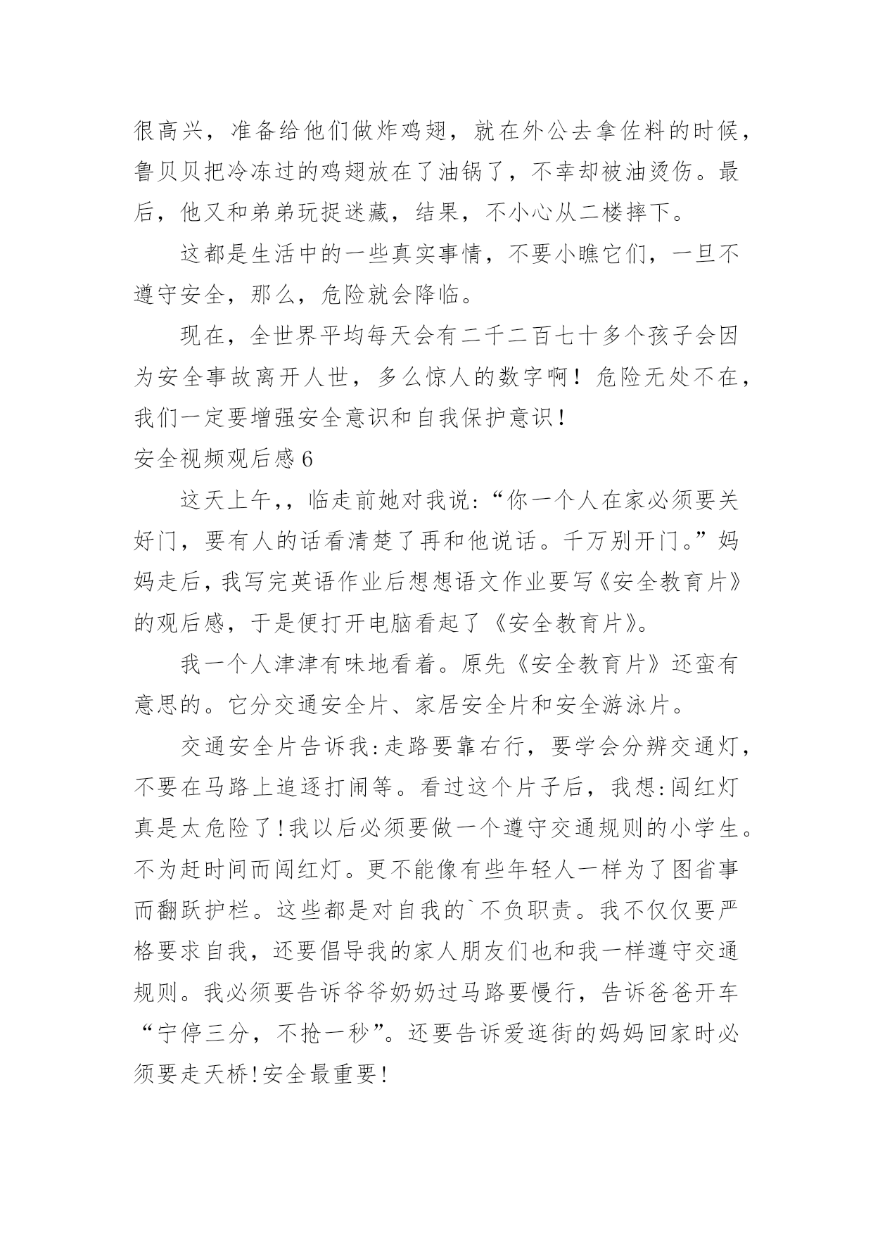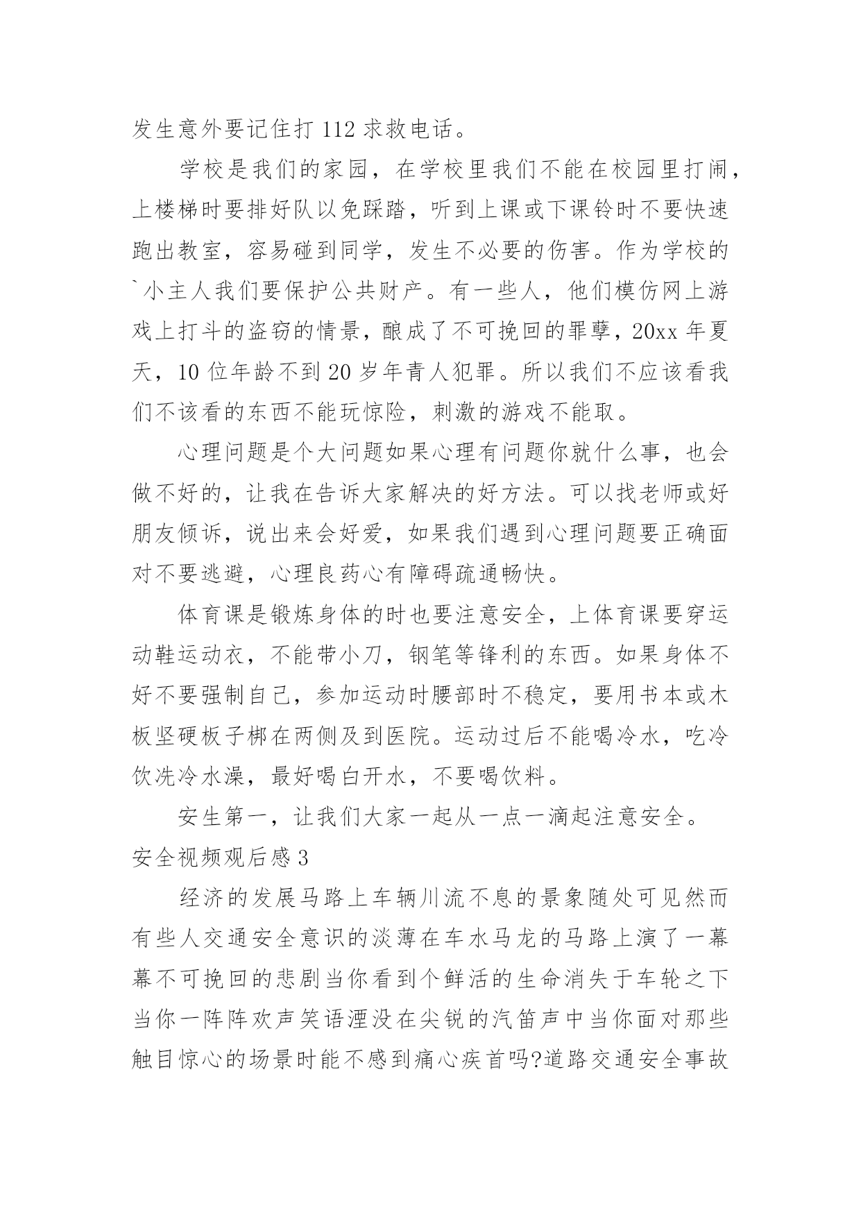 安全视频观后感安全视频观后感15篇当认真看完一部影视作品后,相信大家增长不少见闻吧,这时候,最关键的观后感怎么能落下!你想知道观后感怎么写吗?下面是小编整理的安全视频观后感,希望能够帮助到大家。安全视频观后感1两天单位组织观看几起中石油近两年重特大事故教育视频。看着一件件血淋淋的事故,一起起违章操作,我的内心触动很大,在深深痛斥那些无视安全的责任者和操作员的冷漠外,同时也更加感受到生命的可贵和安全生产的重要性。"安全才能生产、生产必须安全"这是我们每个炼化职工再也熟悉不过的标语。这就要求我们在生产过程中要把安全始终放在第一位,不要有麻痹大意思想。这些事故就是典型的因为麻痹思想造成的`安全事故,有的是没有监护人在现场实时监护;有的是没有明确指示就直接操作;有的是因麻痹大意不知及时检测现场气体浓度...其实这些事故都是完全可以避免的,只要责任人做好监督指导职责工作,其他相关人员做好协调工作,操作员也以安全为前提,按规程操作,安全事故这个导火索是可以熄灭的。在我们的生产过程中,安全隐患隐藏在各个不同的生产环境里,每个现场每个时刻都会存在不确定的危险因素。而我们生产在第一线,就应该立足岗位,从细节抓起,从一点一滴抓起,遵章守纪,认真执行巡回检查制度,对运转设备状态进行定时、定点、定项目的巡回检查,以便及时发现异常情况,采取措施消除隐患,并通过安全教育,不断强化自身安全意识,为安全生产奠定坚实的思想基础。真正做到班组安全平稳生产。无论在什么时候,我们都要保持清醒的头脑,时刻把安全工作放在第一位,加强自我防范意识,不断累积安全生产知识,实实在在地做好安全生产工作,使我们真正做到高高兴兴上班来,平平安安回家去。安全视频观后感2今天,下午我们观看了安全知识的教育片,使我们又懂得了很多的安全知识,都有什么时候我来给你们讲一讲吧!如果我们在游泳或钓鱼的水池边玩耍时,不慎落水要大声呼救引起路人的注意,要保持头到能呼吸.不能在楼梯上玩耍打闹,比免碰撞.你如果看到有小朋友在楼底上要积极阻止.有一些小朋友爬到树上,如果你看到不能大声惊叫,要小心的走近劝阻.小黄帽和同同在公交车上的做法,有一些是错误的,如不能在公交车上吃有竹签的食品,不能在车上打闹玩耍,不能用脚踏车门,容易使脚部受伤.在公交车吃完的东西不能从窗户向外扔,因为可能伤到马路上的行人,在车没有停稳时不要上下车,在车上不会看书,玩游戏等.如果发生意外要记住打112求救电话。学校是我们的家园,在学校里我们不能在校园里打闹,上楼梯时要排好队以免踩踏,听到上课或下课铃时不要快速跑出教室,容易碰到同学,发生不必要的伤害。作为学校的`小主人我们要保护公共财产。有一些人,他们模仿网上游戏上打斗的盗窃的情景,酿成了不可挽回的罪孽,20xx年夏天,10位年龄不到20岁年青人犯罪。所以我们不应该看我们不该看的东西不能玩惊险,刺激的游戏不能取。心理问题是个大问题如果心理有问题你就什么事,也会做不好的,让我在告诉大家解决的好方法。可以找老师或好朋友倾诉,说出来会好爱,如果我们遇到心理问题要正确面对不要逃避,心理良药心有障碍疏通畅快。体育课是锻炼身体的时也要注意安全,上体育课要穿运动鞋运动衣,不能带小刀,钢笔等锋利的东西。如果身体不好不要强制自己,参加运动时腰部时不稳定,要用书本或木板坚硬板子梆在两侧及到医院。运动过后不能喝冷水,吃冷饮冼冷水澡,最好喝白开水,不要喝饮料。安生第一,让我们大家一起从一点一滴起注意安全。安全视频观后感3经济的发展马路上车辆川流不息的景象随处可见然而有些人交通安全意识的淡薄在车水马龙的马路上演了一幕幕不可挽回的悲剧当你看到个鲜活的生命消失于车轮之下当你一阵阵欢声笑语湮没在尖锐的汽笛声中当你面对那些触目惊心的场景时能不感到痛心疾首吗?道路交通安全事故依然事故领域的“头号杀手”而悲剧的原因欠缺交通安全防卫知识自我保护能力差。最近学校组织看了一部《交通安全教育片》影片活生生的事例警示要珍惜生命遵守交通规则回想起片中一幕幕惨不忍睹的场面让人不寒而栗!司机超载、无证、超速、酒后、疲劳驾驶等违规操作人骑着自行车在马路上作秀一群小孩在马路中间玩耍……这个镜头令我不禁捏了一把冷汗。如今据统计每年人类因交通事故死亡77万人也说每分钟都有人离开中小学生的`死亡也了33万多么惊人的数字!竟有那么多人时时刻刻都在离开中小学生盲视交通守则而惨剧的事例在周围也经常某中学生骑着自行车“疾驰”在放学路上红灯亮了在他眼里不他飞速横穿马路还在车上摆着姿势甚至有时两手离开车头地骑车这时前面正有一辆大货车驶来车速快而来不及刹车学生“嘭”的医生迎面撞上了货车从后面刚的一辆小汽车接着又撞上了货车了三车连环撞得悲惨后来学生被送往医院抢救无效死亡真一时放纵交通安全才断送了可贵的生命!人的生命一次遵守交通规则的警钟正在敲响事实中体会到:过