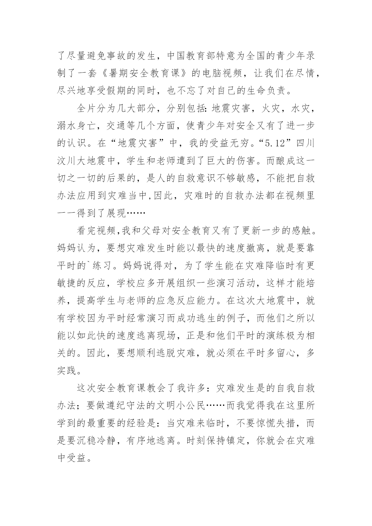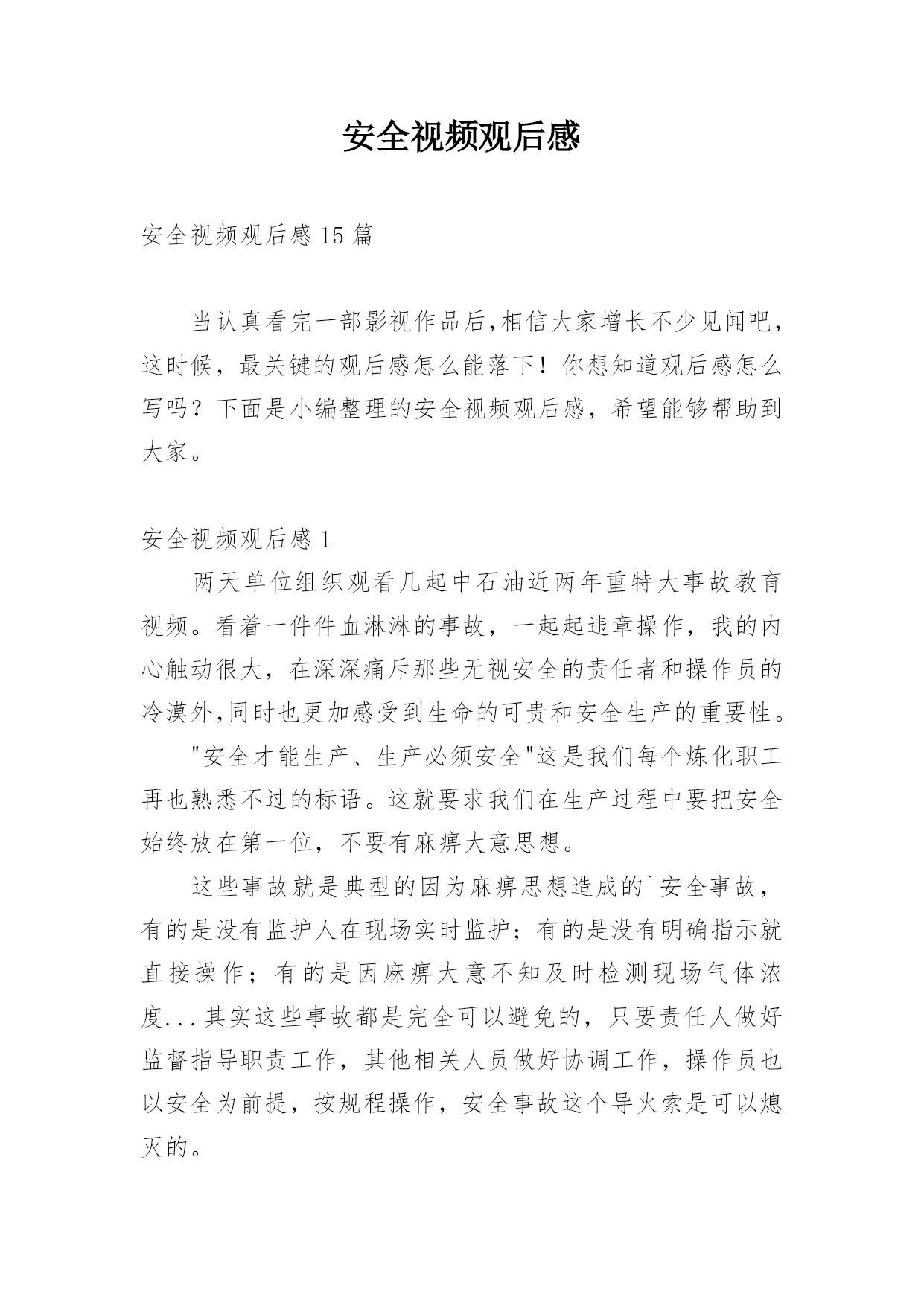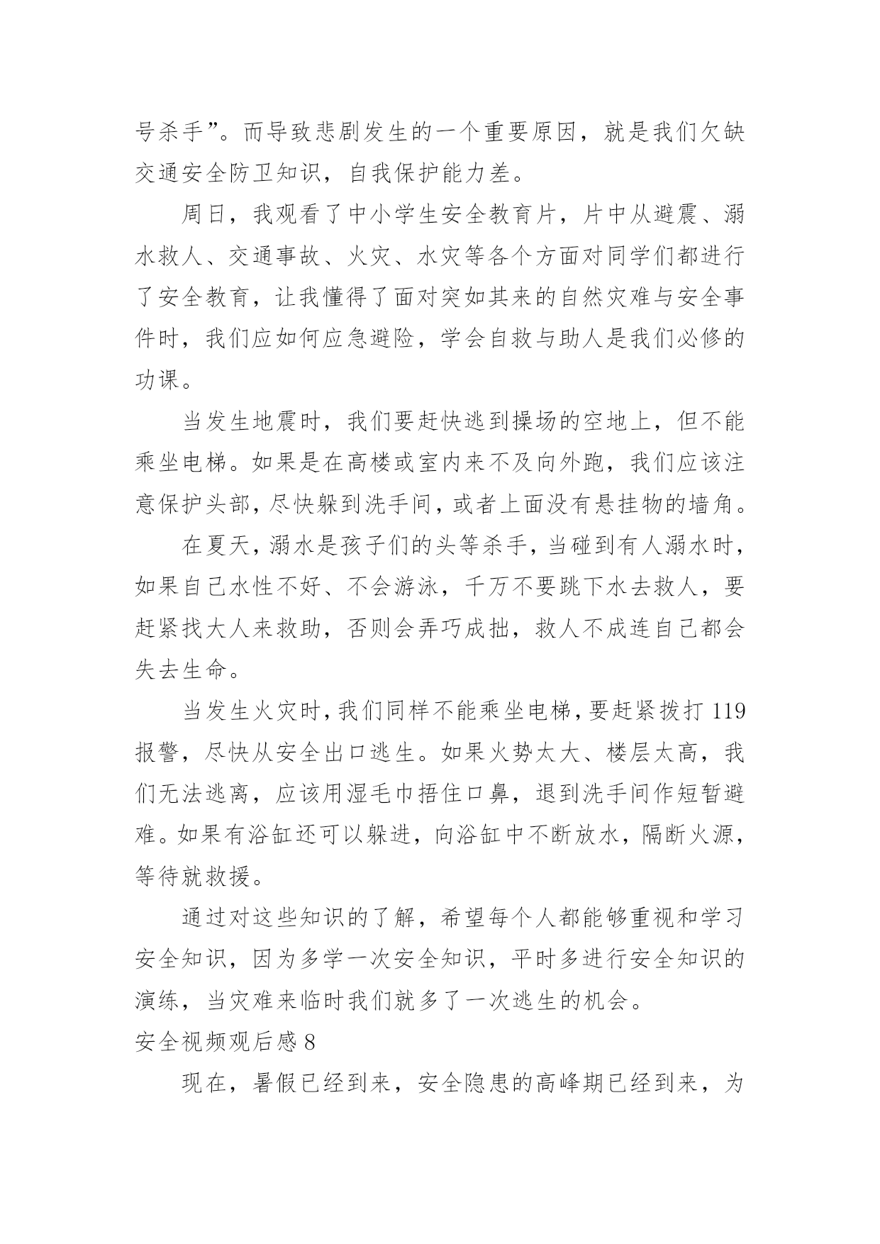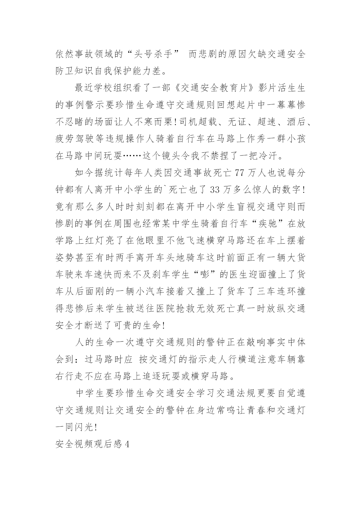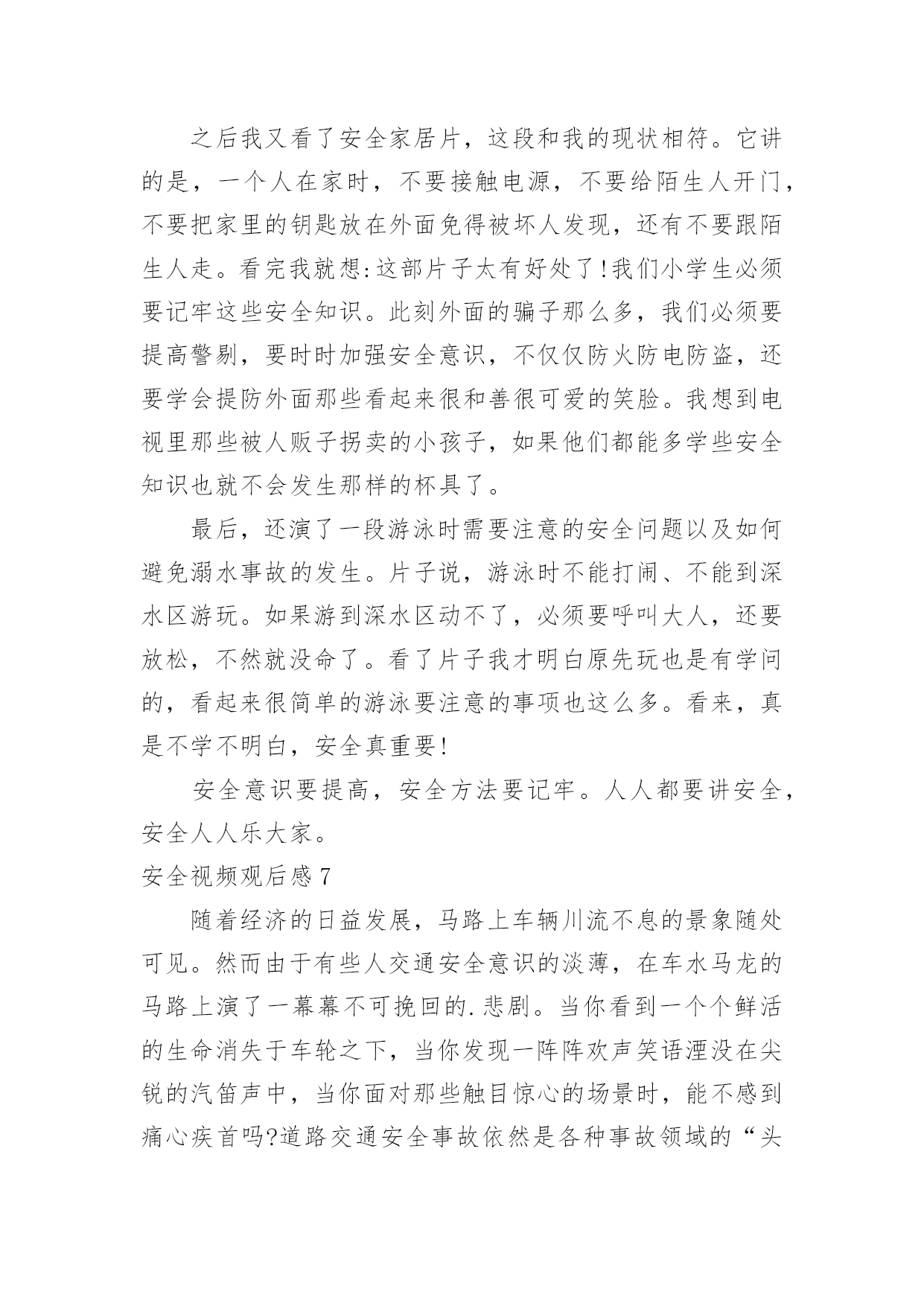 安全视频观后感安全视频观后感15篇当认真看完一部影视作品后,相信大家增长不少见闻吧,这时候,最关键的观后感怎么能落下!你想知道观后感怎么写吗?下面是小编整理的安全视频观后感,希望能够帮助到大家。安全视频观后感1两天单位组织观看几起中石油近两年重特大事故教育视频。看着一件件血淋淋的事故,一起起违章操作,我的内心触动很大,在深深痛斥那些无视安全的责任者和操作员的冷漠外,同时也更加感受到生命的可贵和安全生产的重要性。"安全才能生产、生产必须安全"这是我们每个炼化职工再也熟悉不过的标语。这就要求我们在生产过程中要把安全始终放在第一位,不要有麻痹大意思想。这些事故就是典型的因为麻痹思想造成的`安全事故,有的是没有监护人在现场实时监护;有的是没有明确指示就直接操作;有的是因麻痹大意不知及时检测现场气体浓度...其实这些事故都是完全可以避免的,只要责任人做好监督指导职责工作,其他相关人员做好协调工作,操作员也以安全为前提,按规程操作,安全事故这个导火索是可以熄灭的。在我们的生产过程中,安全隐患隐藏在各个不同的生产环境里,每个现场每个时刻都会存在不确定的危险因素。而我们生产在第一线,就应该立足岗位,从细节抓起,从一点一滴抓起,遵章守纪,认真执行巡回检查制度,对运转设备状态进行定时、定点、定项目的巡回检查,以便及时发现异常情况,采取措施消除隐患,并通过安全教育,不断强化自身安全意识,为安全生产奠定坚实的思想基础。真正做到班组安全平稳生产。无论在什么时候,我们都要保持清醒的头脑,时刻把安全工作放在第一位,加强自我防范意识,不断累积安全生产知识,实实在在地做好安全生产工作,使我们真正做到高高兴兴上班来,平平安安回家去。安全视频观后感2今天,下午我们观看了安全知识的教育片,使我们又懂得了很多的安全知识,都有什么时候我来给你们讲一讲吧!如果我们在游泳或钓鱼的水池边玩耍时,不慎落水要大声呼救引起路人的注意,要保持头到能呼吸.不能在楼梯上玩耍打闹,比免碰撞.你如果看到有小朋友在楼底上要积极阻止.有一些小朋友爬到树上,如果你看到不能大声惊叫,要小心的走近劝阻.小黄帽和同同在公交车上的做法,有一些是错误的,如不能在公交车上吃有竹签的食品,不能在车上打闹玩耍,不能用脚踏车门,容易使脚部受伤.在公交车吃完的东西不能从窗户向外扔,因为可能伤到马路上的行人,在车没有停稳时不要上下车,在车上不会看书,玩游戏等.如果发生意外要记住打112求救电话。学校是我们的家园,在学校里我们不能在校园里打闹,上楼梯时要排好队以免踩踏,听到上课或下课铃时不要快速跑出教室,容易碰到同学,发生不必要的伤害。作为学校的`小主人我们要保护公共财产。有一些人,他们模仿网上游戏上打斗的盗窃的情景,酿成了不可挽回的罪孽,20xx年夏天,10位年龄不到20岁年青人犯罪。所以我们不应该看我们不该看的东西不能玩惊险,刺激的游戏不能取。心理问题是个大问题如果心理有问题你就什么事,也会做不好的,让我在告诉大家解决的好方法。可以找老师或好朋友倾诉,说出来会好爱,如果我们遇到心理问题要正确面对不要逃避,心理良药心有障碍疏通畅快。体育课是锻炼身体的时也要注意安全,上体育课要穿运动鞋运动衣,不能带小刀,钢笔等锋利的东西。如果身体不好不要强制自己,参加运动时腰部时不稳定,要用书本或木板坚硬板子梆在两侧及到医院。运动过后不能喝冷水,吃冷饮冼冷水澡,最好喝白开水,不要喝饮料。安生第一,让我们大家一起从一点一滴起注意安全。安全视频观后感3经济的发展马路上车辆川流不息的景象随处可见然而有些人交通安全意识的淡薄在车水马龙的马路上演了一幕幕不可挽回的悲剧当你看到个鲜活的生命消失于车轮之下当你一阵阵欢声笑语湮没在尖锐的汽笛声中当你面对那些触目惊心的场景时能不感到痛心疾首吗?道路交通安全事故依然事故领域的“头号杀手”而悲剧的原因欠缺交通安全防卫知识自我保护能力差。最近学校组织看了一部《交通安全教育片》影片活生生的事例警示要珍惜生命遵守交通规则回想起片中一幕幕惨不忍睹的场面让人不寒而栗!司机超载、无证、超速、酒后、疲劳驾驶等违规操作人骑着自行车在马路上作秀一群小孩在马路中间玩耍……这个镜头令我不禁捏了一把冷汗。如今据统计每年人类因交通事故死亡77万人也说每分钟都有人离开中小学生的`死亡也了33万多么惊人的数字!竟有那么多人时时刻刻都在离开中小学生盲视交通守则而惨剧的事例在周围也经常某中学生骑着自行车“疾驰”在放学路上红灯亮了在他眼里不他飞速横穿马路还在车上摆着姿势甚至有时两手离开车头地骑车这时前面正有一辆大货车驶来车速快而来不及刹车学生“嘭”的医生迎面撞上了货车从后面刚的一辆小汽车接着又撞上了货车了三车连环撞得悲惨后来学生被送往医院抢救无效死亡真一时放纵交通安全才断送了可贵的生命!人的生命一次遵守交通规则的警钟正在敲响事实中体会到:过