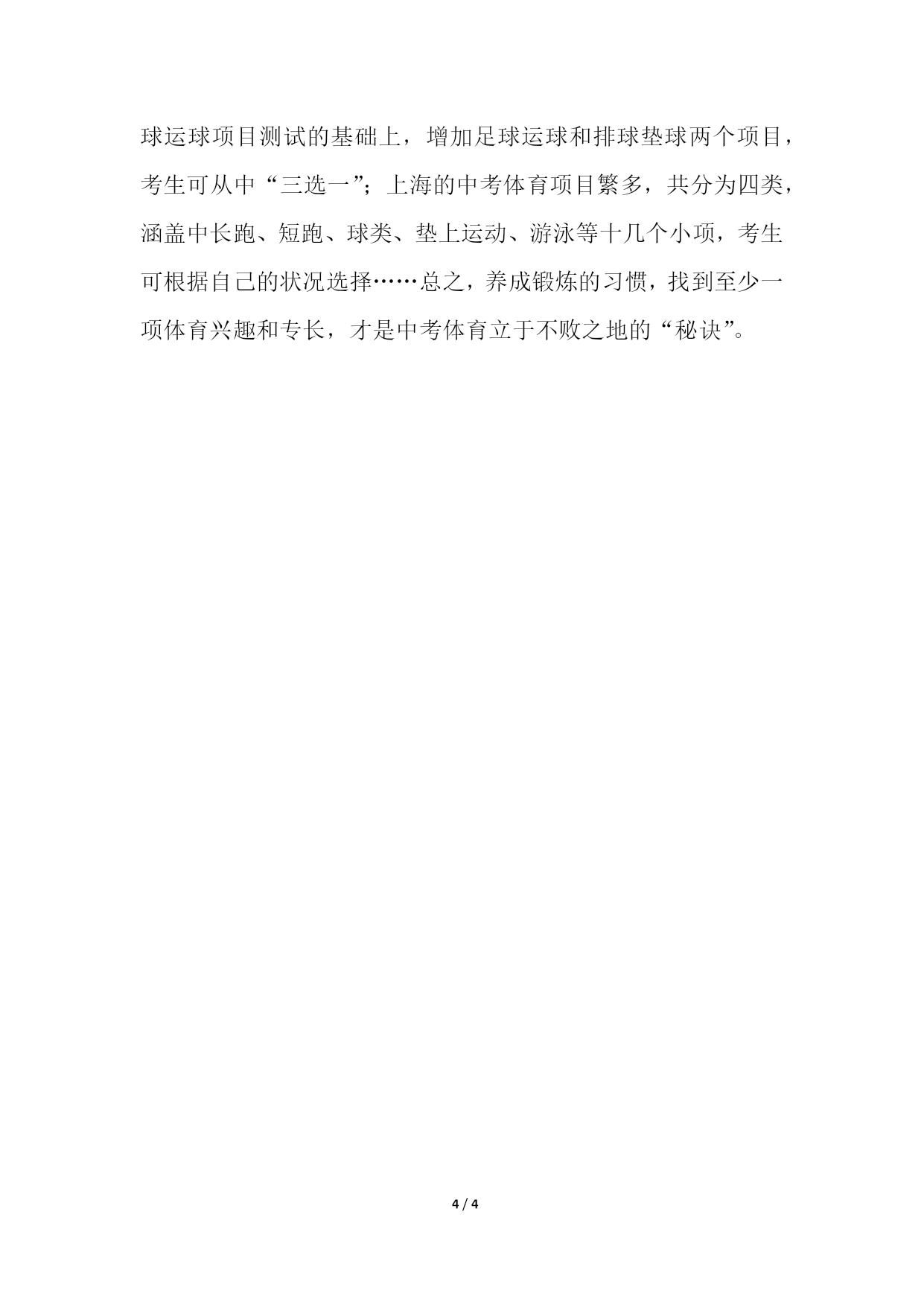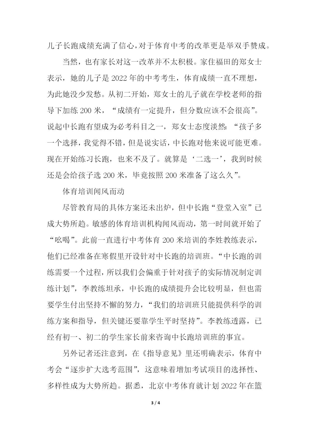 PAGE4/NUMPAGES4中考体育改革方案本报曾在10月中旬报道了部分初三学生家长的呼声——建议将中长跑纳入体育中考的必考科目之一,而在12月4日深圳市教育局下发的《深圳市教育局关于进一步提升中小学生综合素养的指导意见》(以下简称《指导意见》)中,这一提议得到了正面的回应。《指导意见》明确指出:“改革体育中考……逐步扩大选考范围并将中长跑列入必考科目”。此消息一出,在家长间立即引起了很高的关注。而记者从市教育局获悉,关于体育中考的具体政策方案还在研究中。不过相关的体育培训机构已经嗅到了商机,“中考中长跑培训”应运而生。中长跑将成为必考今年九、十月间,深圳的部分初三学生家长就在网上发起了倡议,建议将中长跑(男1000米,女800米)列入中考体育的必考科目之一。家长们的理由是:中长跑更能锻炼孩子的身体素质,且耐力可以通过训练得到明显提升。市教育科学研究院体育教研员刘晋表示这种说法是有一定科学依据的:“比起耐力,速度与遗传的关系的确要更大一些”。意即,通过后天努力,中长跑的锻炼效果会更明显一些。在全国大部分城市的体育中考项目中,中长跑也的确都被列为必考项目。当时,市教育局表示在制定中考体育的方案时,会广泛听取各方意见。而12月4日下发的《深圳市教育局关于进一步提升中小学生综合素养的指导意见》中,“中长跑将被列为中考体育的必考科目”赫然在列。这意味着,中长跑在中考体育中的分量会逐渐加大,在3年内必定会成为必考科目。记者随即联系了市教育局,想了解该意见的'推行计划。教育局相关负责人表示,具体的方案还在研究,将会在近日出台。至于中长跑会取代200米成为中考体育的唯一必考科目,还是与200米并存,现在还不得而知。不过相关人士分析说,为了顺利过渡,2022年中考采取“200米和中长跑二选一”的方案会比较实际。家长急盼方案出炉“快点出台标准吧,都12月份了。我女儿200米怎么努力也只能跑个36秒,离满分还差好远,但她800米去年还拿过校运会第三名,应该要比200米成绩好吧”,“2022奇迹”在网上表达了对于中考体育科目改革的期盼。像“2022奇迹”一样的家长还有很多,如果中长跑被列为2022年中考体育的必考项目之一,就意味着他们的孩子会多一个选择。住在龙华的王先生本身就是个长跑爱好者,在刚刚结束的深圳国际马拉松上,他还参加了半程马拉松的比赛。他的儿子今年读初二,在得知中长跑将成为中考体育必考科目后,王先生高兴地对记者说:“我平时就喜欢带儿子一起跑步,既可以锻炼身体,又可以增进感情。现在知道可能还会对中考体育有帮助,简直是一举多得!”王先生自己坚持长跑一年多,也曾出现在半马的赛场上,所以他对于提升儿子长跑成绩充满了信心,对于体育中考的改革更是举双手赞成。当然,也有家长对这一改革并不太积极。家住福田的郑女士表示,她的儿子是2022年的中考考生,体育成绩一直不理想,为此她没少发愁。从初二开始,郑女士的儿子就在学校老师的指导下加练200米,“成绩有一定提升,但分数应该不会很高”。说起中长跑有望成为必考科目之一,郑女士态度淡然:“孩子多一个选择,我觉得不错,但是说实话,中长跑对他来说可能更难。现在开始练习长跑,也来不及了。就算是‘二选一’,我到时候还是会给孩子选200米,毕竟按照200米准备了这么久”。体育培训闻风而动尽管教育局的具体方案还未出炉,但中长跑“登堂入室”已成大势所趋。敏感的体育培训机构闻风而动,第一时间就开始了“吆喝”。此前一直进行中考体育200米培训的李姓教练表示,他们已经准备在寒假里开设针对中长跑的培训班。“中长跑的训练需要一个过程,所以我们会偏重于针对孩子的实际情况制定训练计划”,李教练坦承,中长跑的成绩提升会比较明显,但也需要学生付出坚持不懈的努力,“我们的培训班只能提供科学的训练方案和指导,但关键还要靠学生平时坚持”。李教练透露,已经有初一、初二的学生家长前来咨询中长跑培训班的事宜。另外记者还注意到,在《指导意见》里还明确表示,体育中考会“逐步扩大选考范围”,这意味着增加考试项目的选择性、多样性成为大势所趋。据悉,北京中考体育就计划2022年在篮球运球项目测试的基础上,增加足球运球和排球垫球两个项目,考生可从中“三选一”;上海的中考体育项目繁多,共分为四类,涵盖中长跑、短跑、球类、垫上运动、游泳等十几个小项,考生可根据自己的状况选择……总之,养成锻炼的习惯,找到至少一项体育兴趣和专长,才是中考体育立于不败之地的“秘诀”。