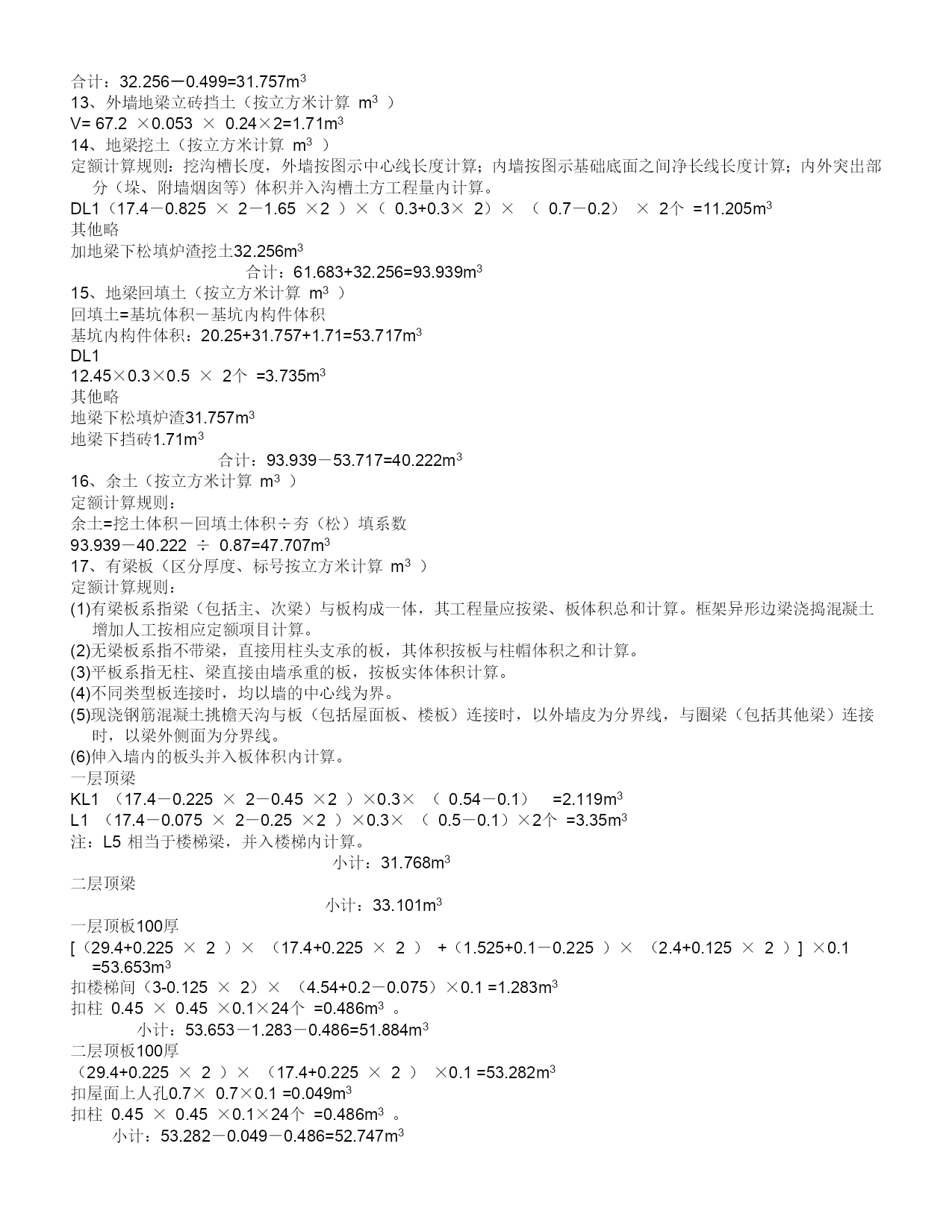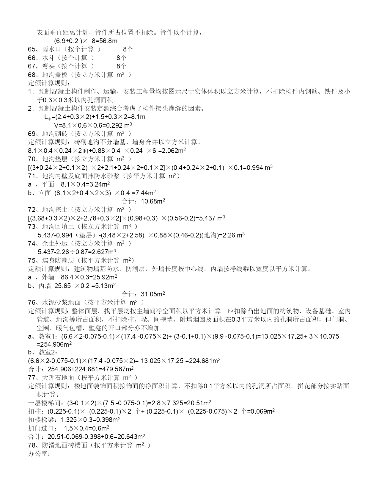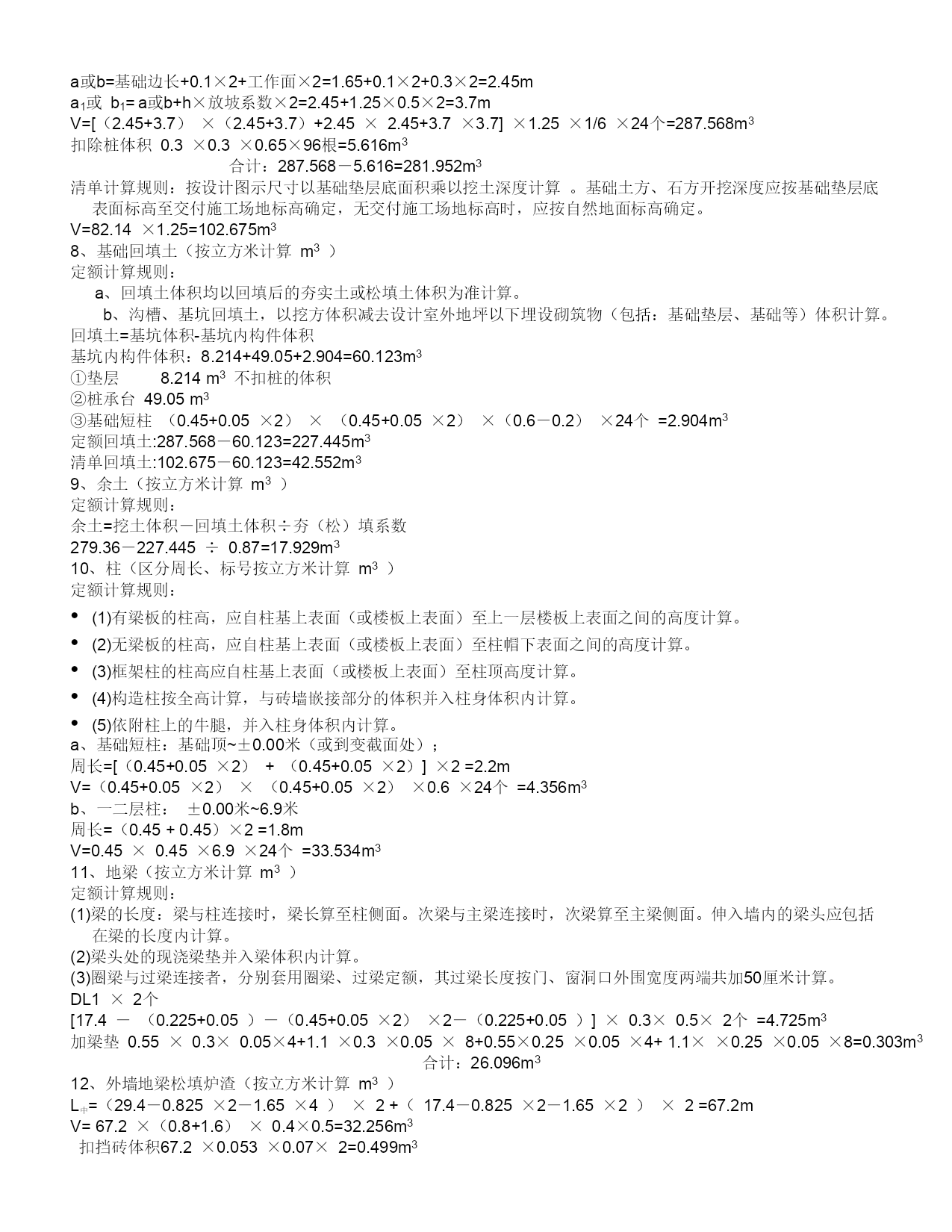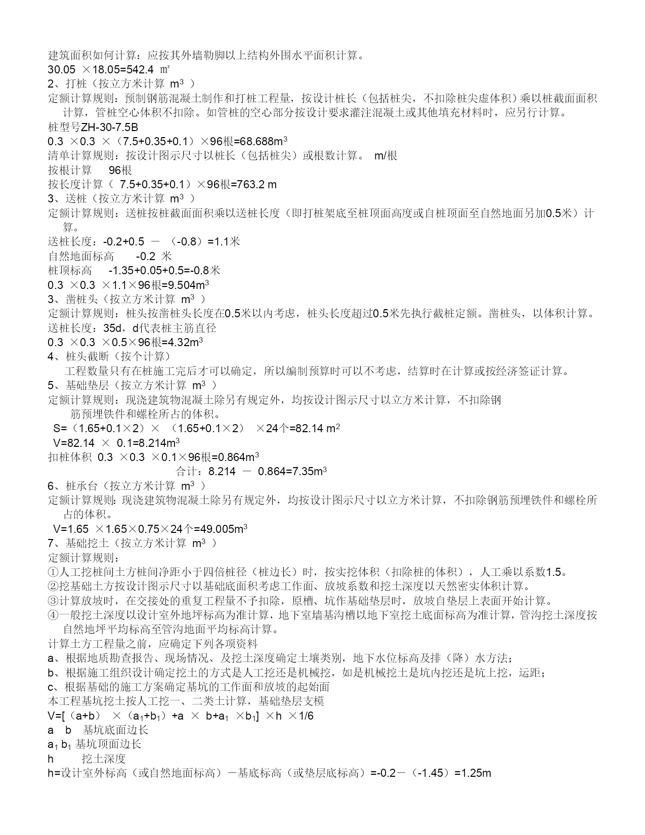 一工程造价的基础理论1、含义广义:是按照确定的建设内容、建设规模、建设标准、功能要求和使用要求等将工程项目全部建成并验收合格交付使用所需的全部费用。狭义:工程建造的价格(建筑安装工程费)2、构成:工程造价的主要构成部分是建设投资,建设投资包括工程费用、工程建设其他费和预备费三部分。工程费是指直接构成固定资产实体的各种费用,可分为建筑安装工程费和设备及工器具购置费;工程建设其他费是指根据国家有关规定应在投资中支付,并列入建设项目总造价或单项工程造价的费用。预备费是为了保证工程项目的顺利实施,避免在难以预料的情况下造成投资不足而预先安排的一笔费用。3、工程造价的划分根据建设项目或工程的不同阶段工程造价可以划分为投资估算、初步设计概算、施工图预算、结算、竣工决算。建设项目决策阶段编制投资估算;设计阶段初步设计编制初步设计概算,施工图设计编制施工图预算;施工阶段编制结算;竣工验收后编制竣工决算。4、工程造价的工作内容工程造价包括两部分工作内容计量和计价。a、计量:就是计算工程量,工程量是计算工程造价的原始数据,是计算工程造价的基础。b、计价:就是在工程量计算完成后,按照一定的计价程序计算出工程造价。按照表现形式的不同可以分为定额计价也叫工料单价法,清单计价也叫综合单价法。二、计算工程量1、工程量计算的依据a、施工图和有关资料:施工图纸和说明、地质勘查报告、图纸会审记录等;b、现场情况和施工组织设计资料及有关技术规范:应了解现场地质条件、施工条件、施工方法、技术规范要求、技术组织措施、施工设备、材料供应等;c、现行定额和清单规范:吉林省现行定额为2009版,清单规范为国家标准GB50500-20082、工程量的计算a、原则:是严格按照定额及清单规范上项目和计算规则,依据施工图纸的设计内容结合有关资料、现场情况、施工方案、技术规范等进行计算。定额和清单规范解决算什么、怎么算的问题,施工图纸解决具体的尺寸、数据等问题。b、要求:不重不漏,即不重项不漏项、不重算不漏算,严格按照工程量计算规则的规定计算,特别应注意扣除和不扣除、增加和不增加的规定。c、顺序:工程量计算要按照一定的顺序进行,可以使思路清晰,有条理,省时省力,还可以避免和防止重漏的发生,同时也便于校对和审核。先地下再地上;先主体后装饰;先外后内;同类型构件自下而上;同一张图纸先上后下、先左后右、先主后次,或按构件的编号计算;重复利用的数据先算;相关的数据一起算;先整体、后扣除、再增加。三、工程定额和工程量清单1、工程定额定额就是一种规定的额度,或数量标准。工程建设定额就是用于规定完成某一建筑产品所需消耗的人力、物力、财力的数量标准。2、工程量清单建设工程的分部分项工程项目、措施项目、其他项目、规费项目、税金项目的名称和相应数量的明细清单。长春市精准工程造价实战培训学校综合楼施工图预算工程量计算1、平整场地(按面积计算㎡)厚度在±30厘米以内的土方就地挖、填、找平为平整场地。定额计算规则:建筑物首层建筑面积和构筑物地面投影面积每边各加2米计算。围墙按中心线长度和围墙地面投影厚度每边各加1米计算。首层建筑面积+外墙外边线长度×2+2×2×430.05×18.05+(30.05+18.05)×2×2+2+2×2×4=750.8㎡清单计算规则:按建筑物首层建筑面积计算建筑面积如何计算:应按其外墙勒脚以上结构外围水平面积计算。30.05×18.05=542.4㎡2、打桩(按立方米计算m3)定额计算规则:预制钢筋混凝土制作和打桩工程量,按设计桩长(包括桩尖,不扣除桩尖虚体积)乘以桩截面面积计算,管桩空心体积不扣除。如管桩的空心部分按设计要求灌注混凝土或其他填充材料时,应另行计算。桩型号ZH-30-7.5B0.3×0.3×(7.5+0.35+0.1)×96根=68.688m3清单计算规则:按设计图示尺寸以桩长(包括桩尖)或根数计算。m/根按根计算96根按长度计算(7.5+0.35+0.1)×96根=763.2m3、送桩(按立方米计算m3)定额计算规则:送桩按桩截面面积乘以送桩长度(即打桩架底至桩顶面高度或自桩顶面至自然地面另加0.5米)计算。送桩长度:-0.2+0.5-(-0.8)=1.1米自然地面标高-0.2米桩顶标高-1.35+0.05+0.5=-0.8米0.3×0.3×1.1×96根=9.504m33、凿桩头(按立方米计算m3)定额计算规则:桩头按凿桩头长度在0.5米以内考虑,桩头长度超过0.5米先执行截桩定额。凿桩头,以体积计算。送桩长度:35d,d代表桩主筋直径0.3×0.3×0.5×96根=4.32m34、桩头截断(按个计算)工程数量只有在桩施工完后才可以确定,所以编制预算时